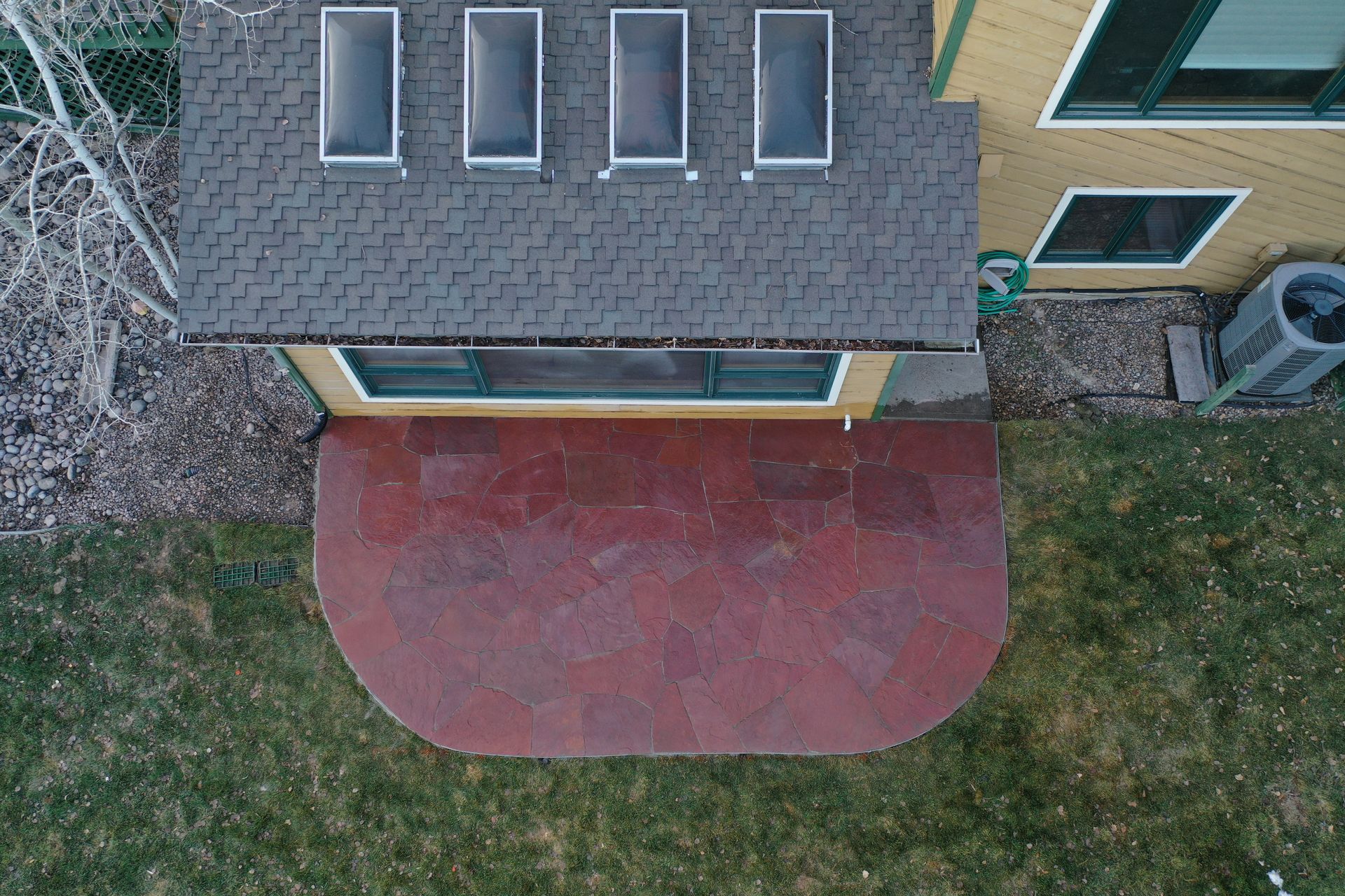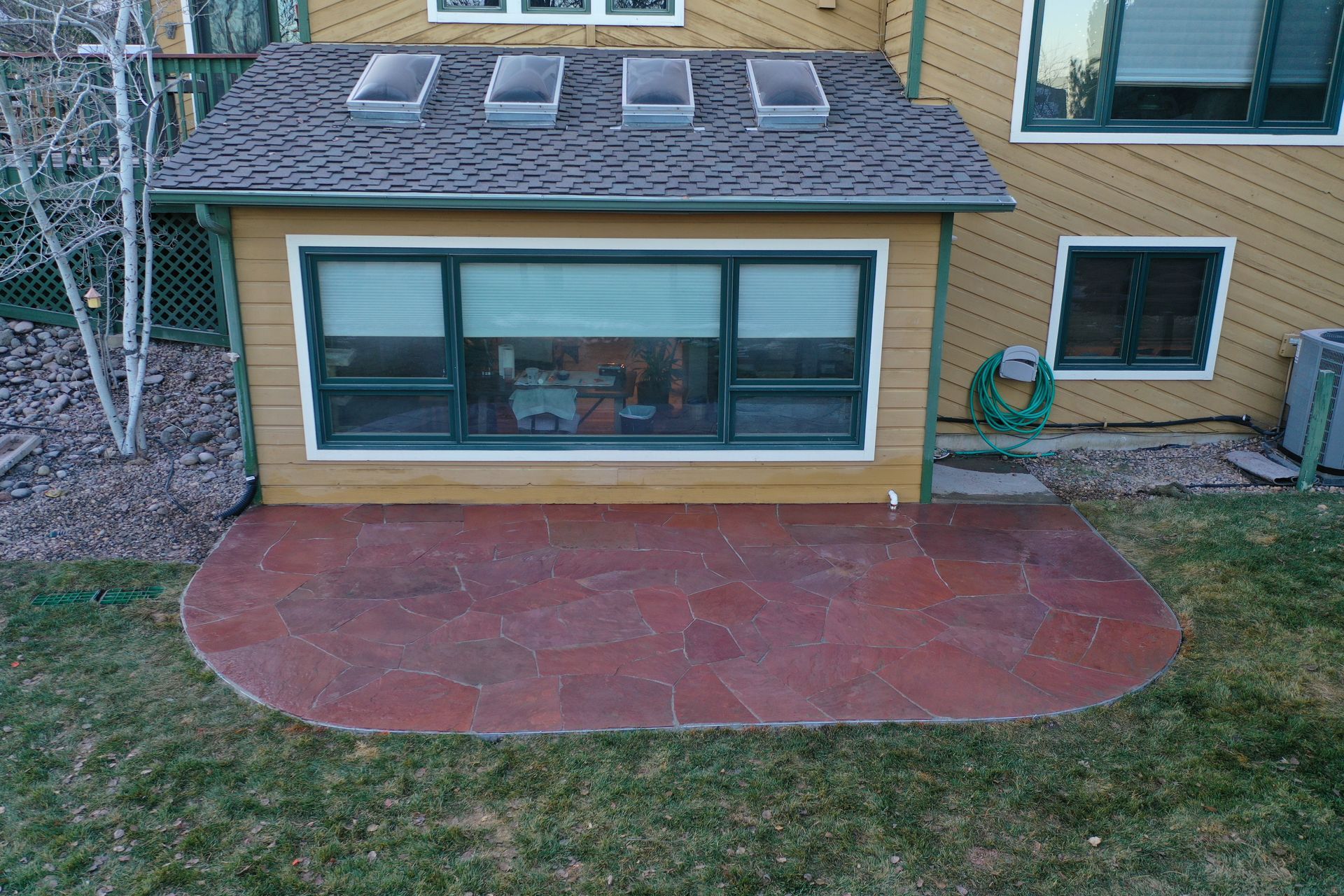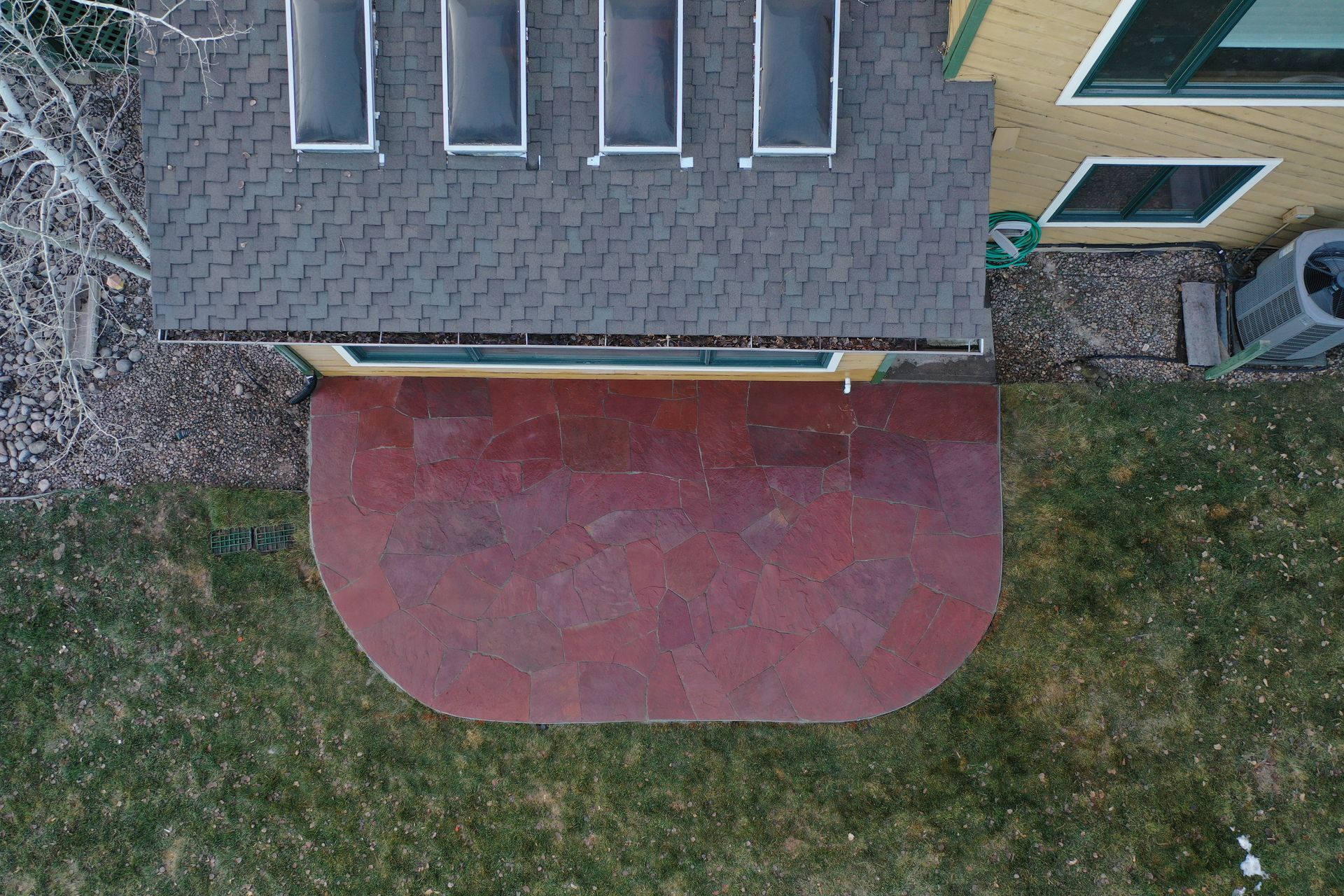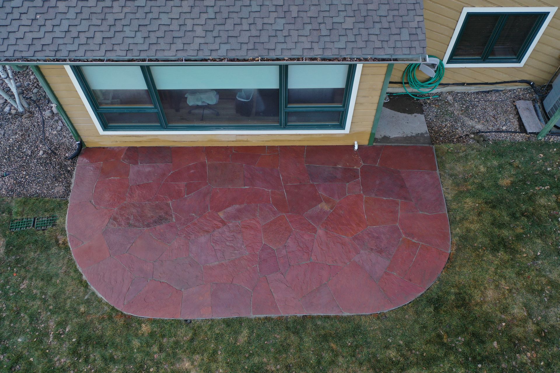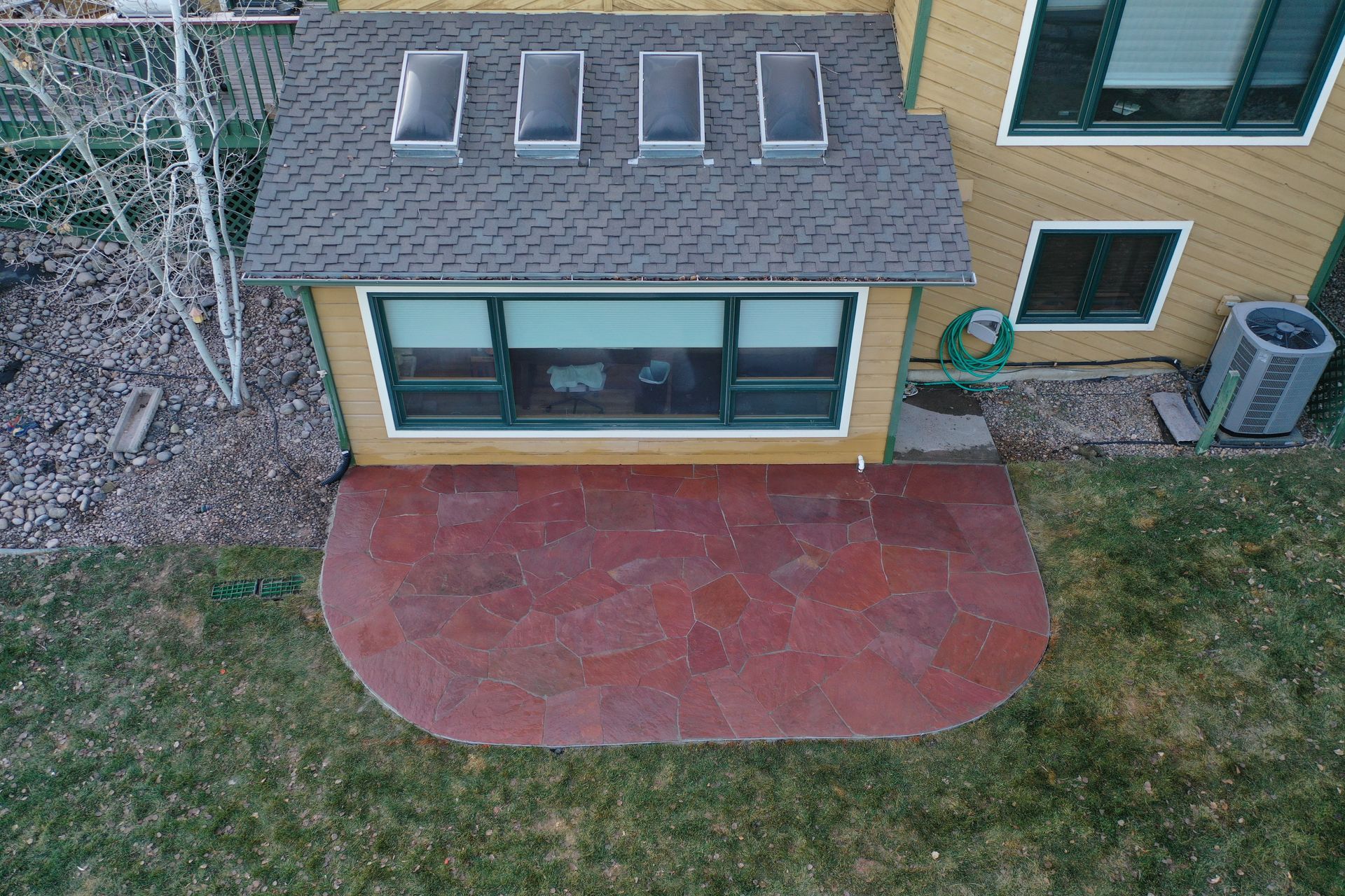 New Colorado red flagstone patio in backyard for gatherings. Niwot, CO 2019