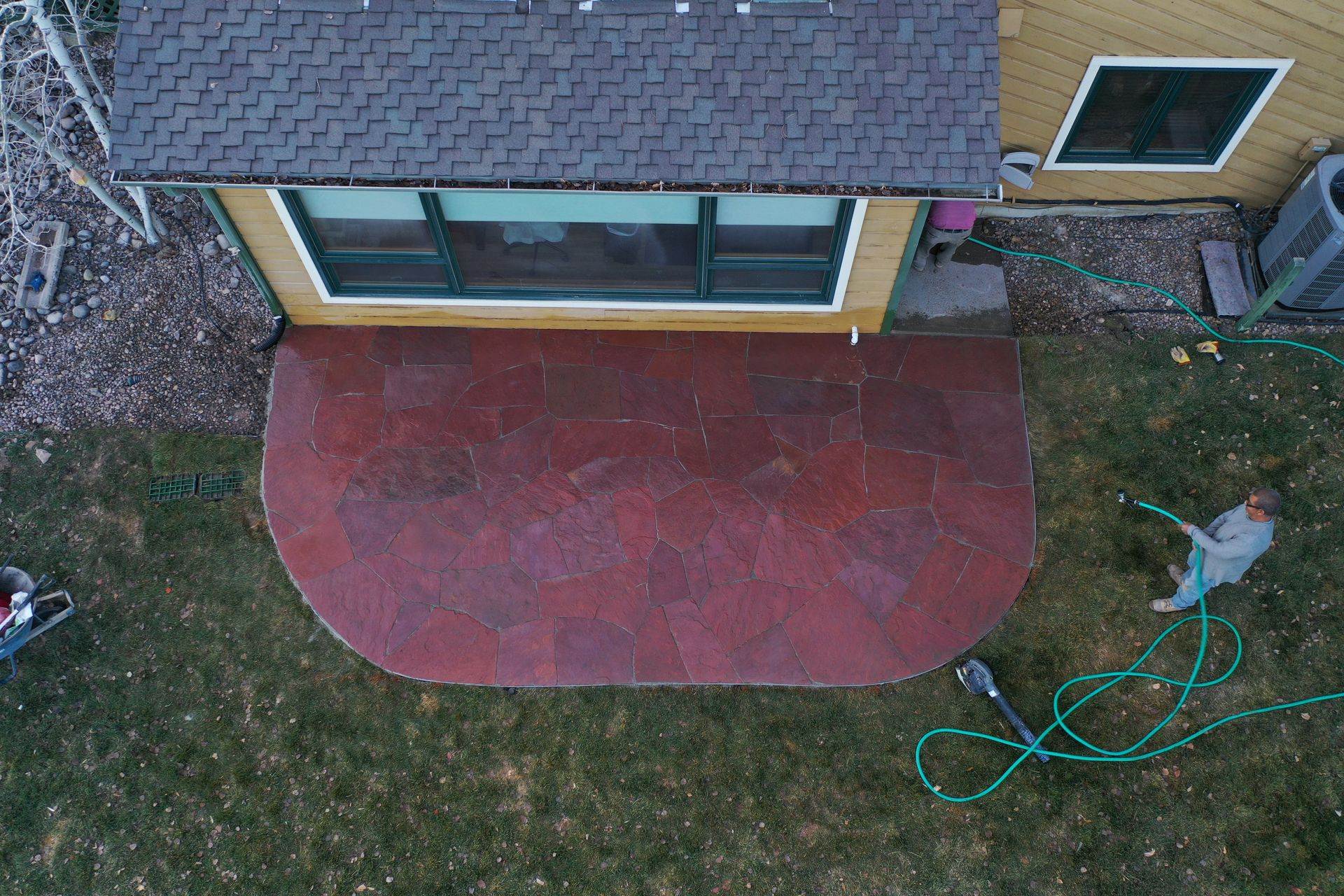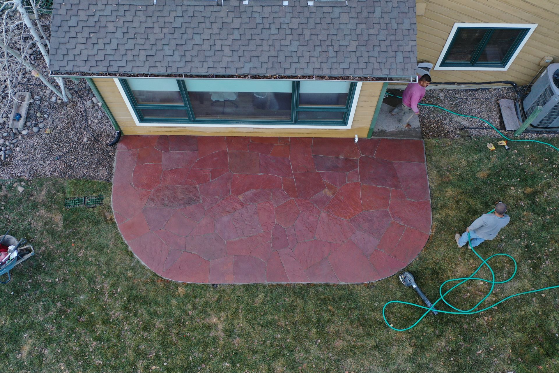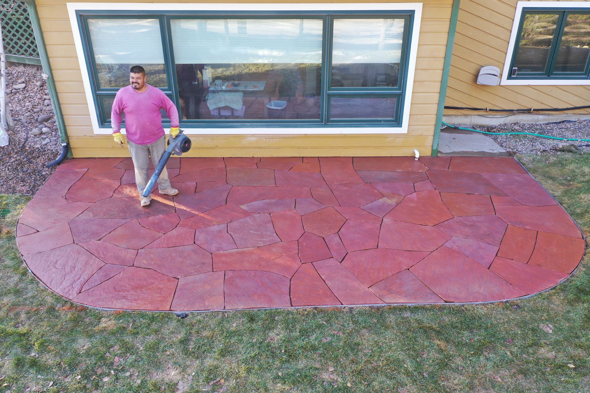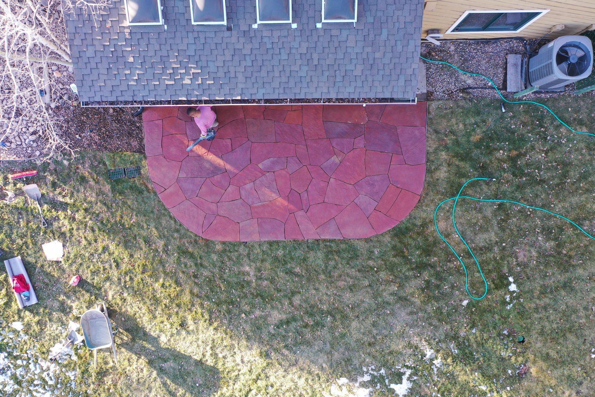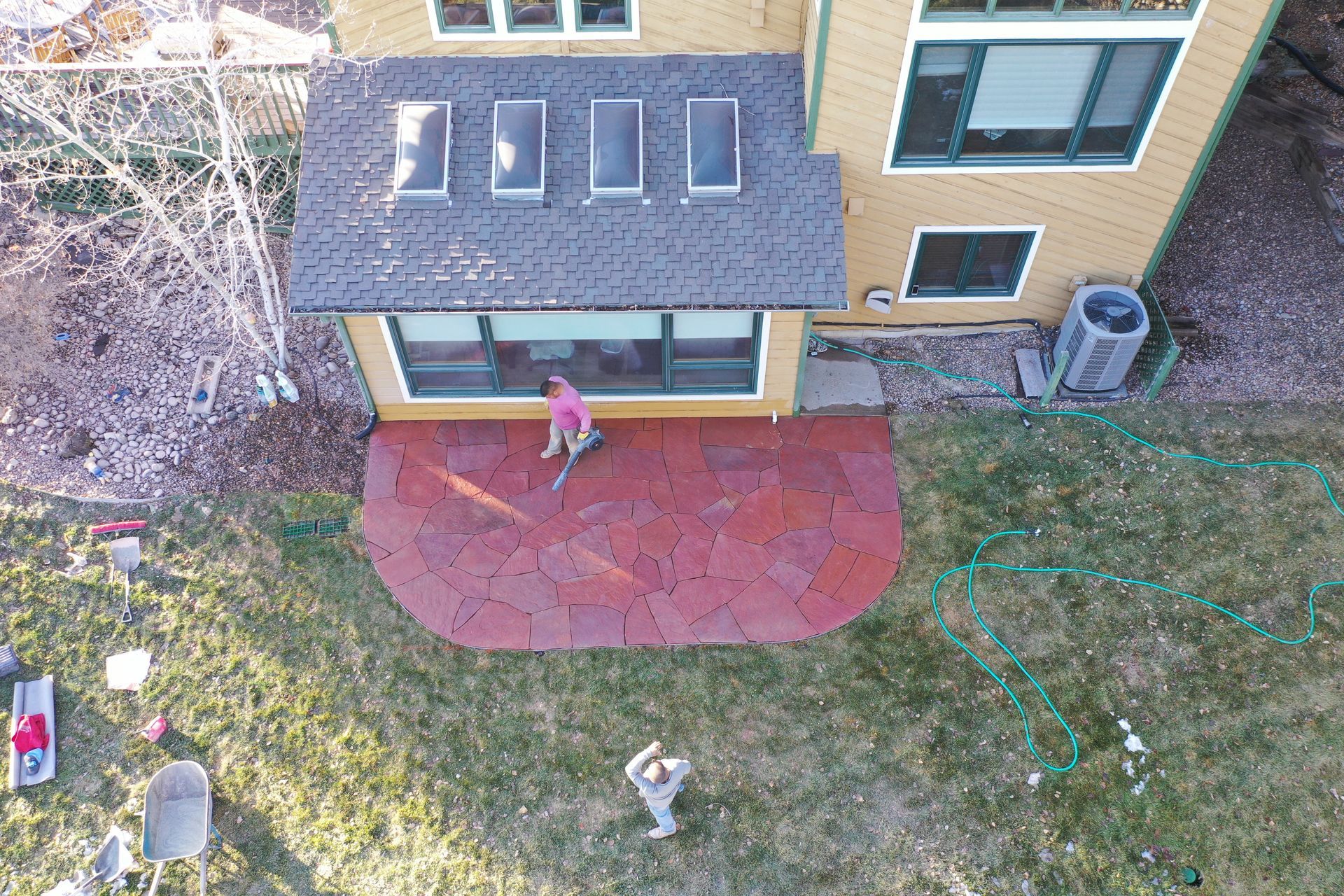 New Colorado red flagstone patio in backyard for gatherings. Niwot, CO 2019