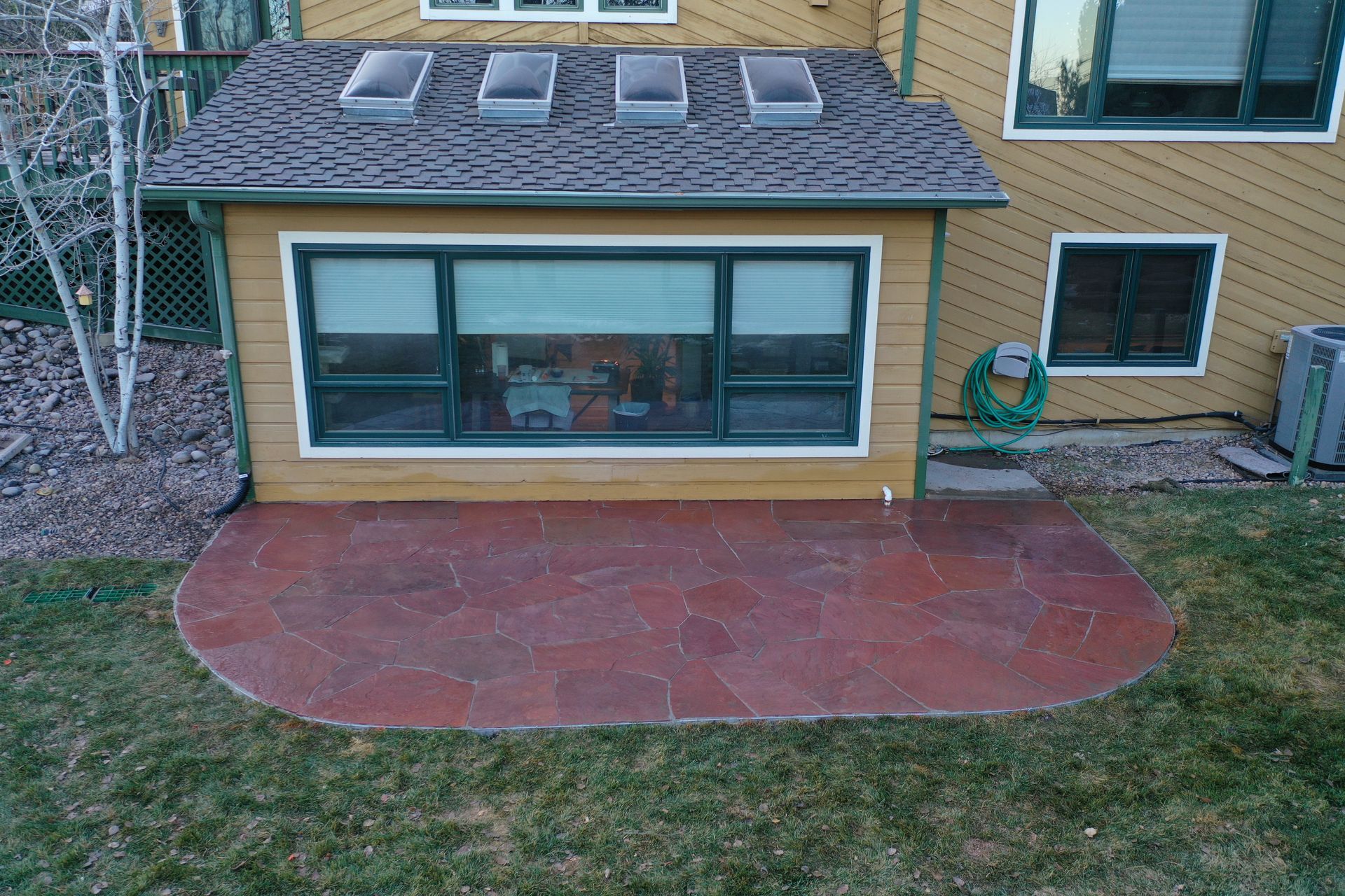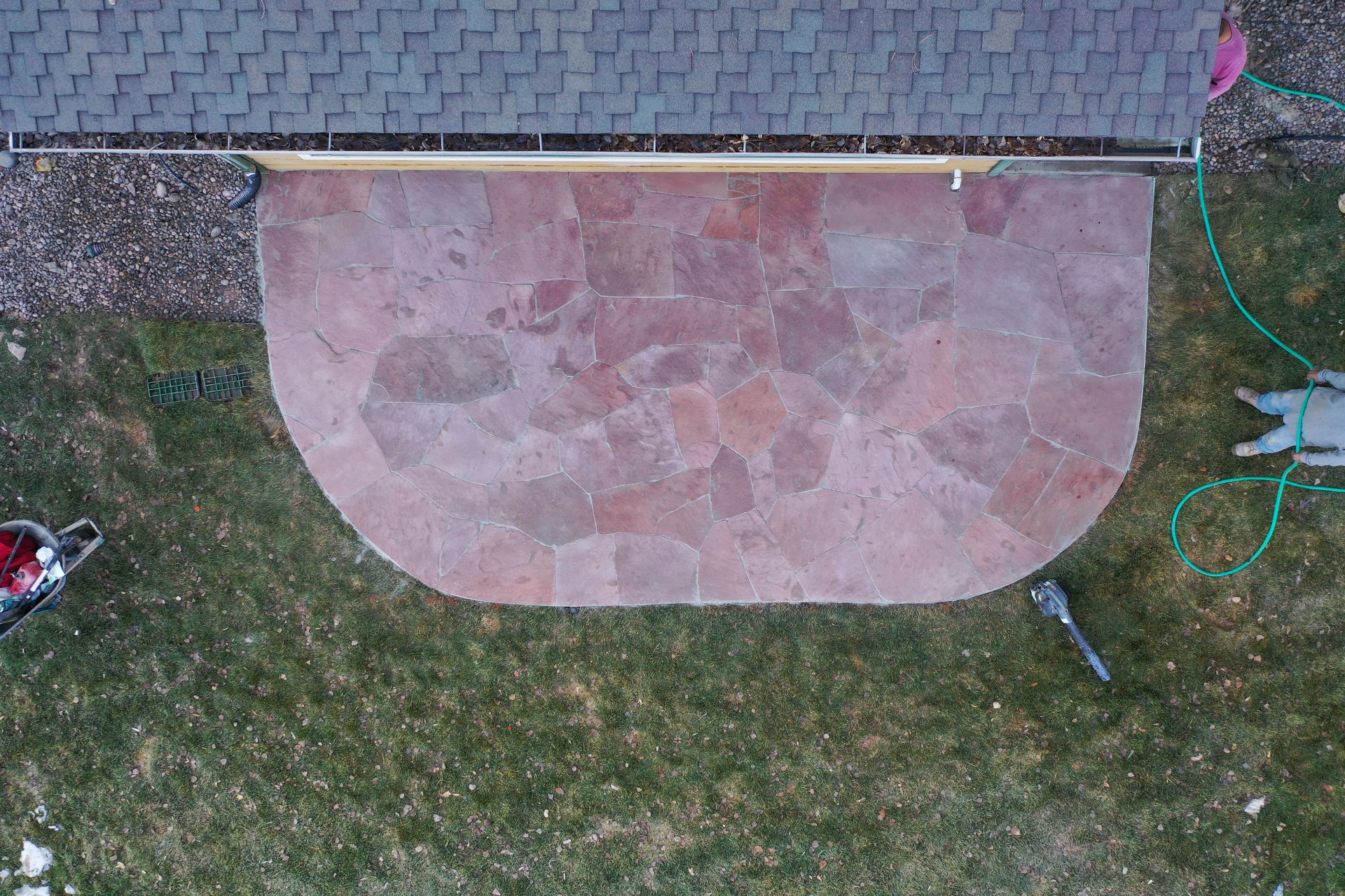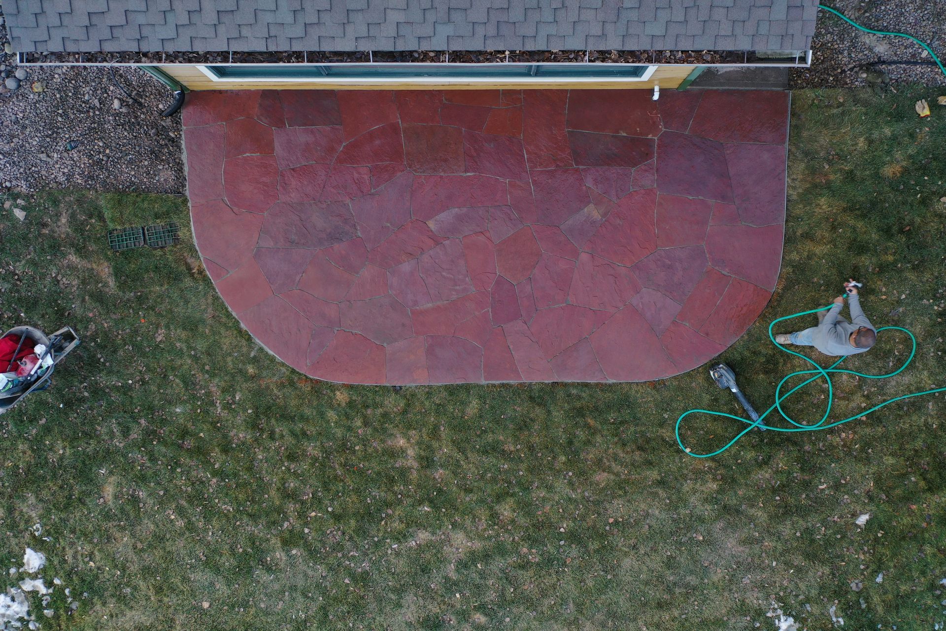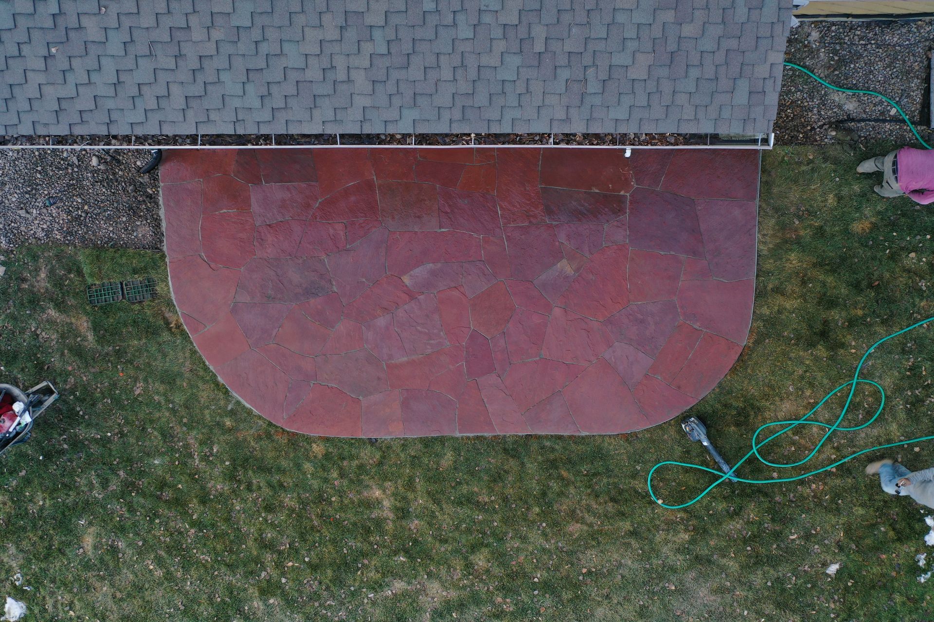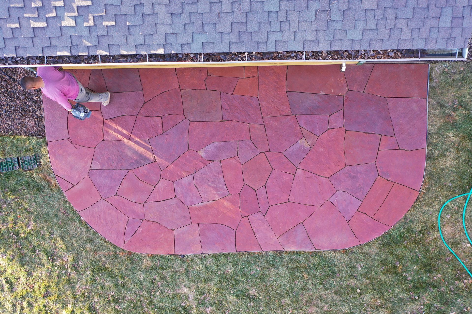 New Colorado red flagstone patio in backyard for gatherings. Niwot, CO 2019