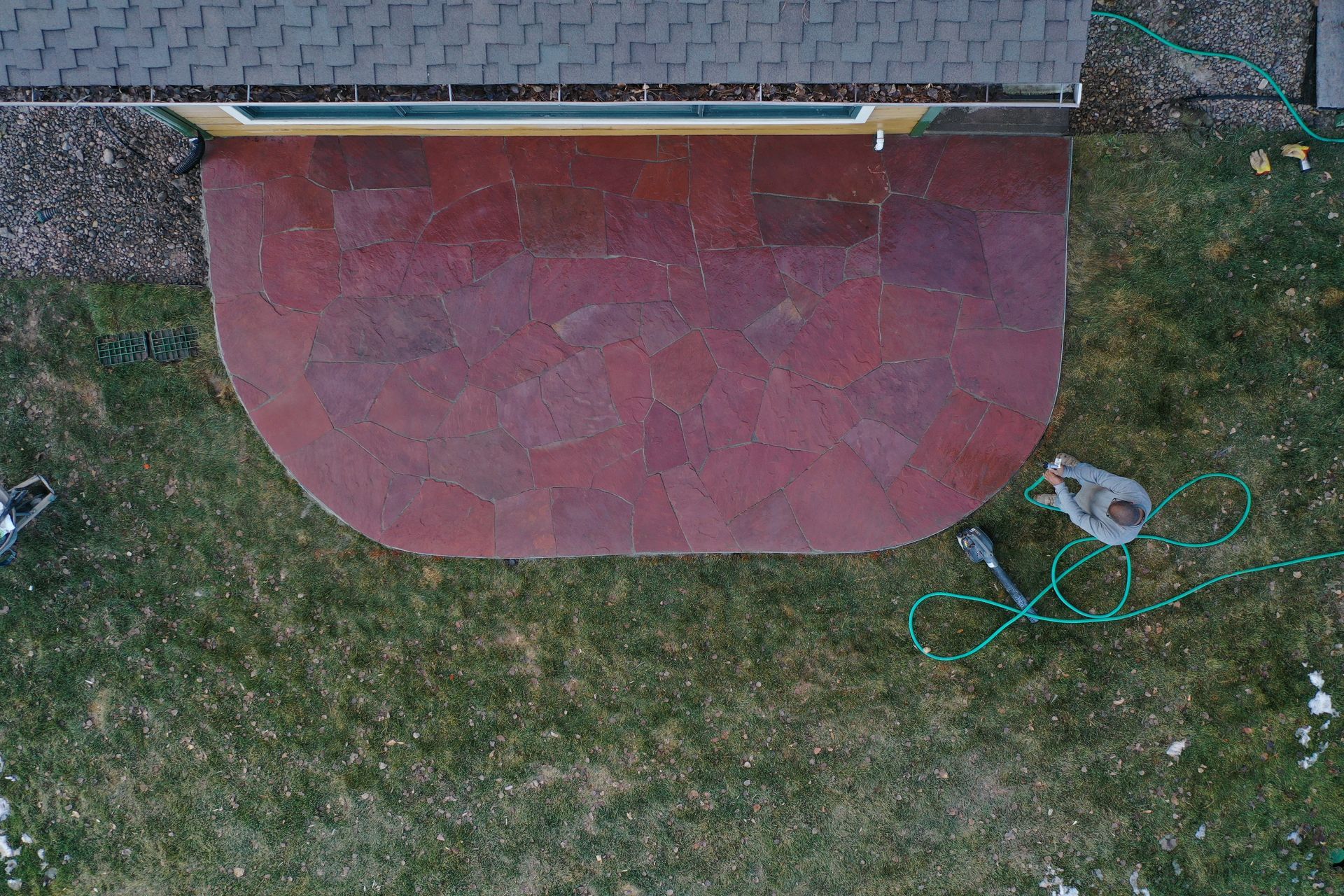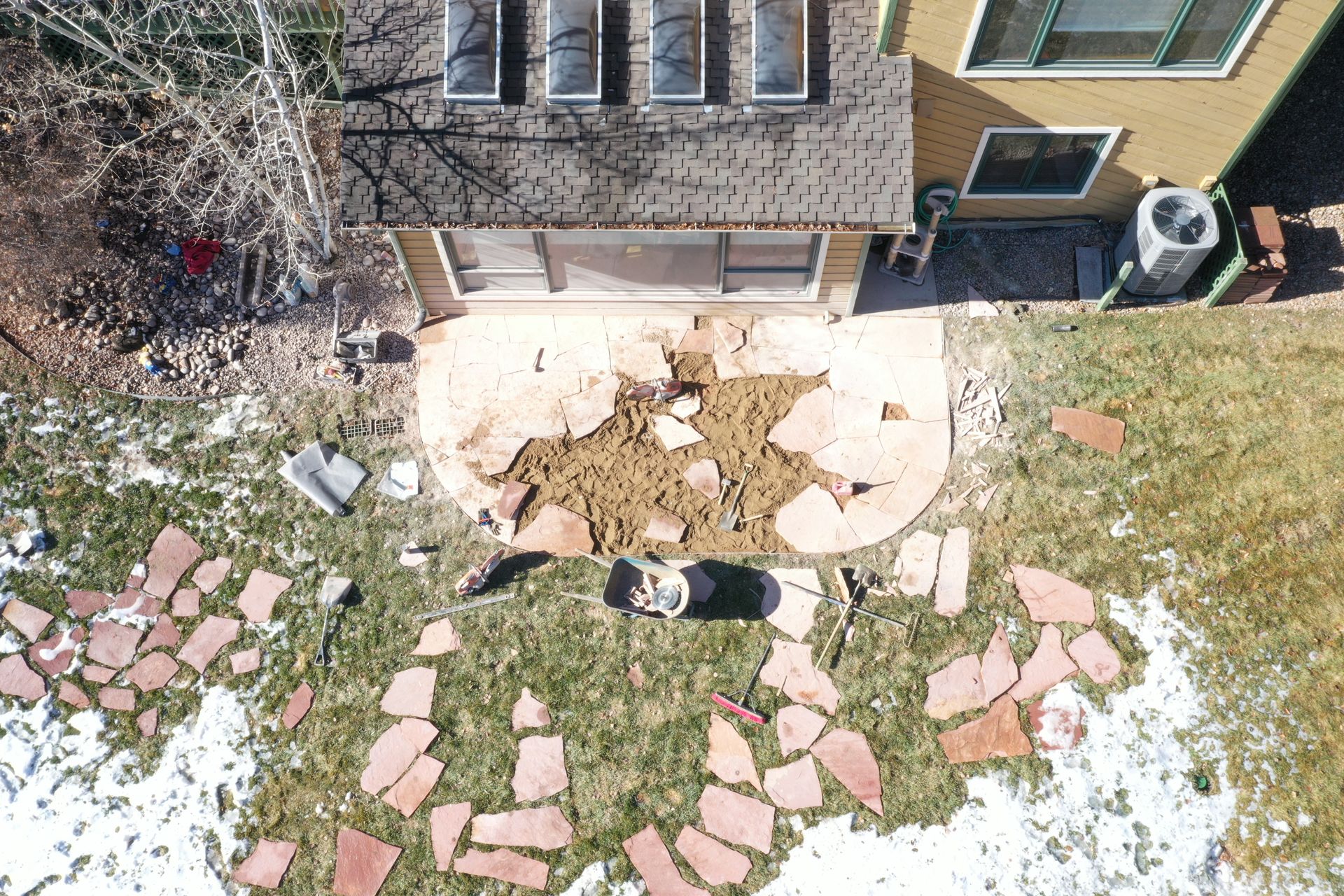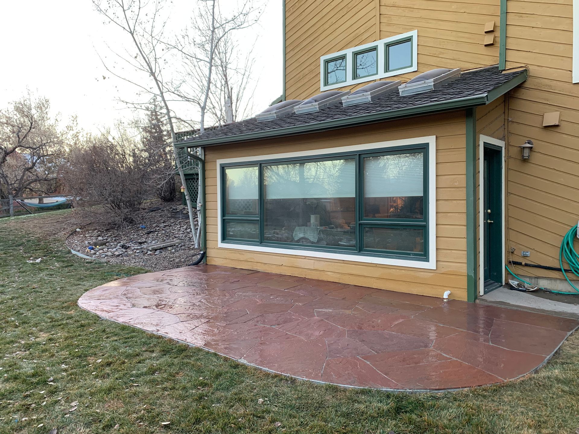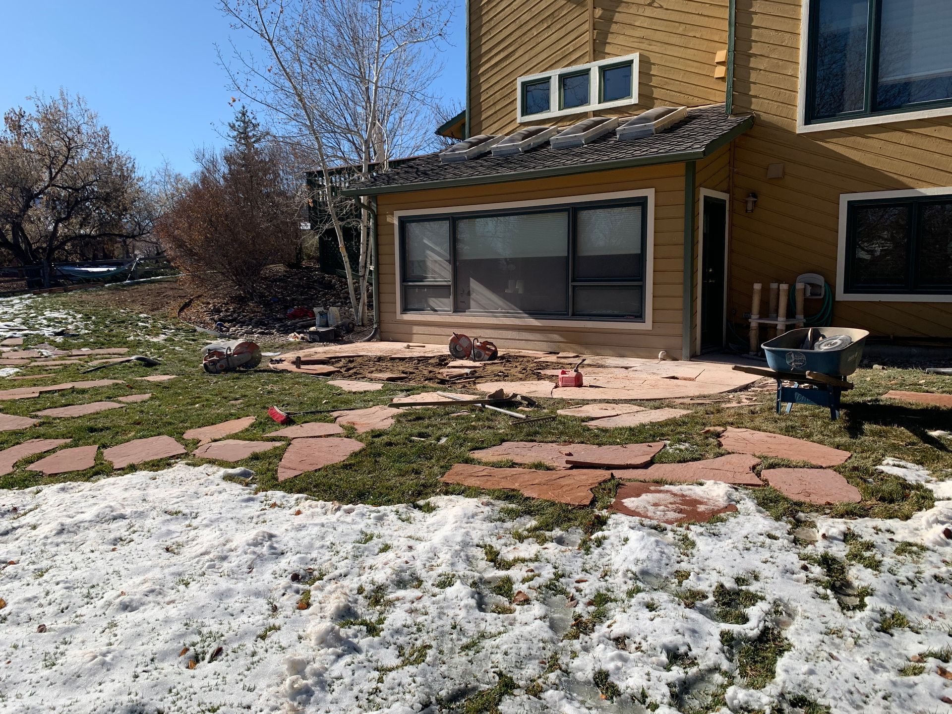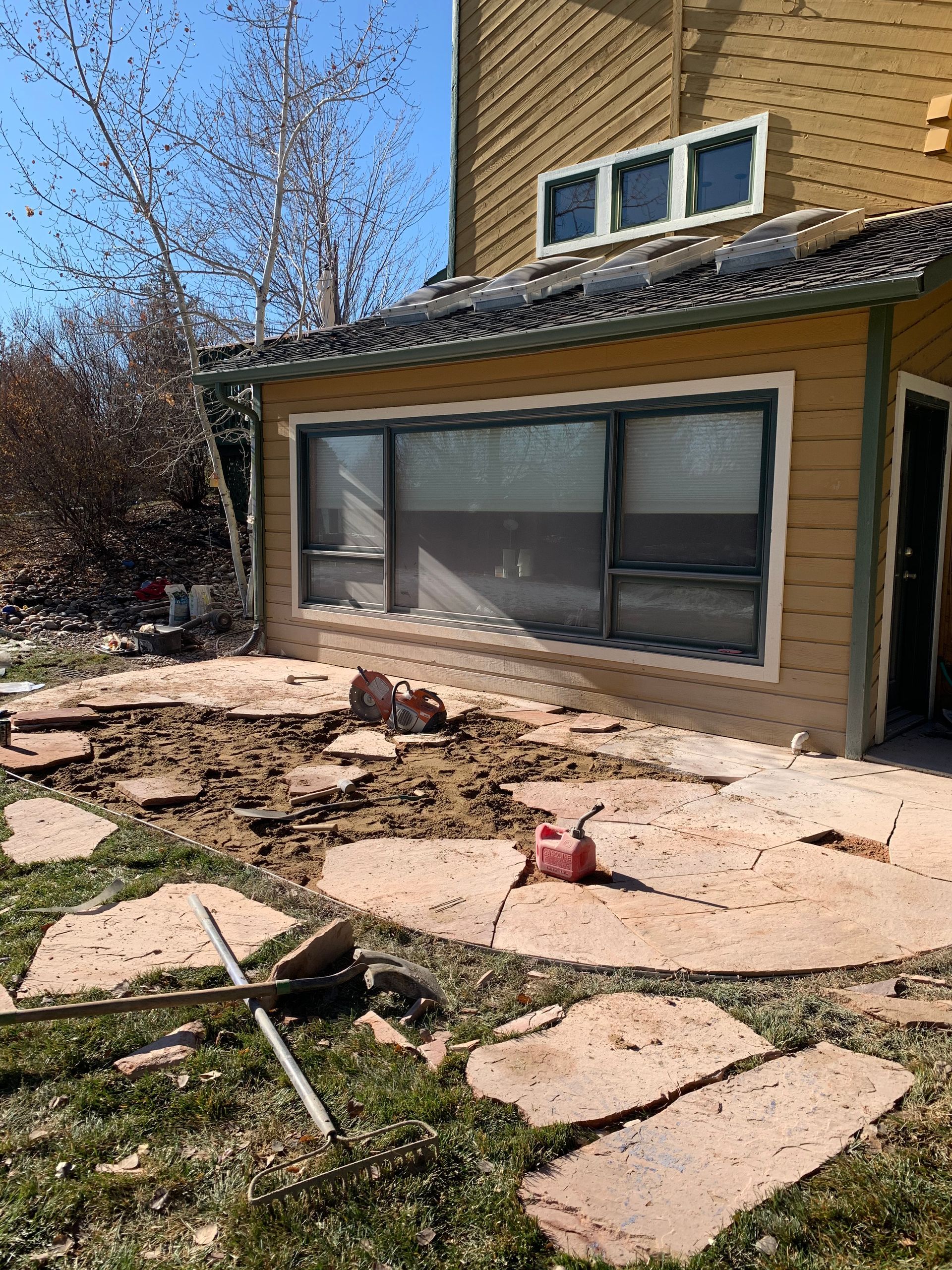 New Colorado red flagstone patio in backyard for gatherings. Niwot, CO 2019