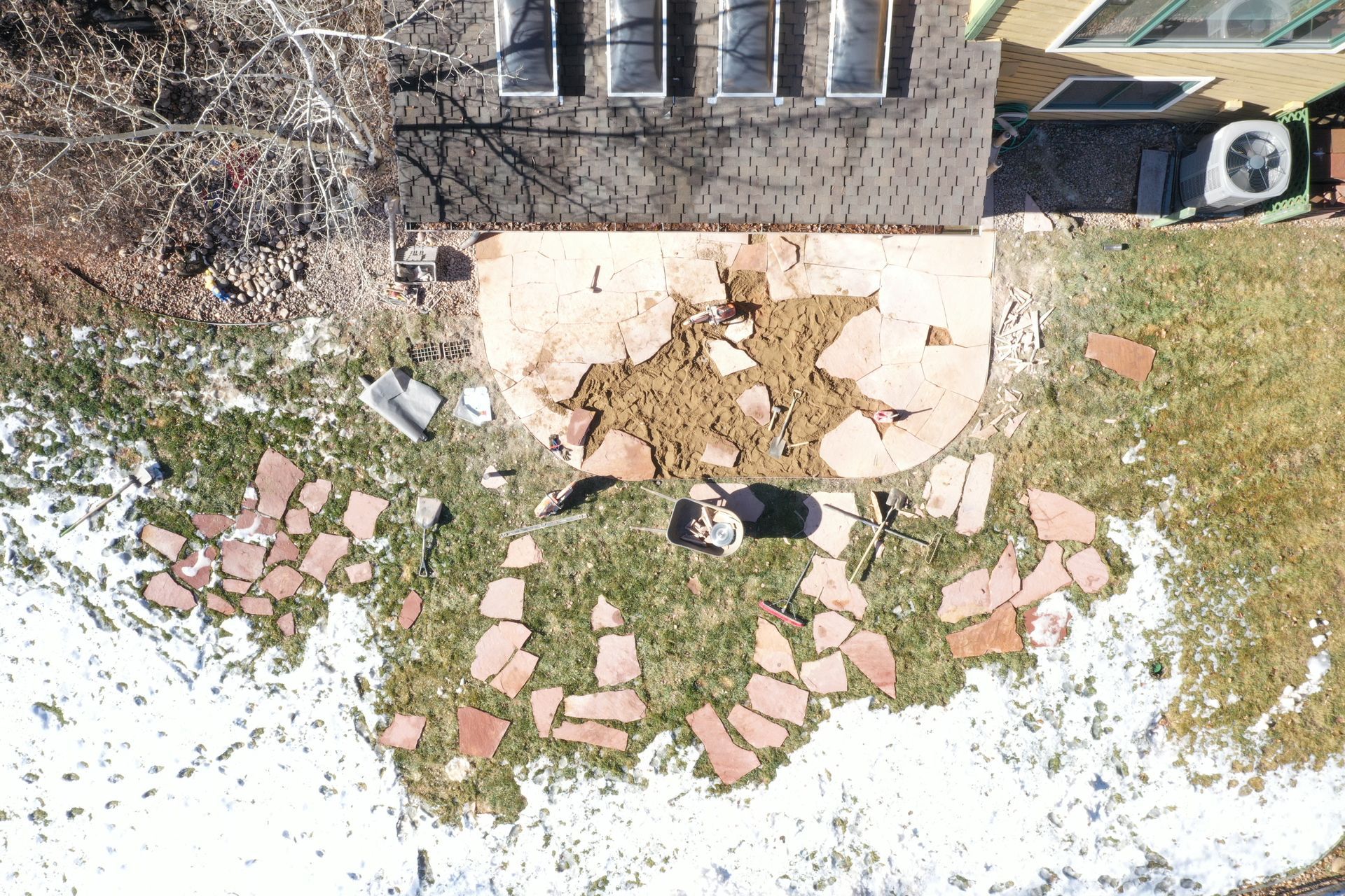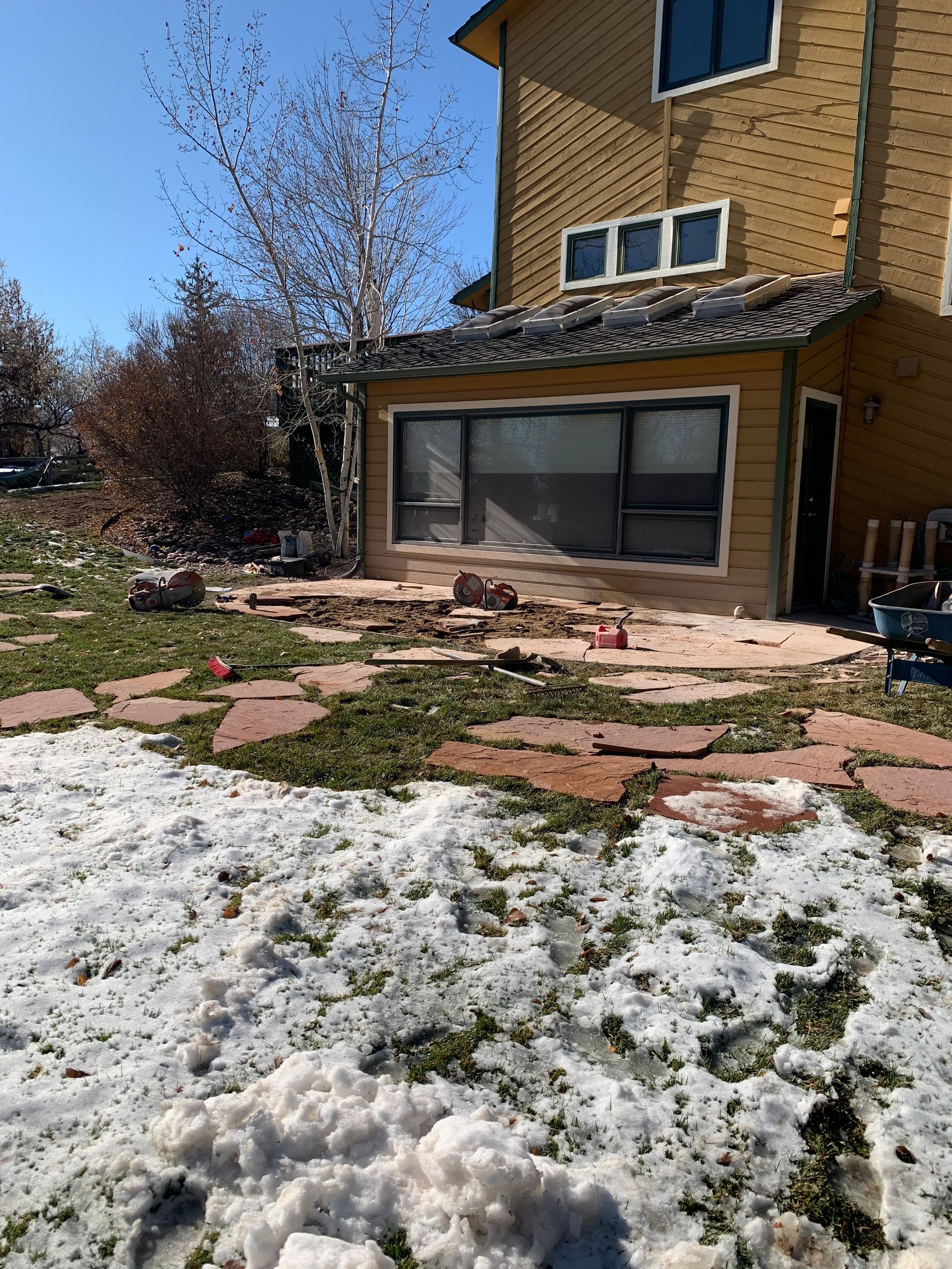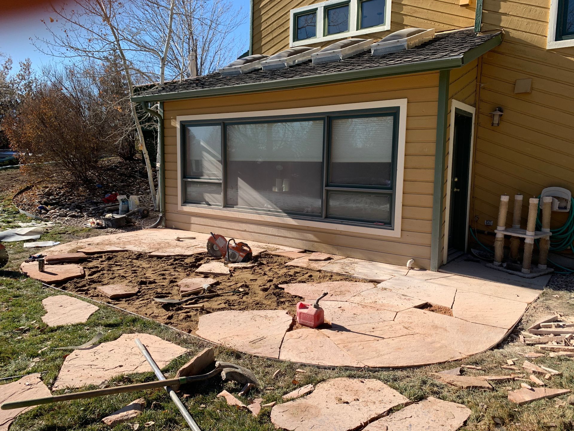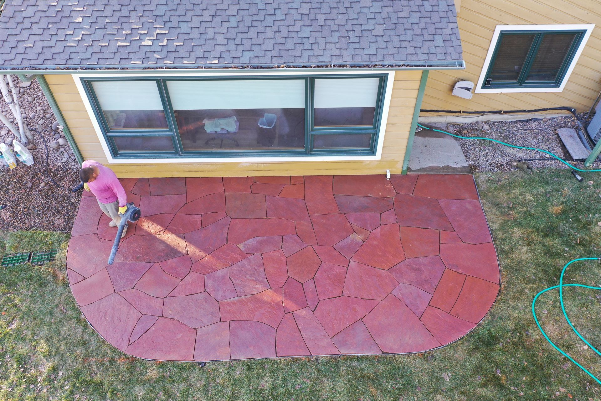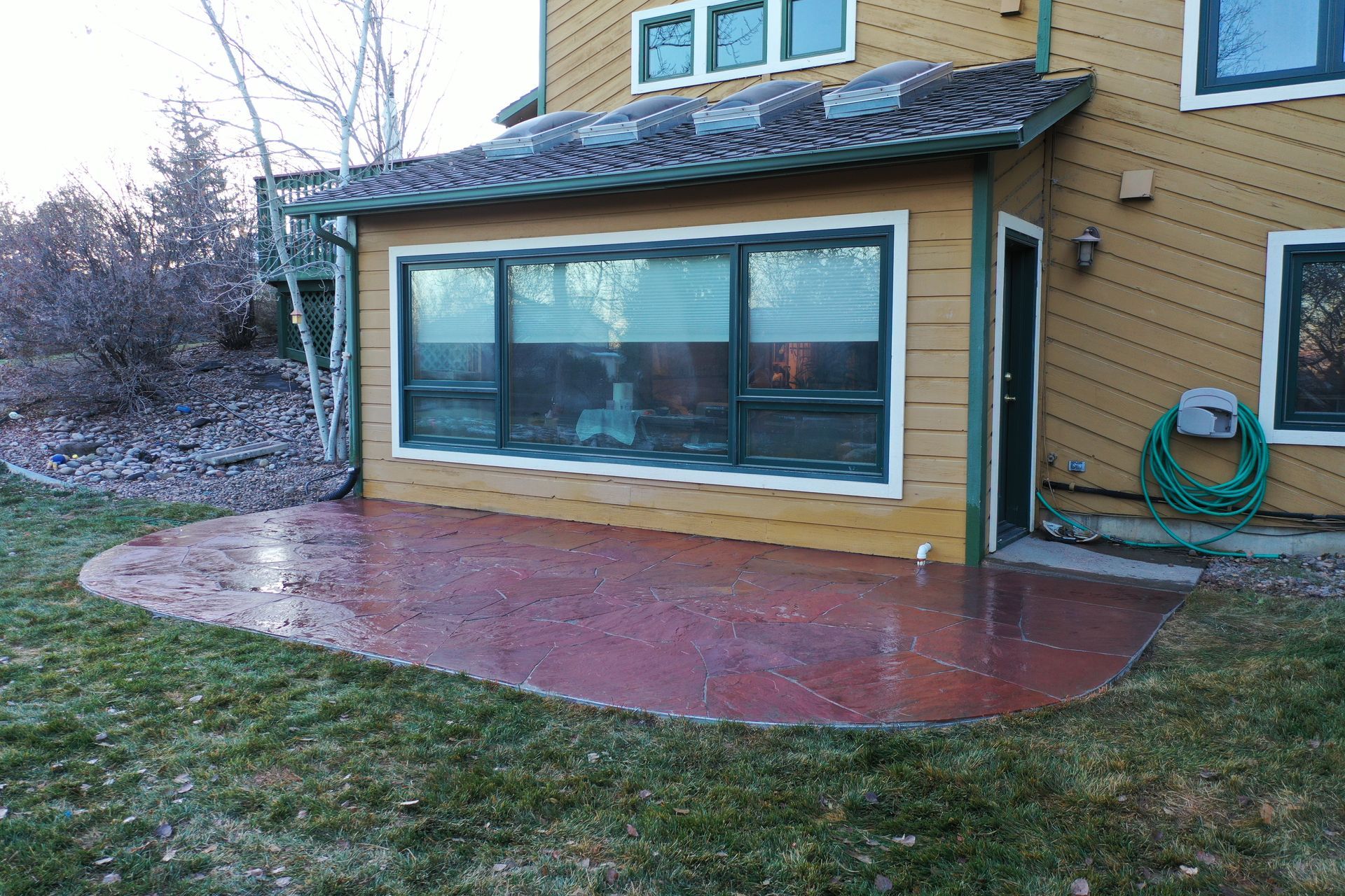 New Colorado red flagstone patio in backyard for gatherings. Niwot, CO 2019