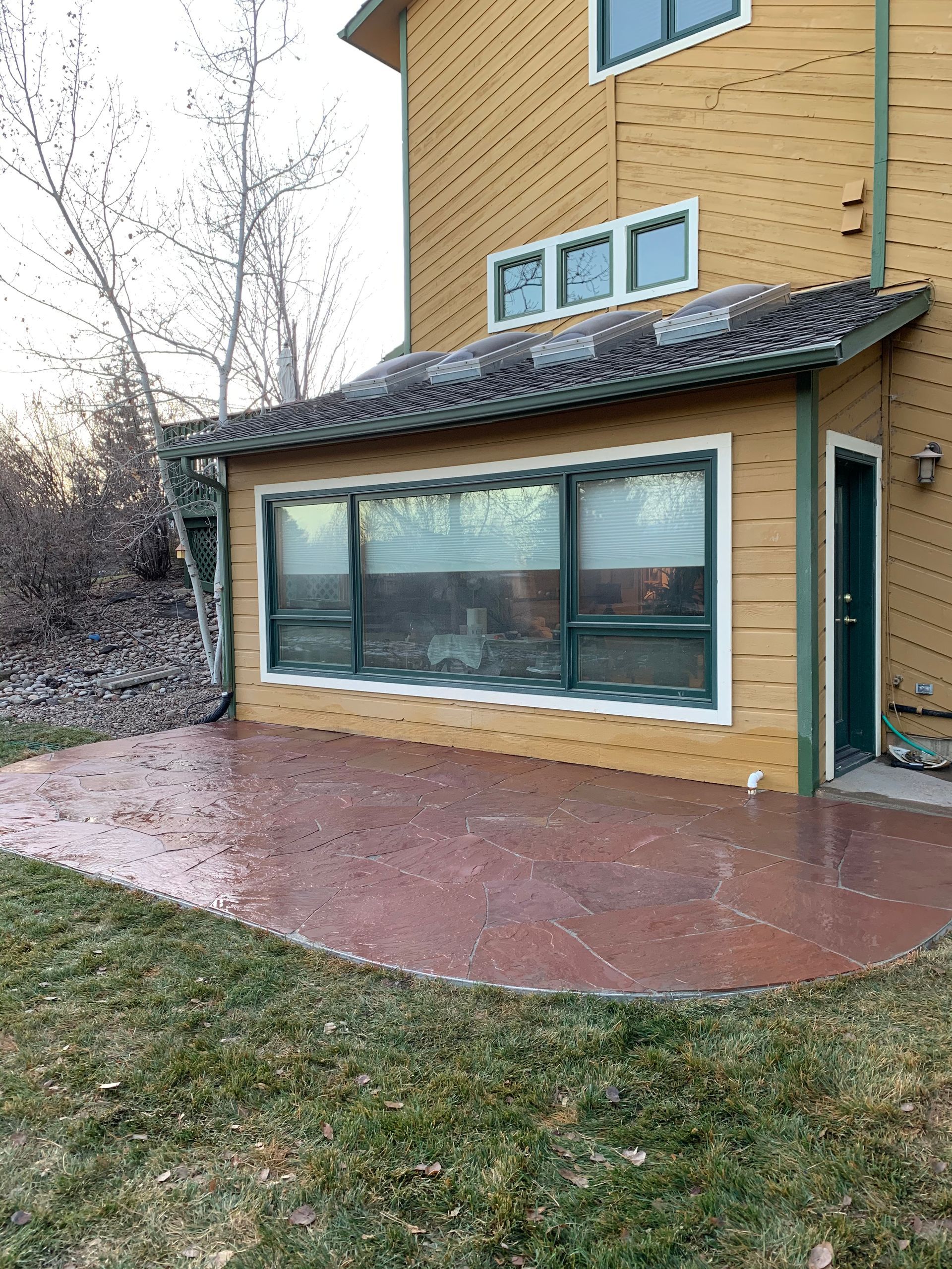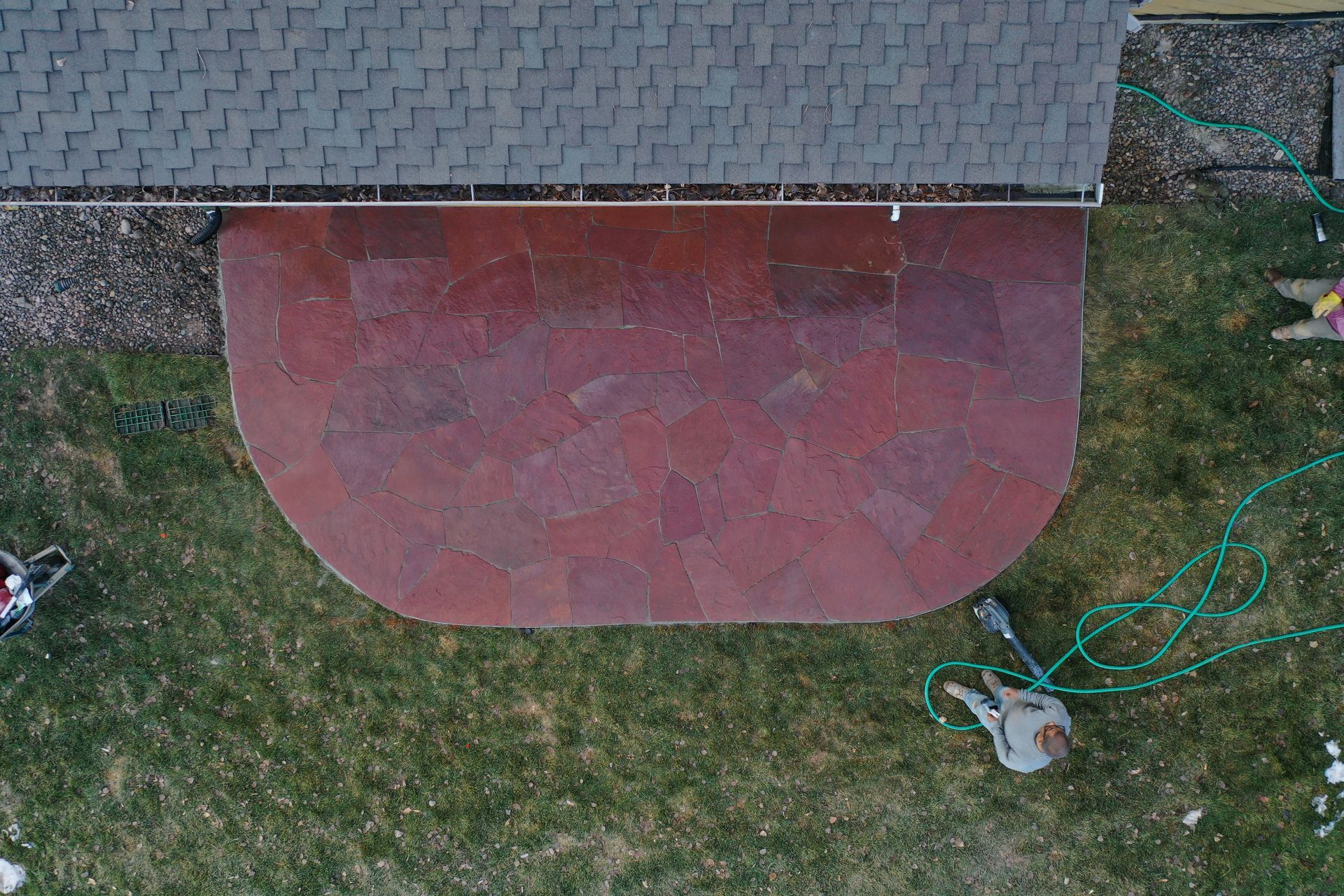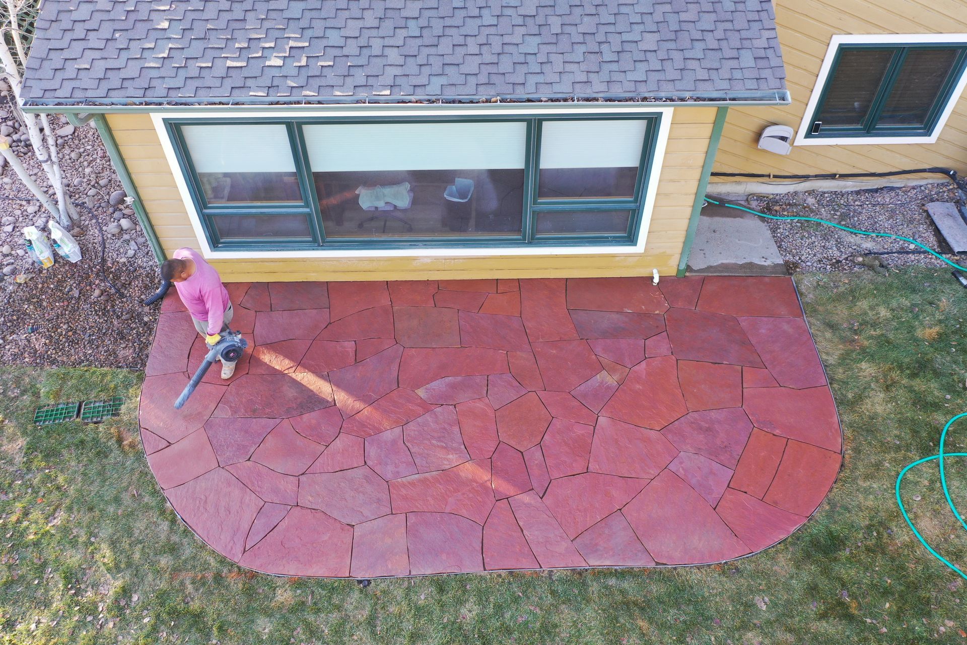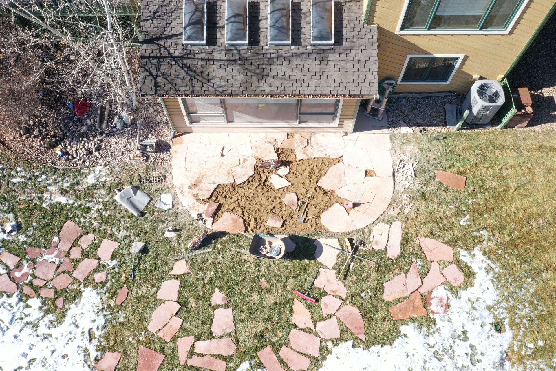 New Colorado red flagstone patio in backyard for gatherings. Niwot, CO 2019