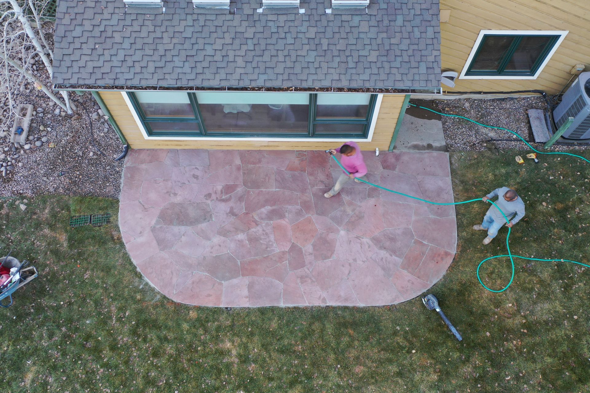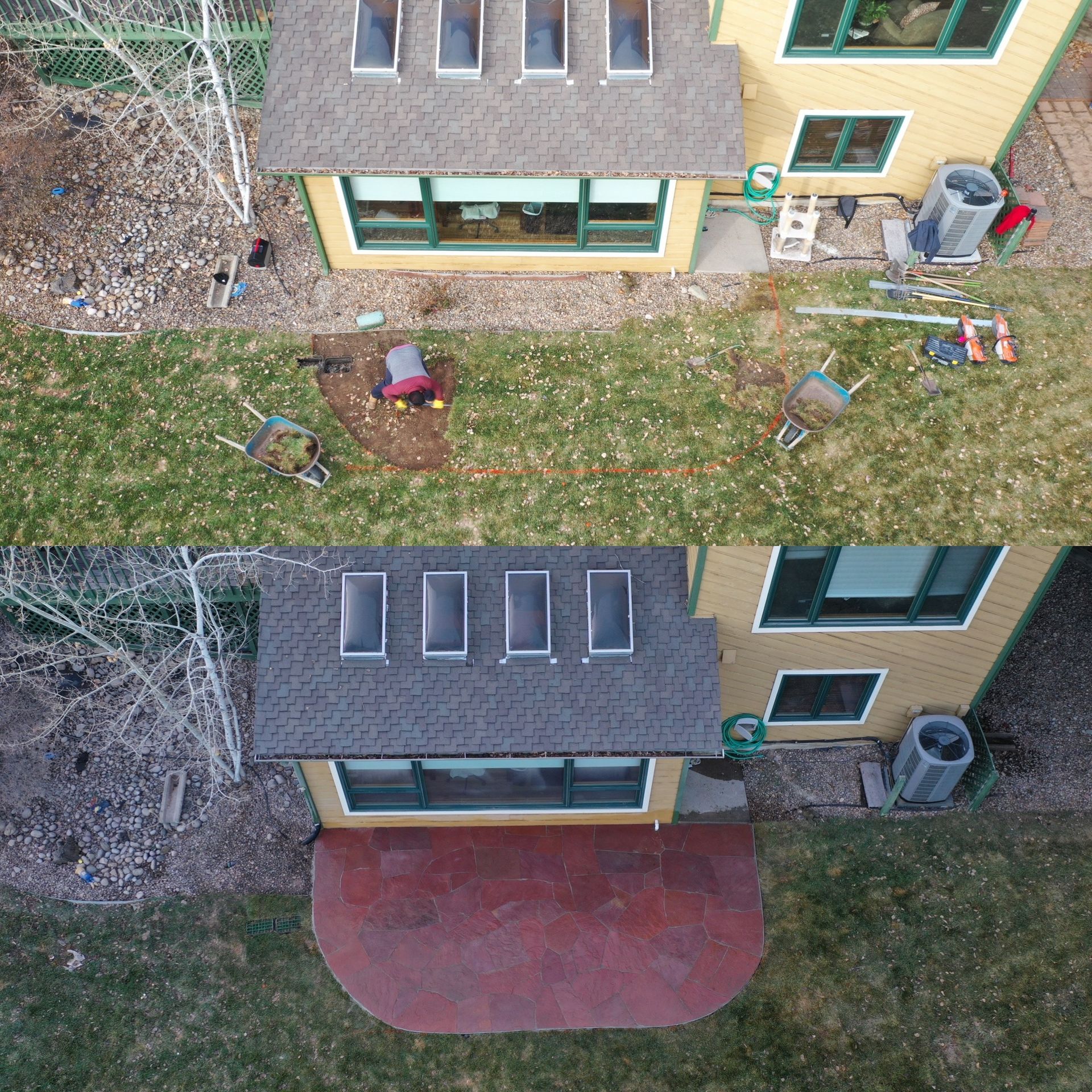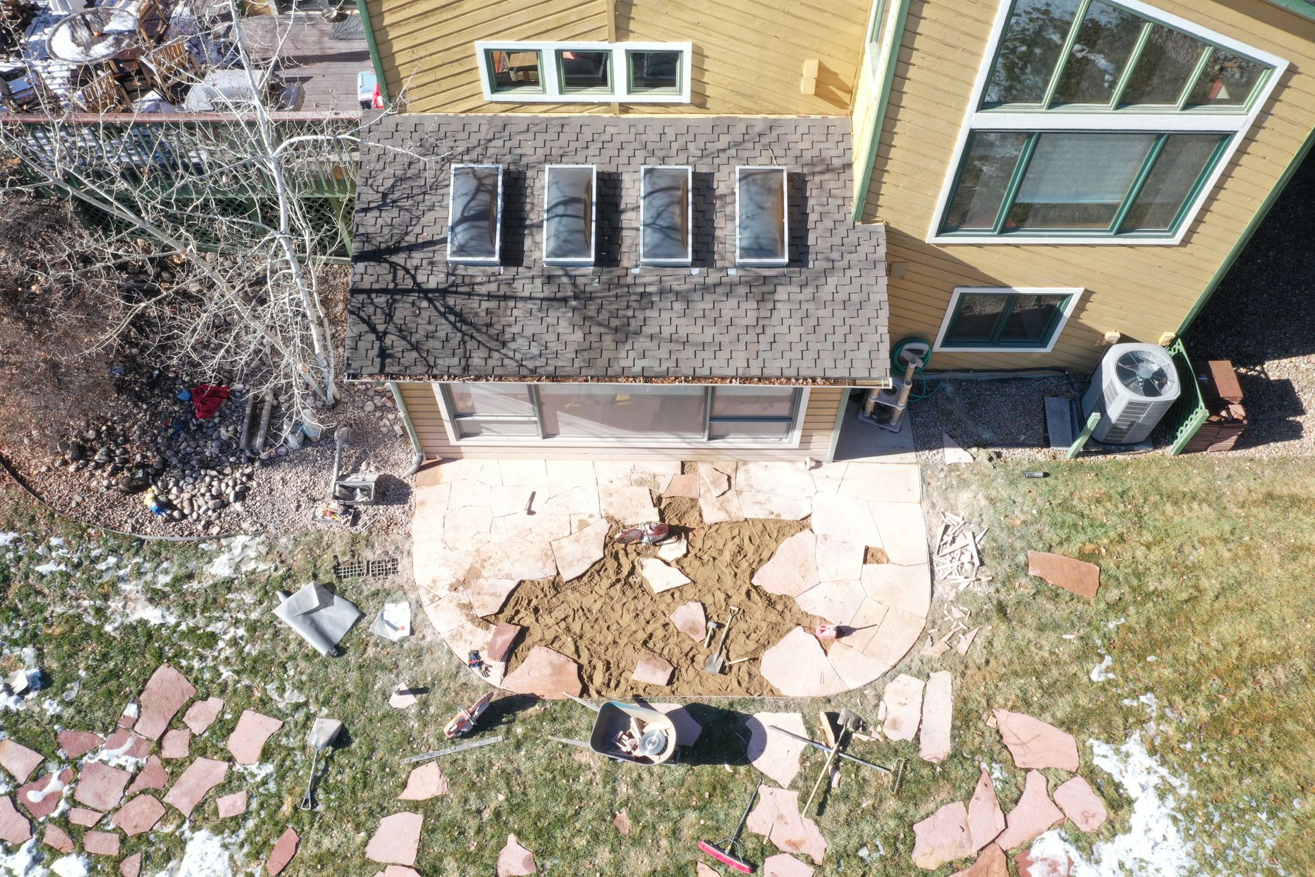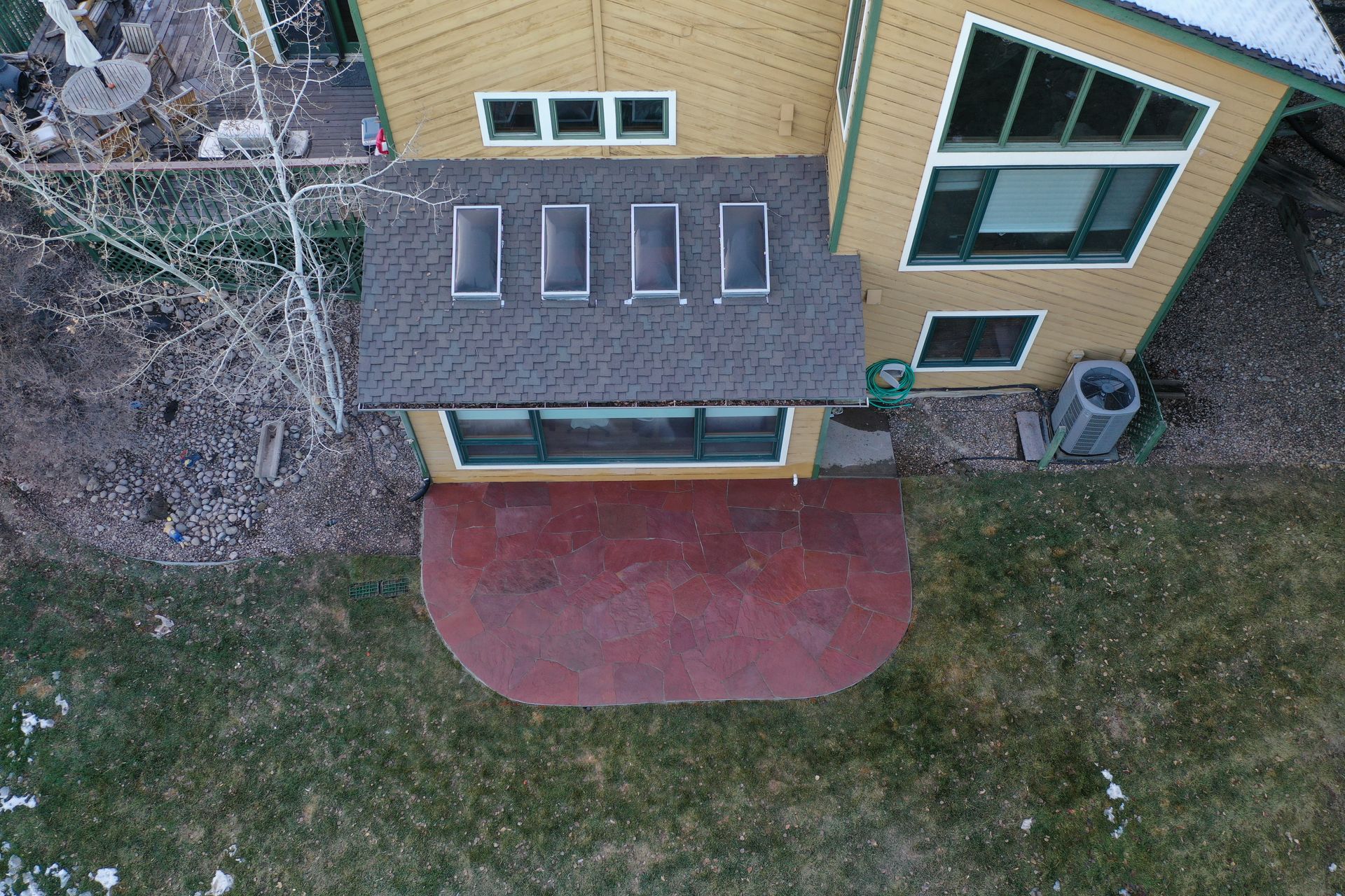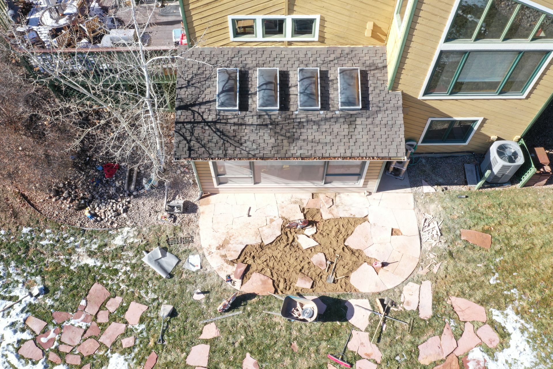 New Colorado red flagstone patio in backyard for gatherings. Niwot, CO 2019