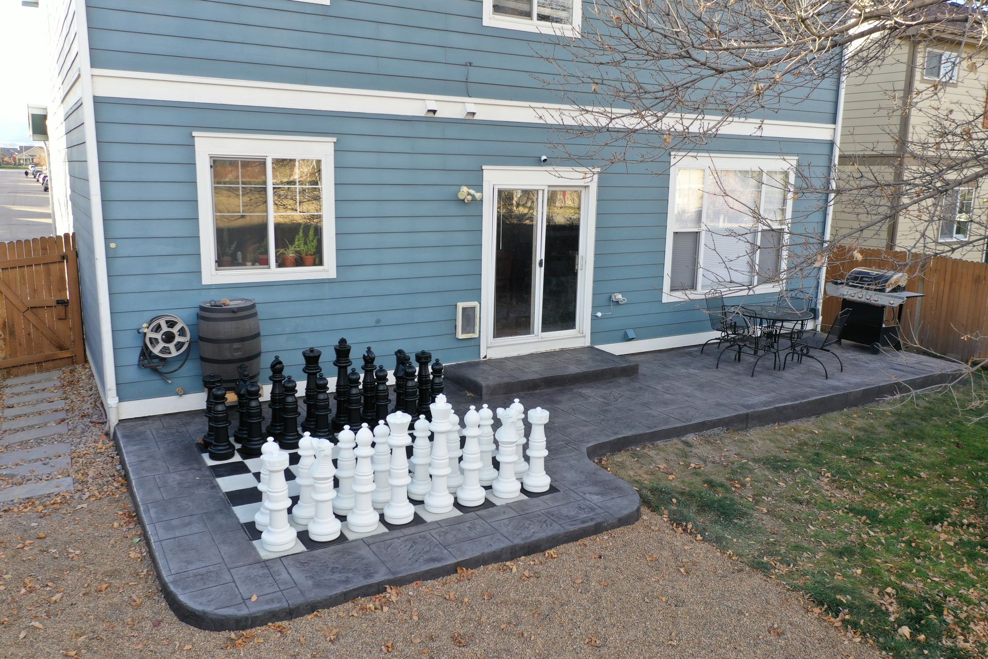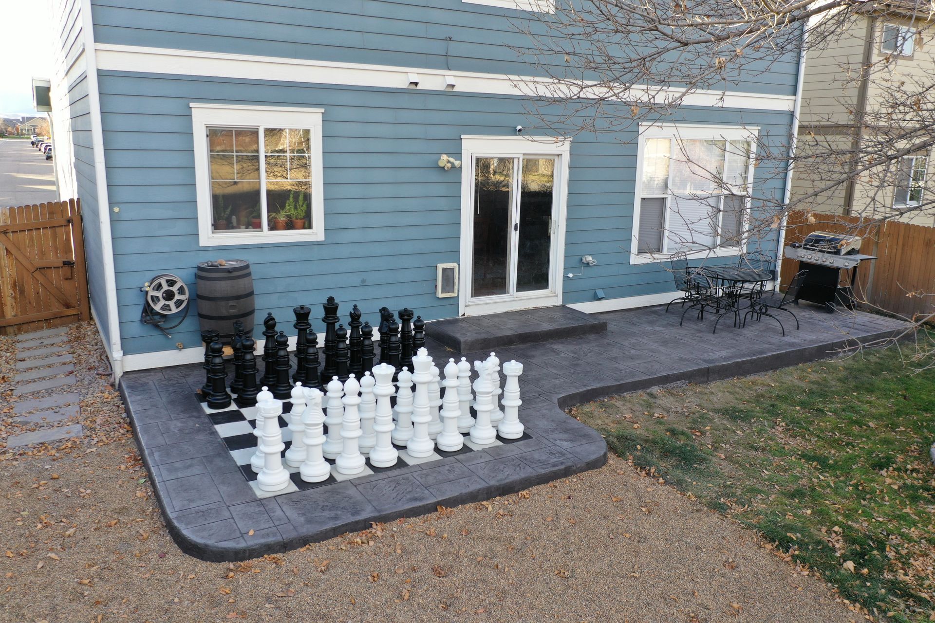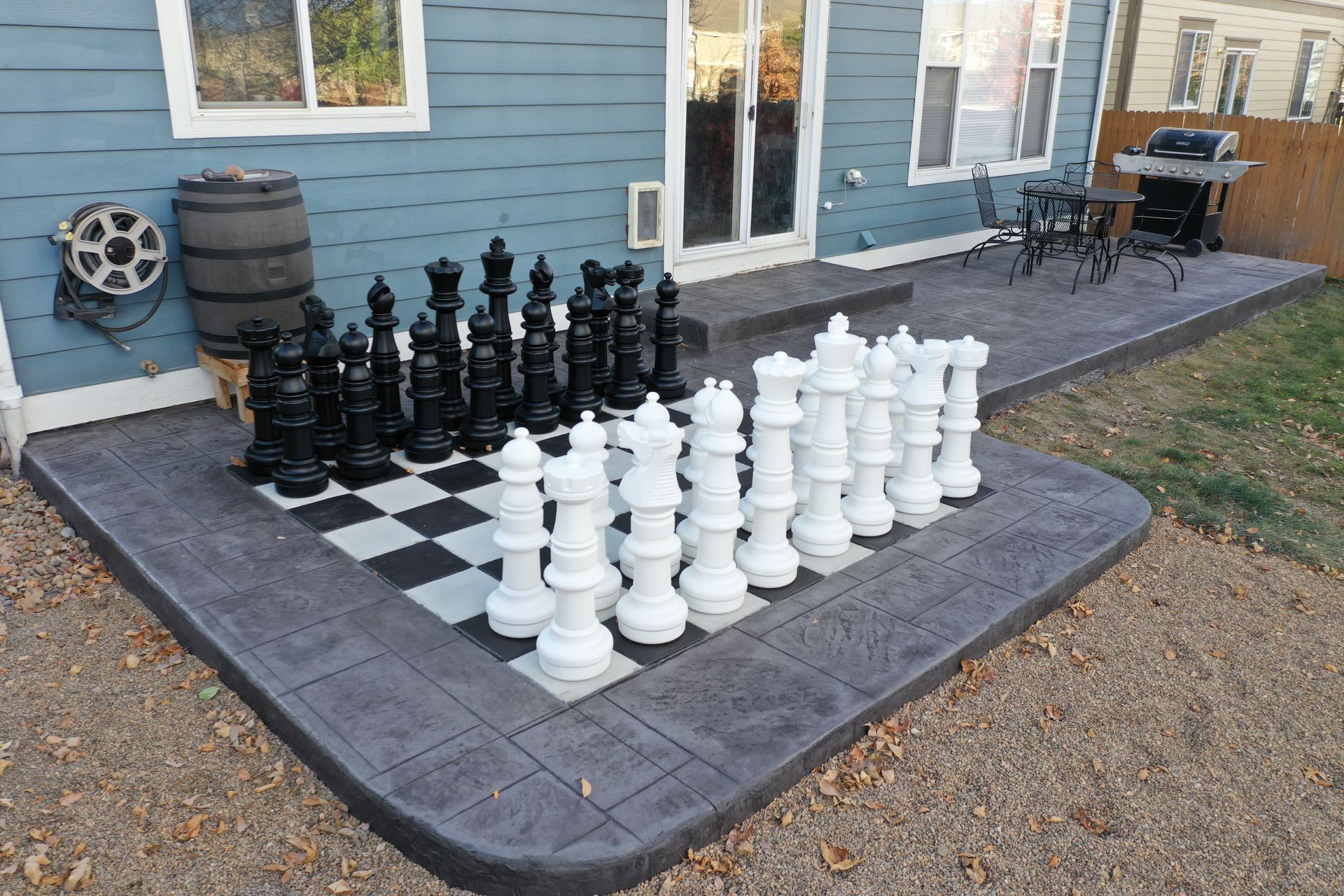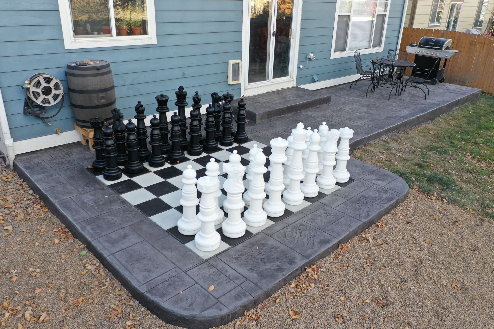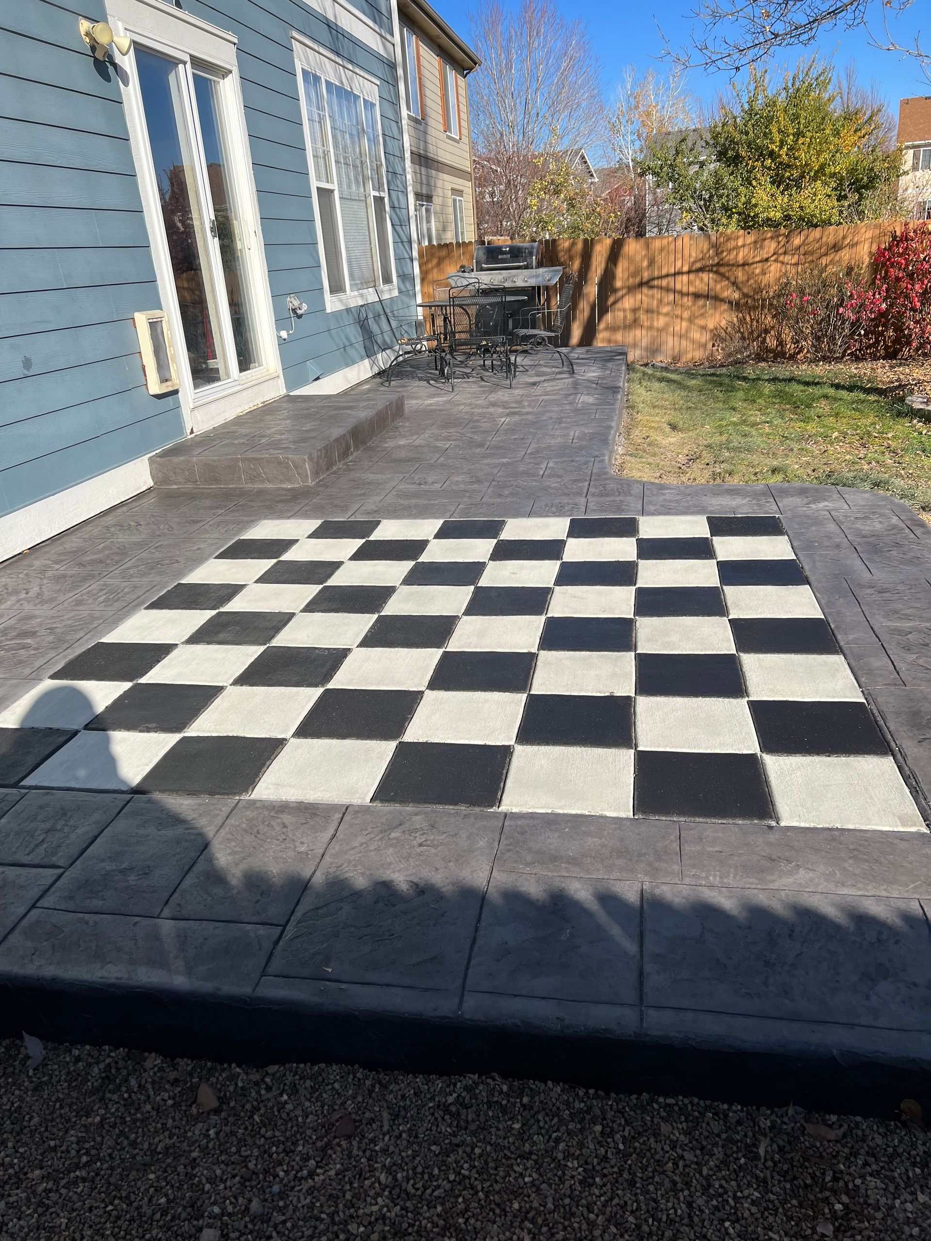 Beautiful stamped concrete patio with a fully usable life-size chessboard. All built to last with rebar, road base, and high quality concrete with fiber.