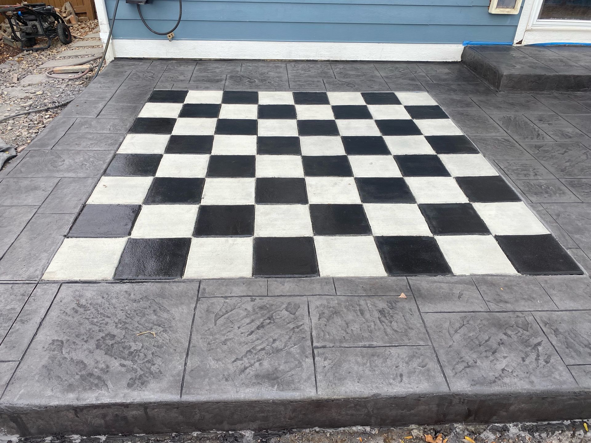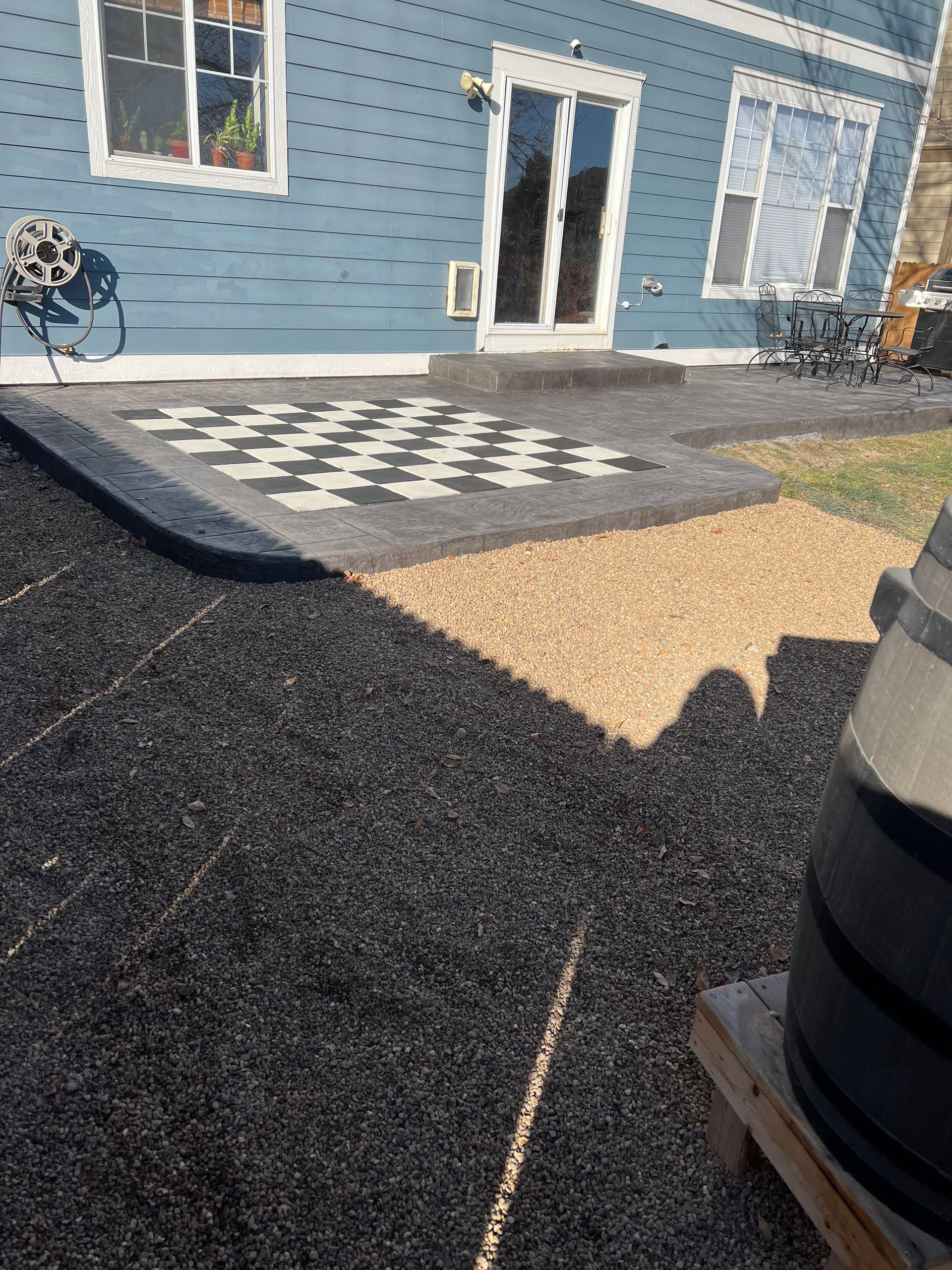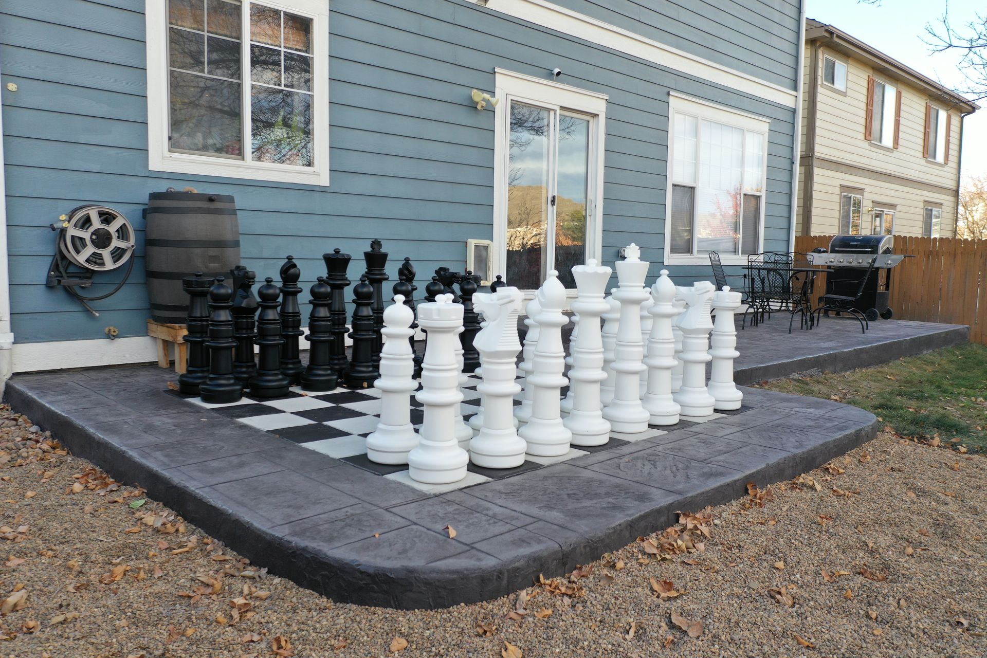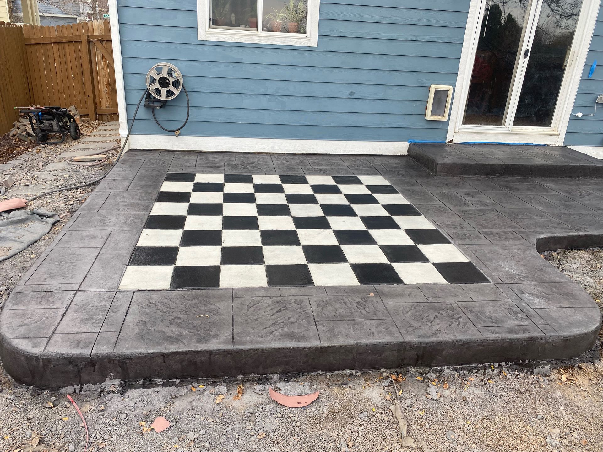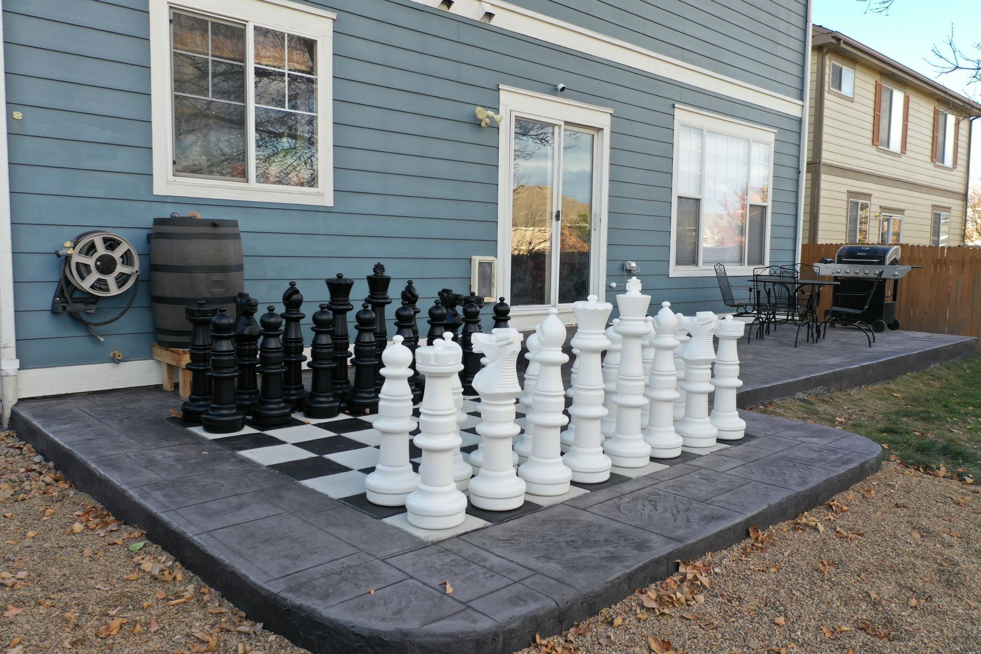 Beautiful stamped concrete patio with a fully usable life-size chessboard. All built to last with rebar, road base, and high quality concrete with fiber.
