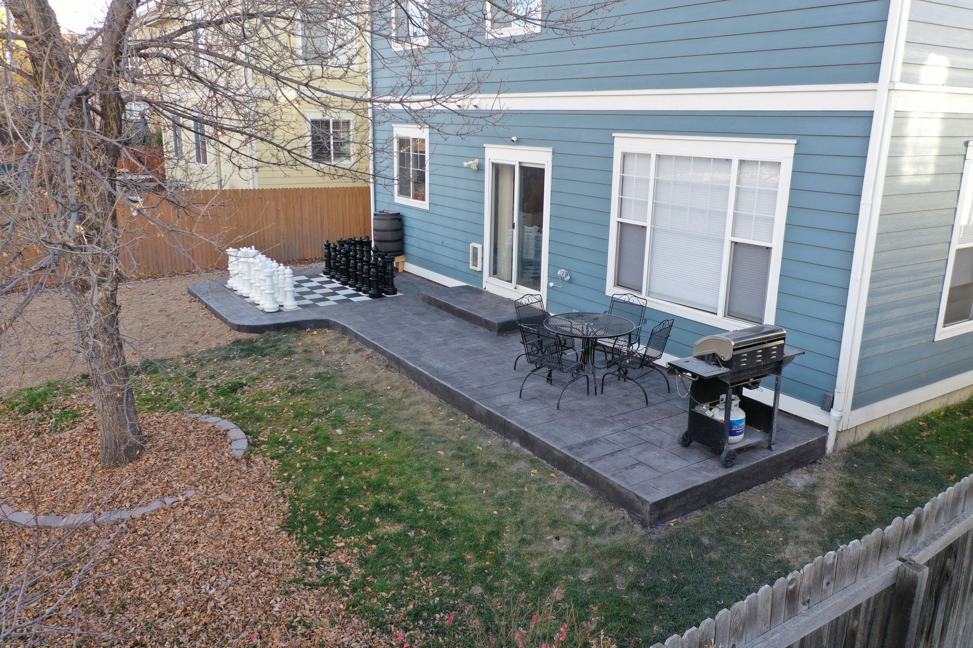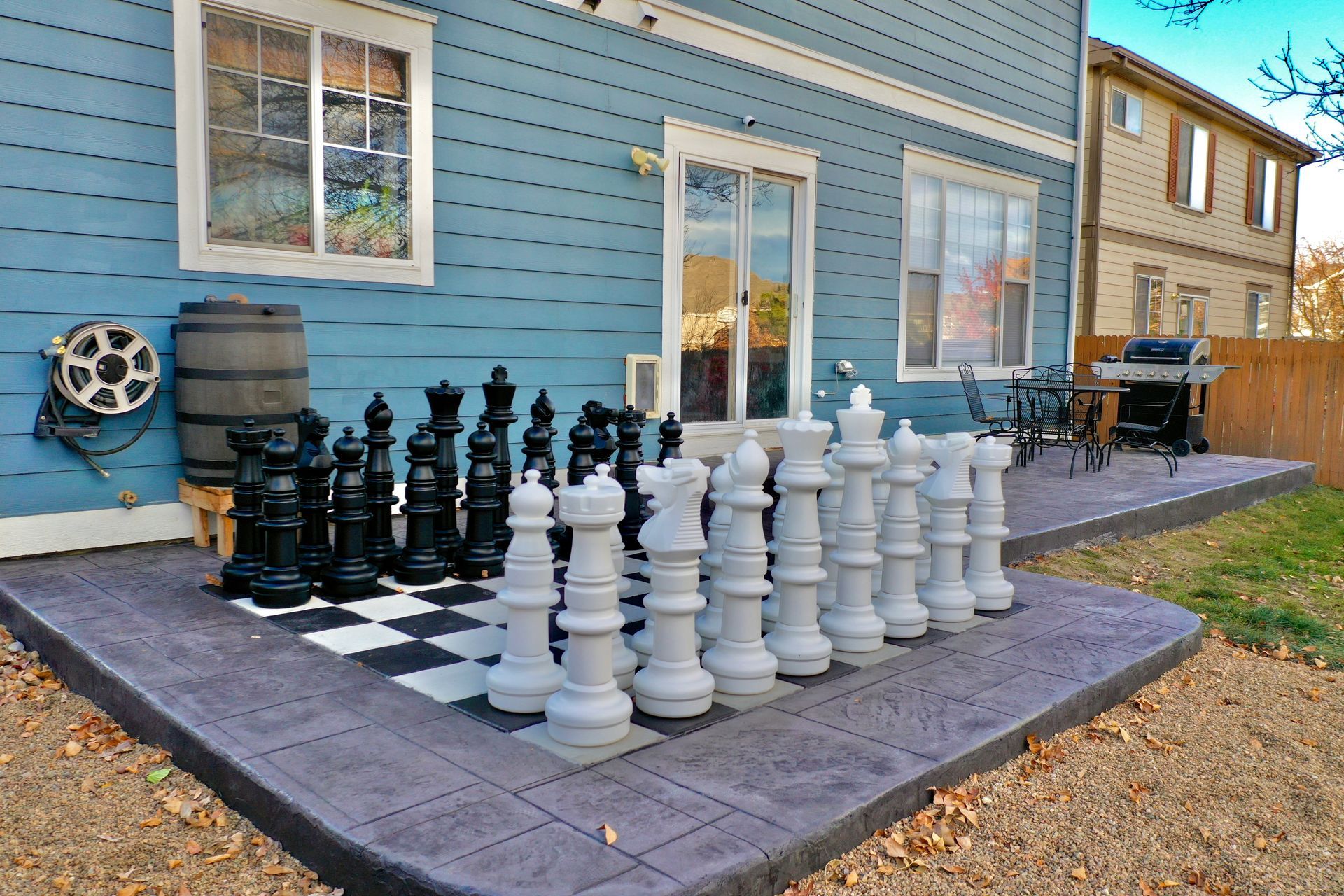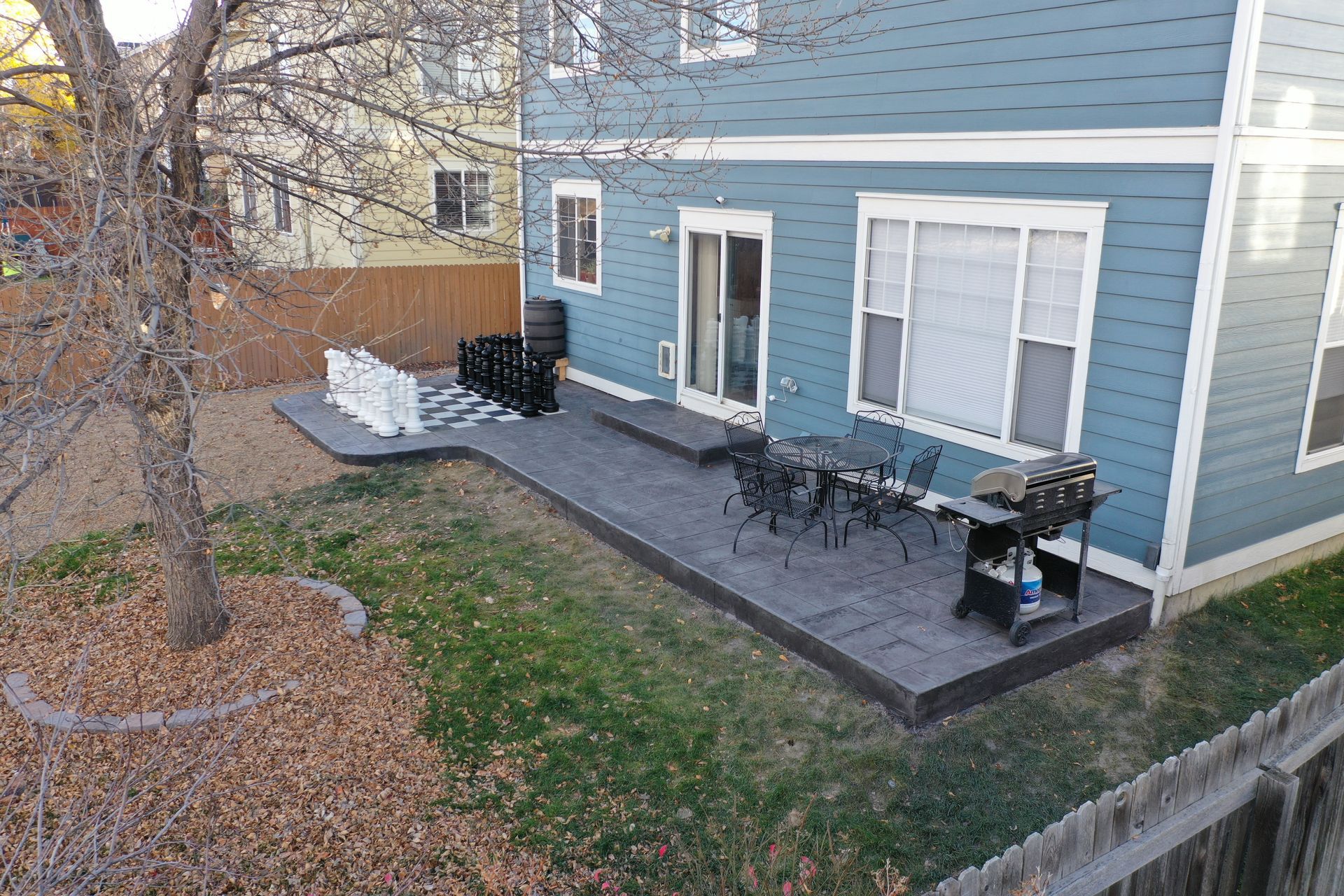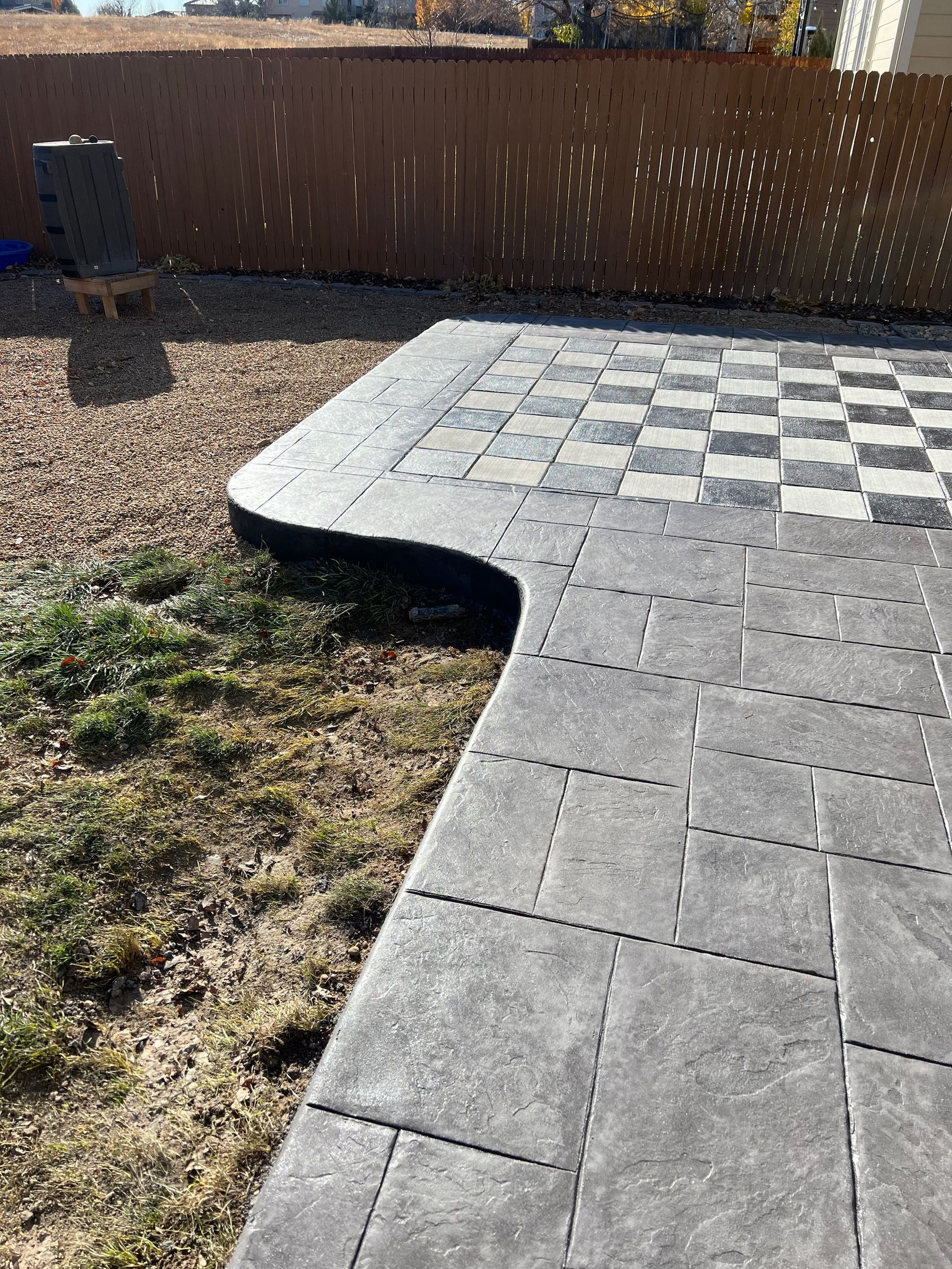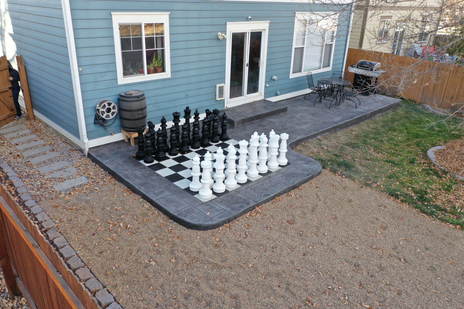 Beautiful stamped concrete patio with a fully usable life-size chessboard. All built to last with rebar, road base, and high quality concrete with fiber.