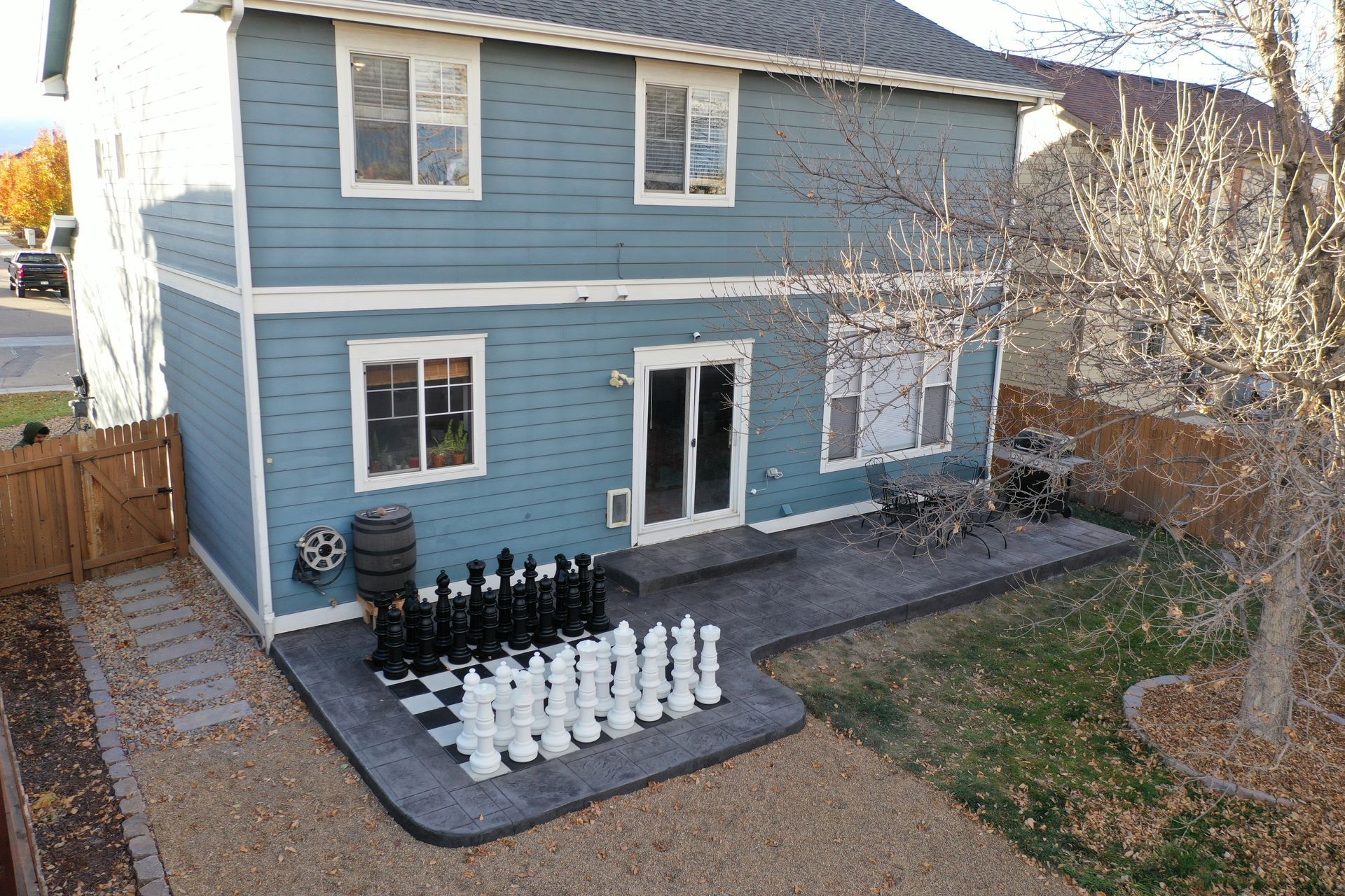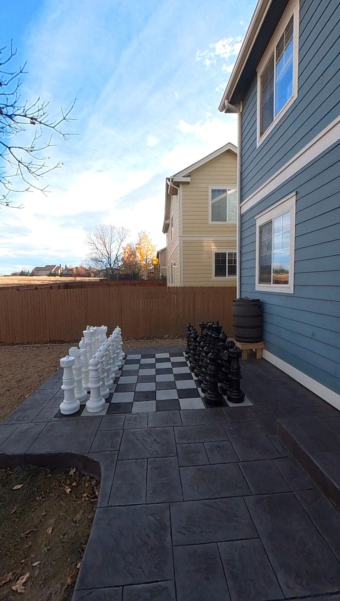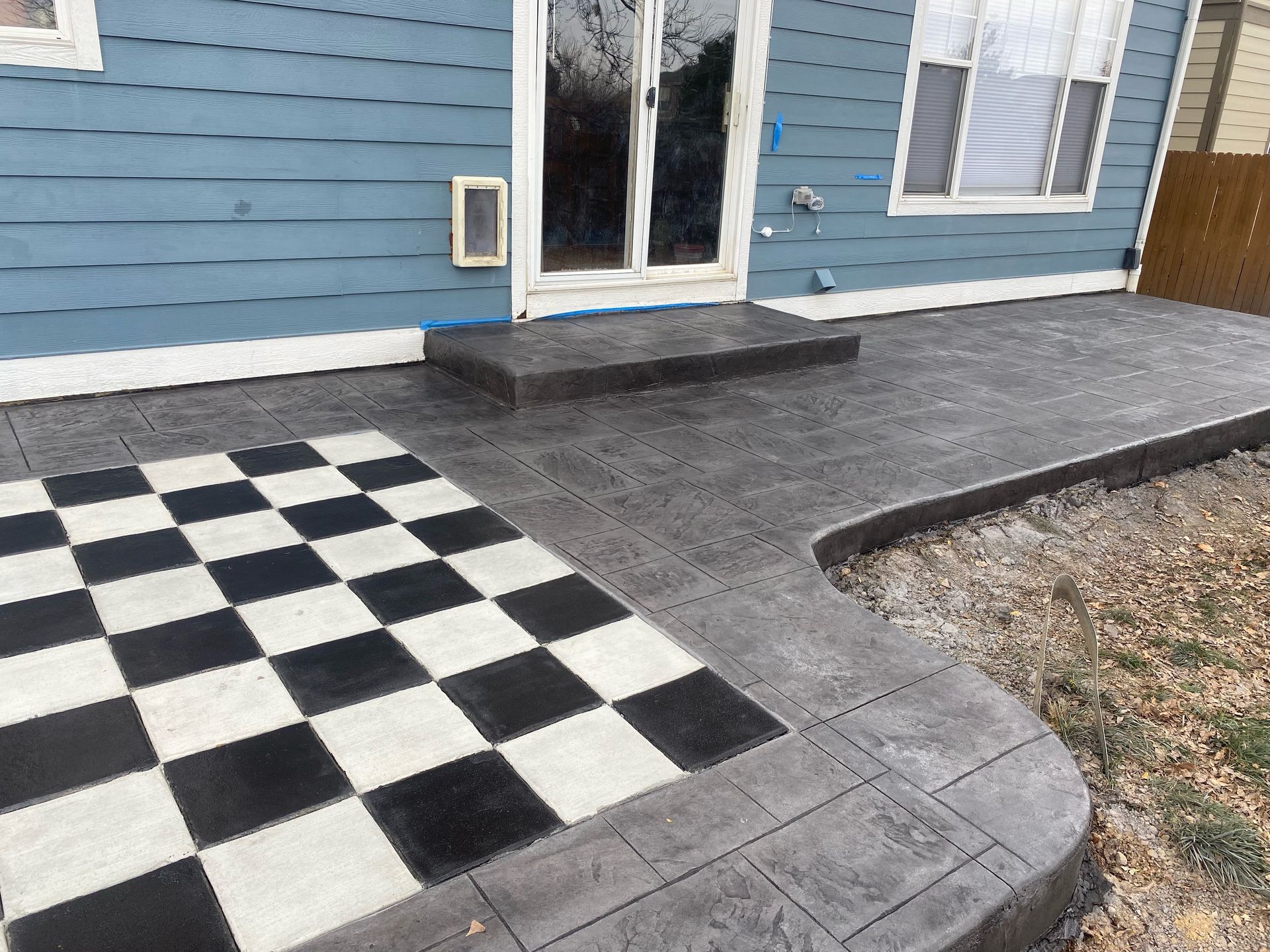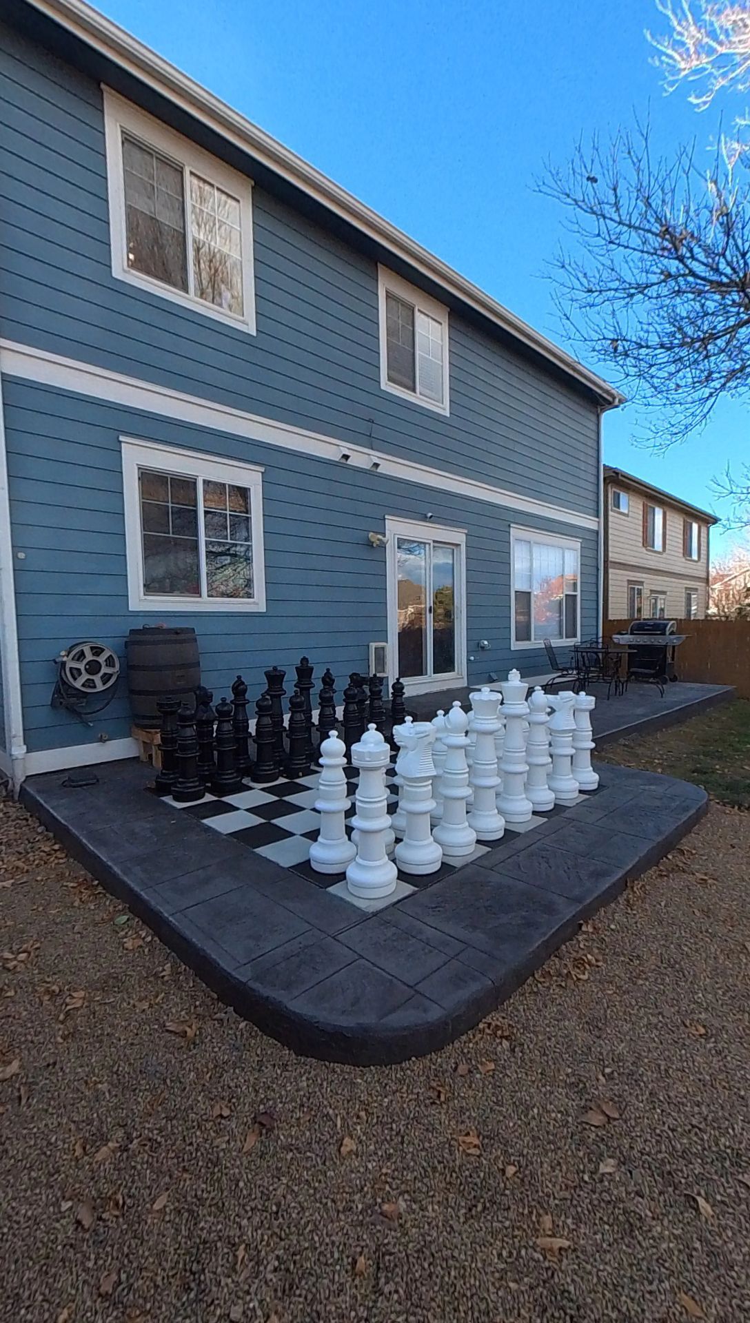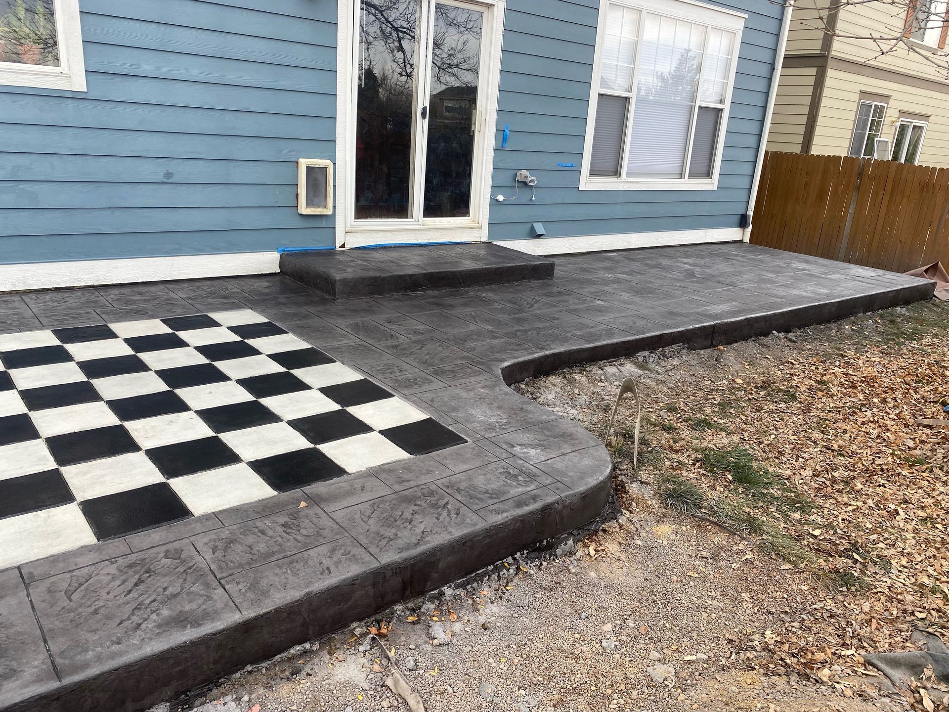 Beautiful stamped concrete patio with a fully usable life-size chessboard. All built to last with rebar, road base, and high quality concrete with fiber.