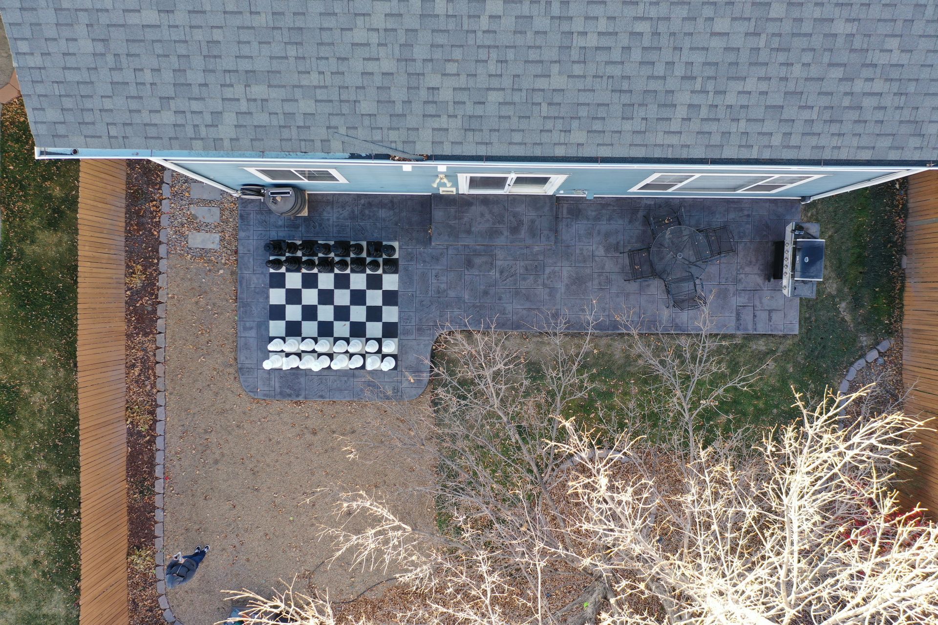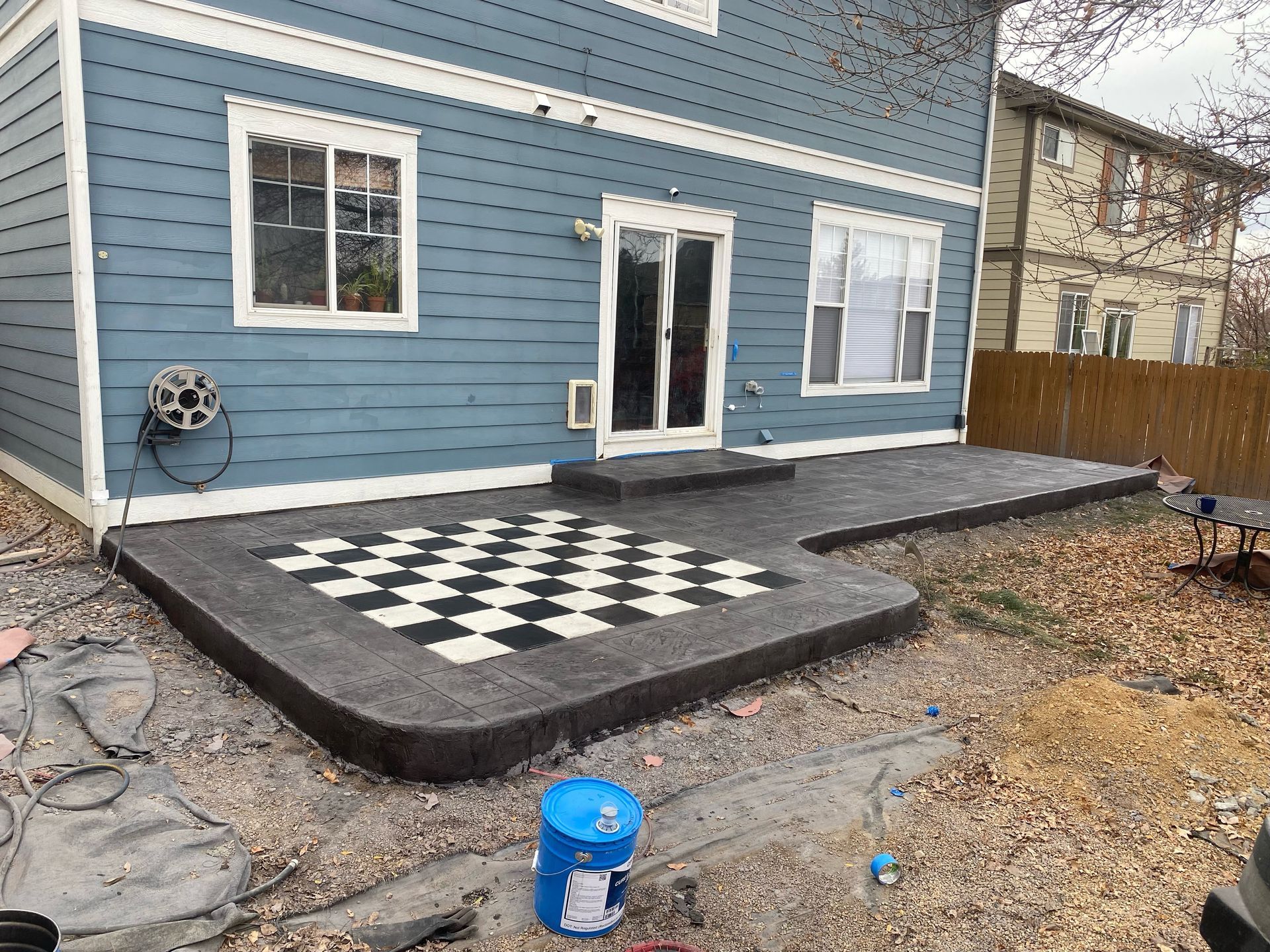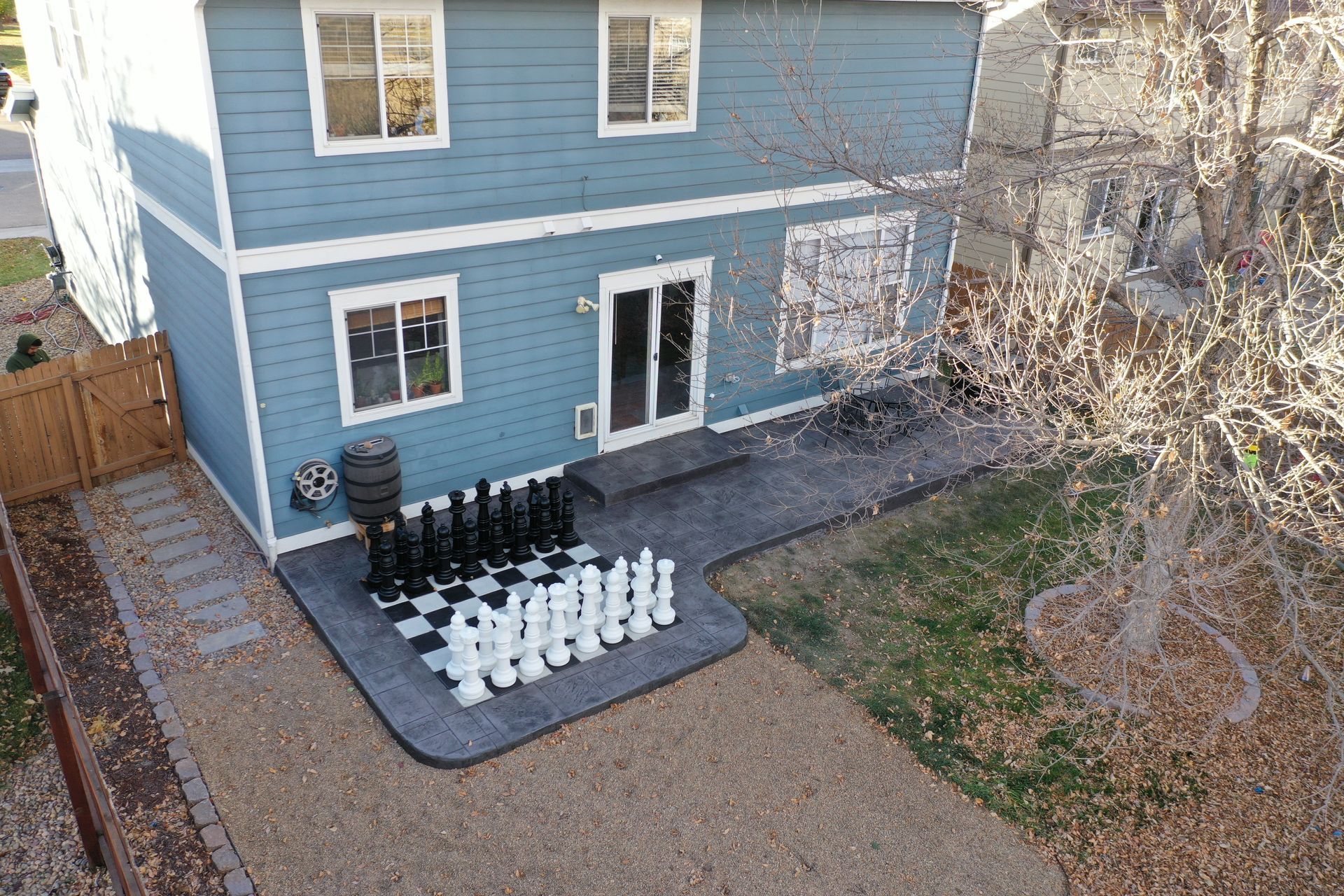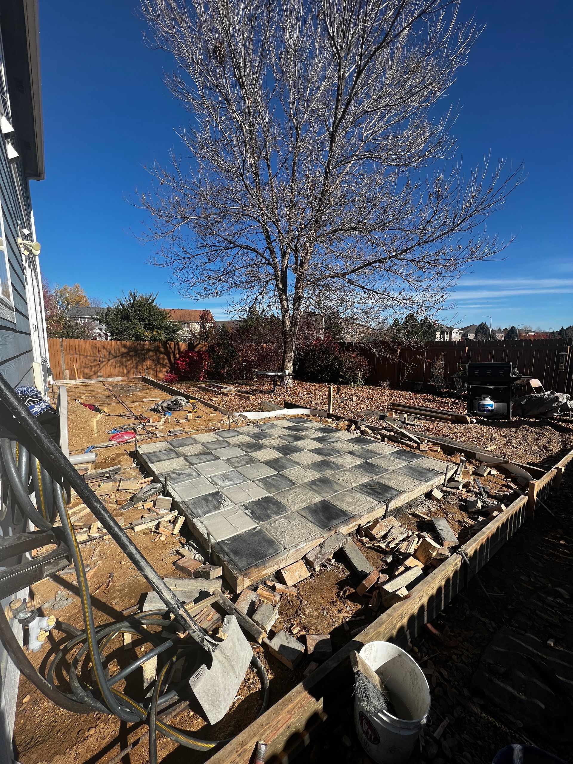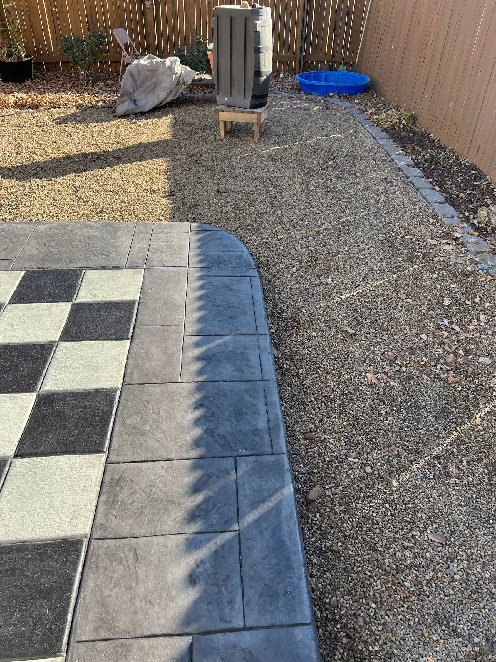 Beautiful stamped concrete patio with a fully usable life-size chessboard. All built to last with rebar, road base, and high quality concrete with fiber.