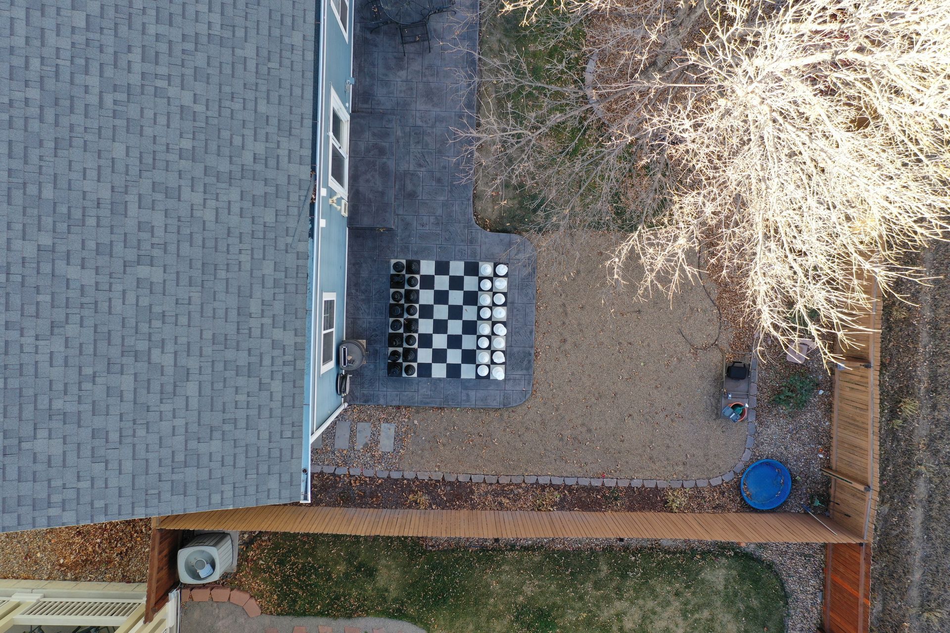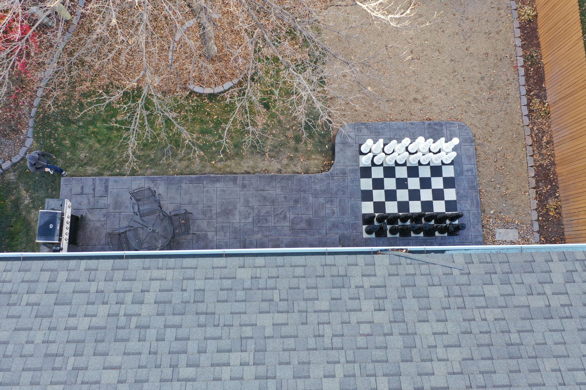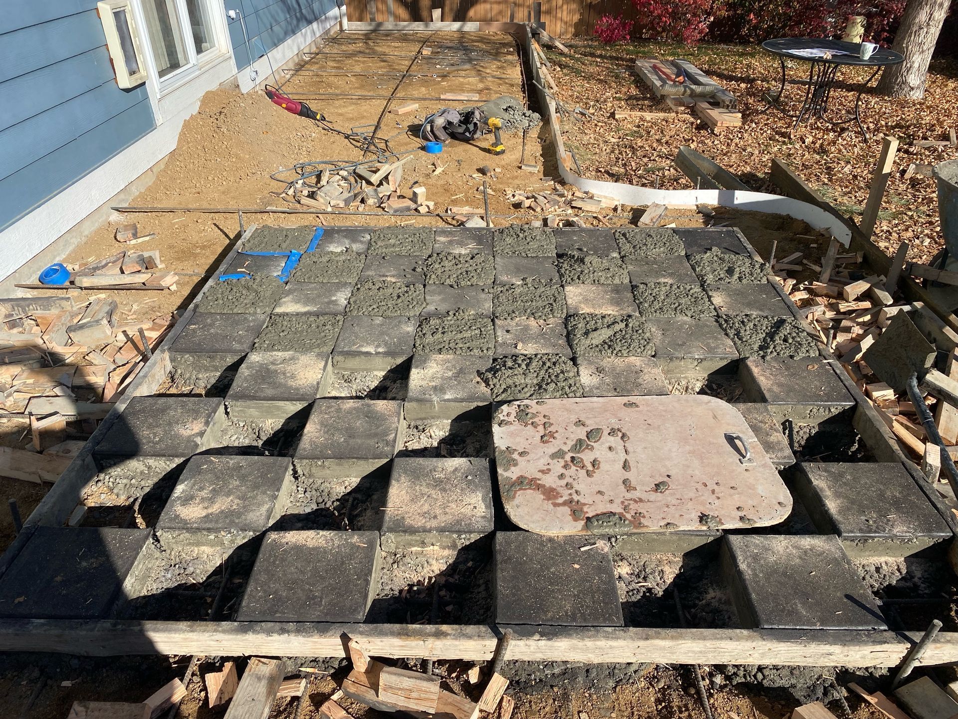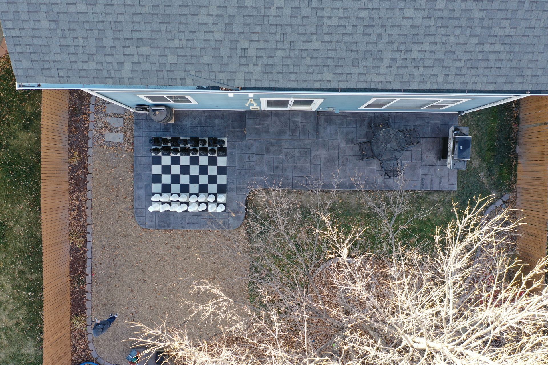 Beautiful stamped concrete patio with a fully usable life-size chessboard. All built to last with rebar, road base, and high quality concrete with fiber.