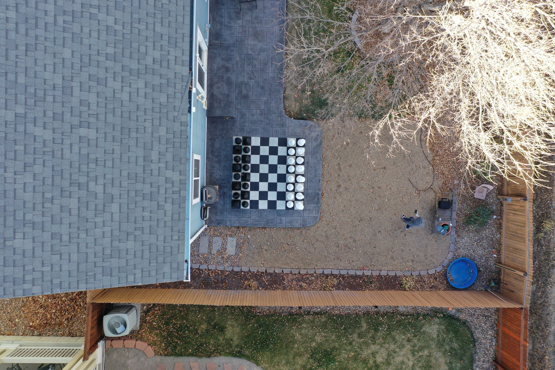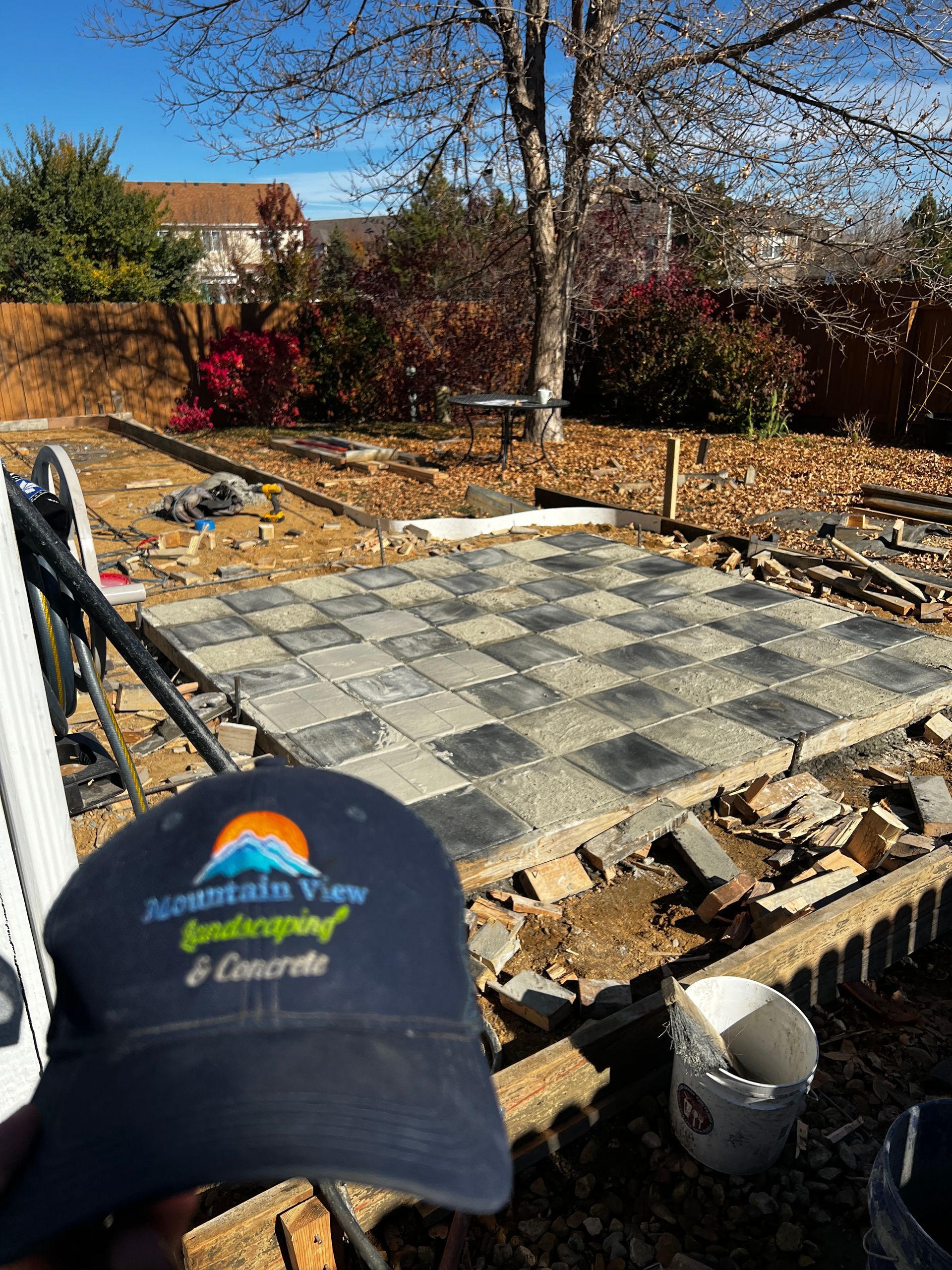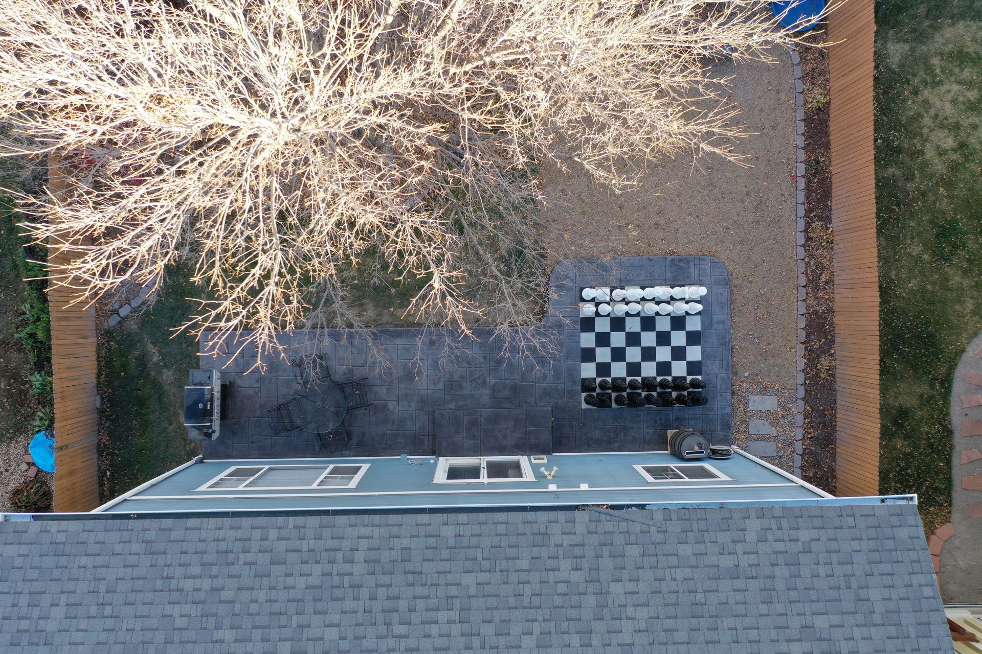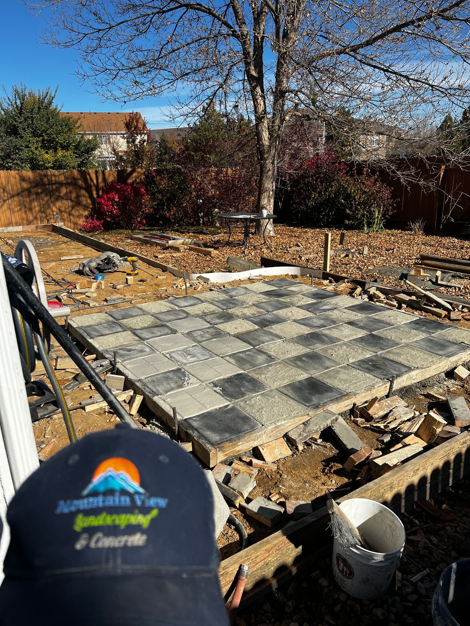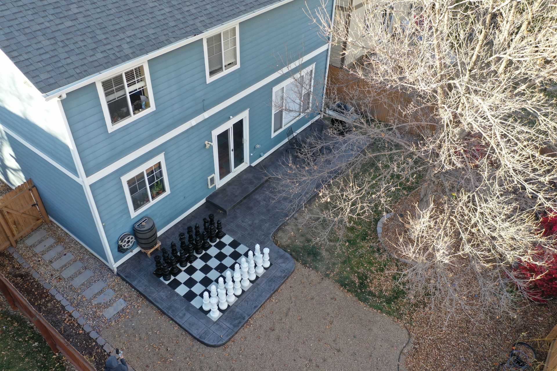 Beautiful stamped concrete patio with a fully usable life-size chessboard. All built to last with rebar, road base, and high quality concrete with fiber.