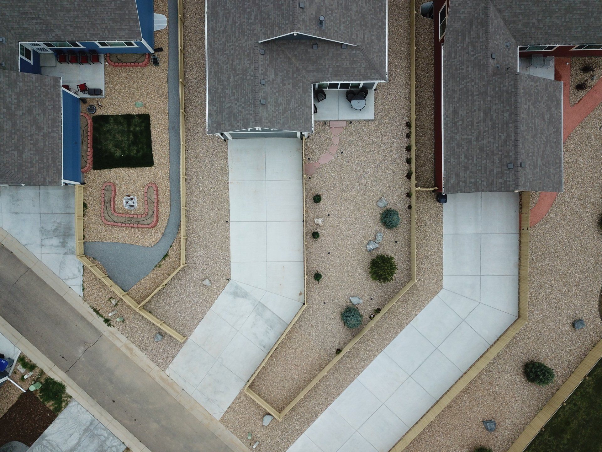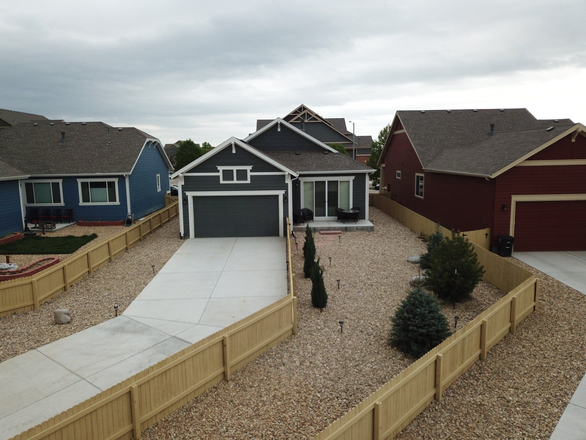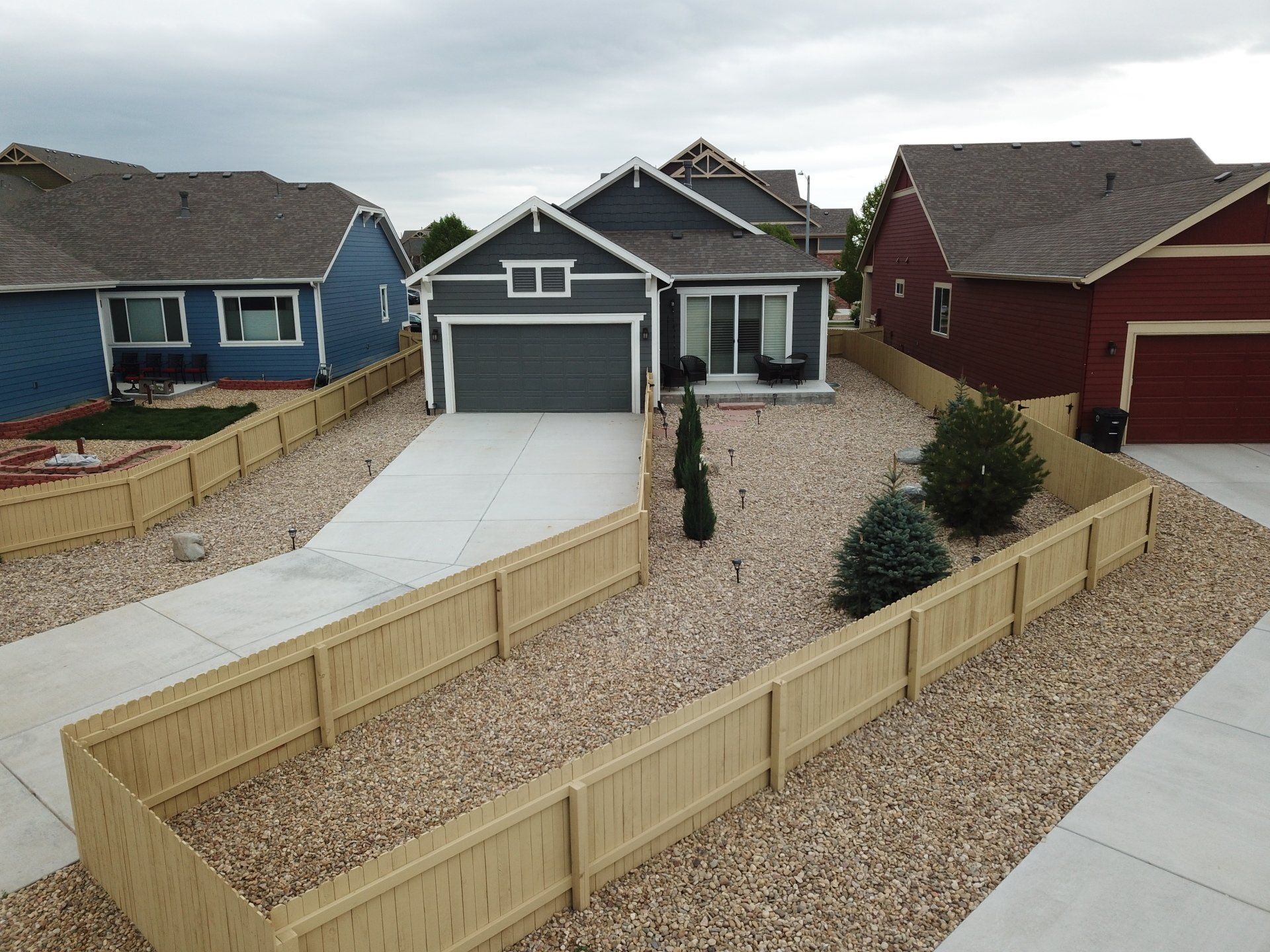 Xeroscape project at newly built home to reduce watering costs and provide budget friendly project. Only high quality materials used and quality trees.