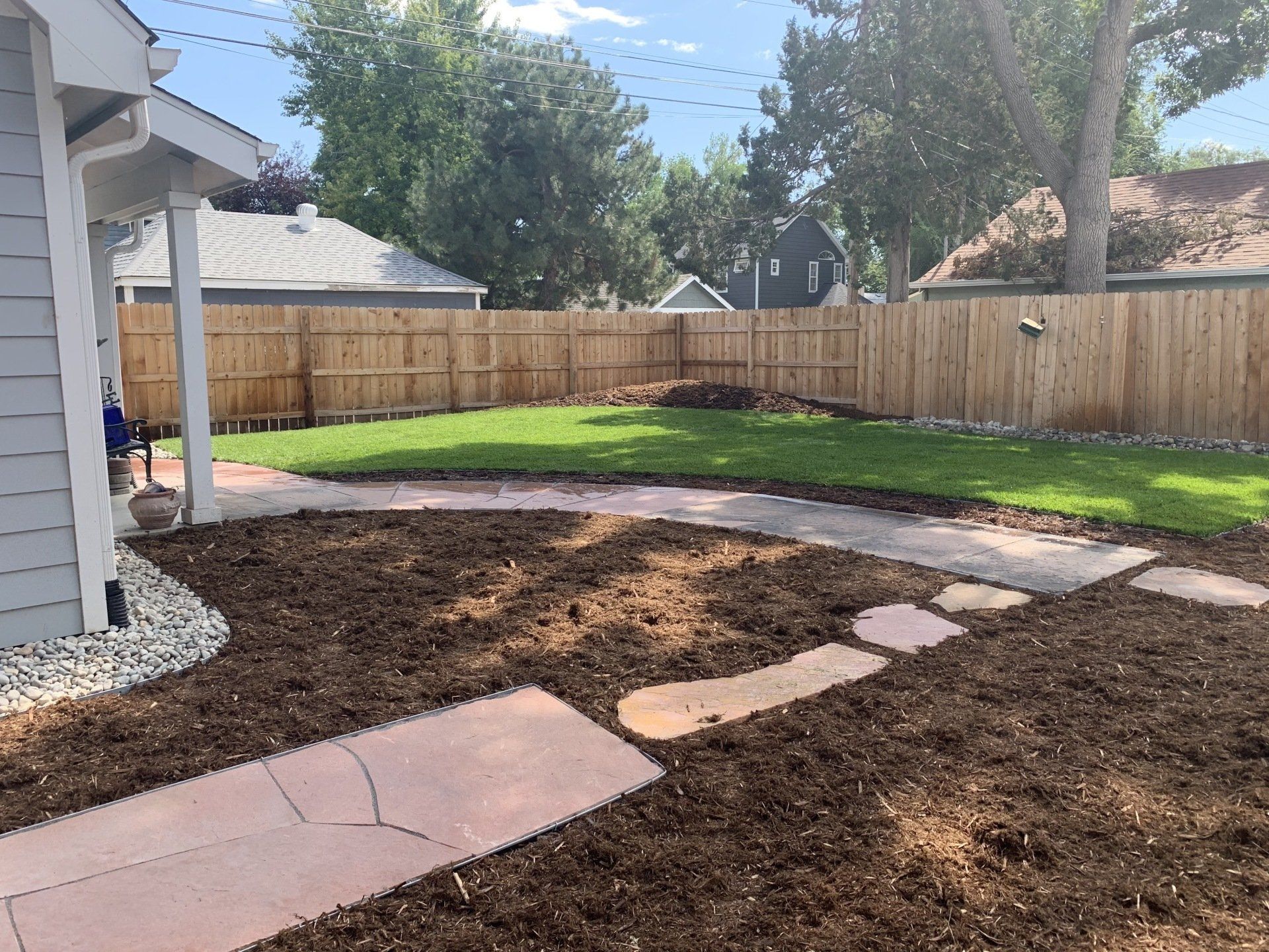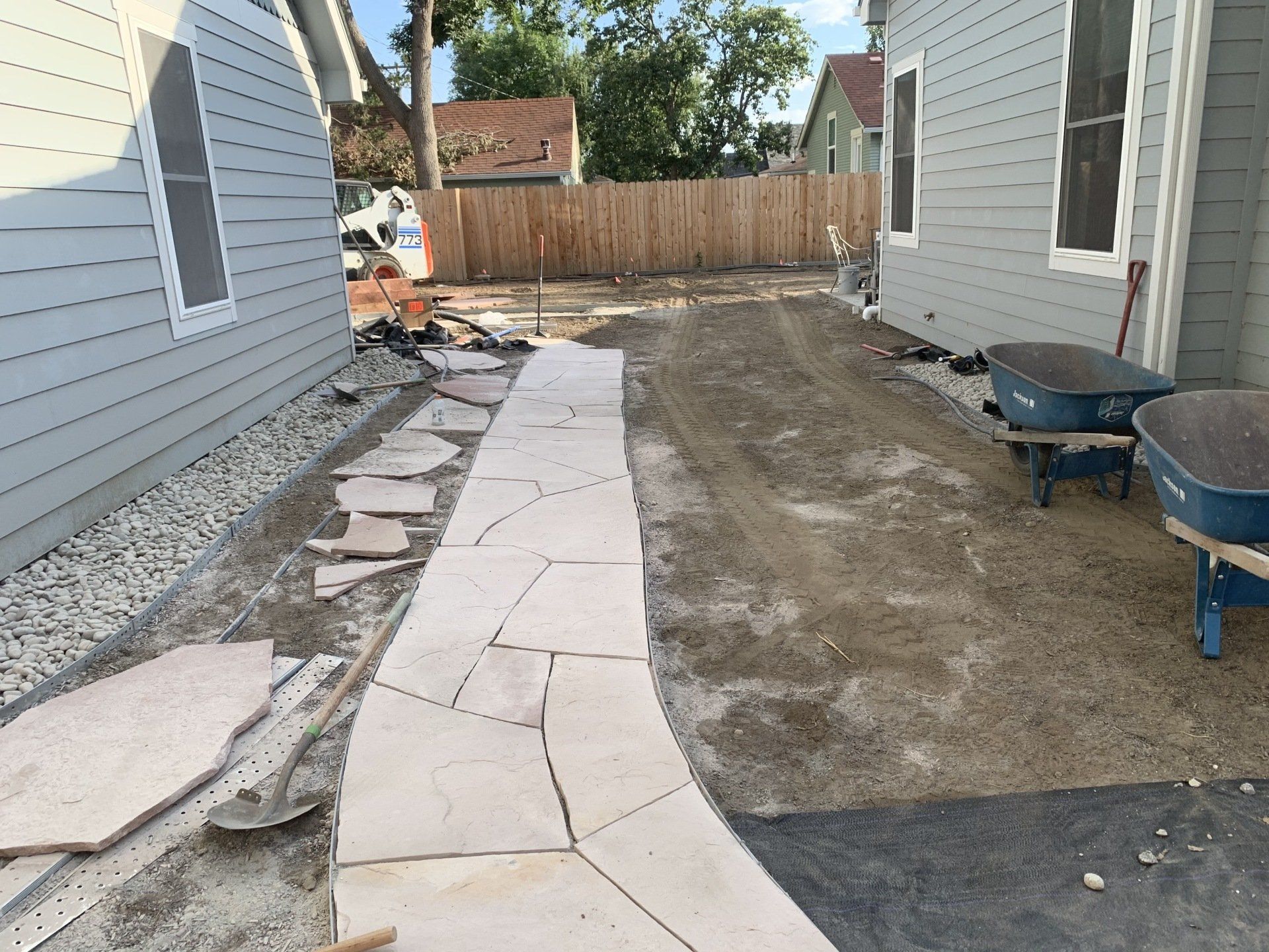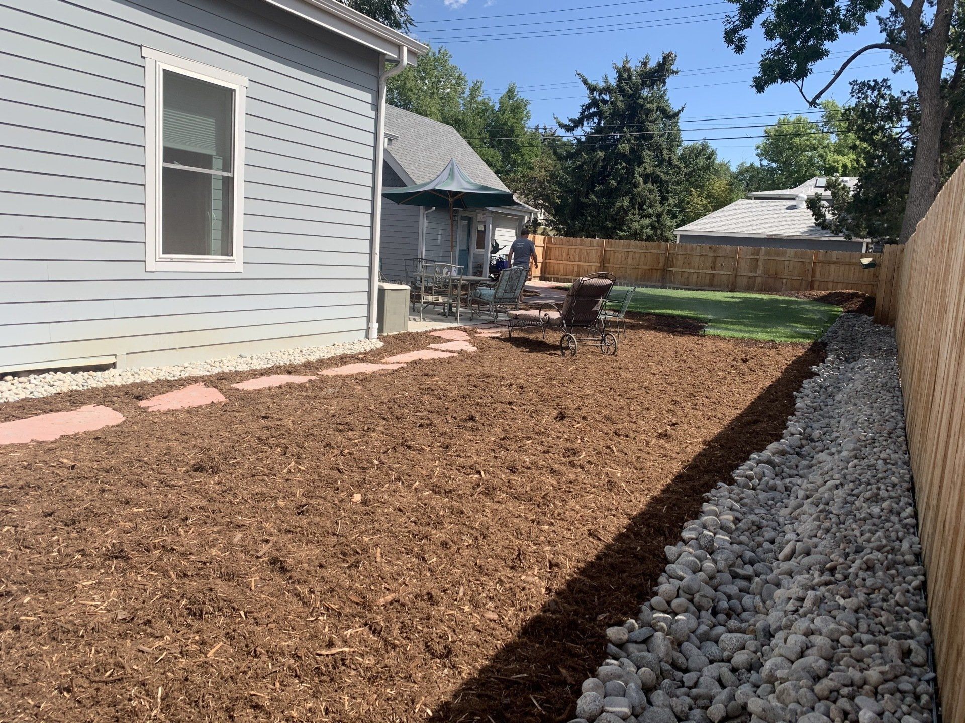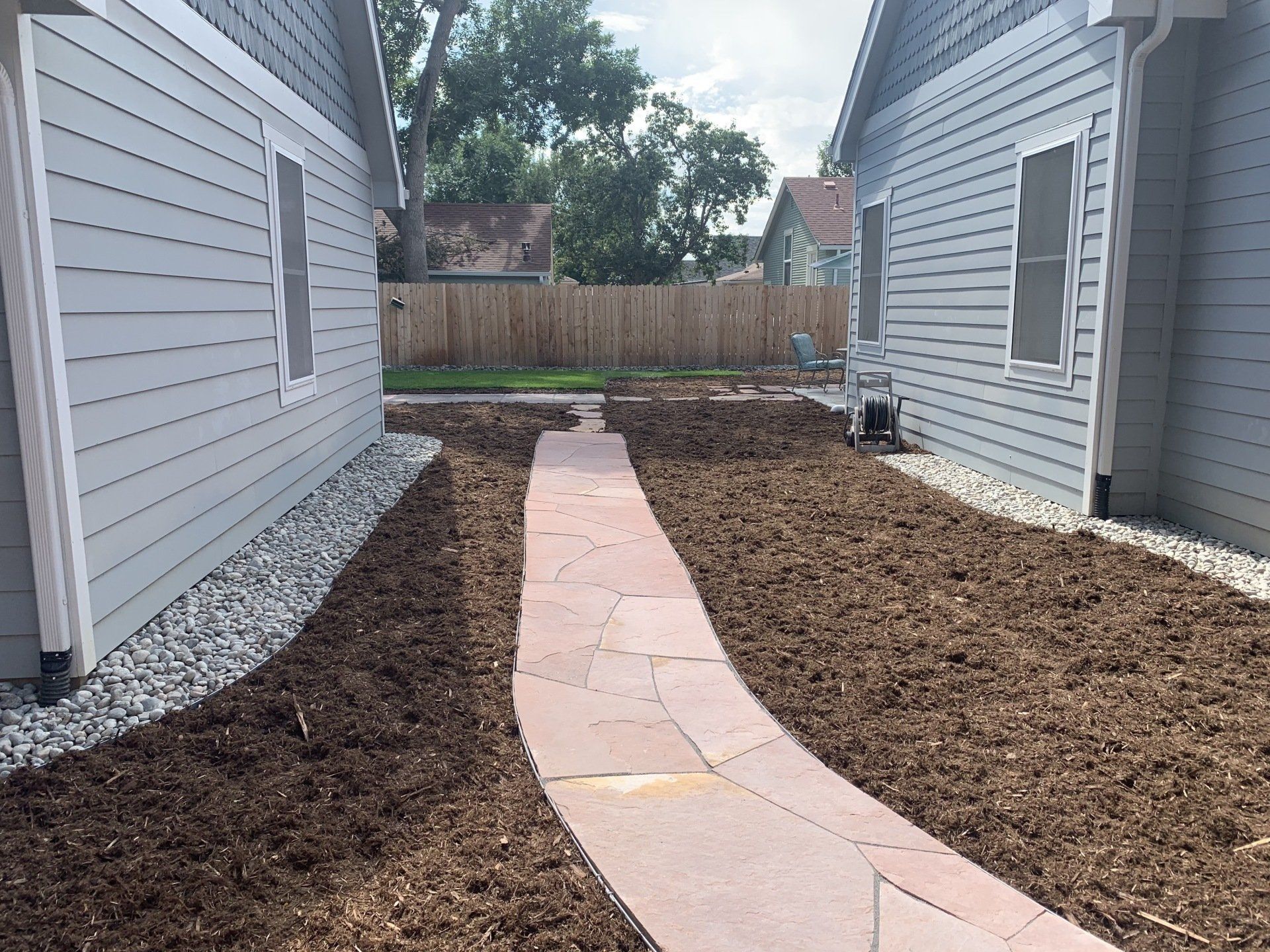 Newly remodeled home that had us install natural streams using cobble. Grass, mulch, and beautiful flagstone walkways built to ensure client enjoys all backyard areas.
