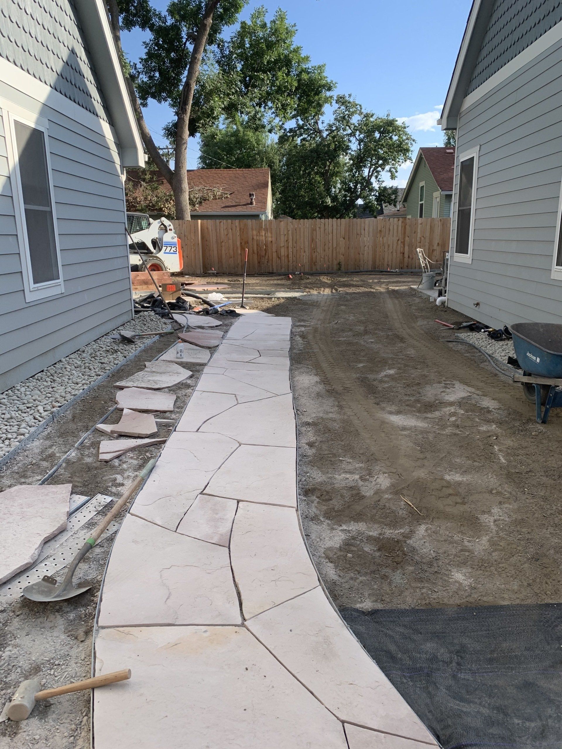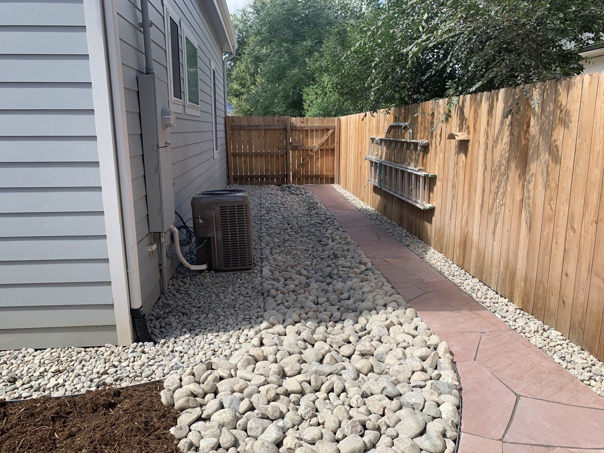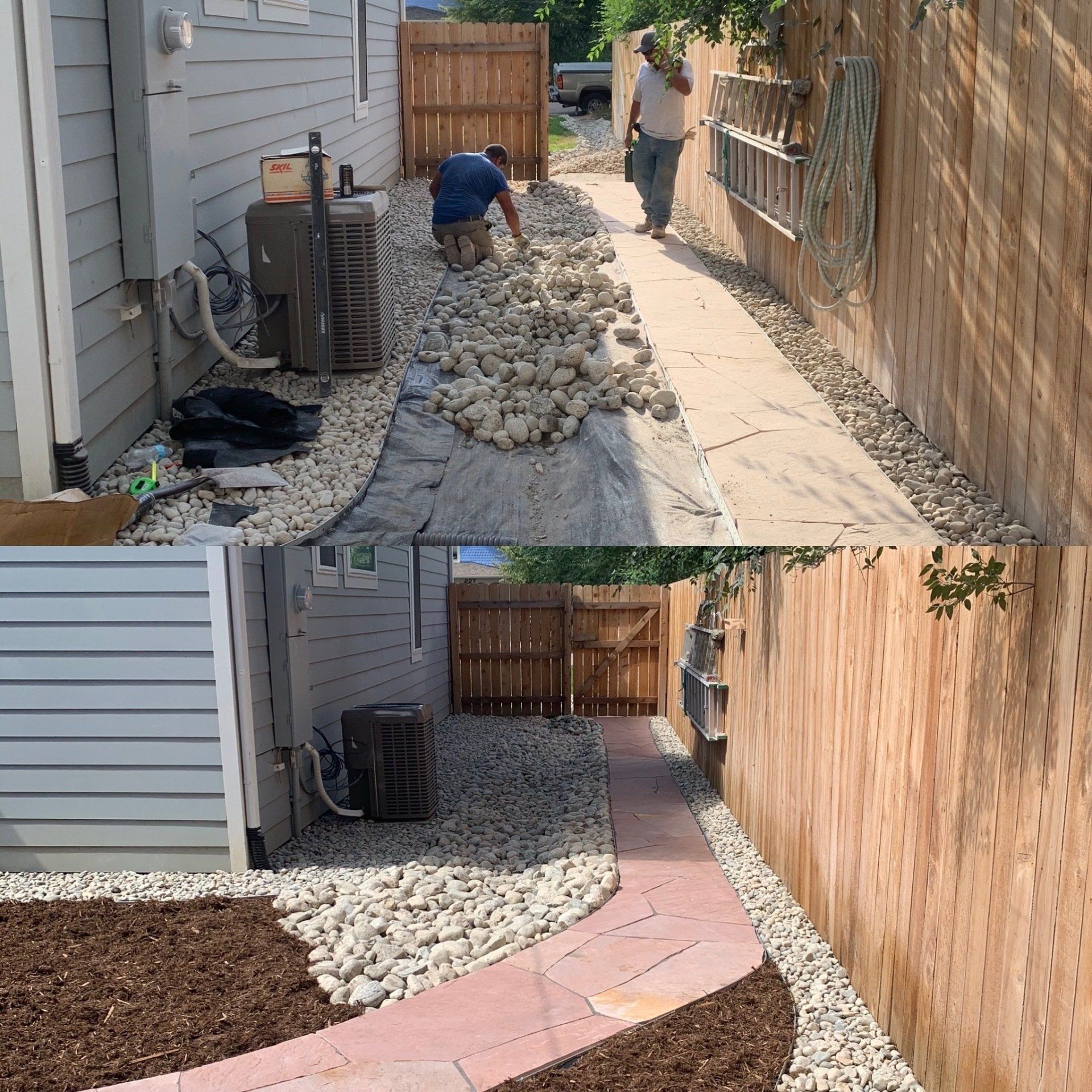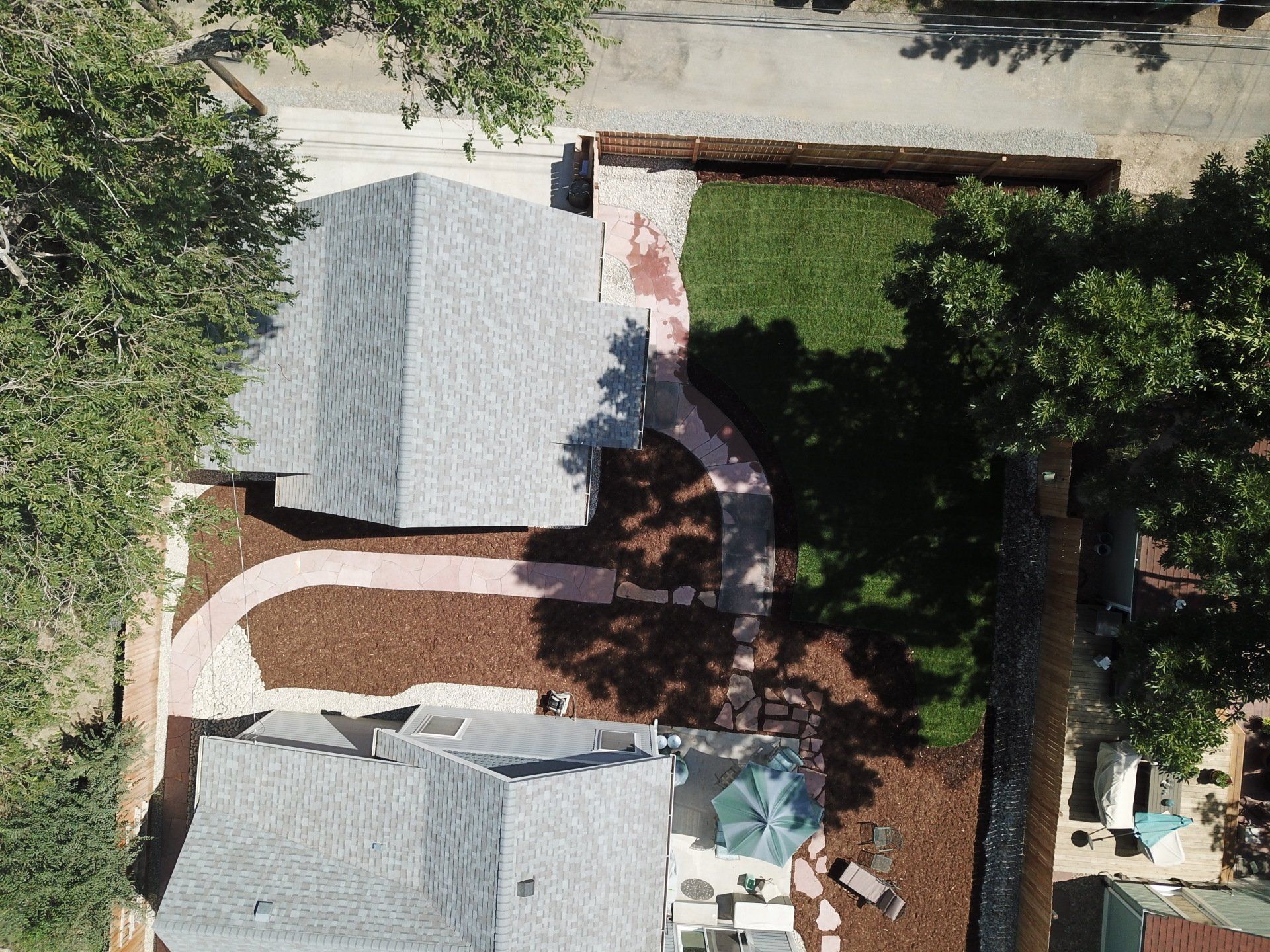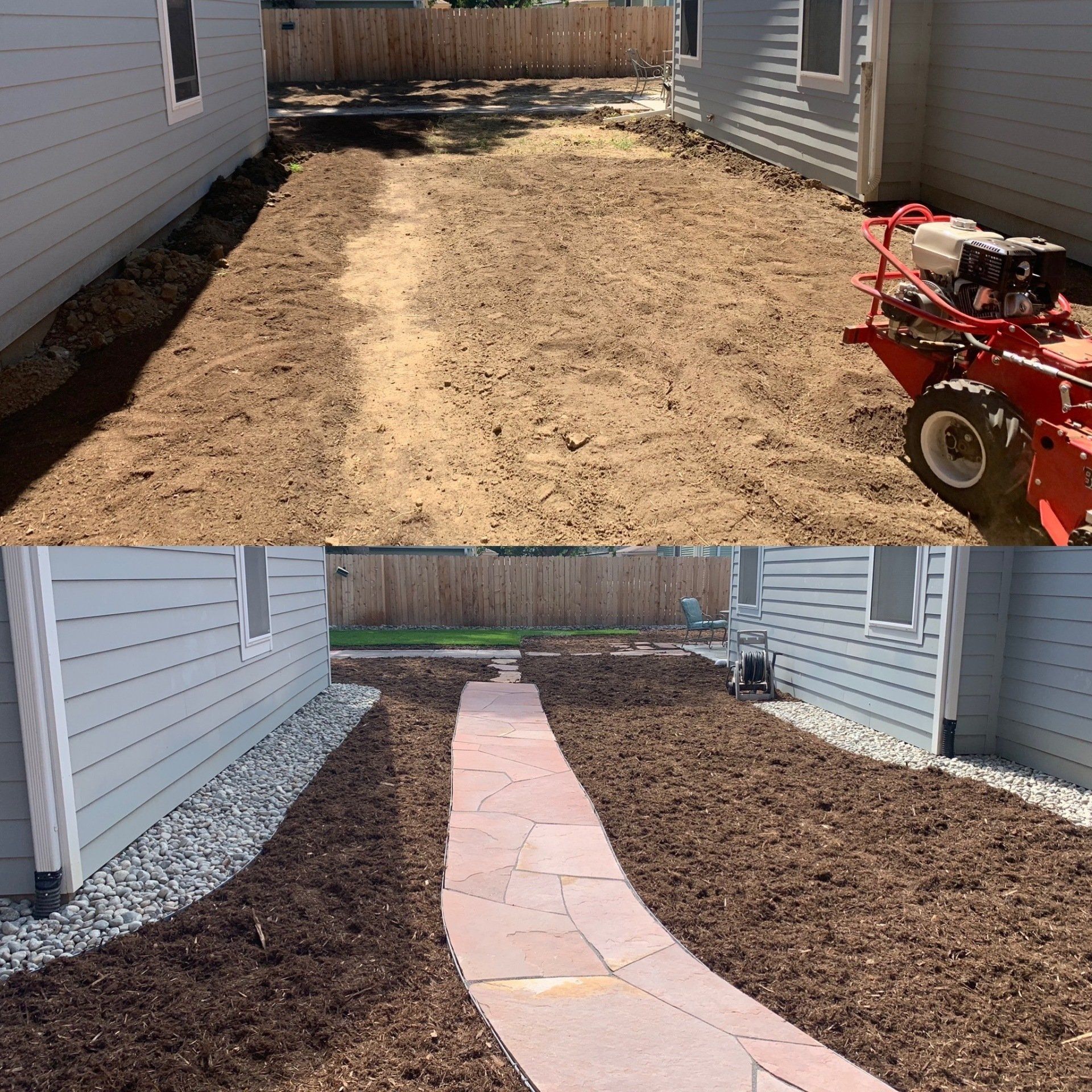 Newly remodeled home that had us install natural streams using cobble. Grass, mulch, and beautiful flagstone walkways built to ensure client enjoys all backyard areas.