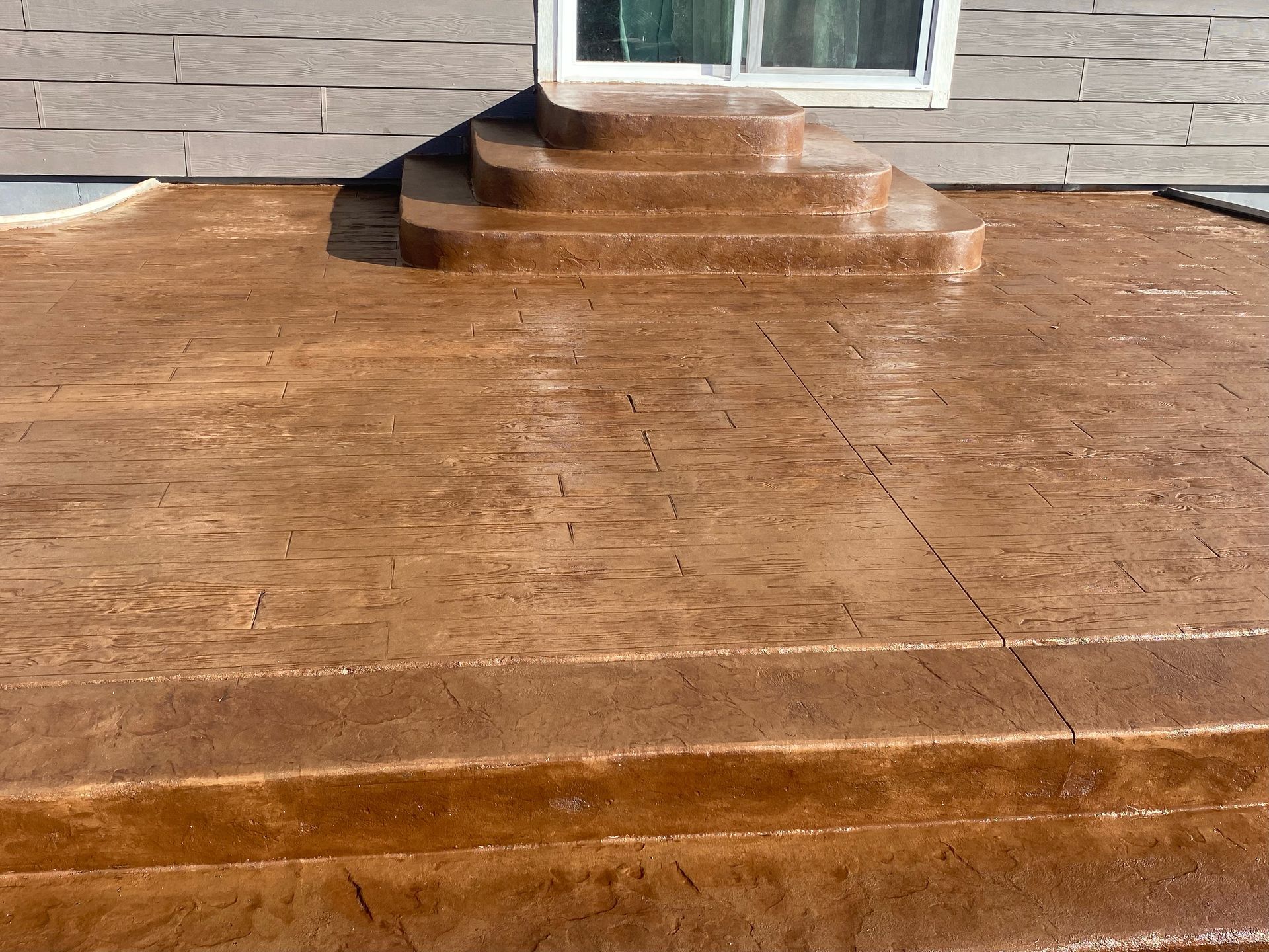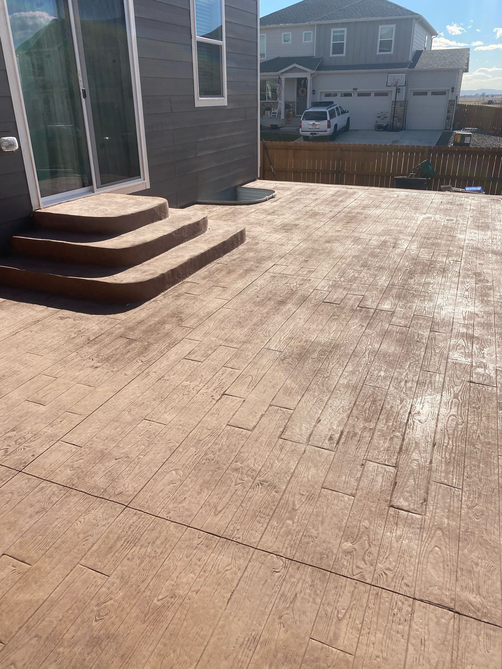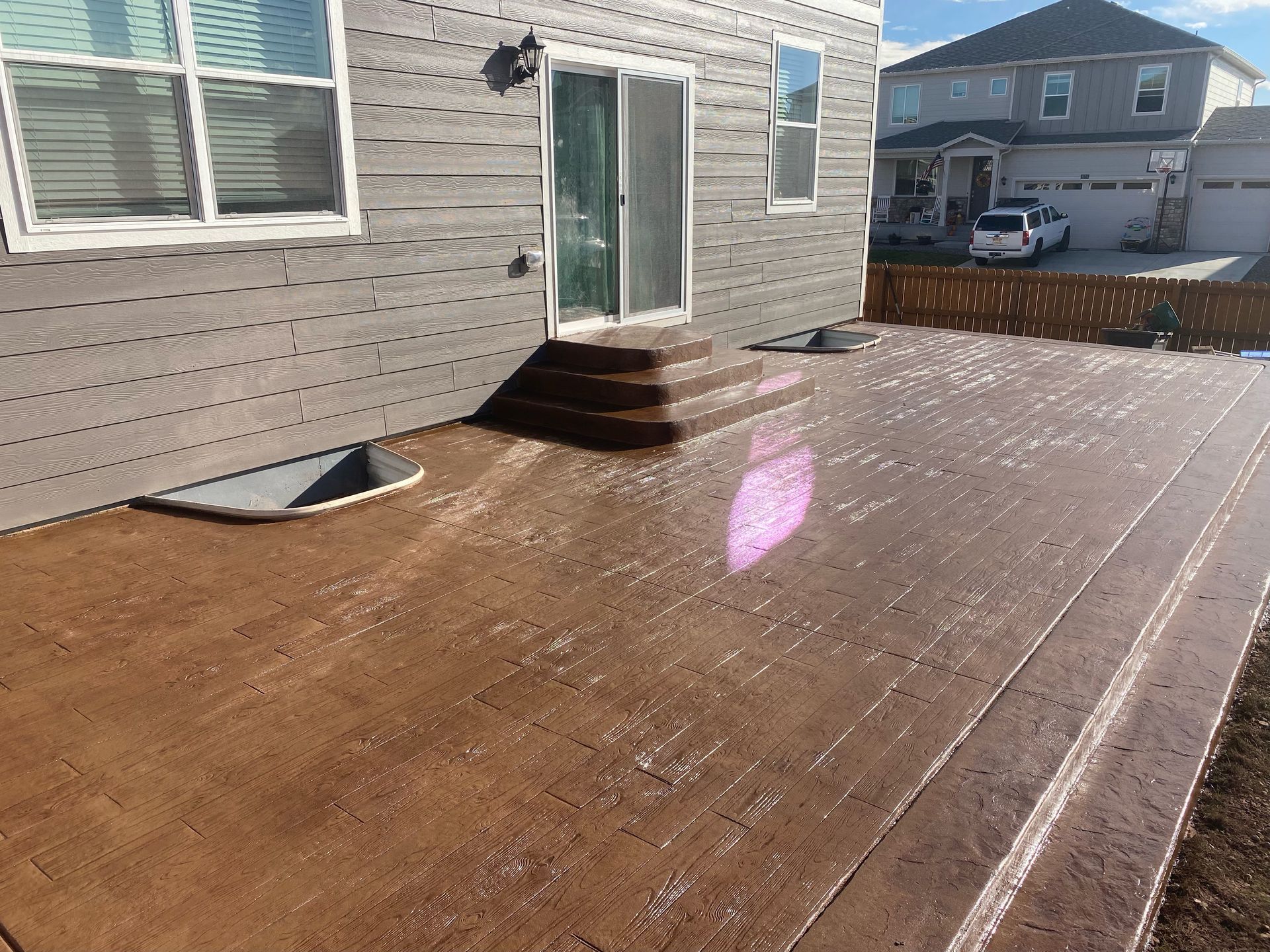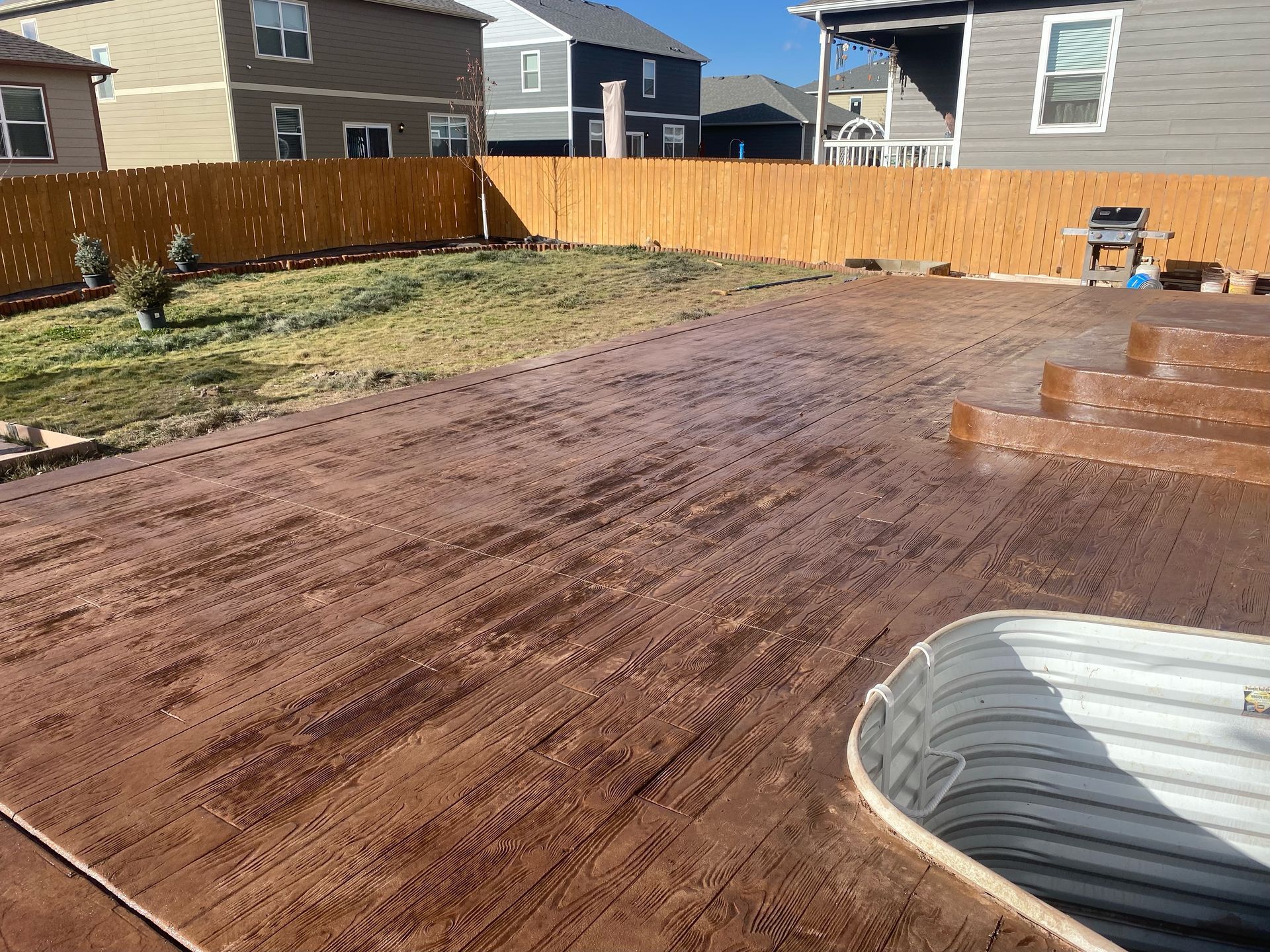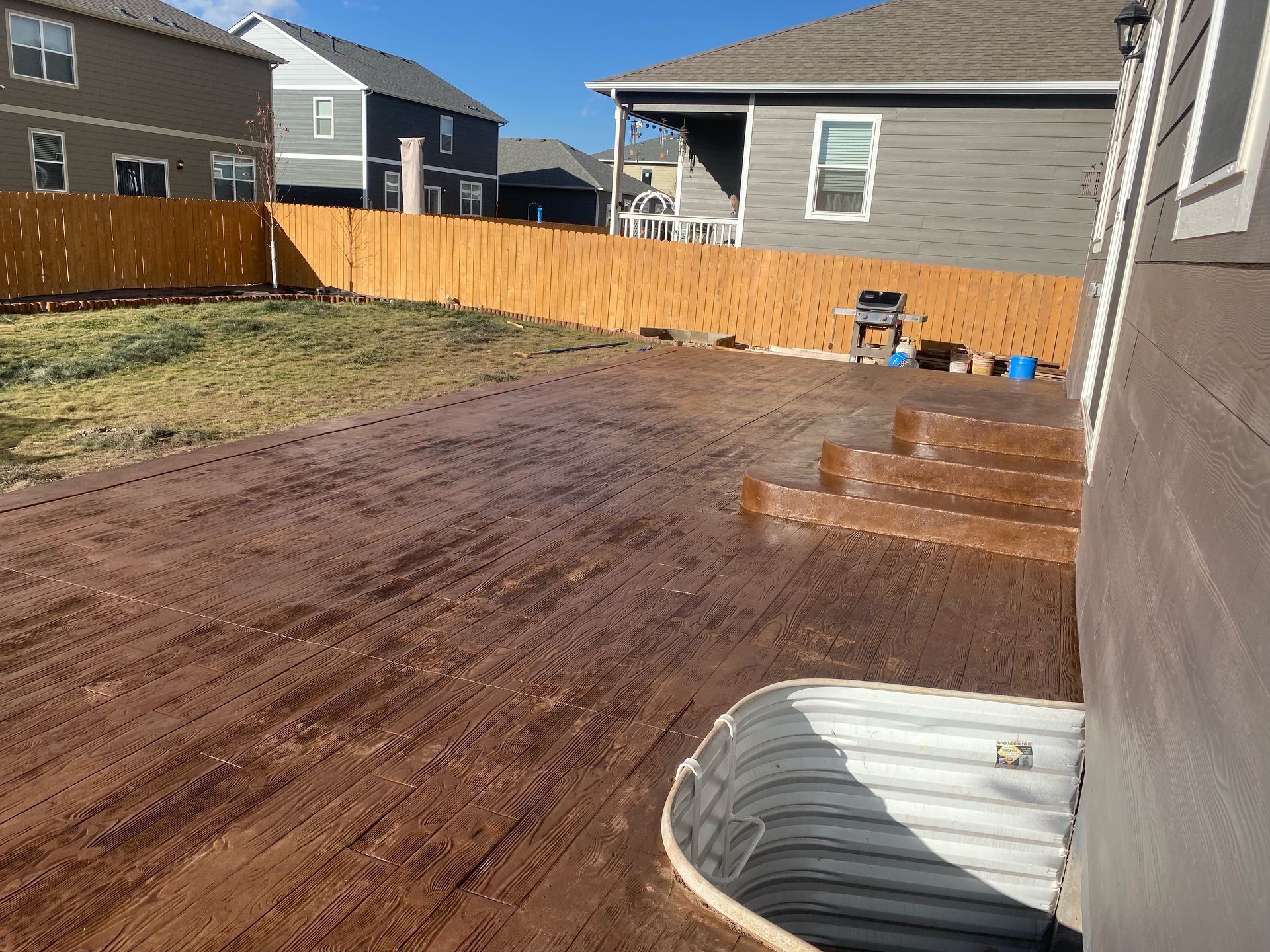 Install of new stamped concrete patio and steps. Using darker tone for wood plank stamp. Adjustment of sprinklers to account for new patio. Mead, CO 2021