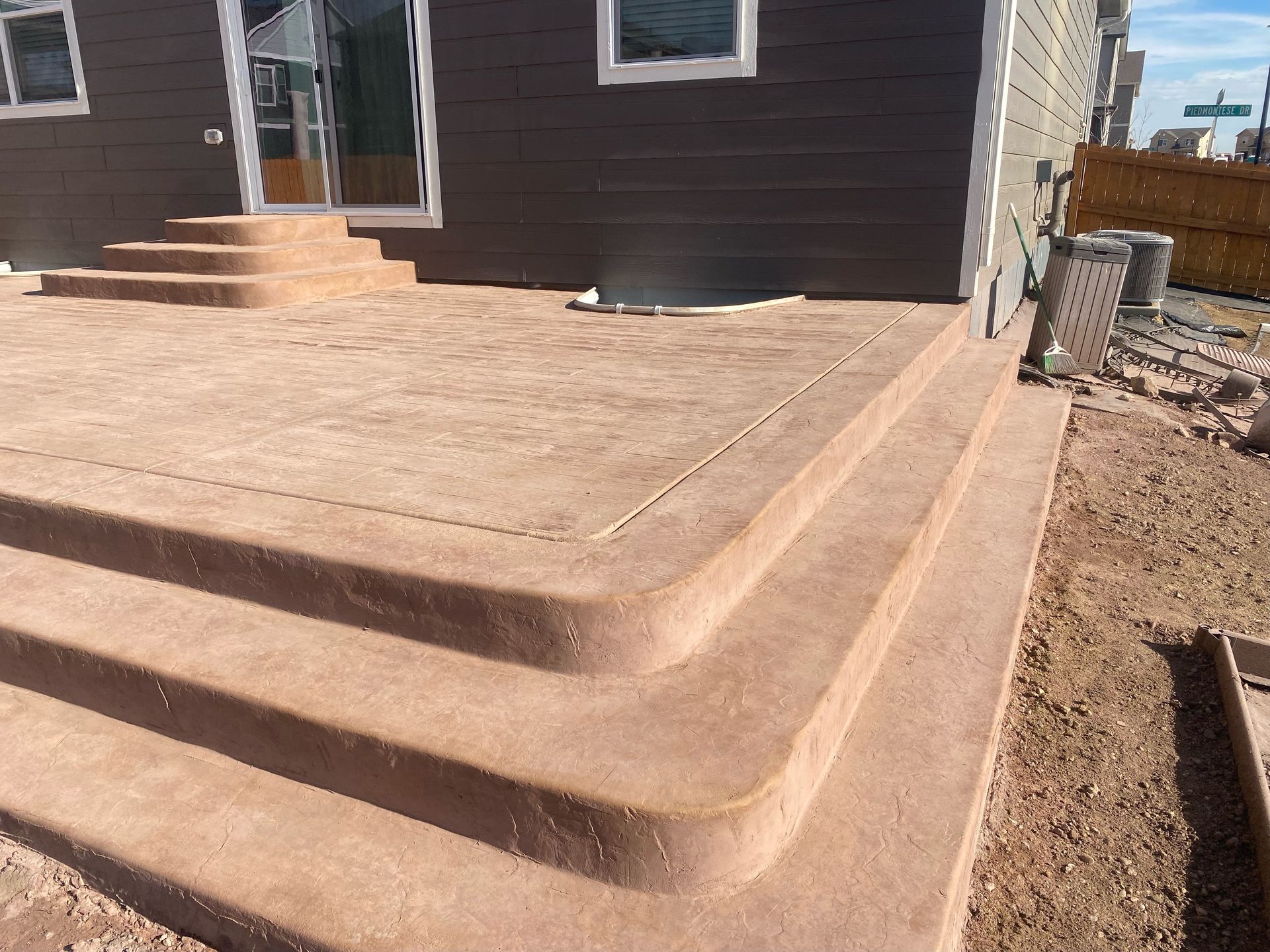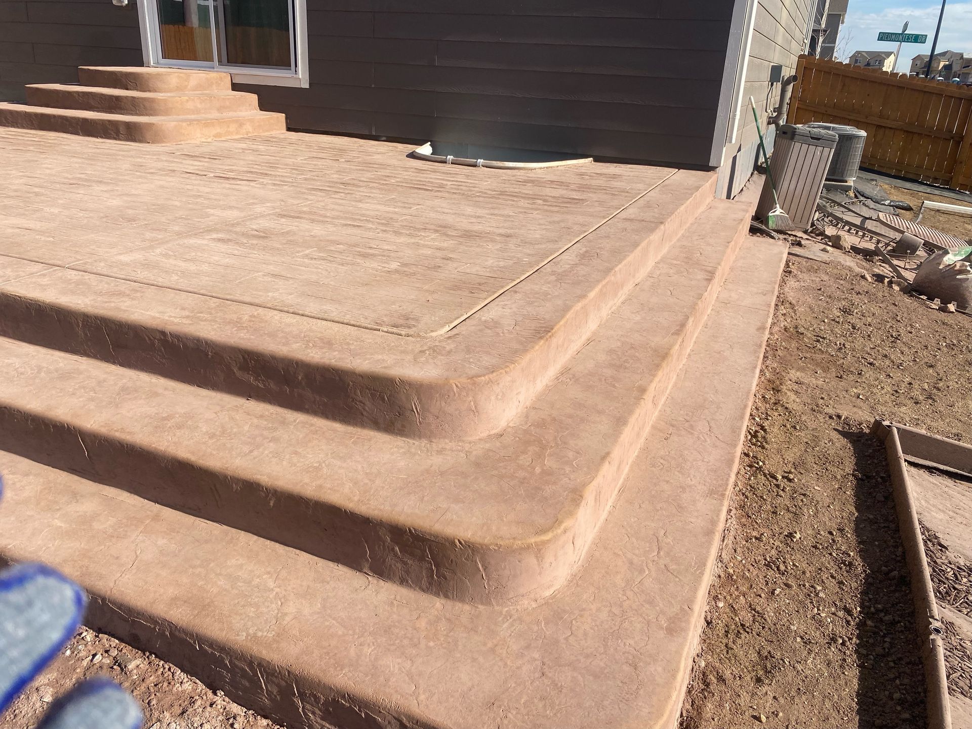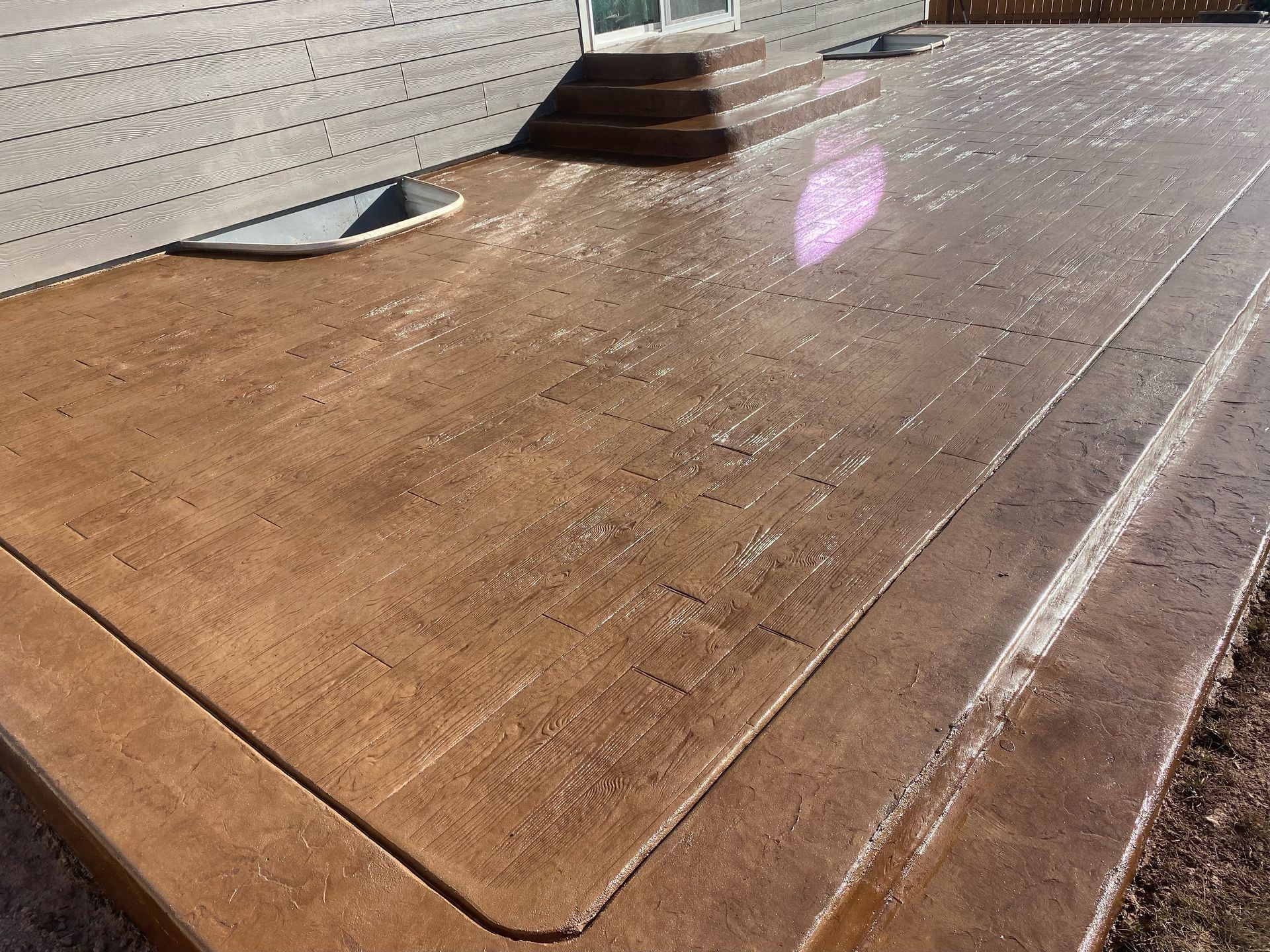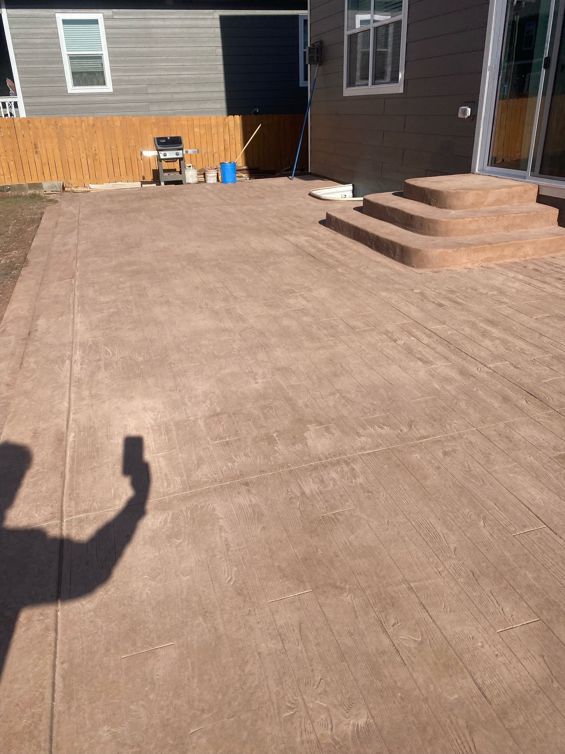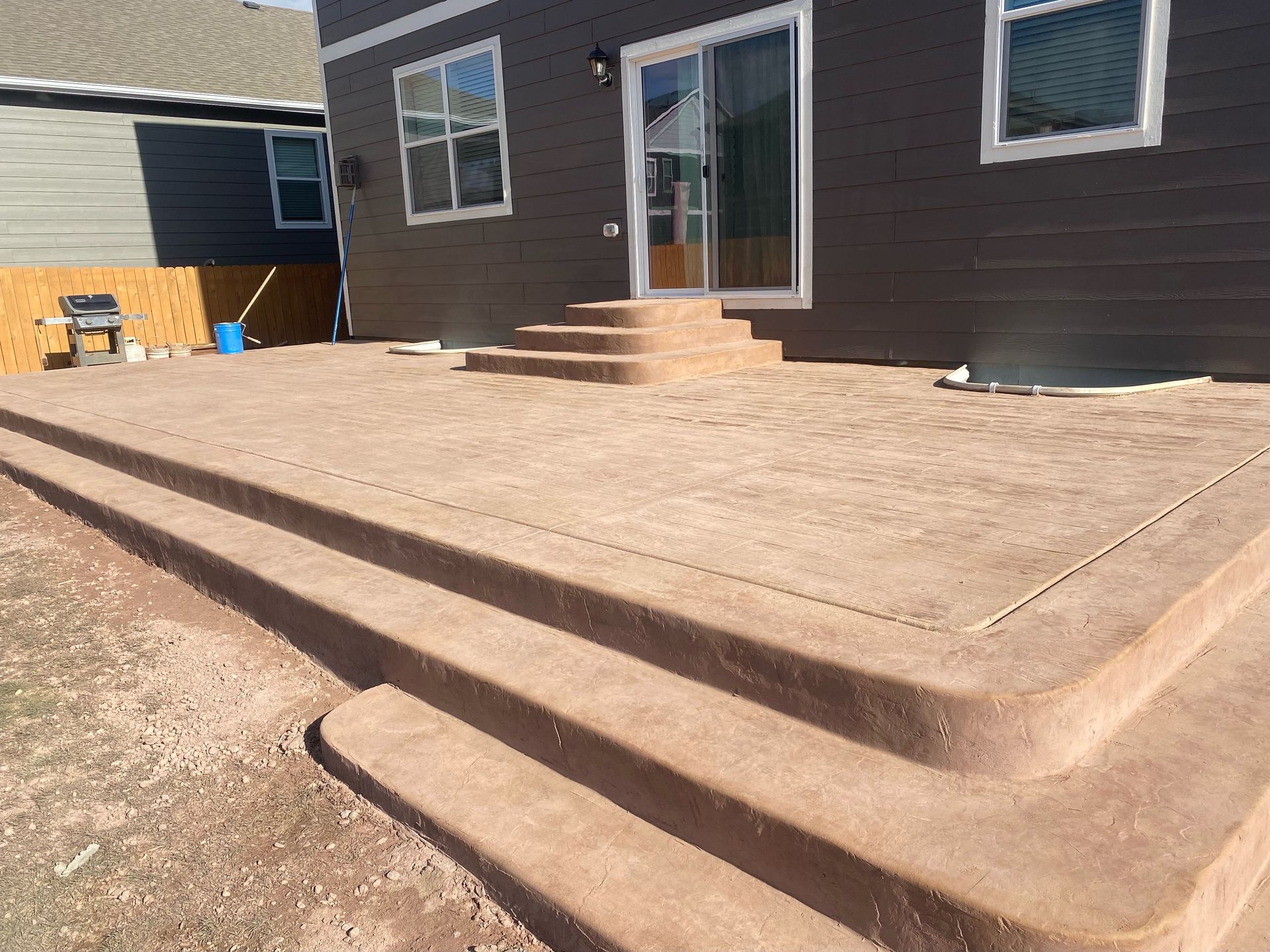 Install of new stamped concrete patio and steps. Using darker tone for wood plank stamp. Adjustment of sprinklers to account for new patio. Mead, CO 2021