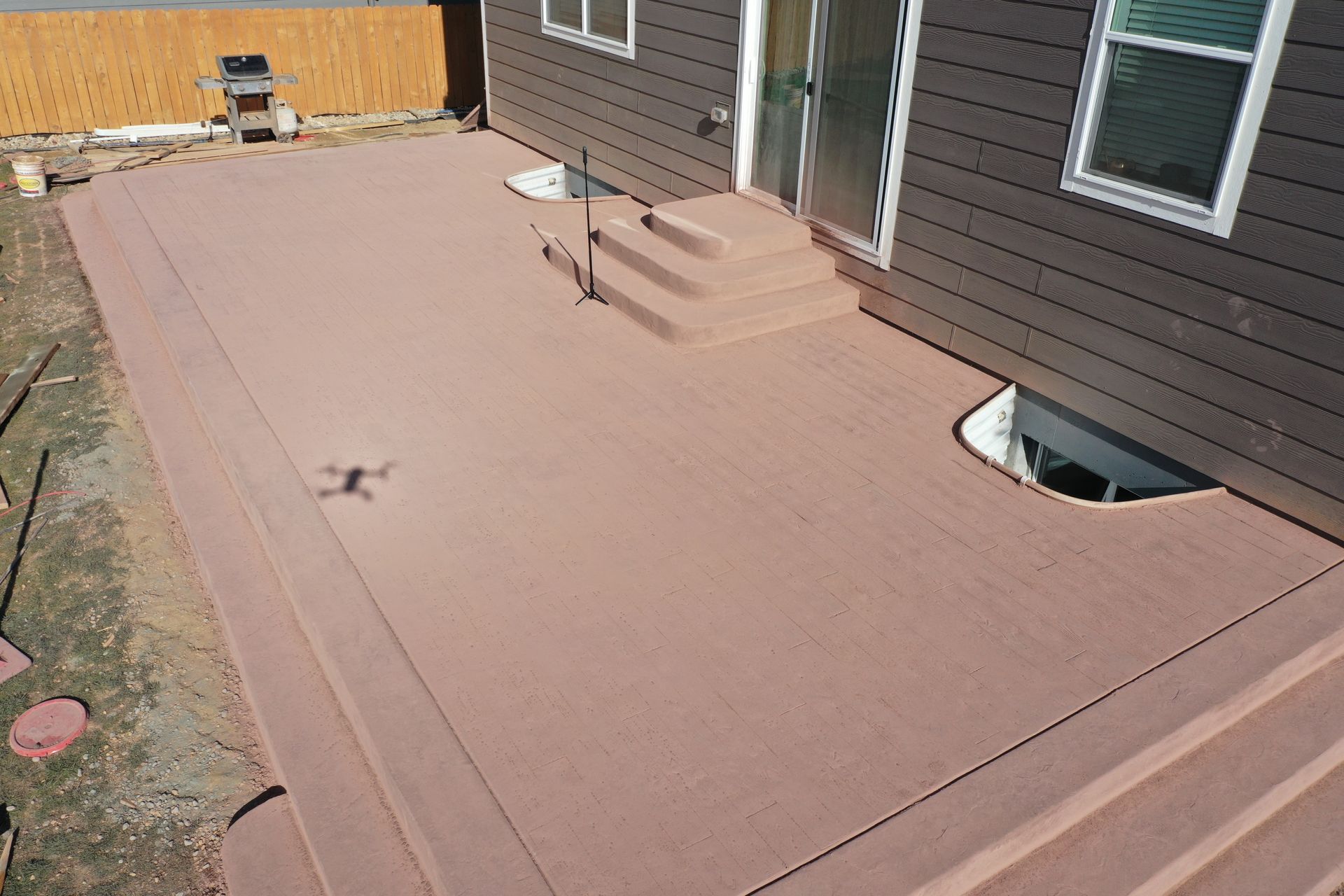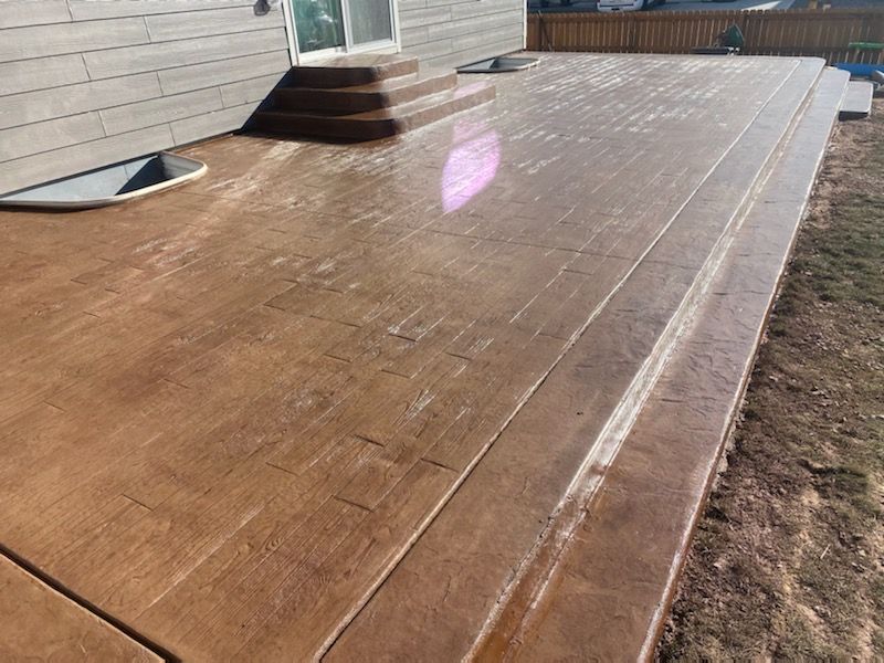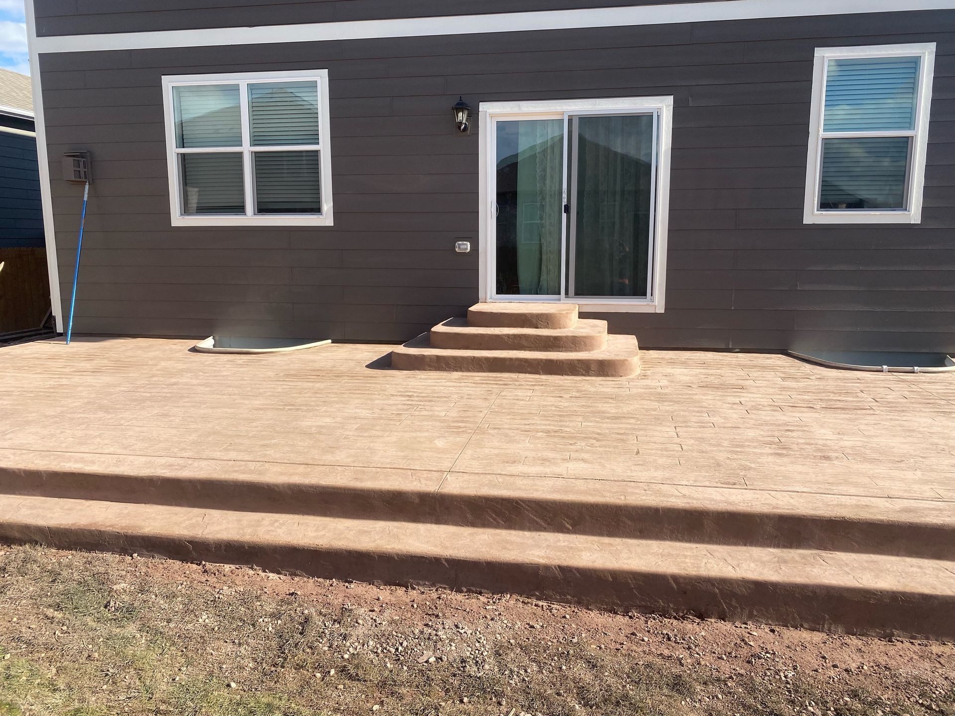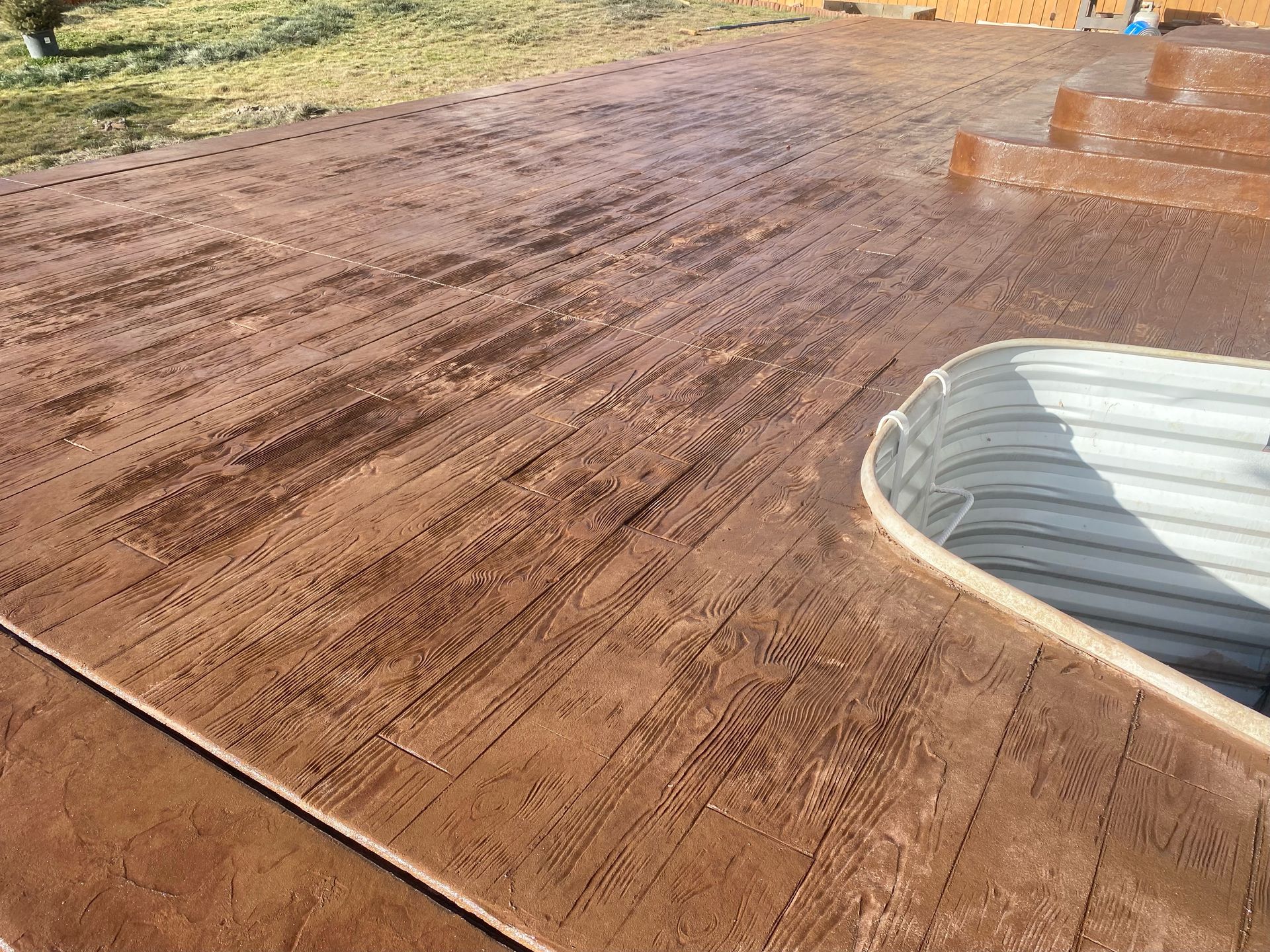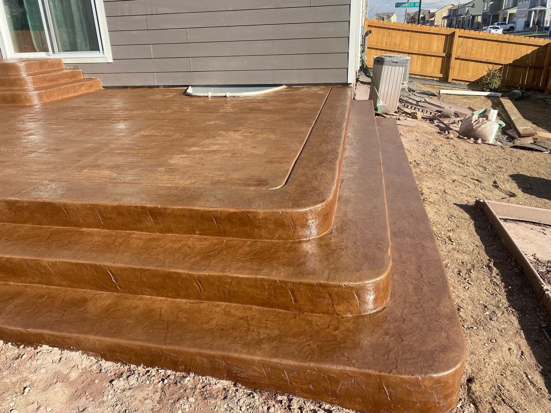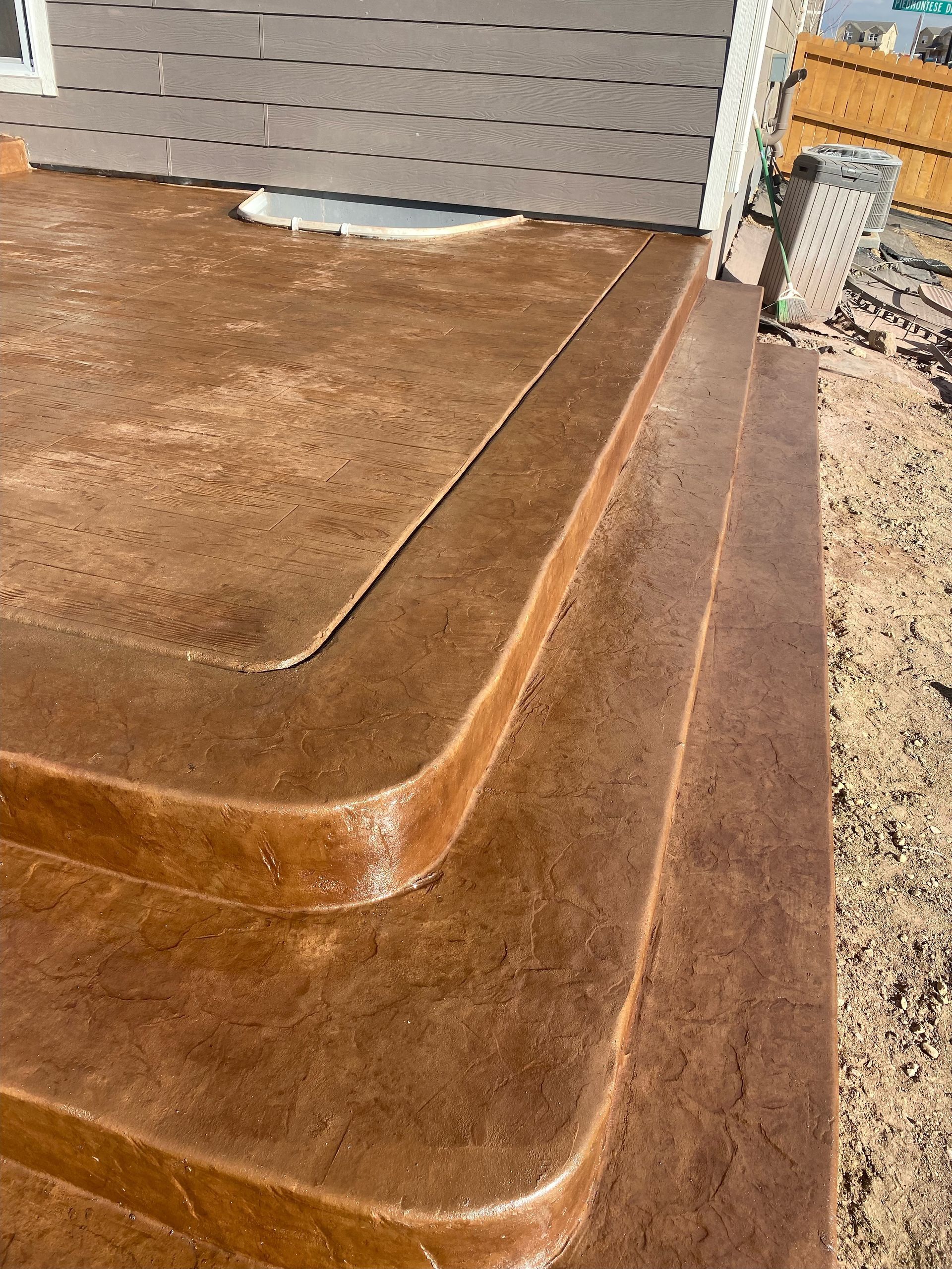 Install of new stamped concrete patio and steps. Using darker tone for wood plank stamp. Adjustment of sprinklers to account for new patio. Mead, CO 2021