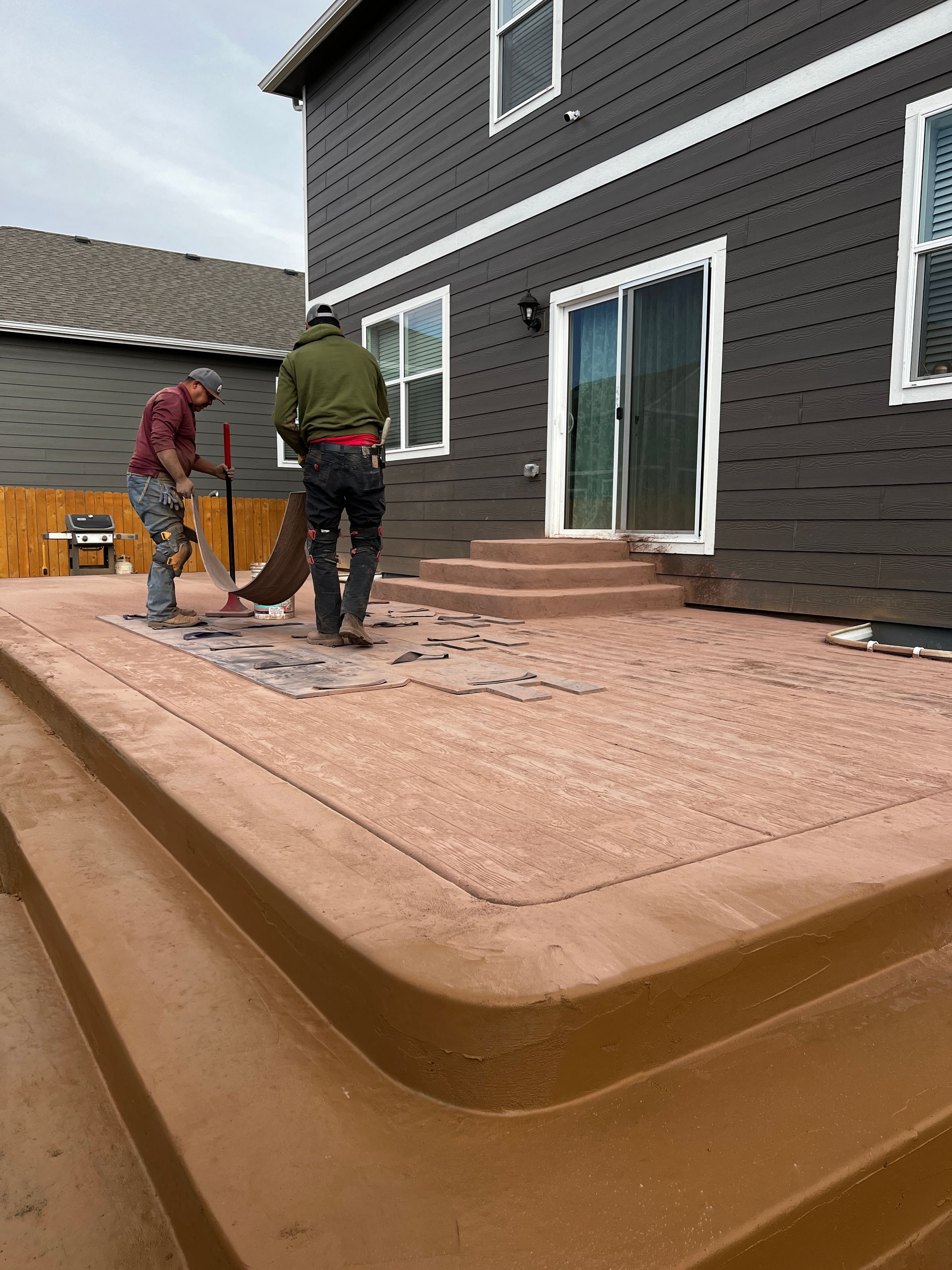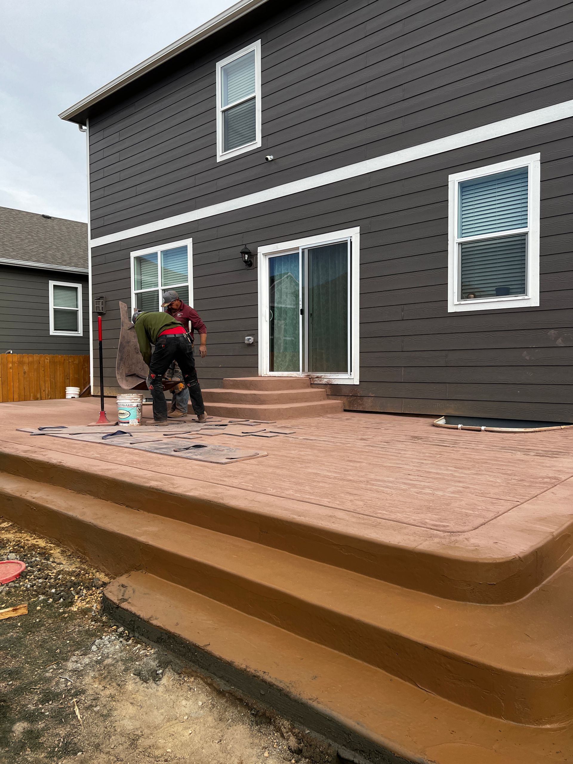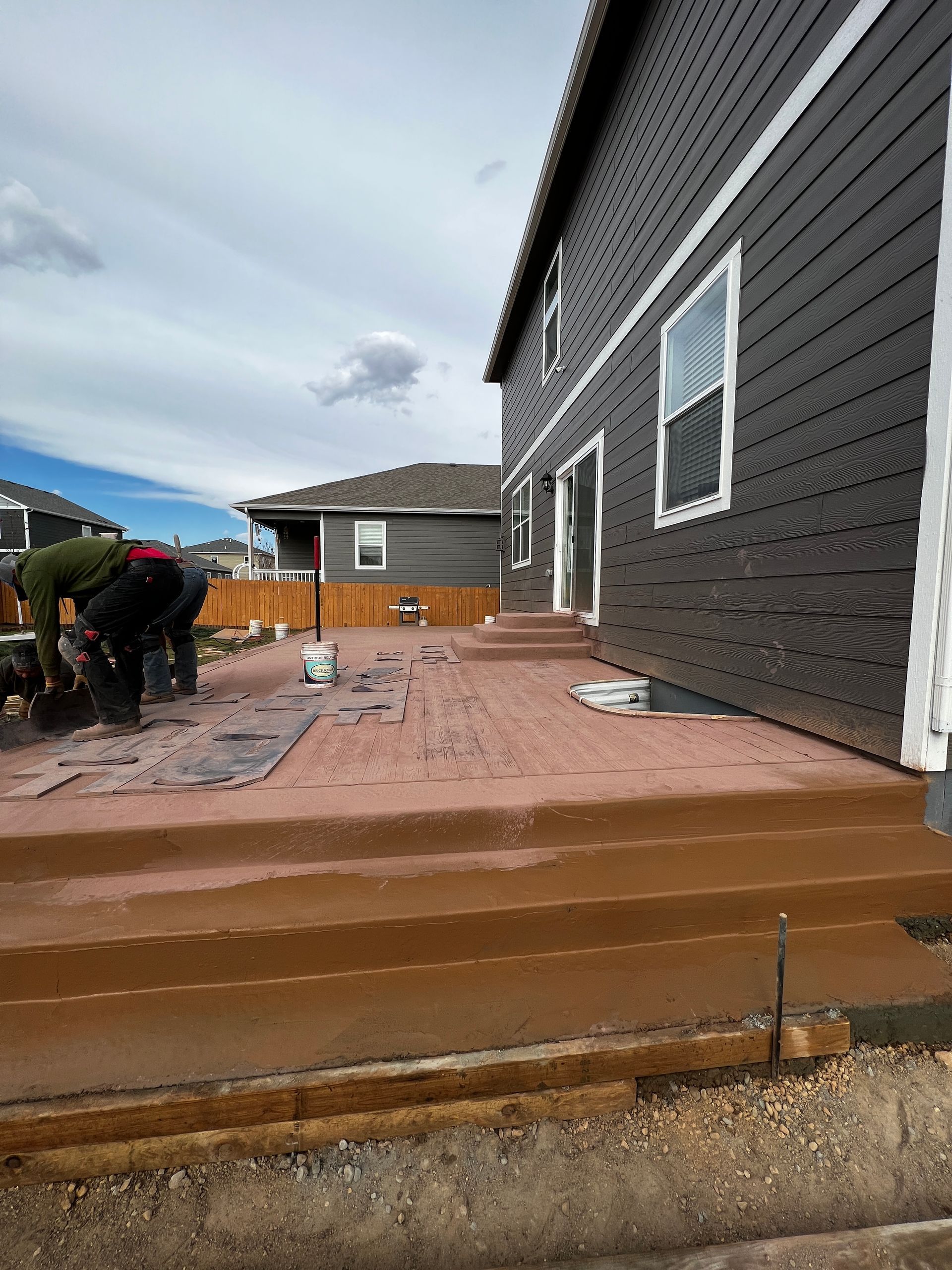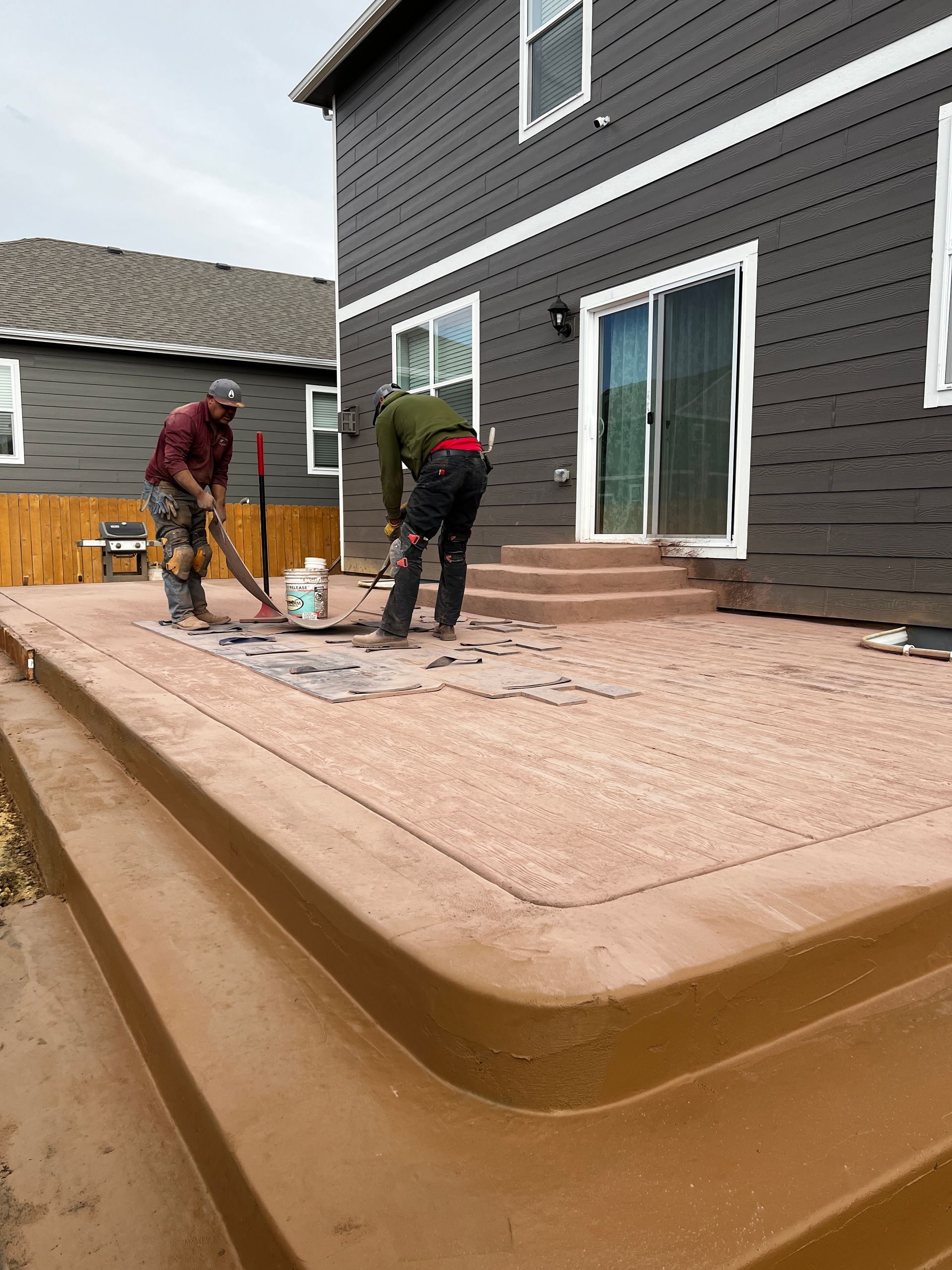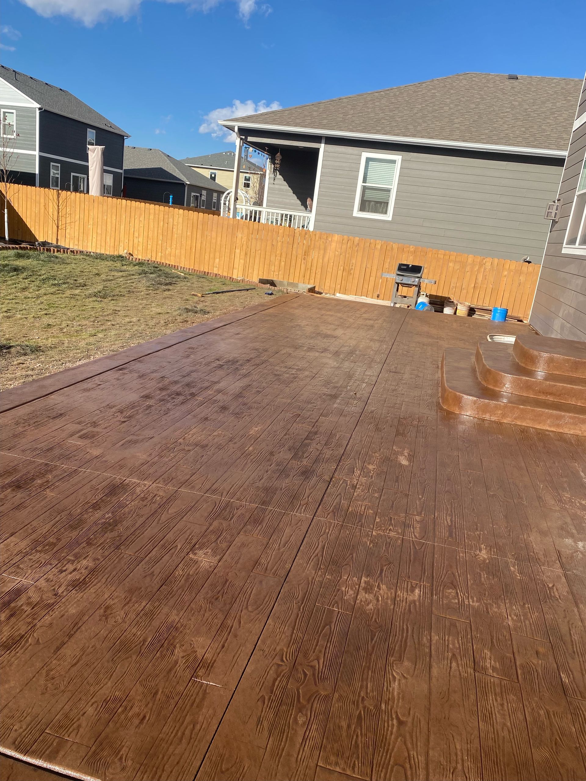 Install of new stamped concrete patio and steps. Using darker tone for wood plank stamp. Adjustment of sprinklers to account for new patio. Mead, CO 2021