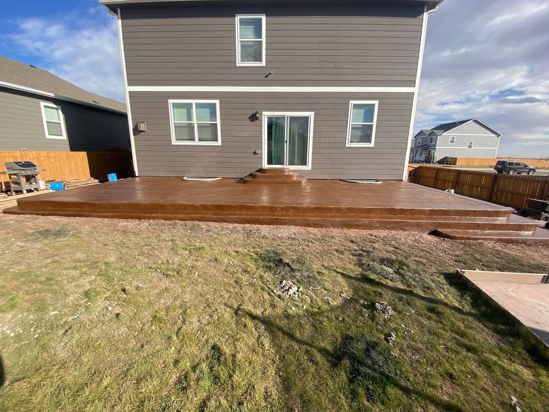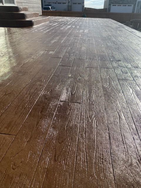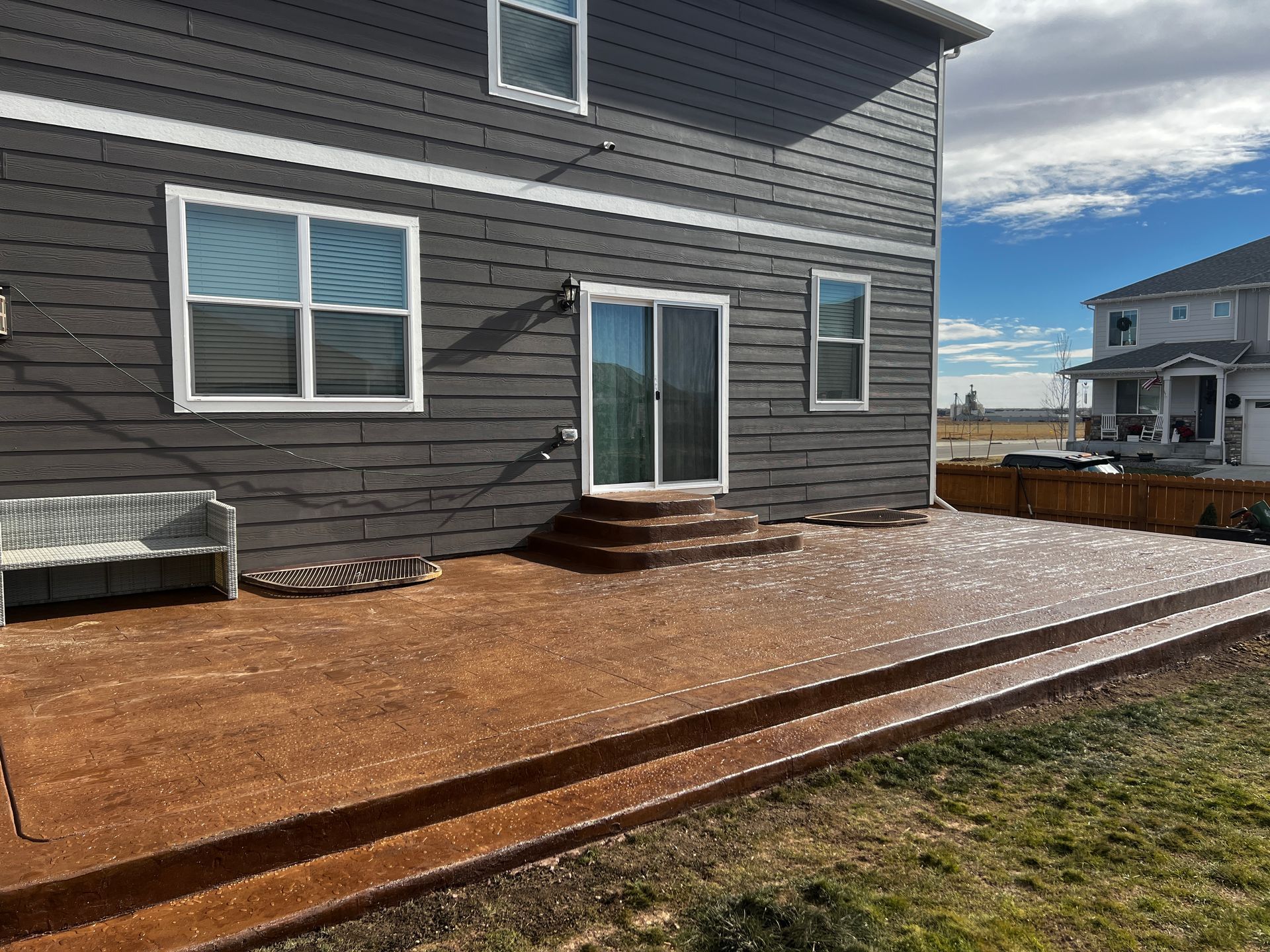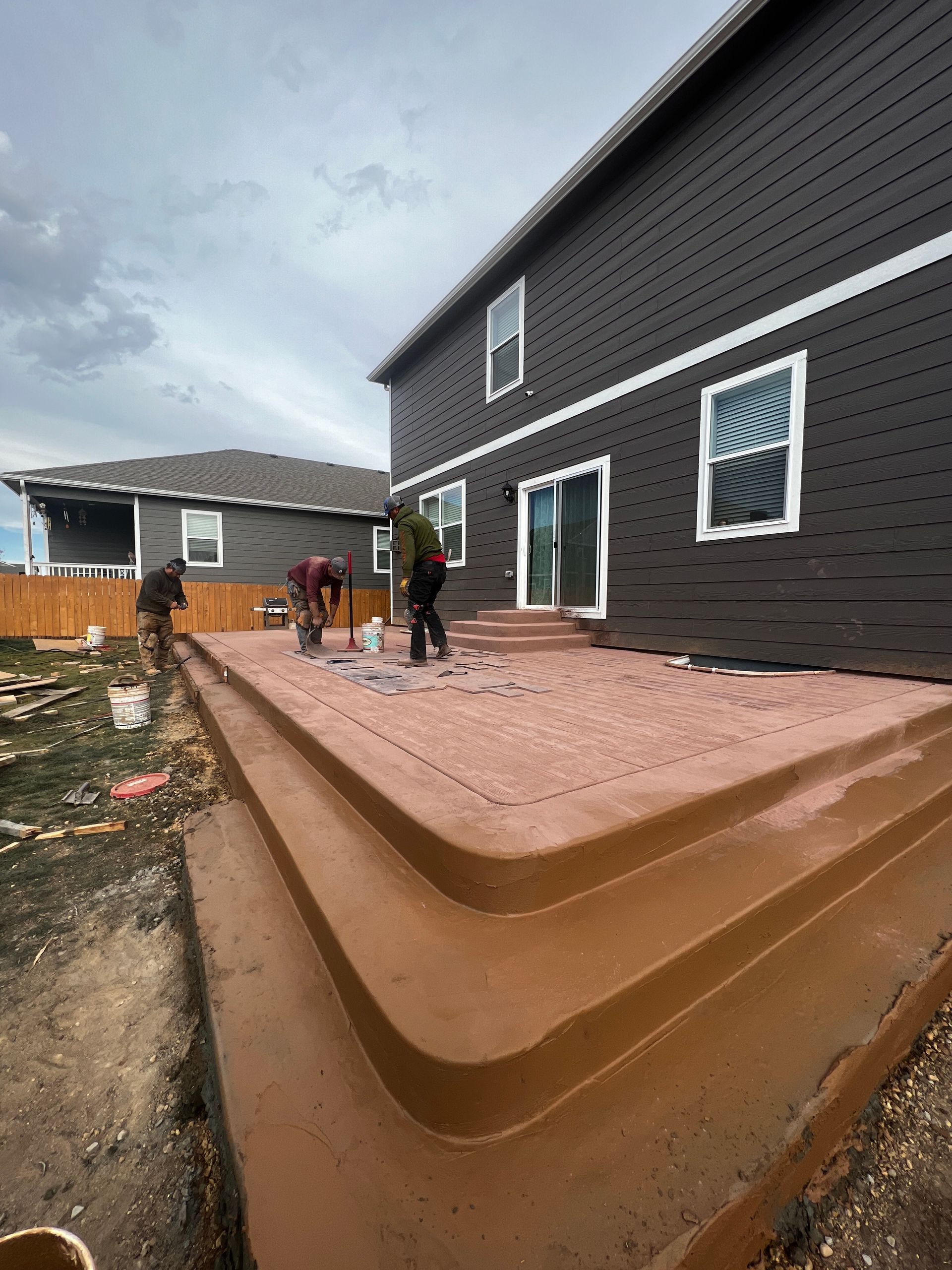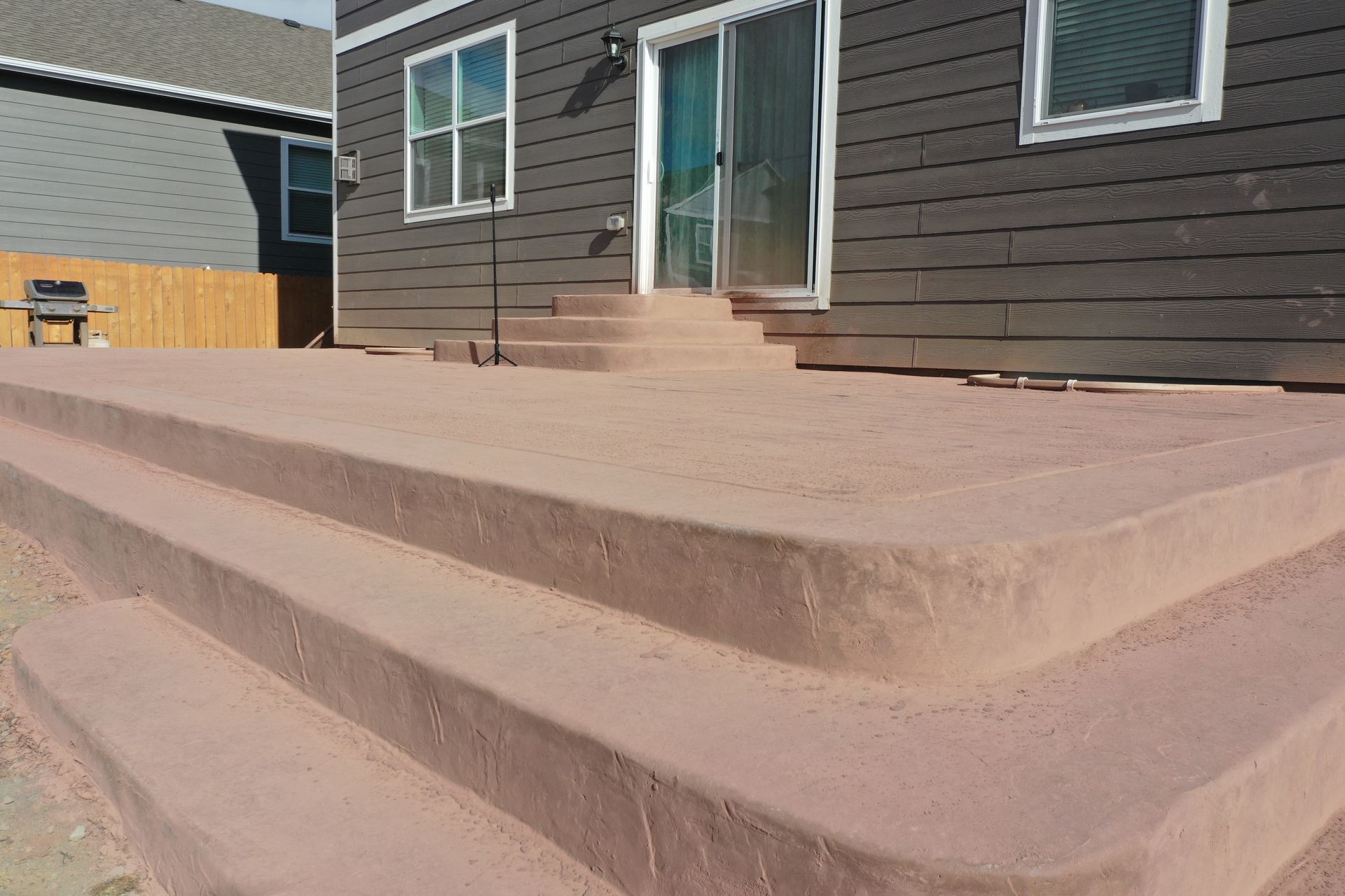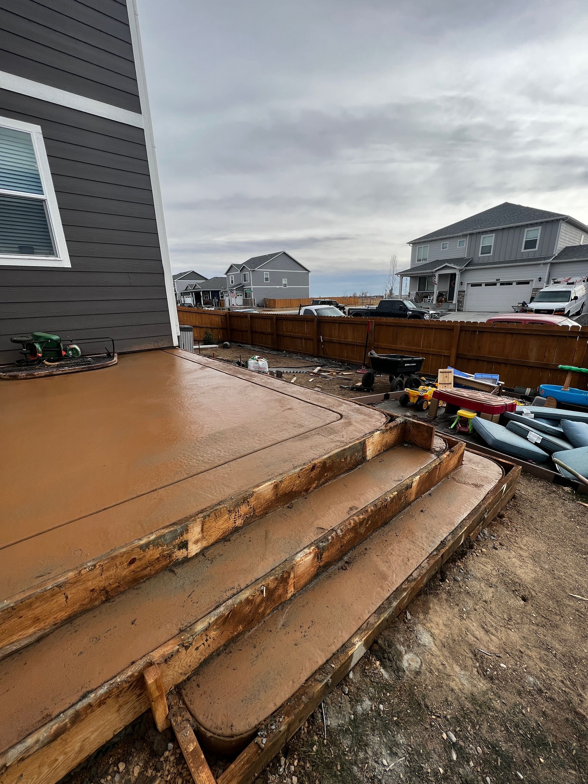 Install of new stamped concrete patio and steps. Using darker tone for wood plank stamp. Adjustment of sprinklers to account for new patio. Mead, CO 2021