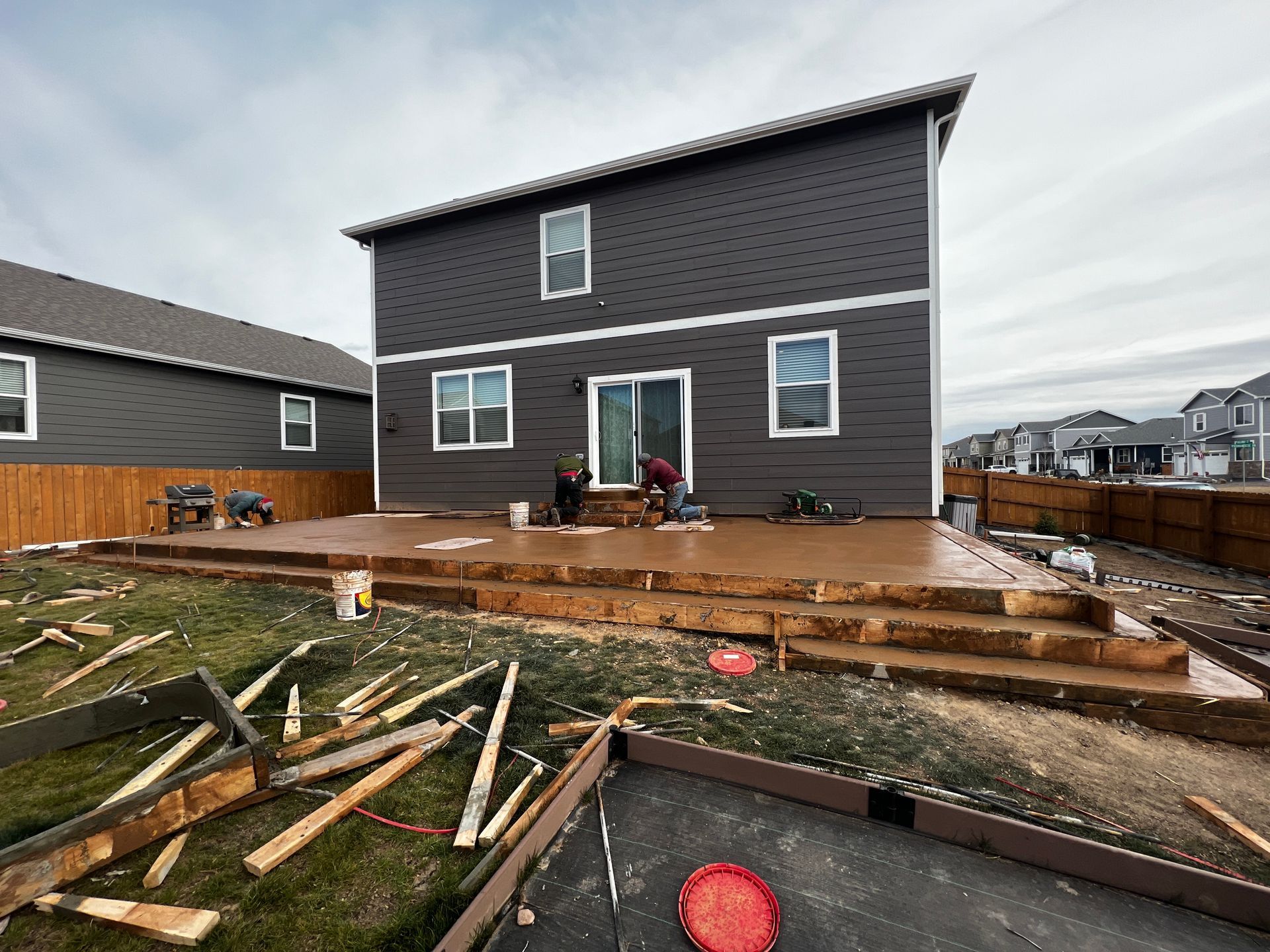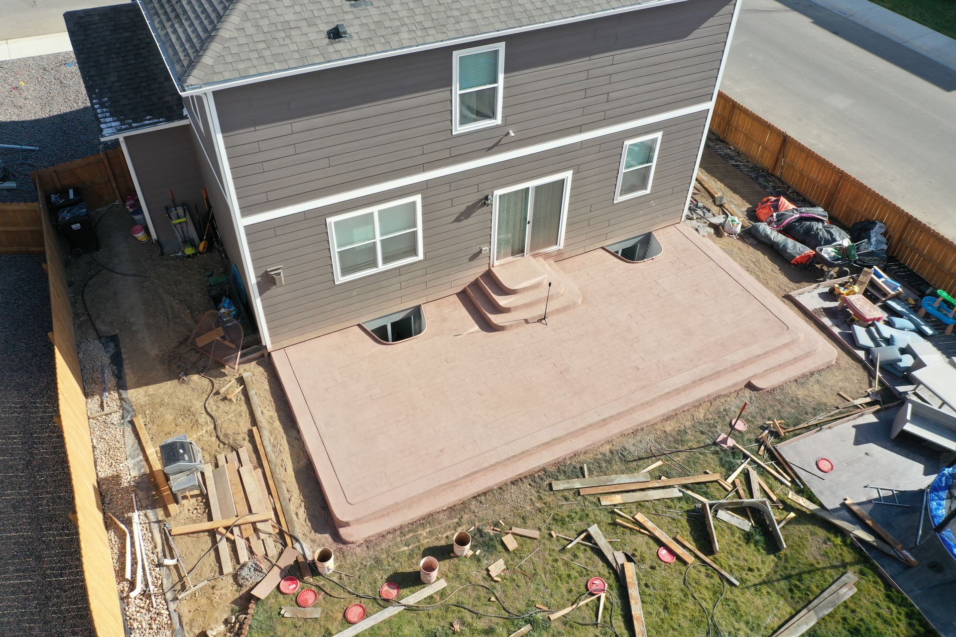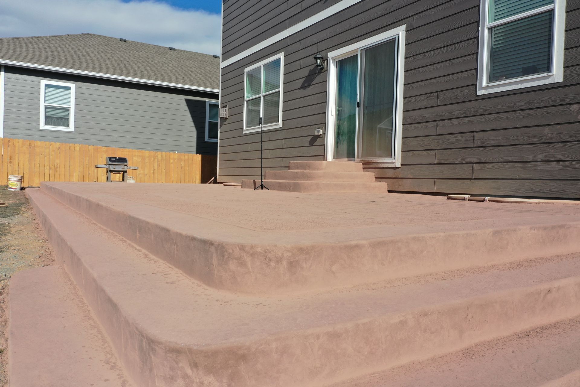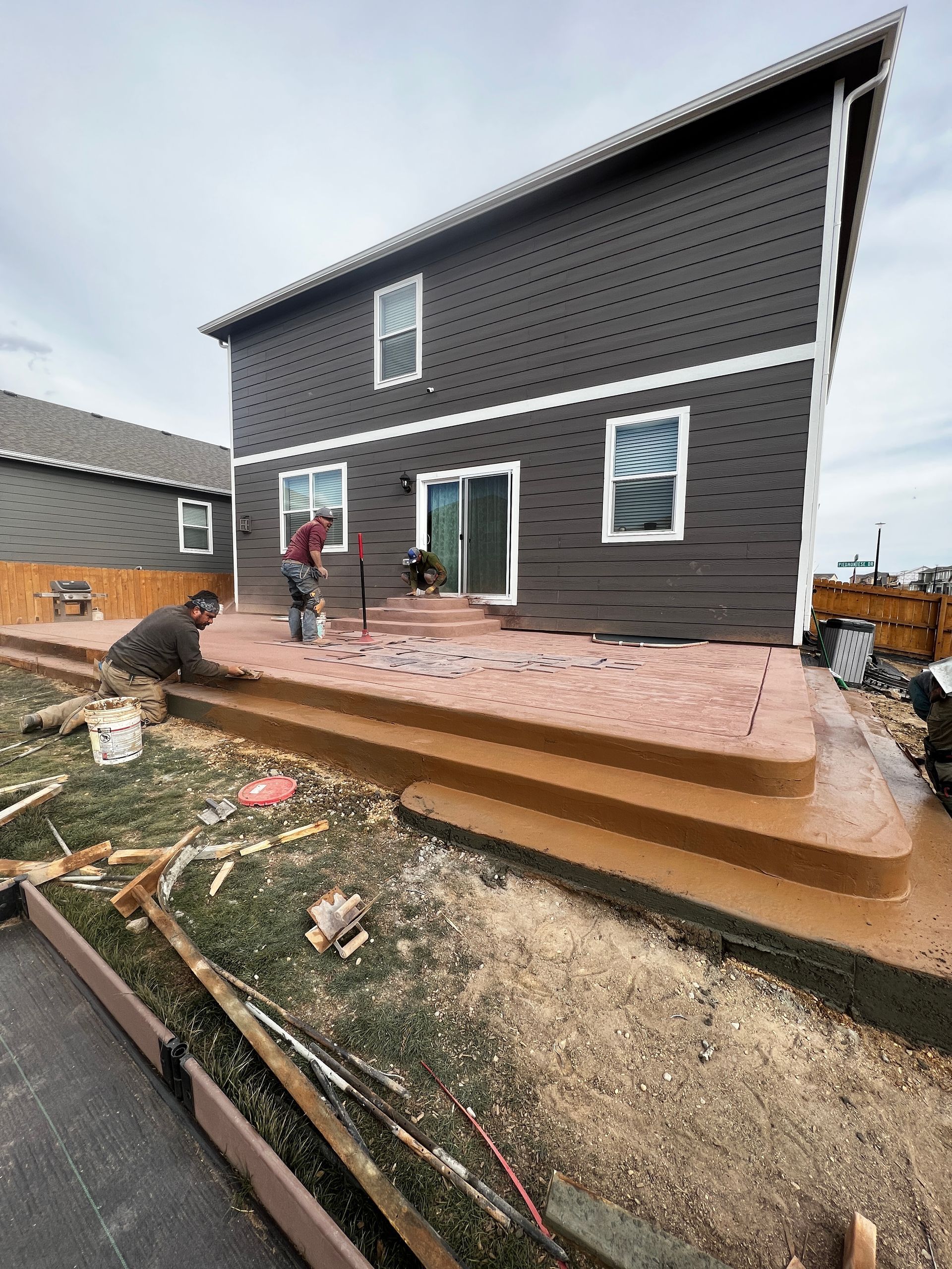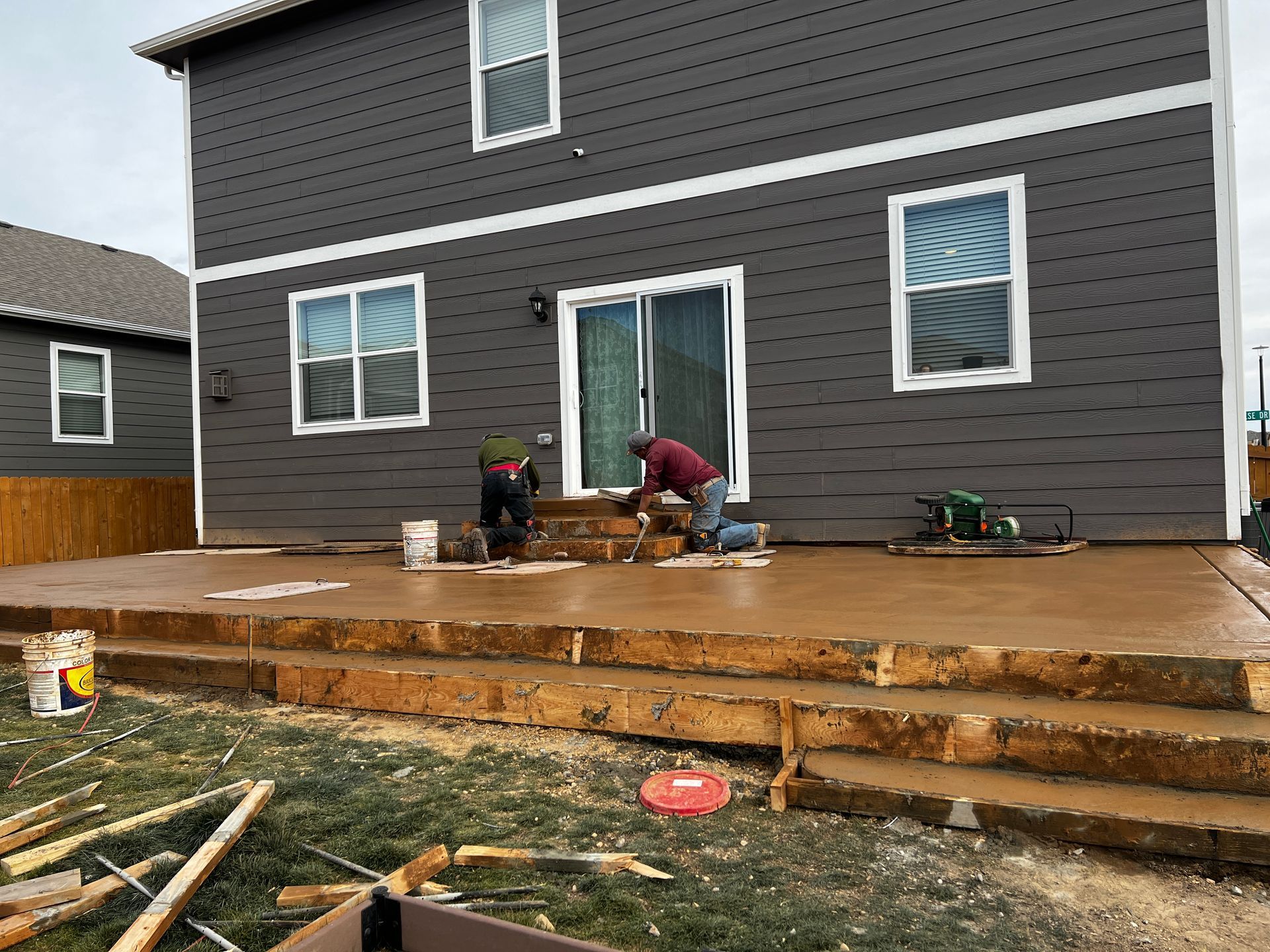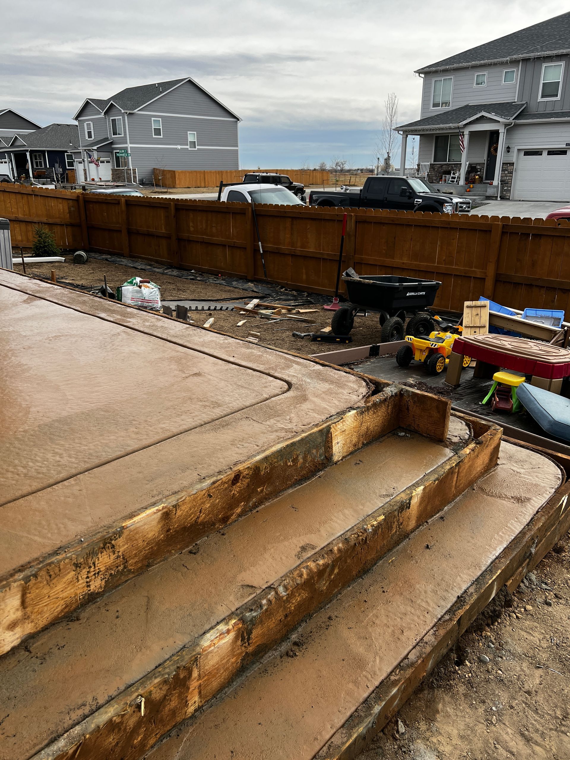 Install of new stamped concrete patio and steps. Using darker tone for wood plank stamp. Adjustment of sprinklers to account for new patio. Mead, CO 2021