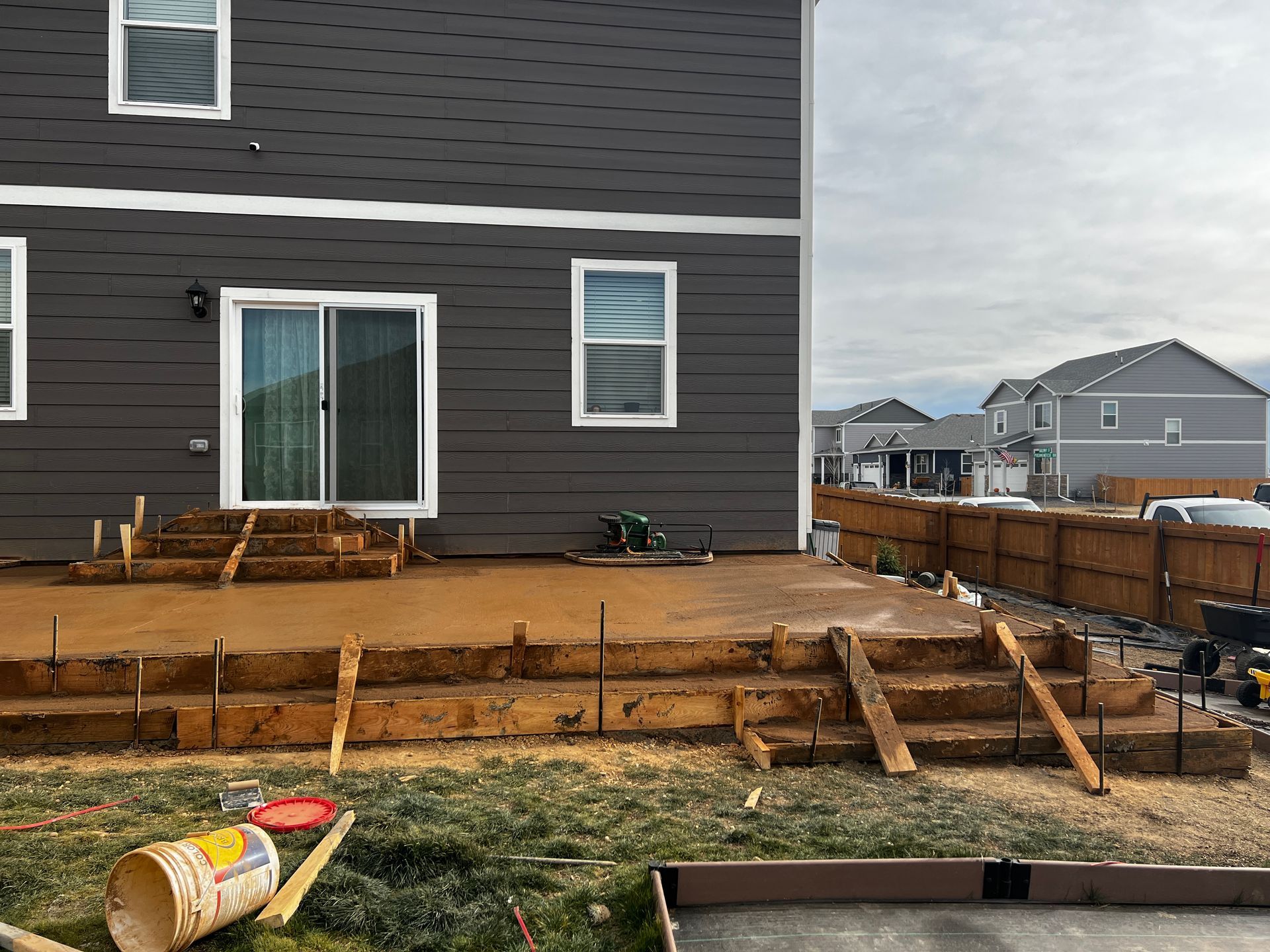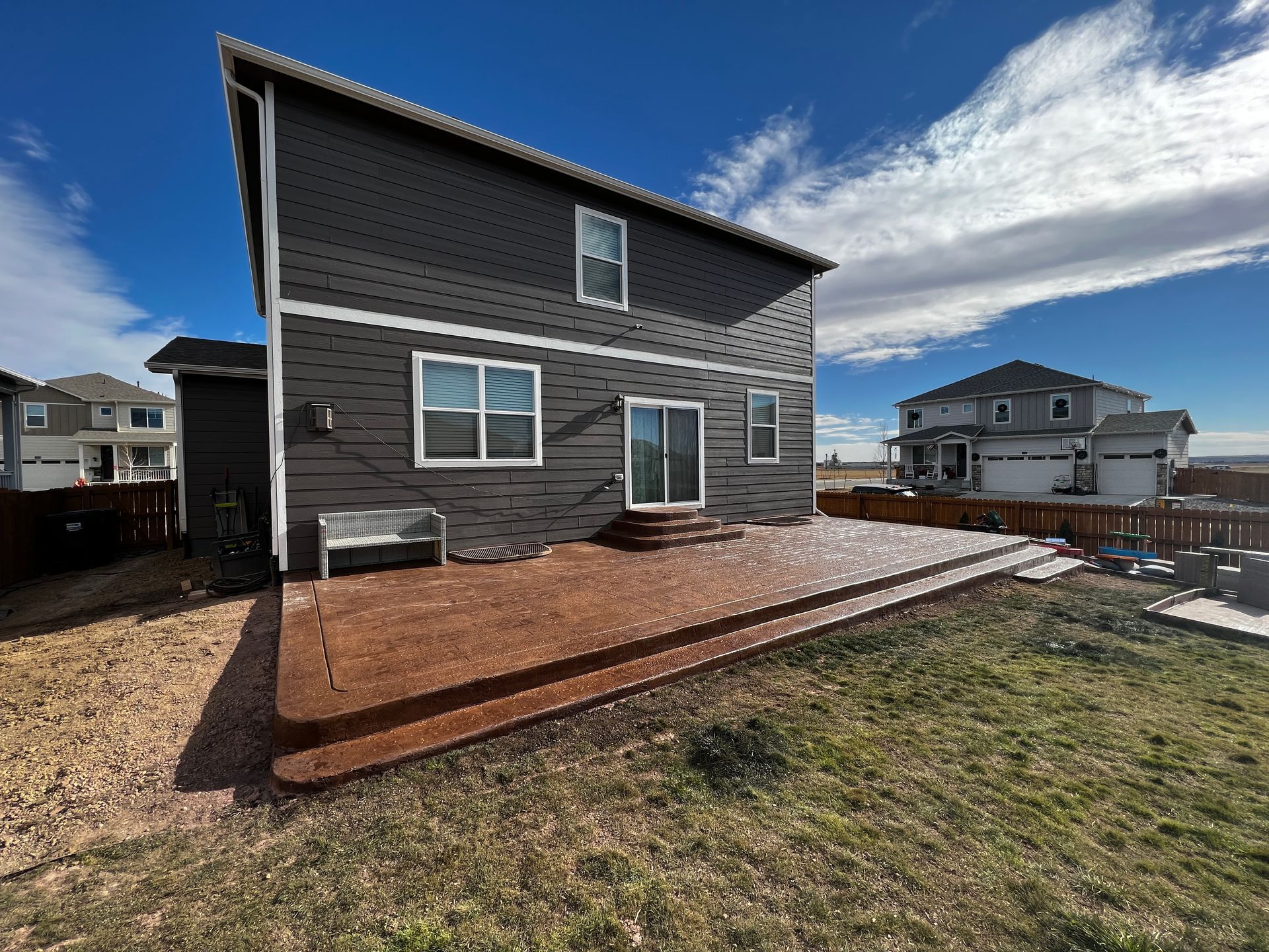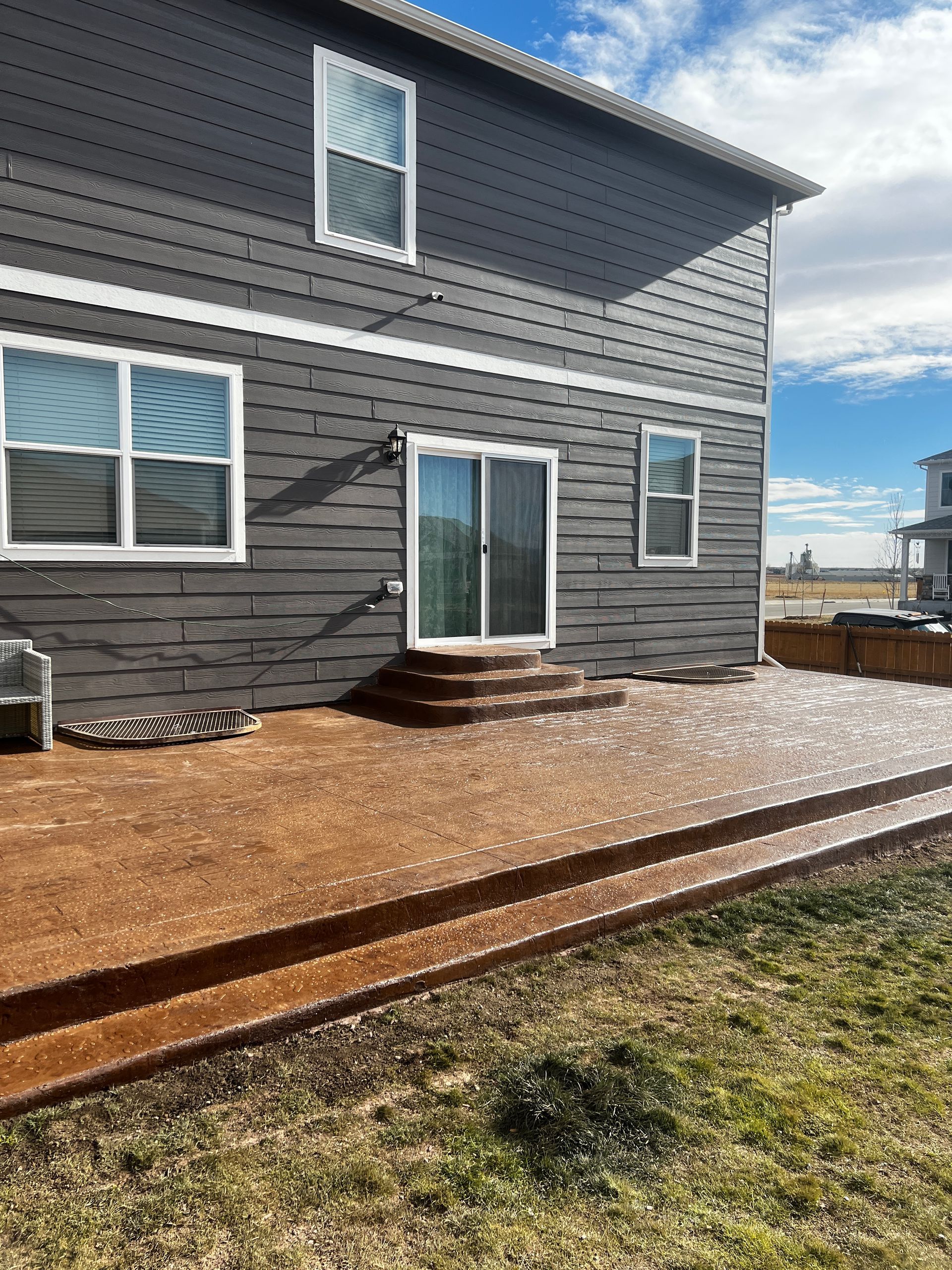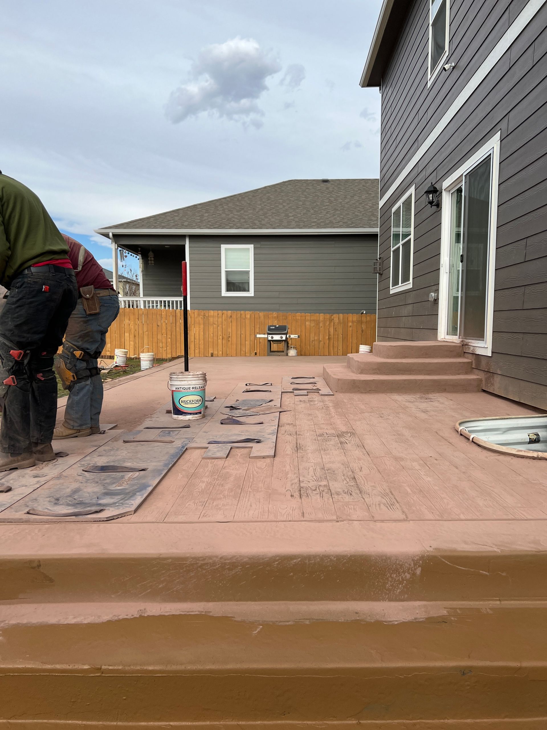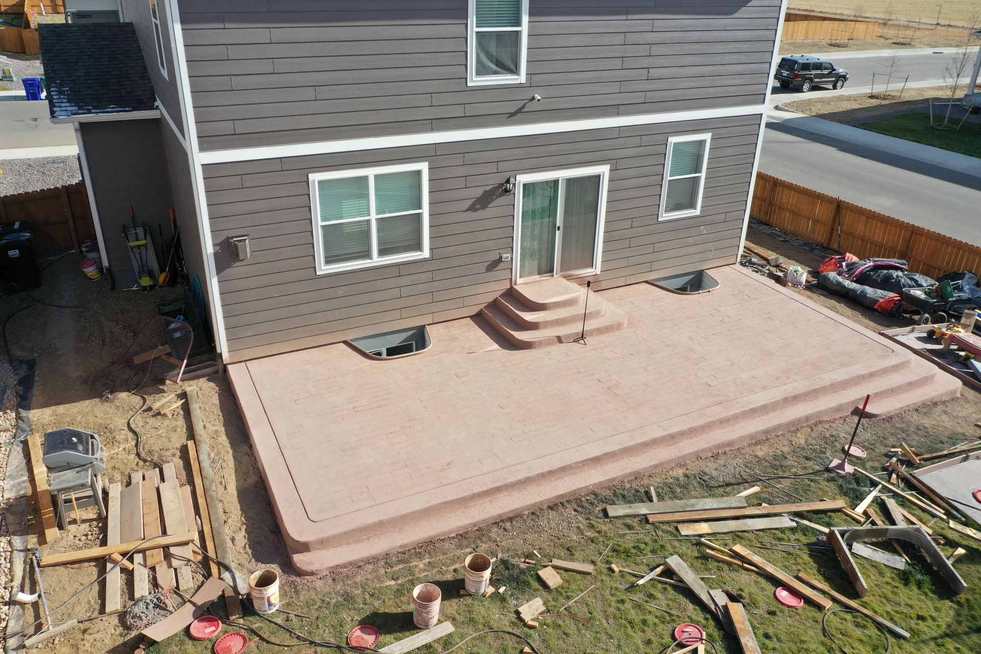 Install of new stamped concrete patio and steps. Using darker tone for wood plank stamp. Adjustment of sprinklers to account for new patio. Mead, CO 2021