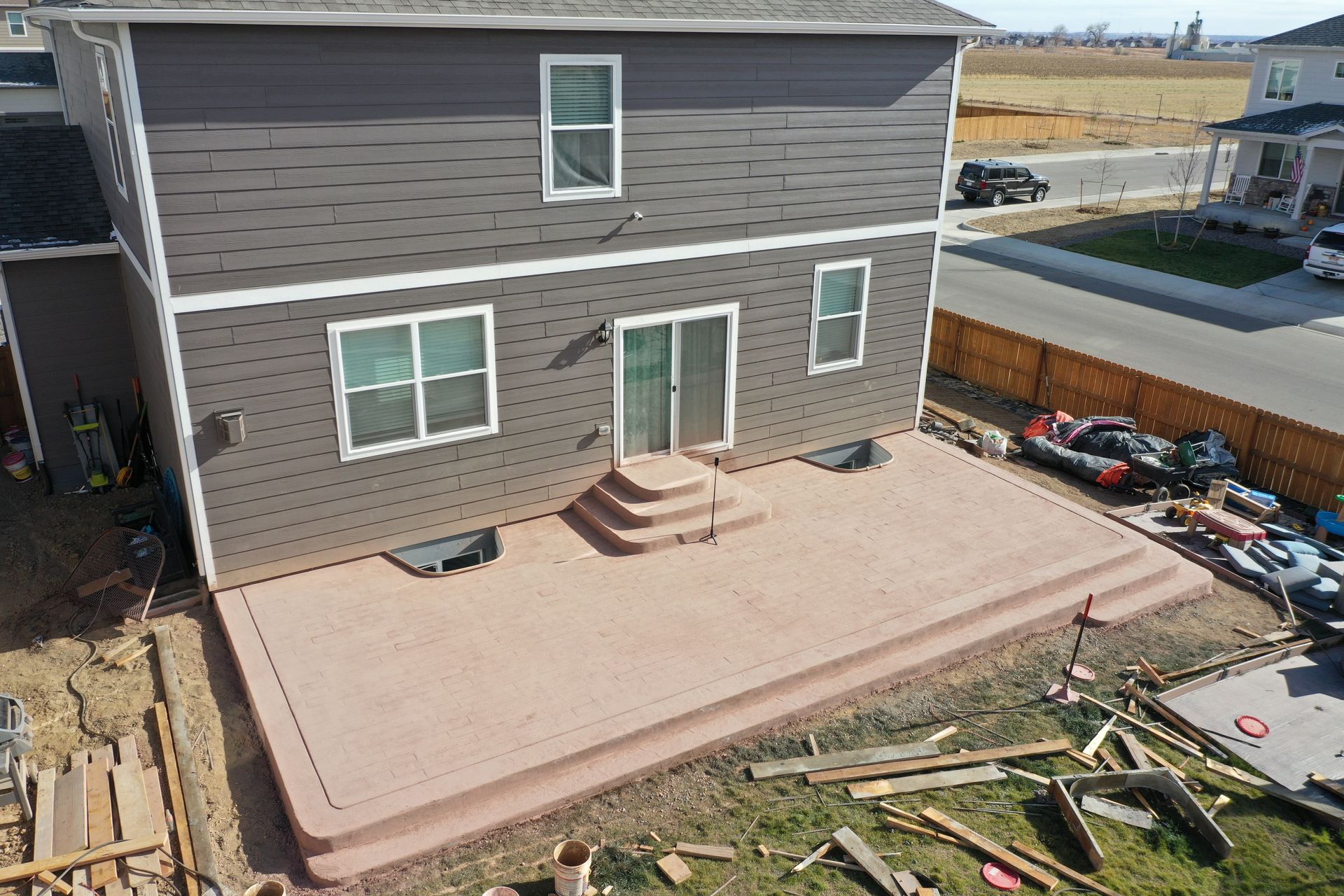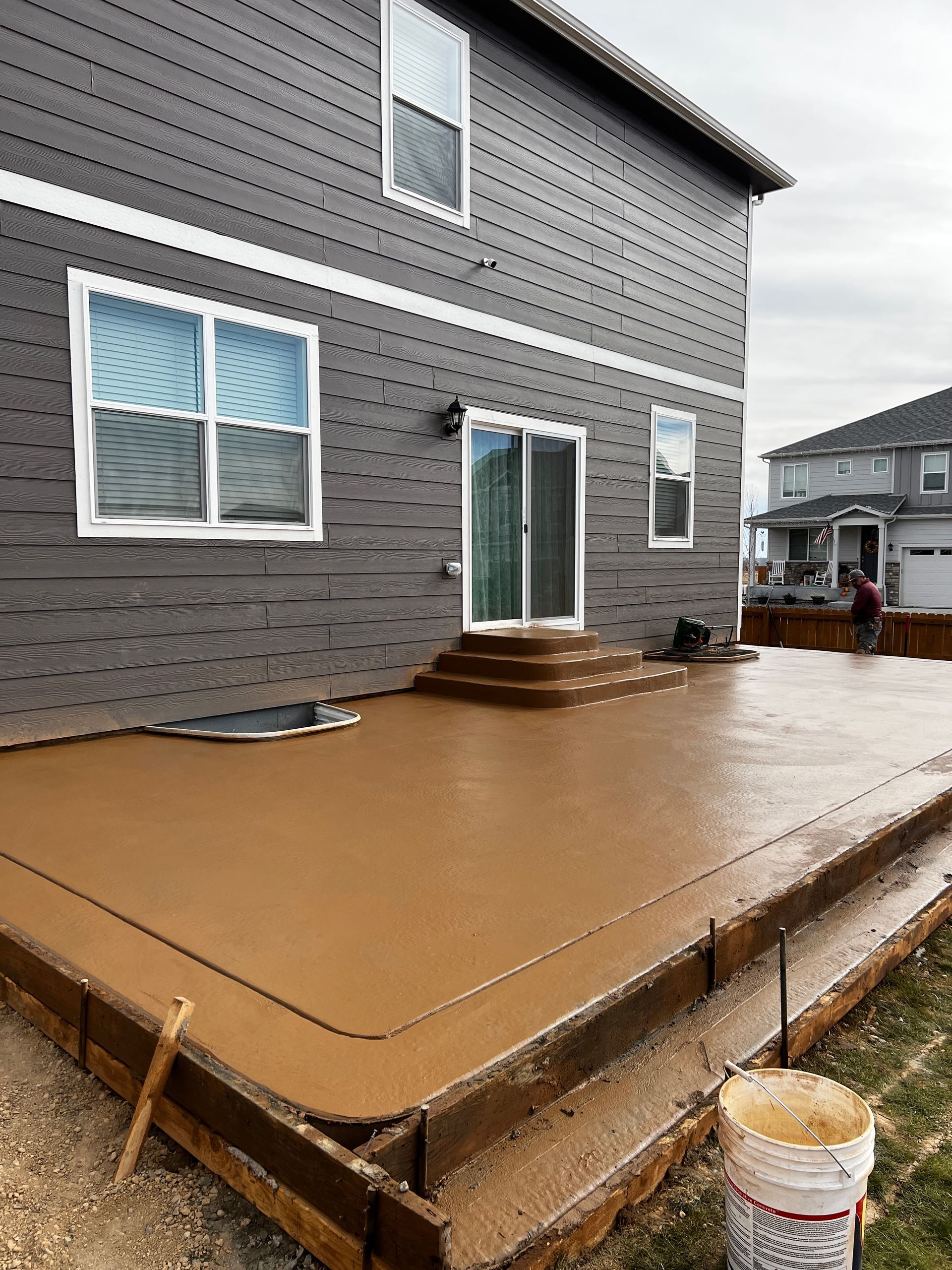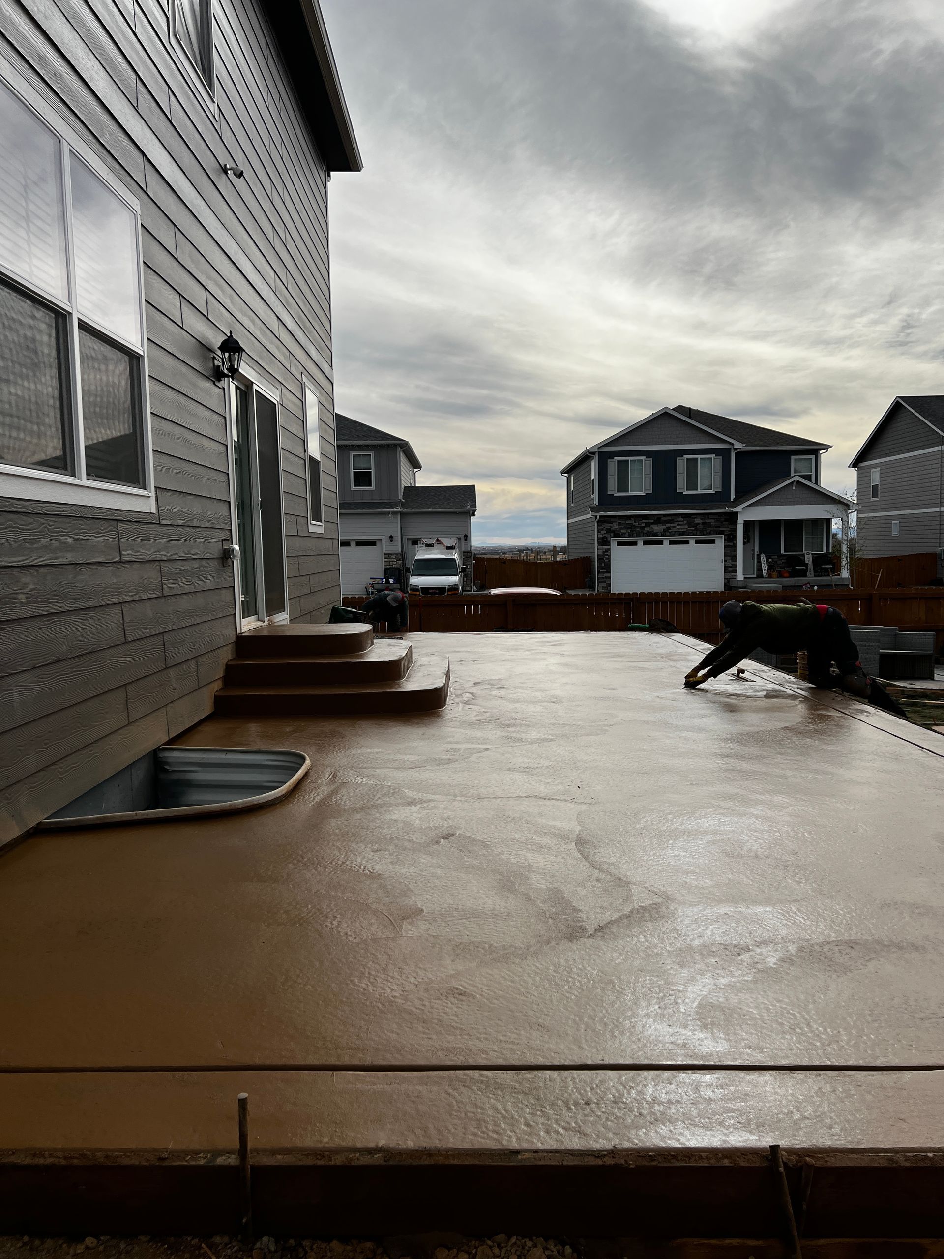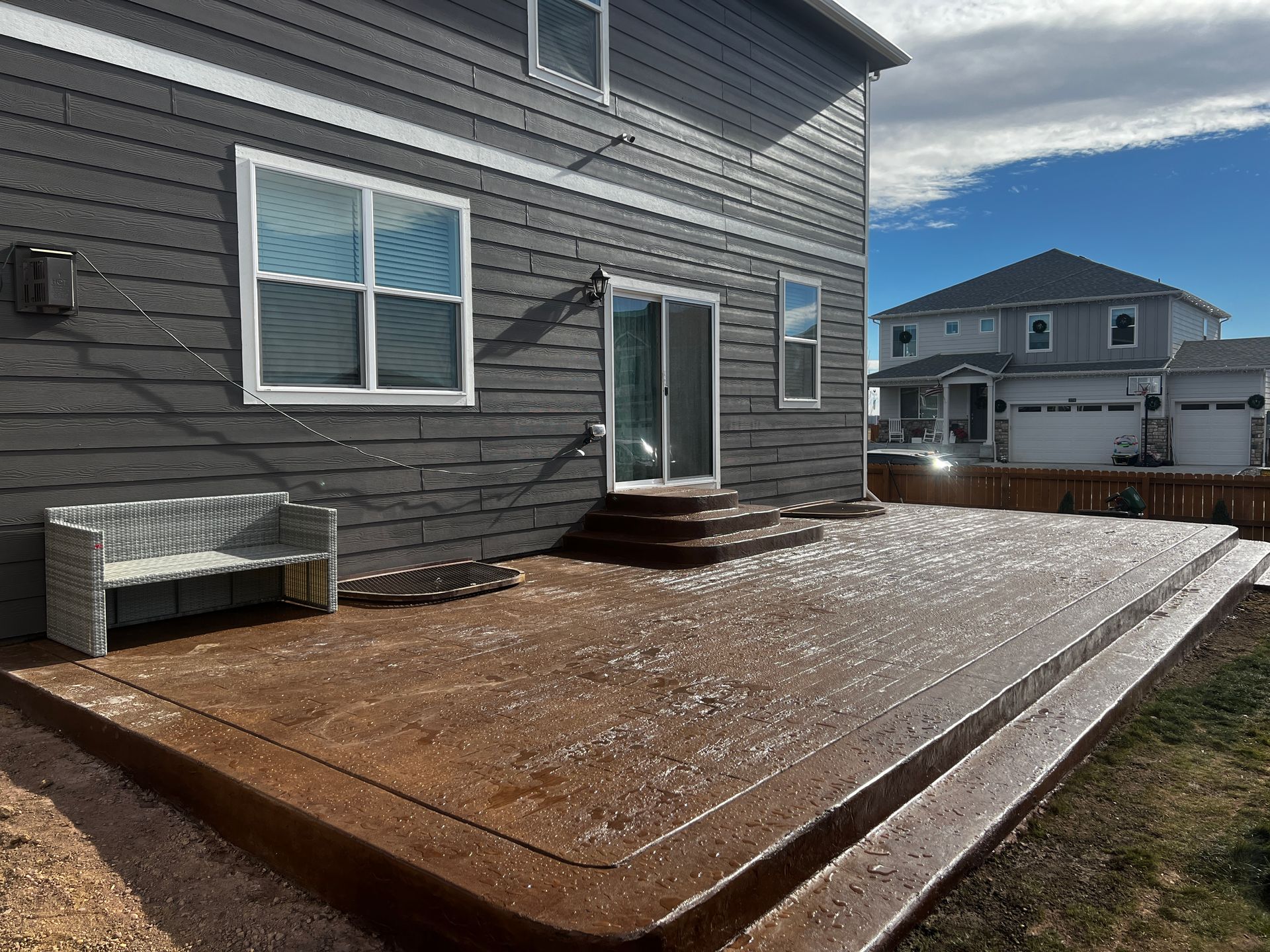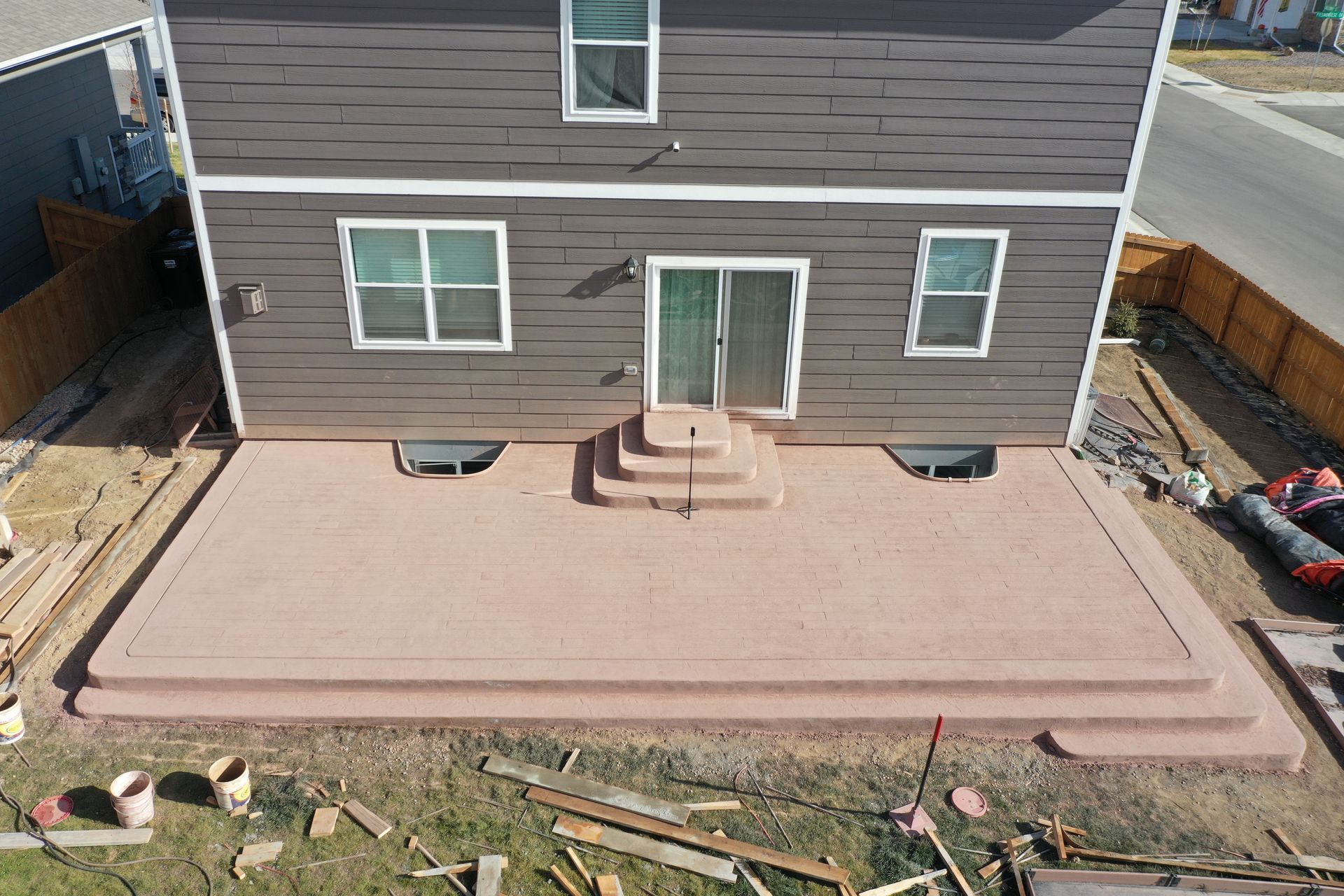 Install of new stamped concrete patio and steps. Using darker tone for wood plank stamp. Adjustment of sprinklers to account for new patio. Mead, CO 2021
