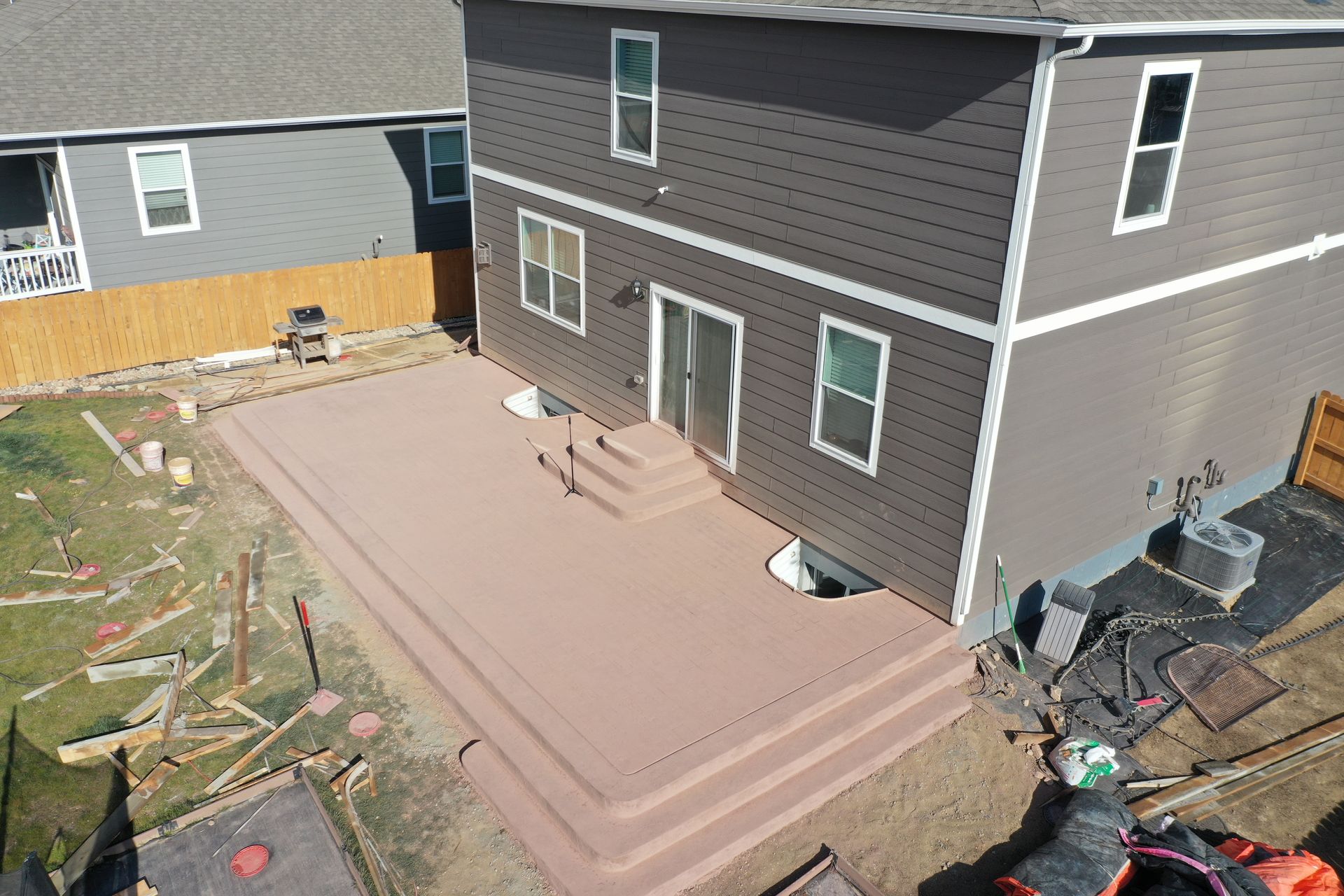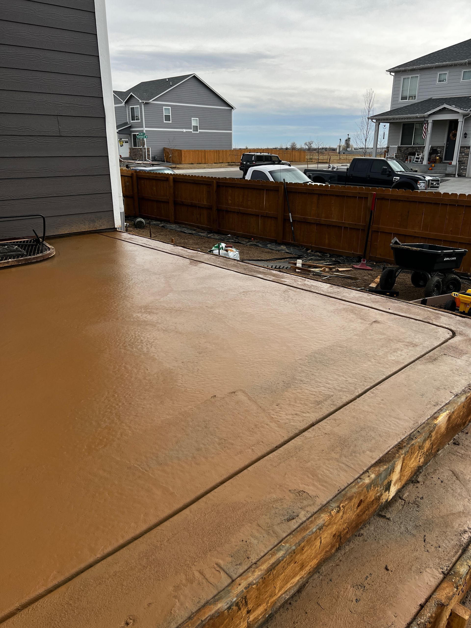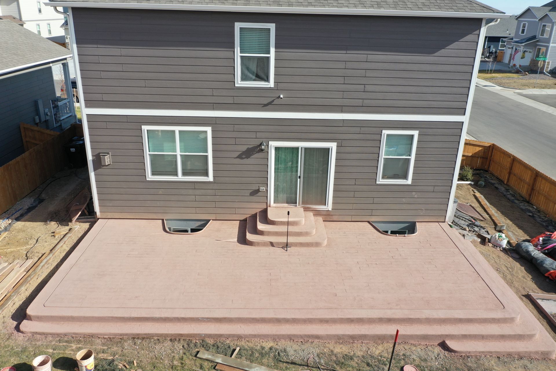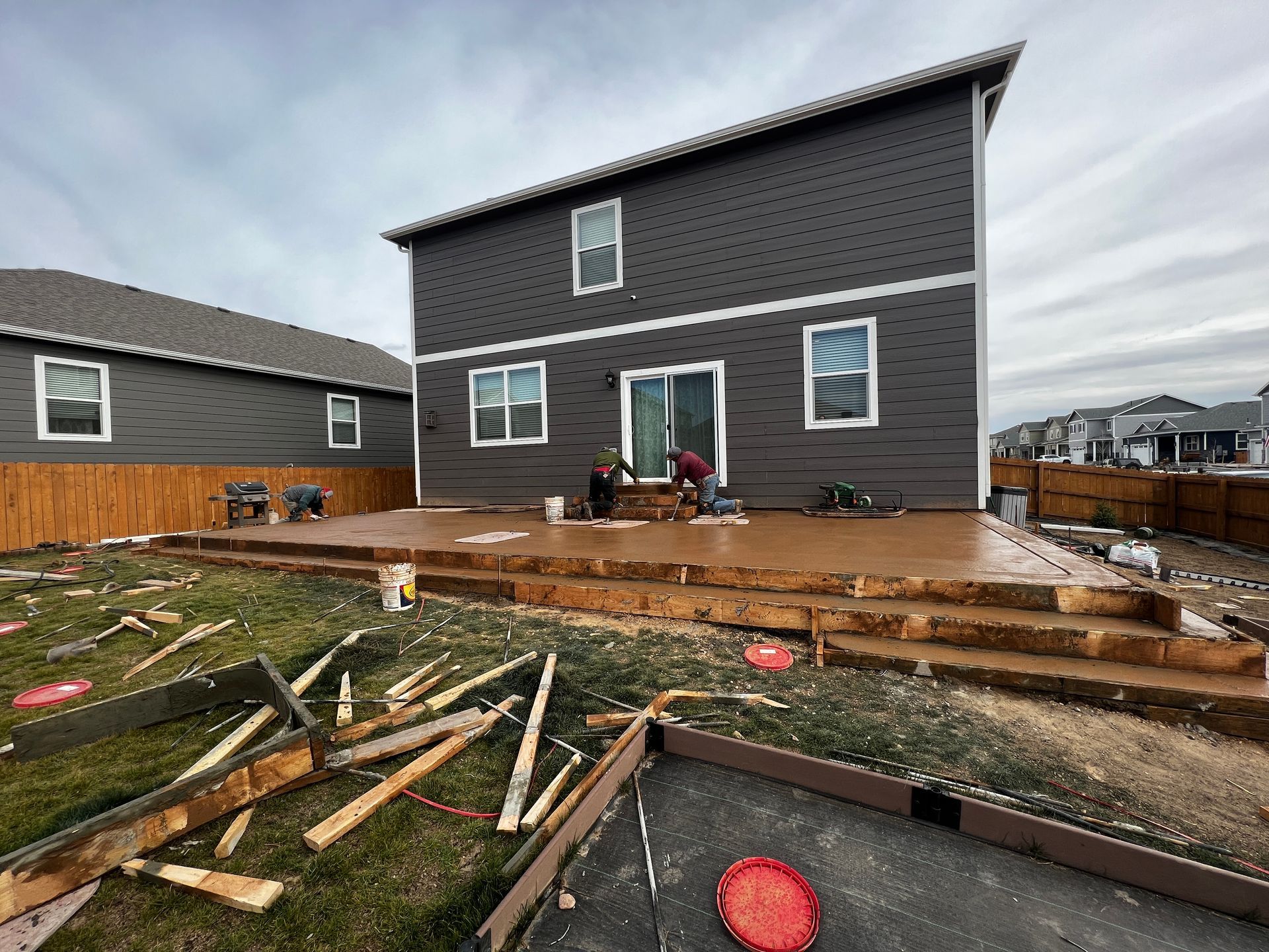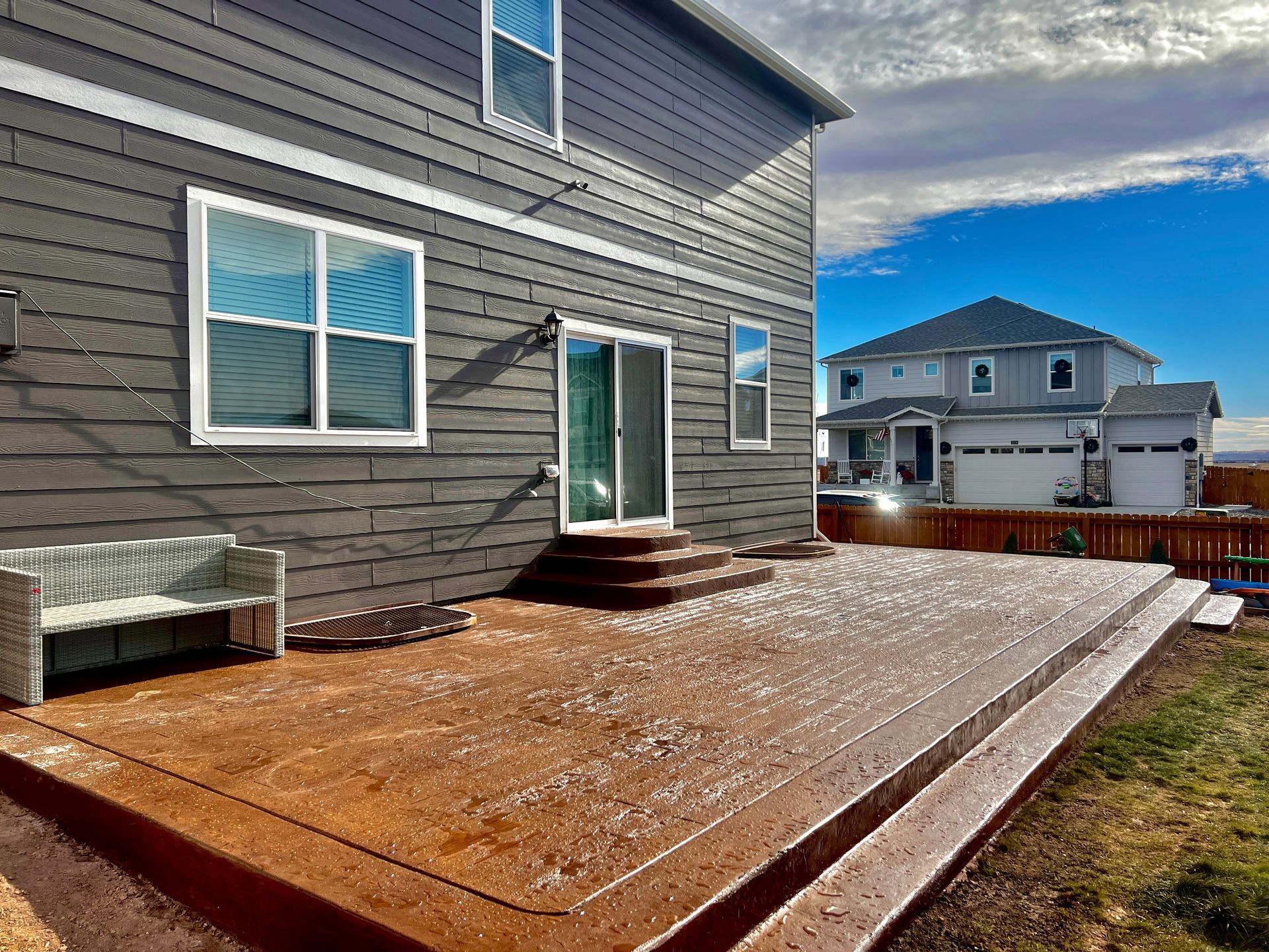 Install of new stamped concrete patio and steps. Using darker tone for wood plank stamp. Adjustment of sprinklers to account for new patio. Mead, CO 2021