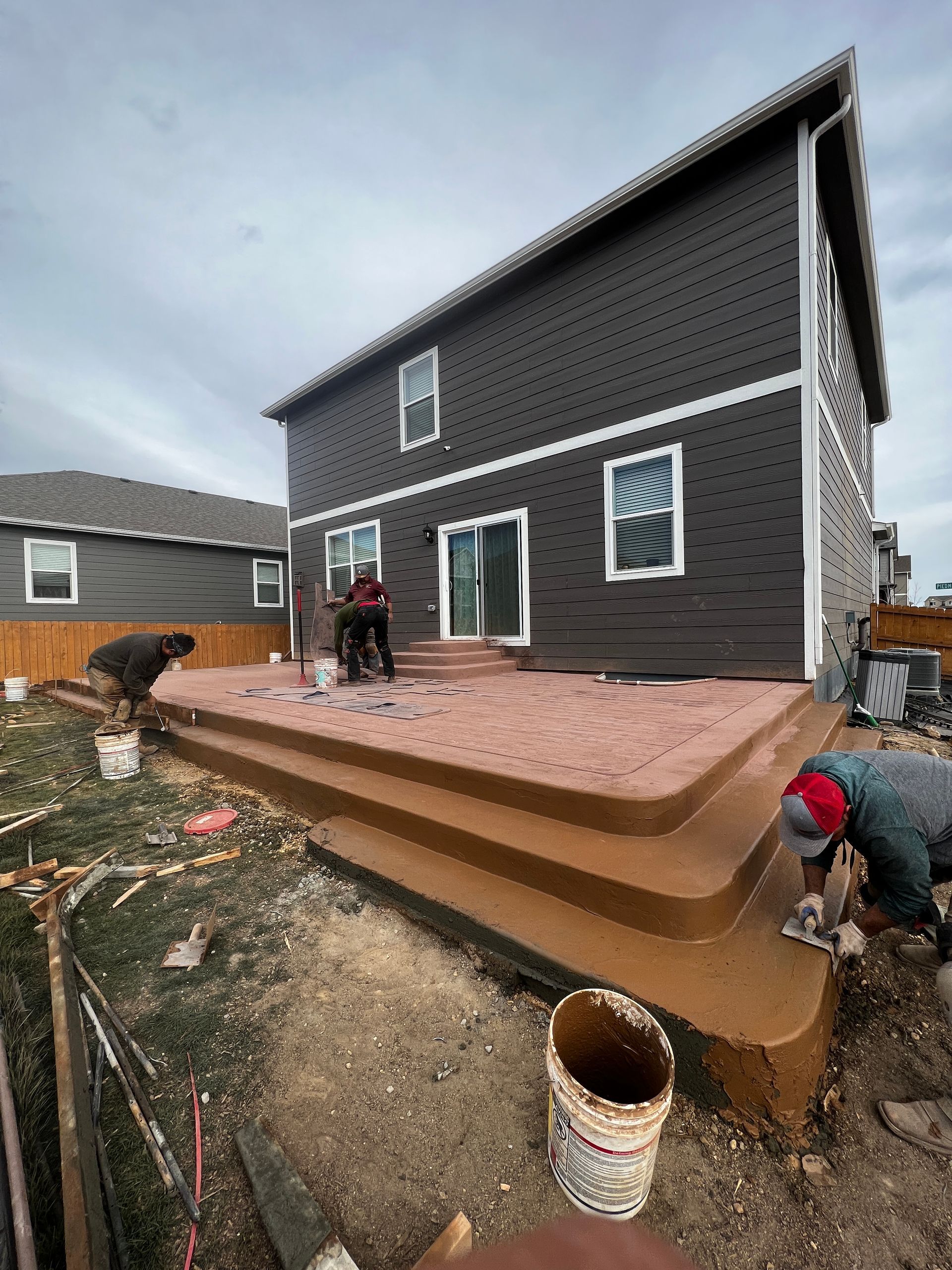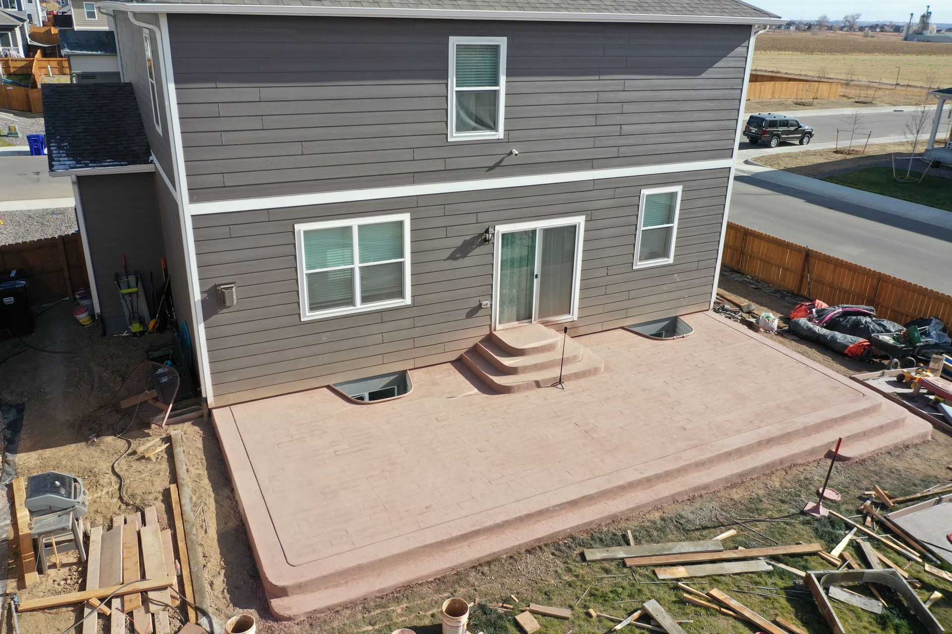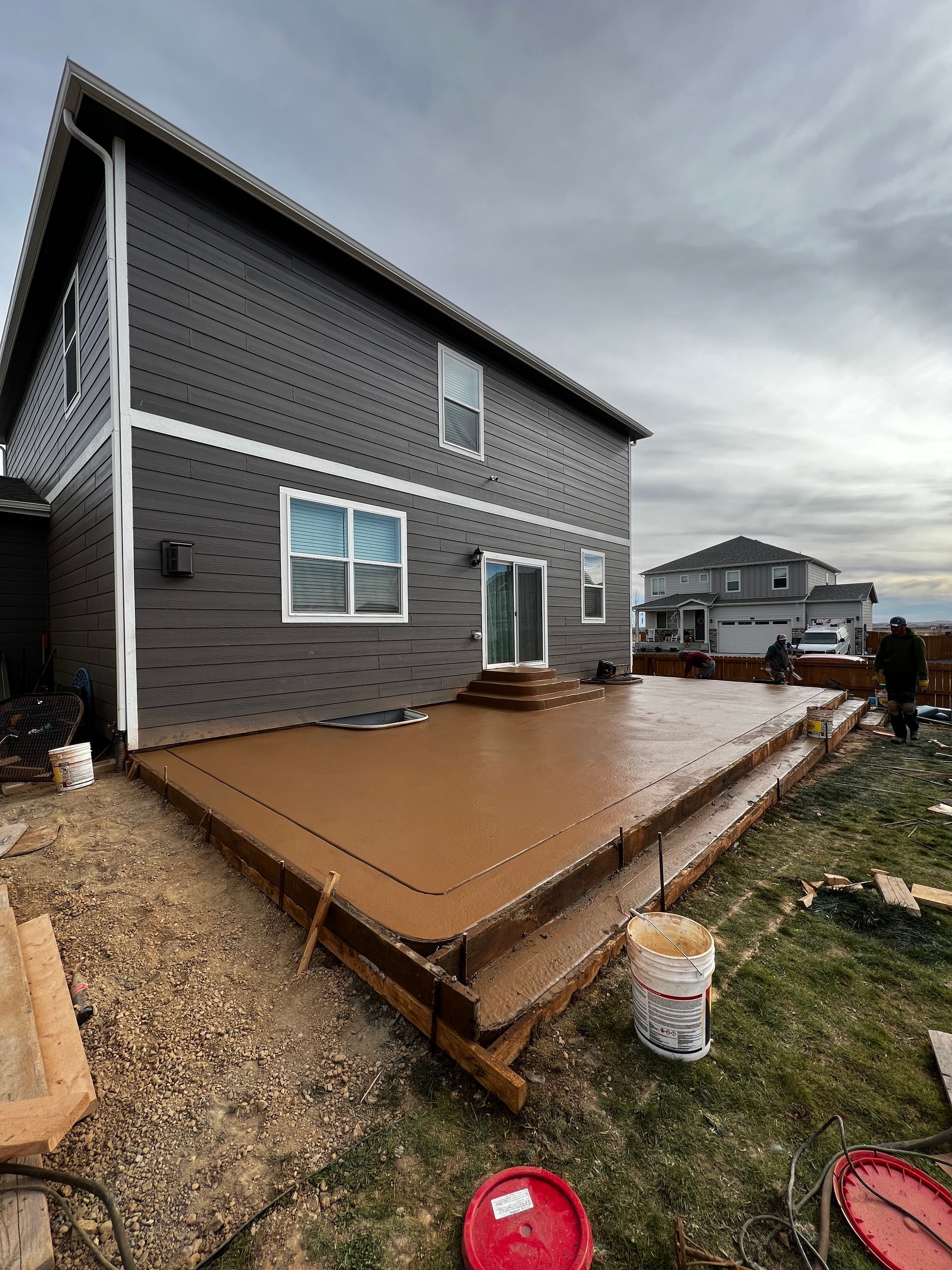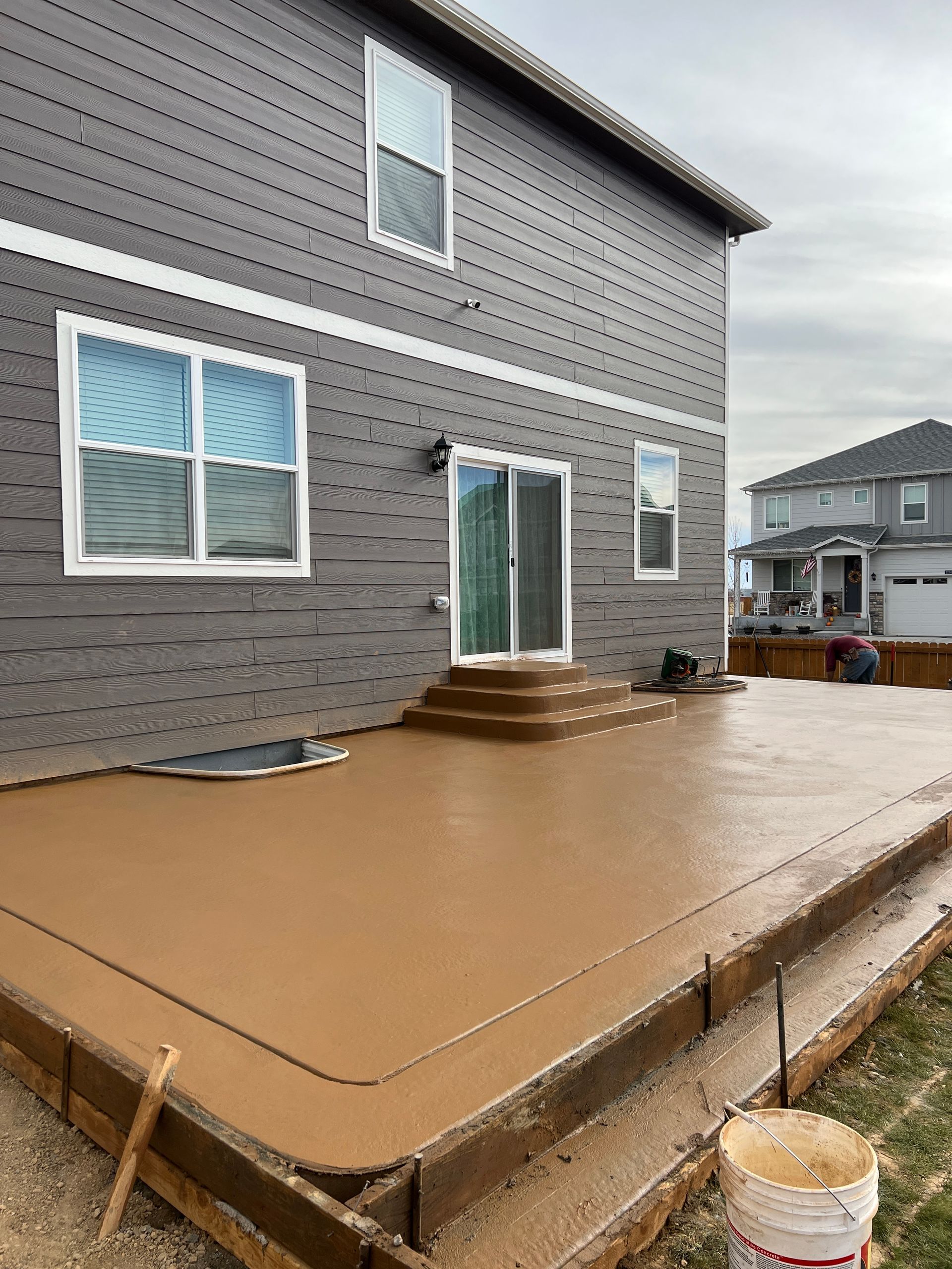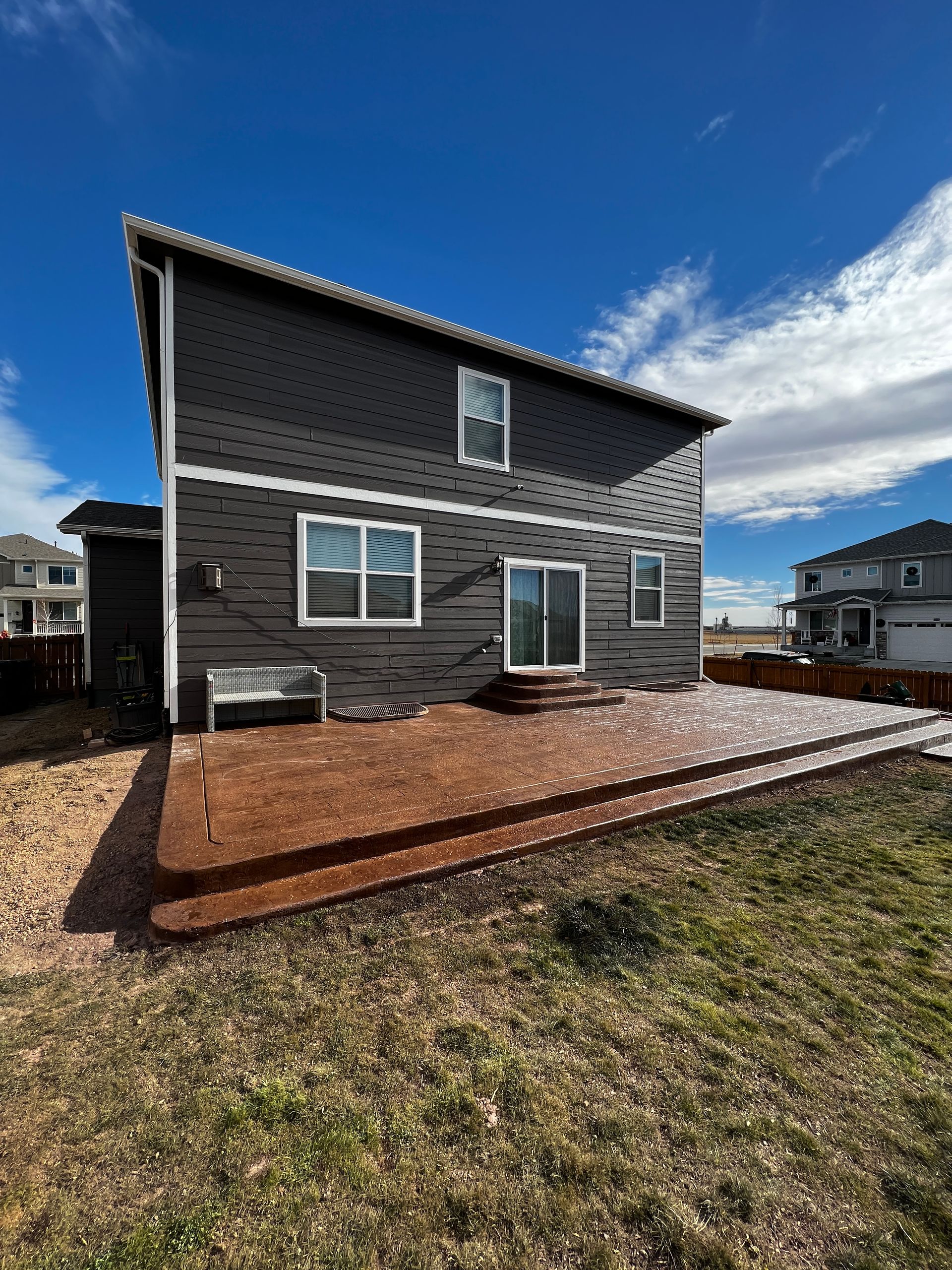 Install of new stamped concrete patio and steps. Using darker tone for wood plank stamp. Adjustment of sprinklers to account for new patio. Mead, CO 2021