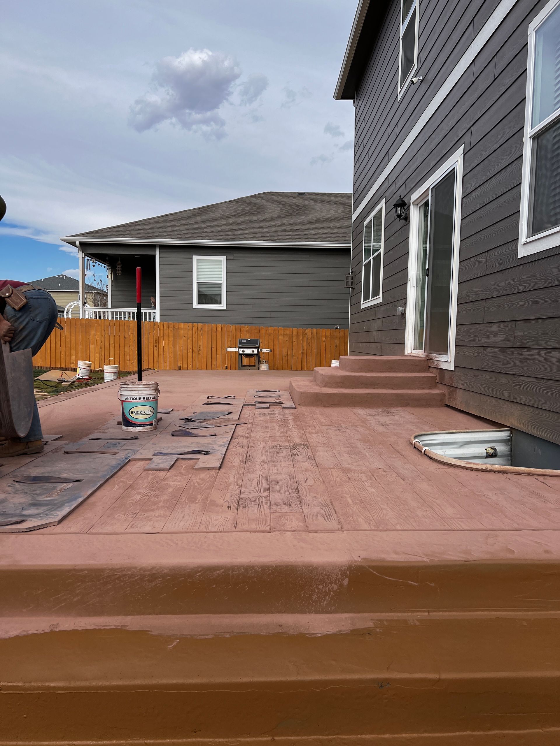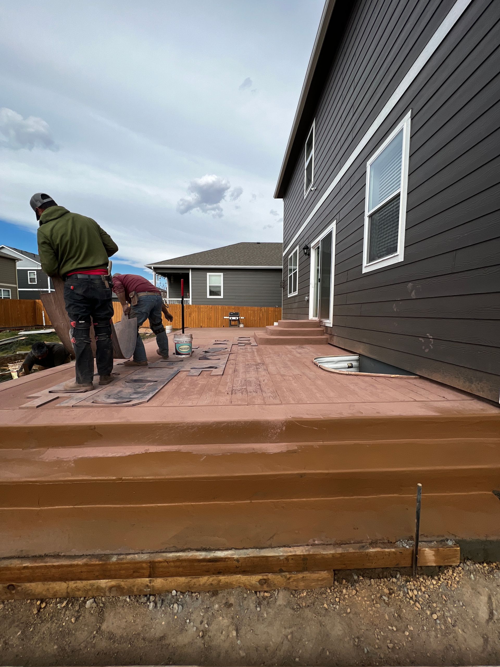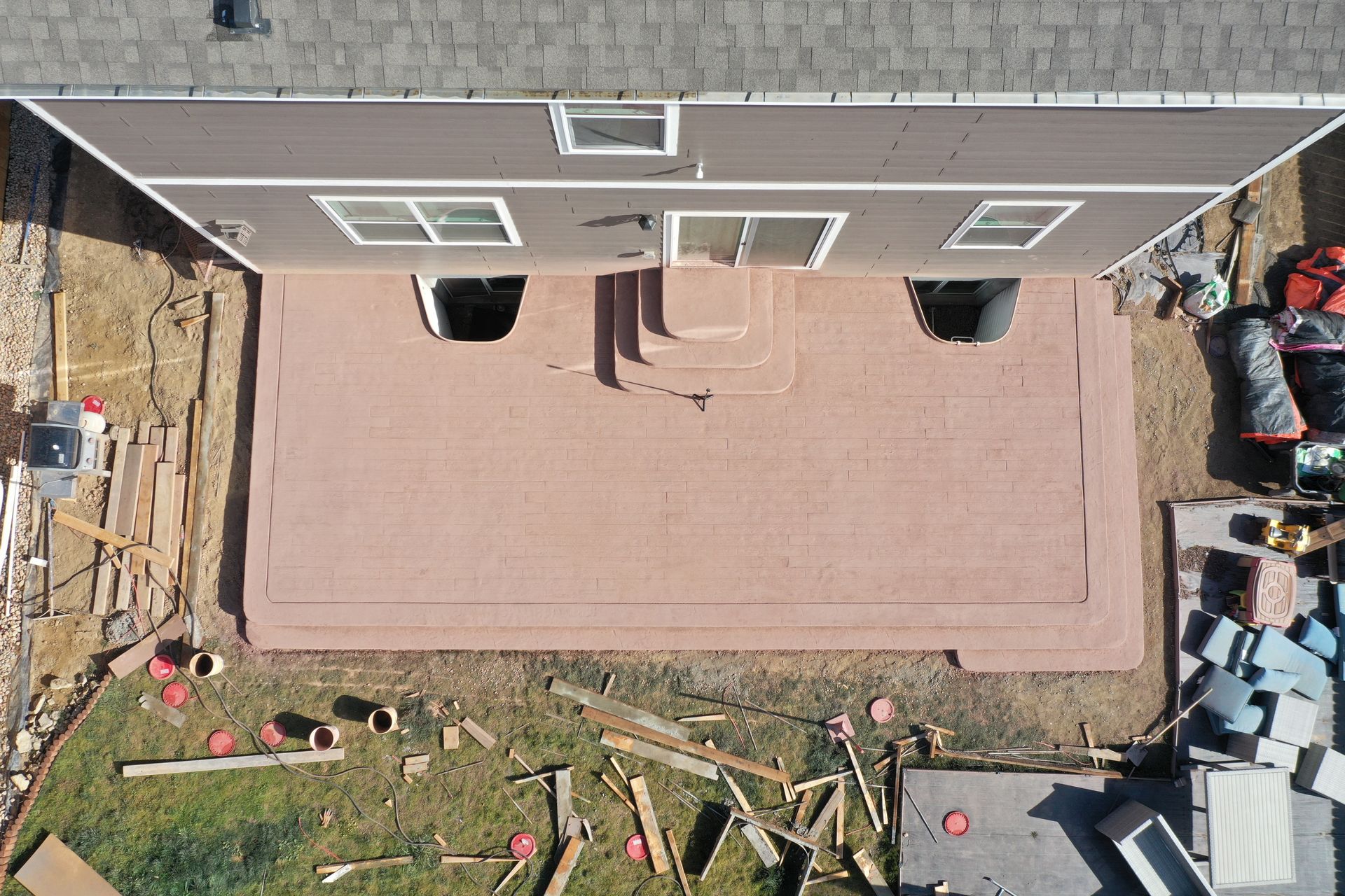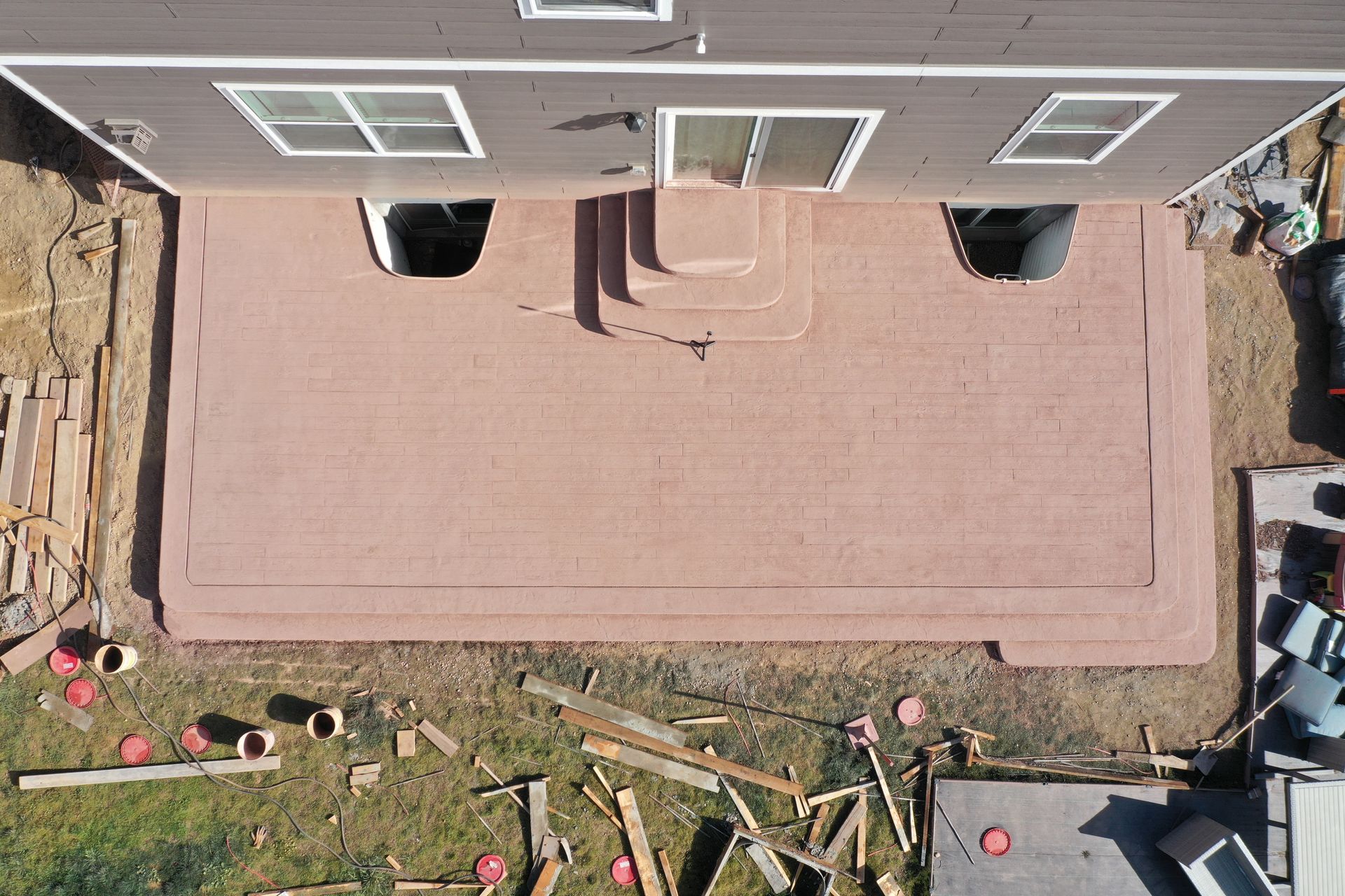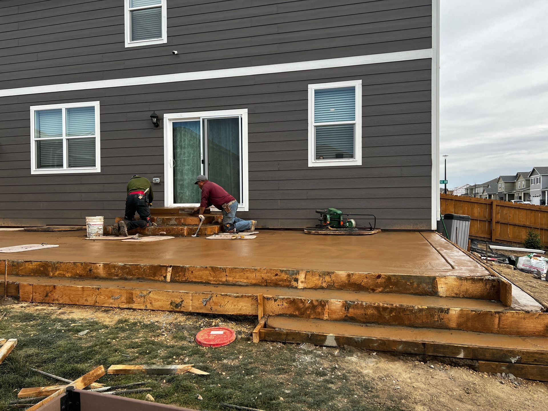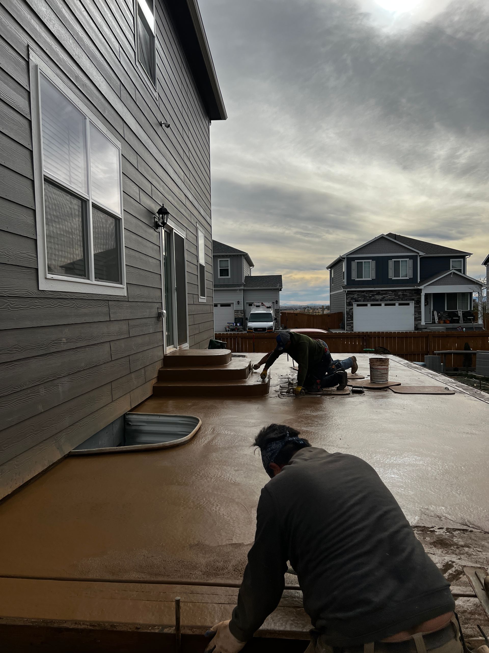 Install of new stamped concrete patio and steps. Using darker tone for wood plank stamp. Adjustment of sprinklers to account for new patio. Mead, CO 2021
