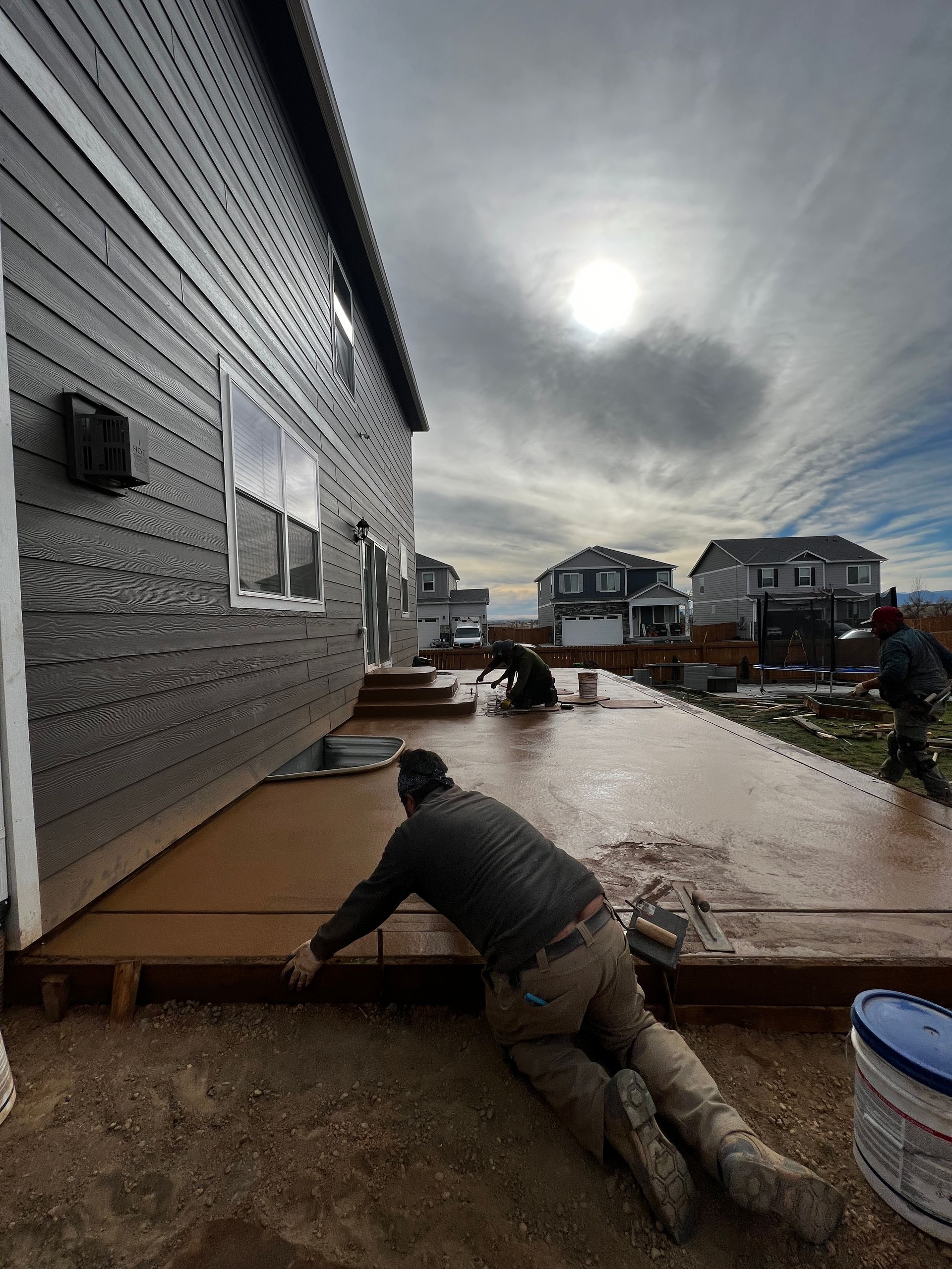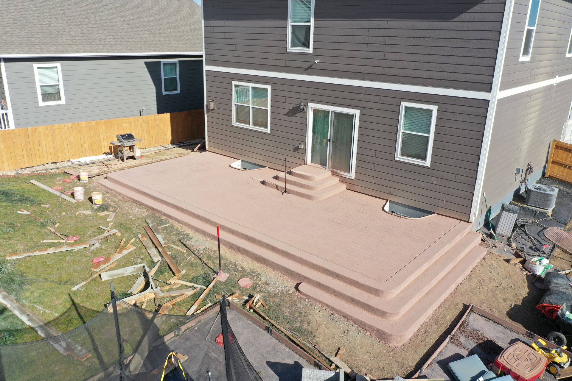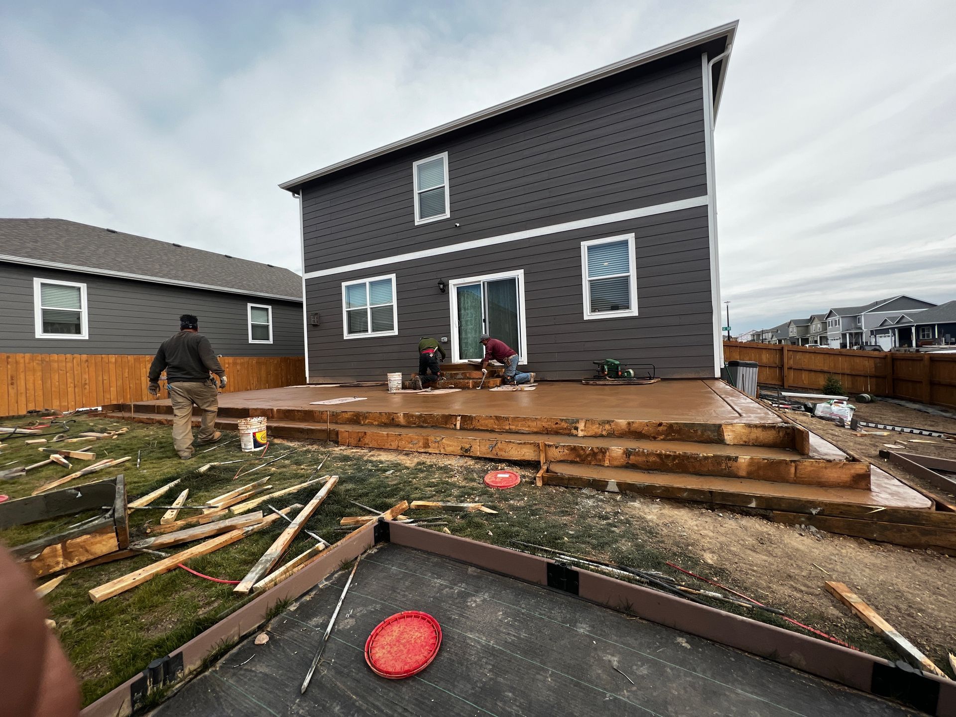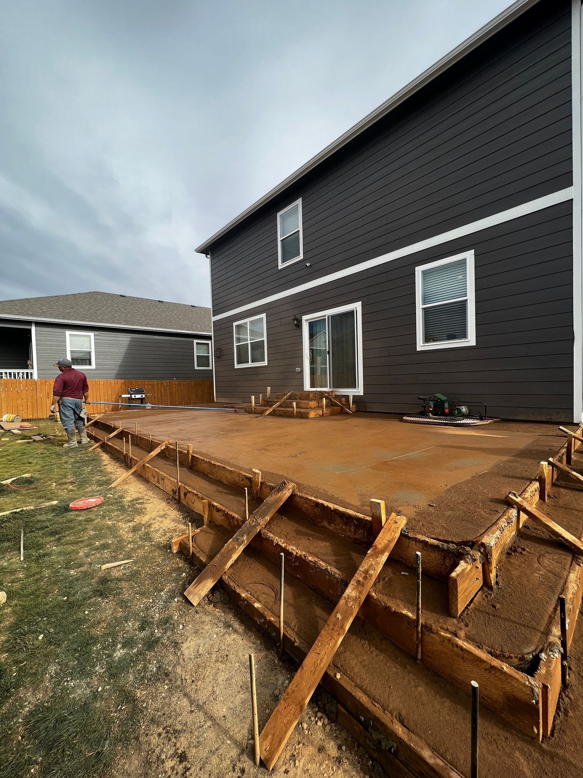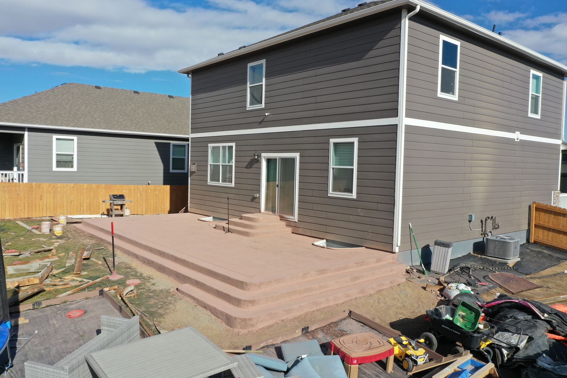 Install of new stamped concrete patio and steps. Using darker tone for wood plank stamp. Adjustment of sprinklers to account for new patio. Mead, CO 2021