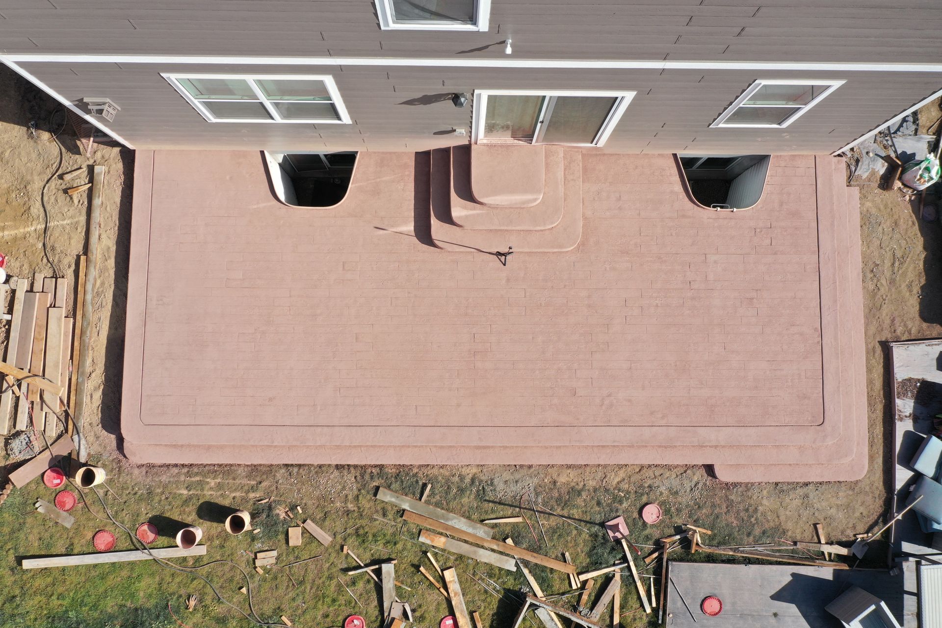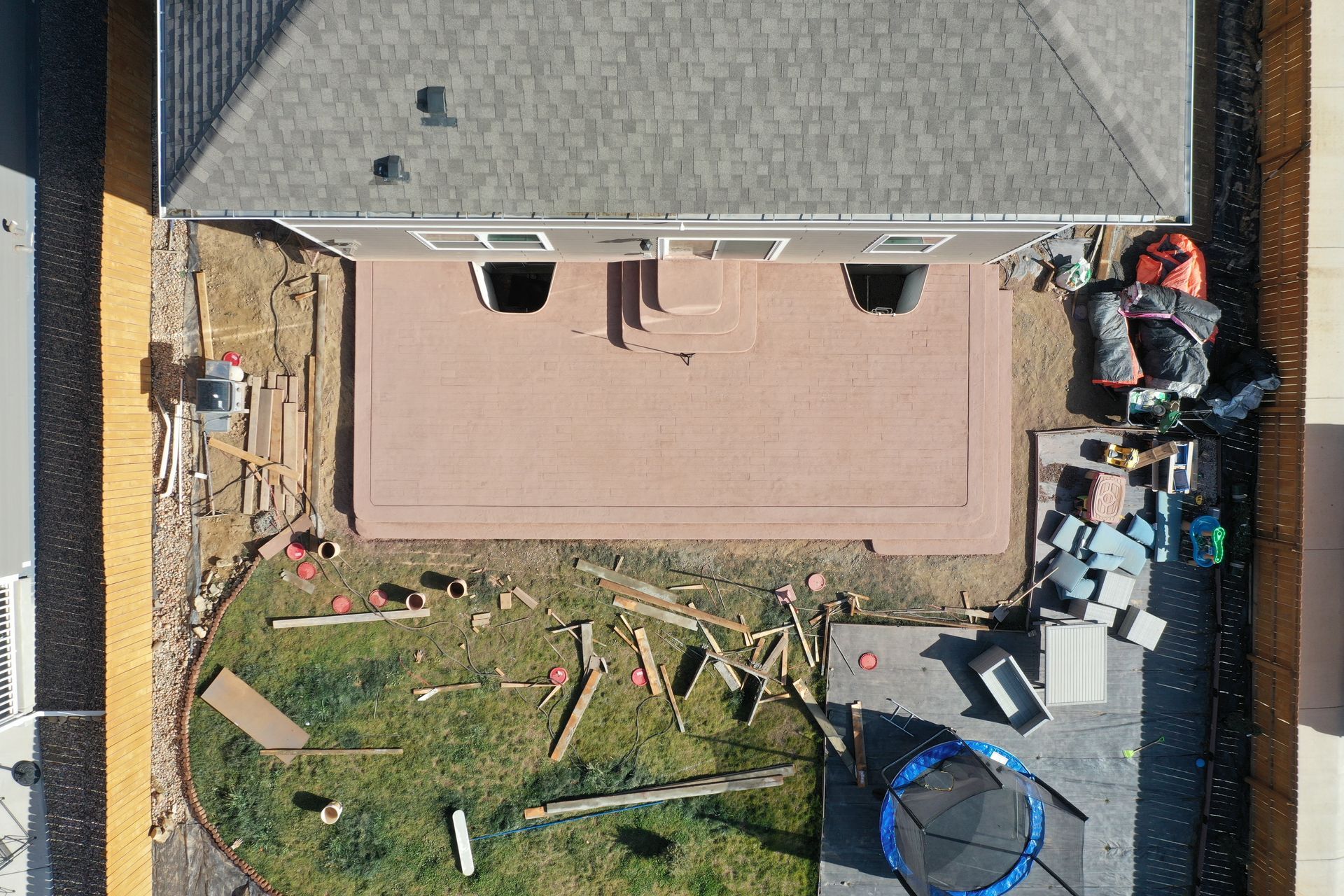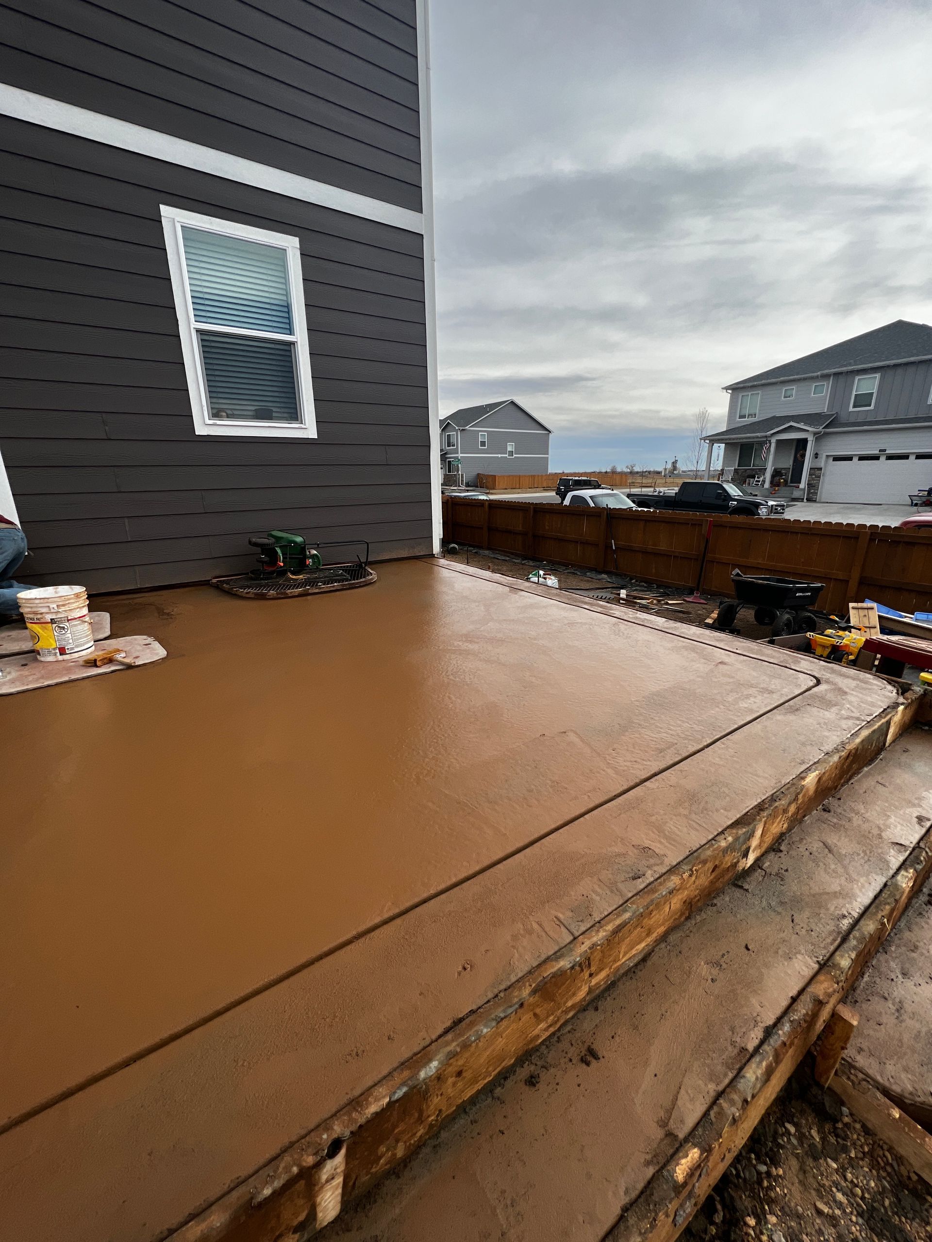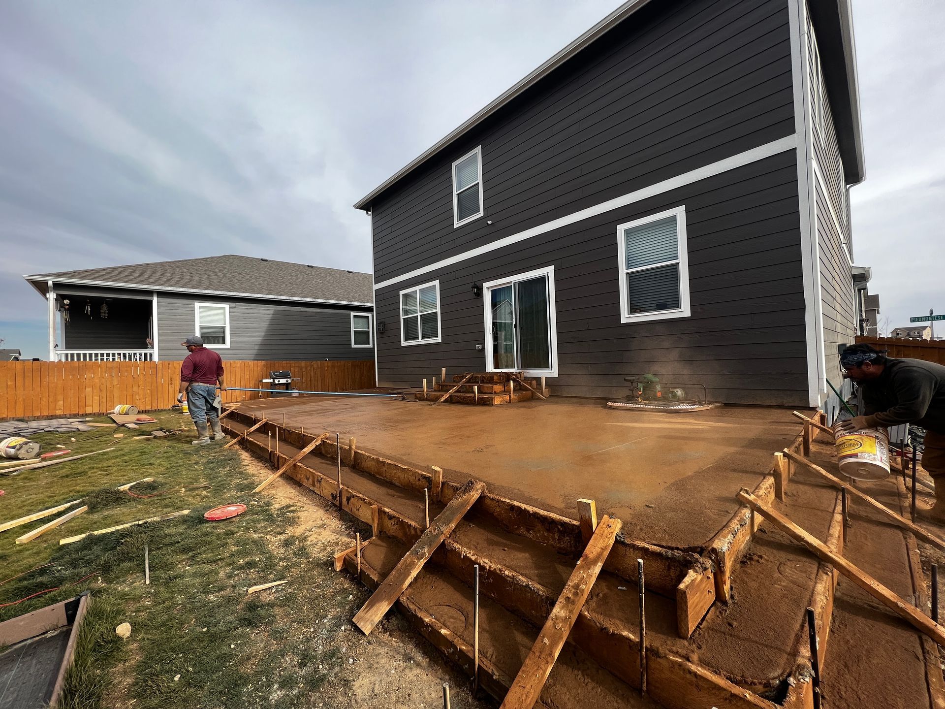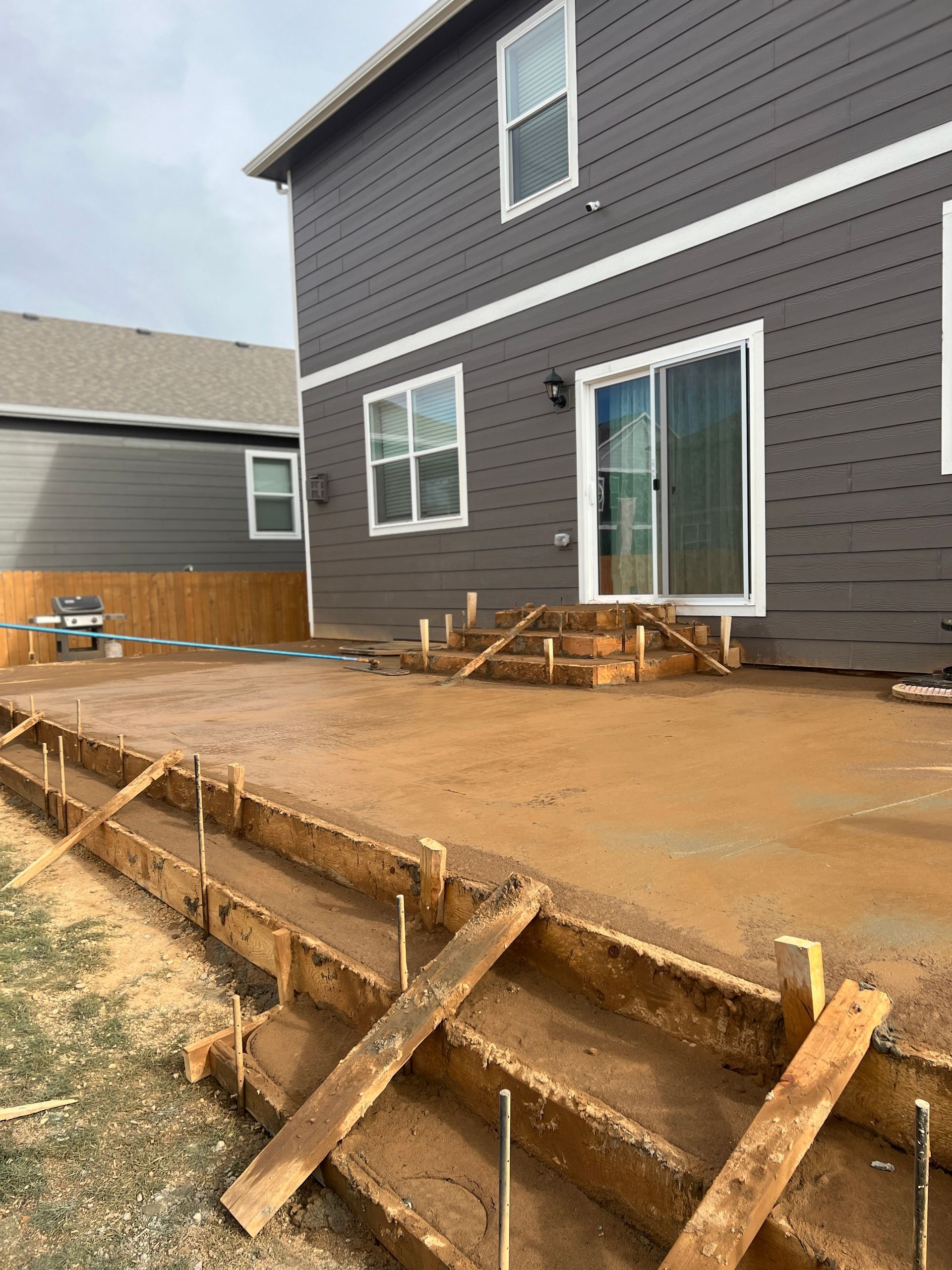 Install of new stamped concrete patio and steps. Using darker tone for wood plank stamp. Adjustment of sprinklers to account for new patio. Mead, CO 2021