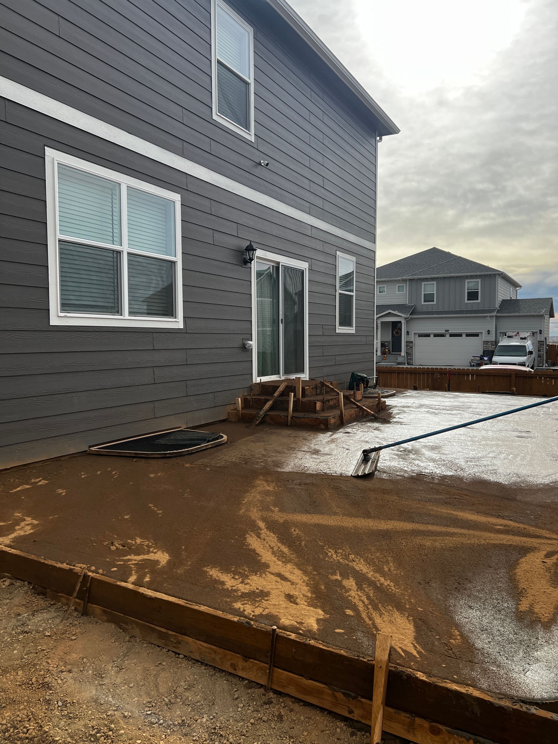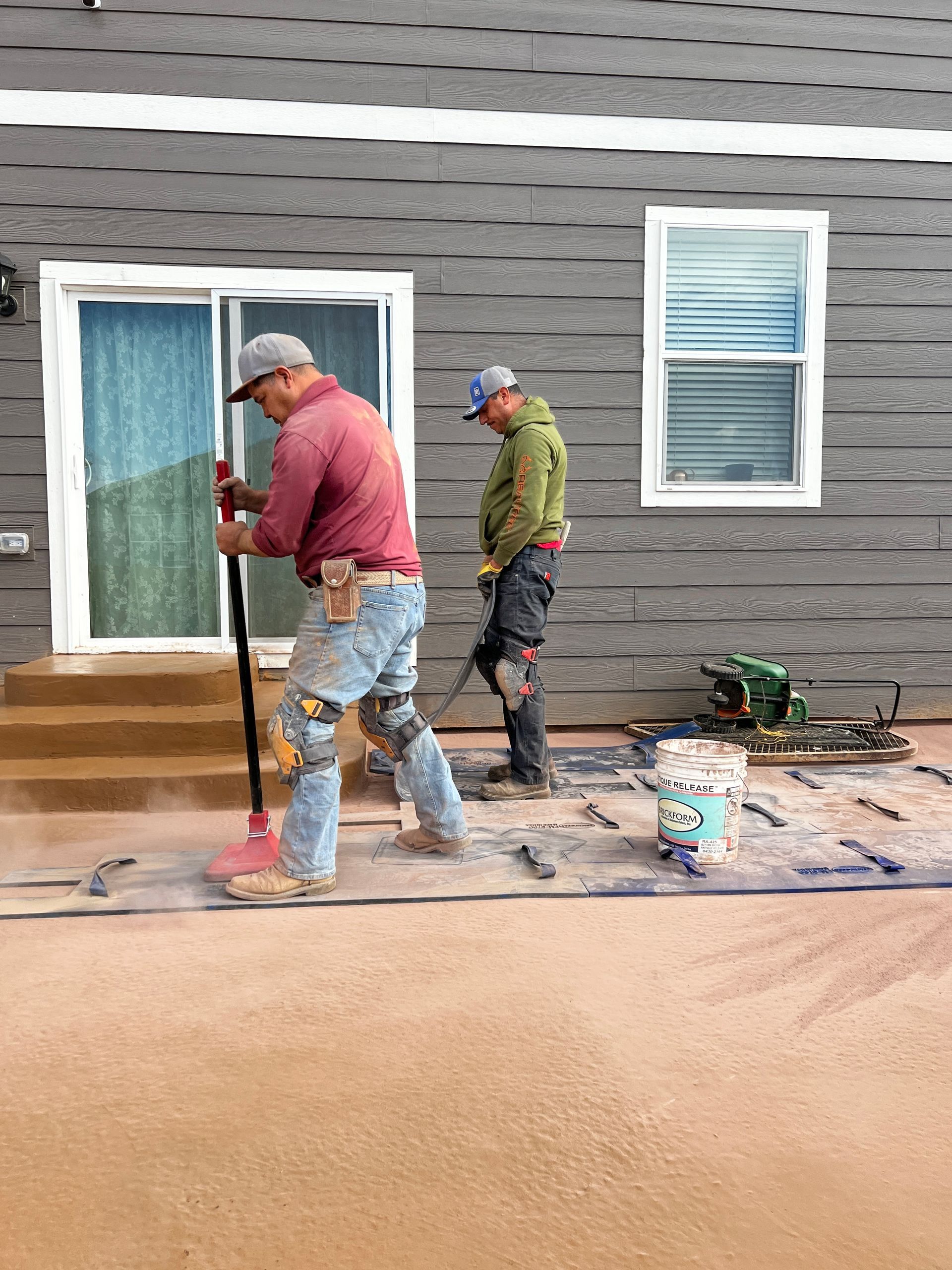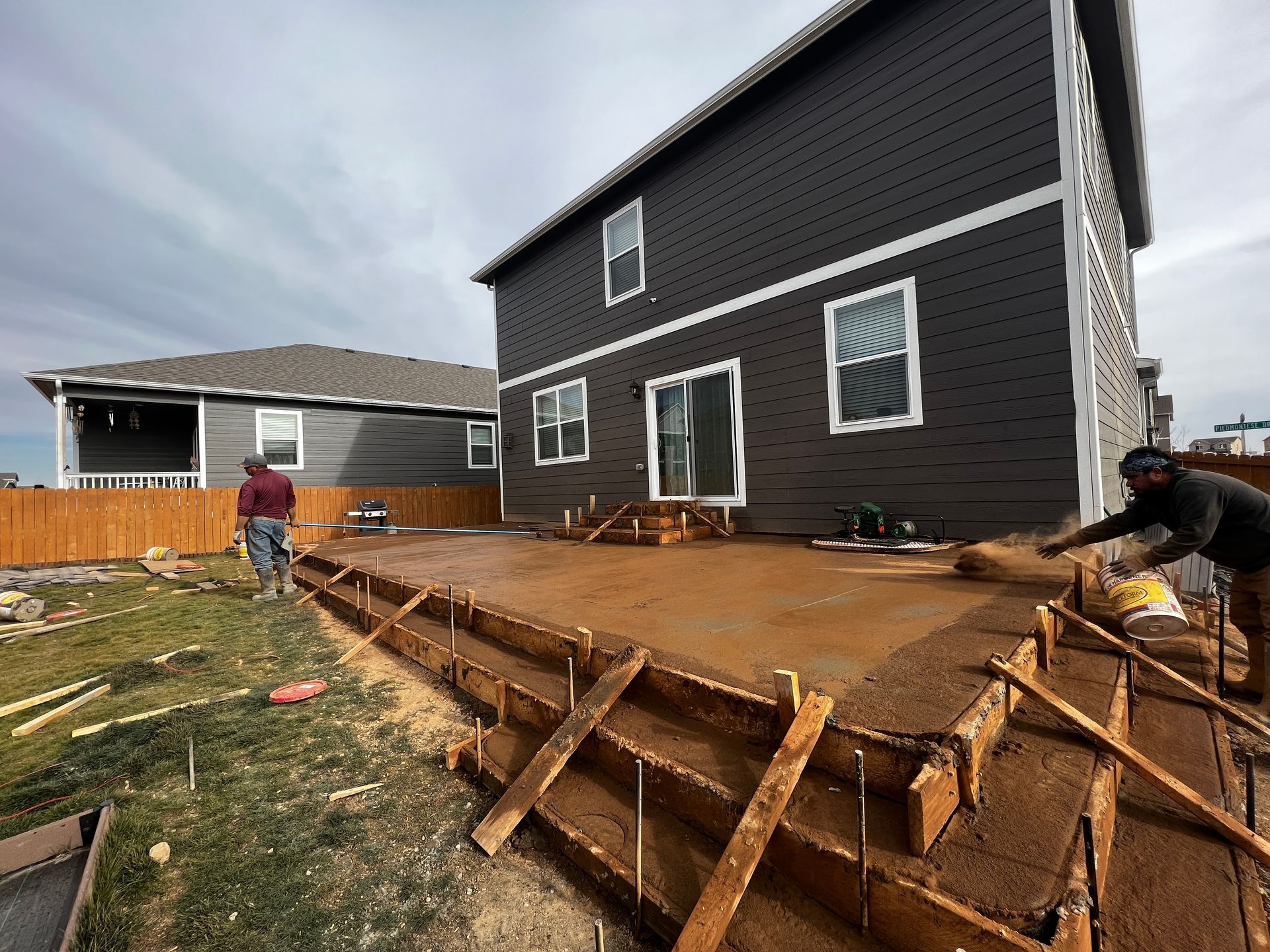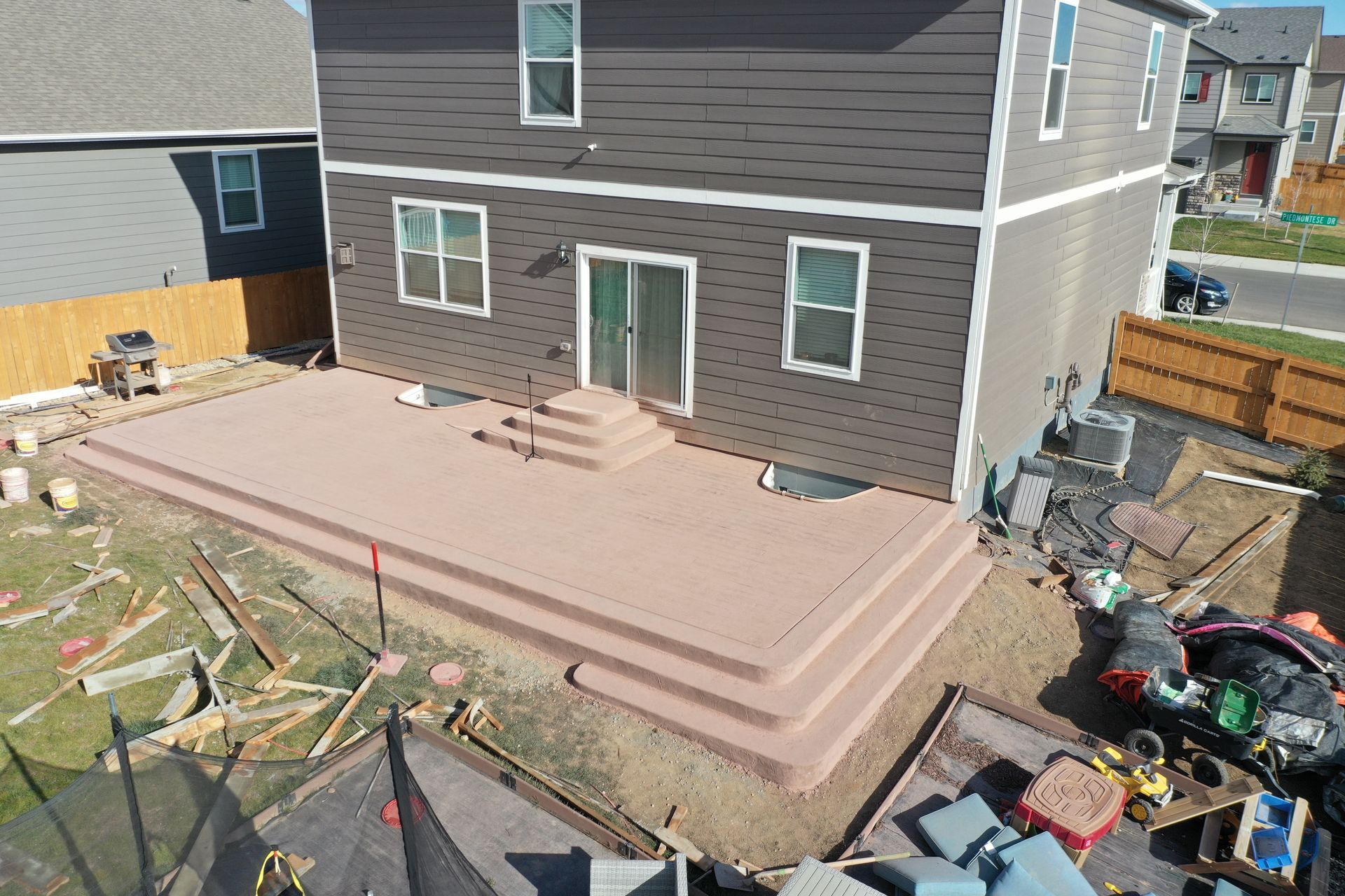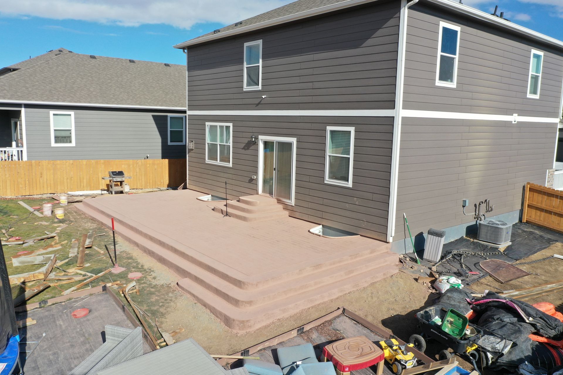 Install of new stamped concrete patio and steps. Using darker tone for wood plank stamp. Adjustment of sprinklers to account for new patio. Mead, CO 2021