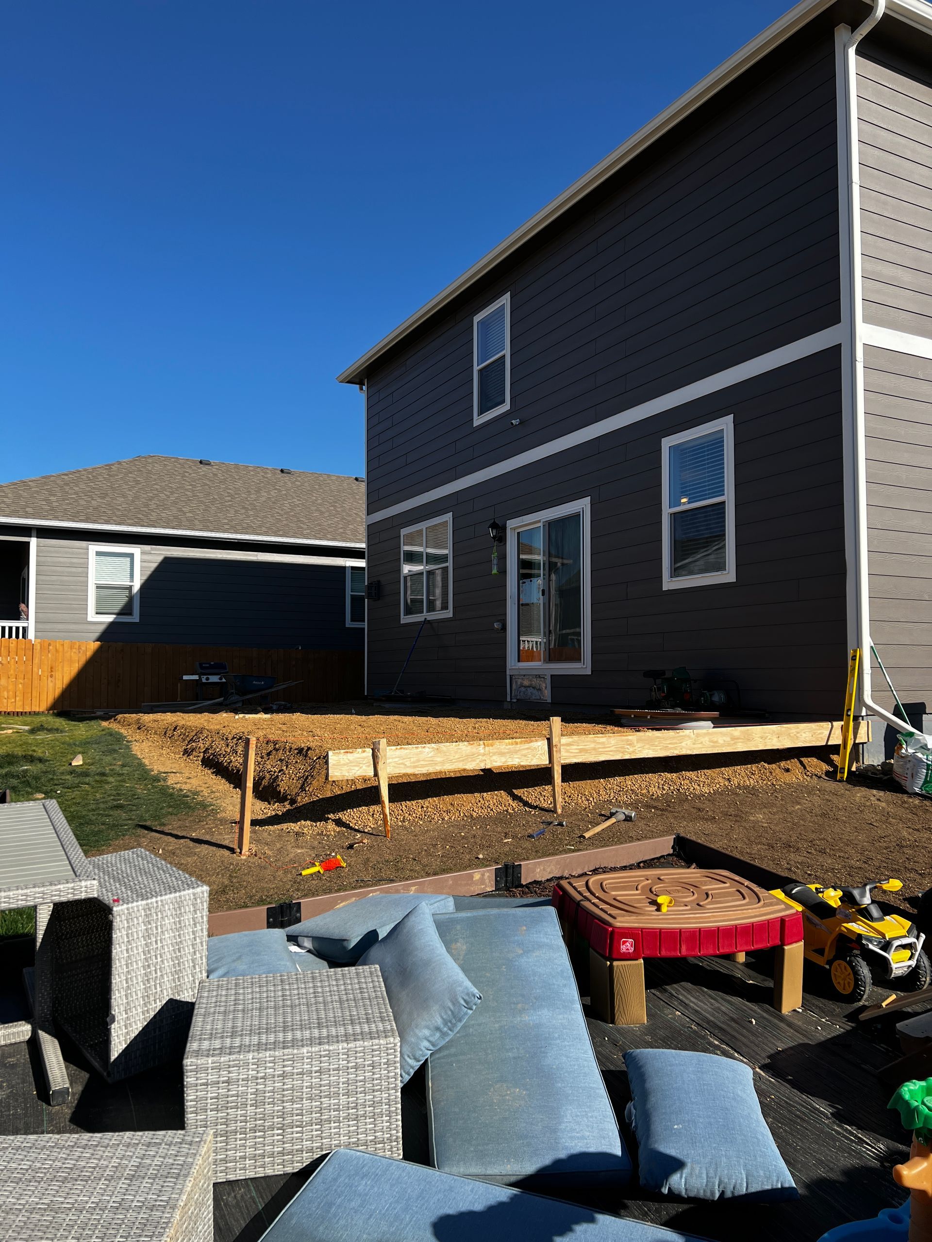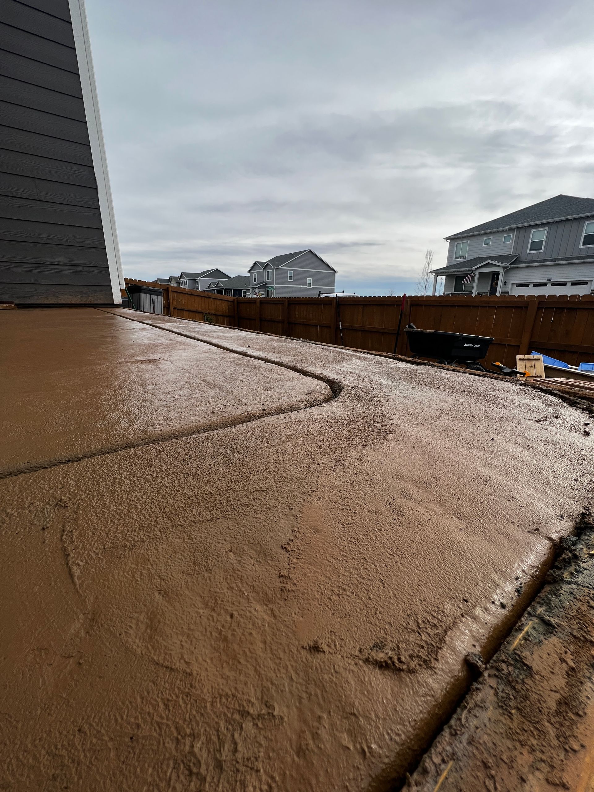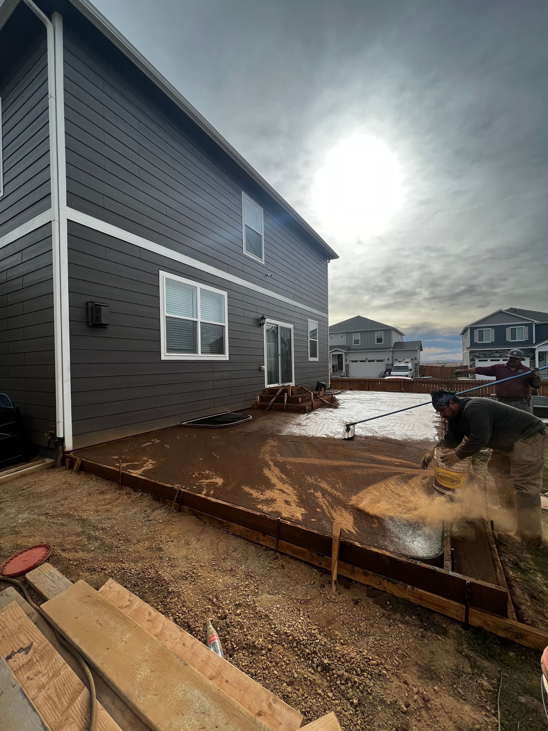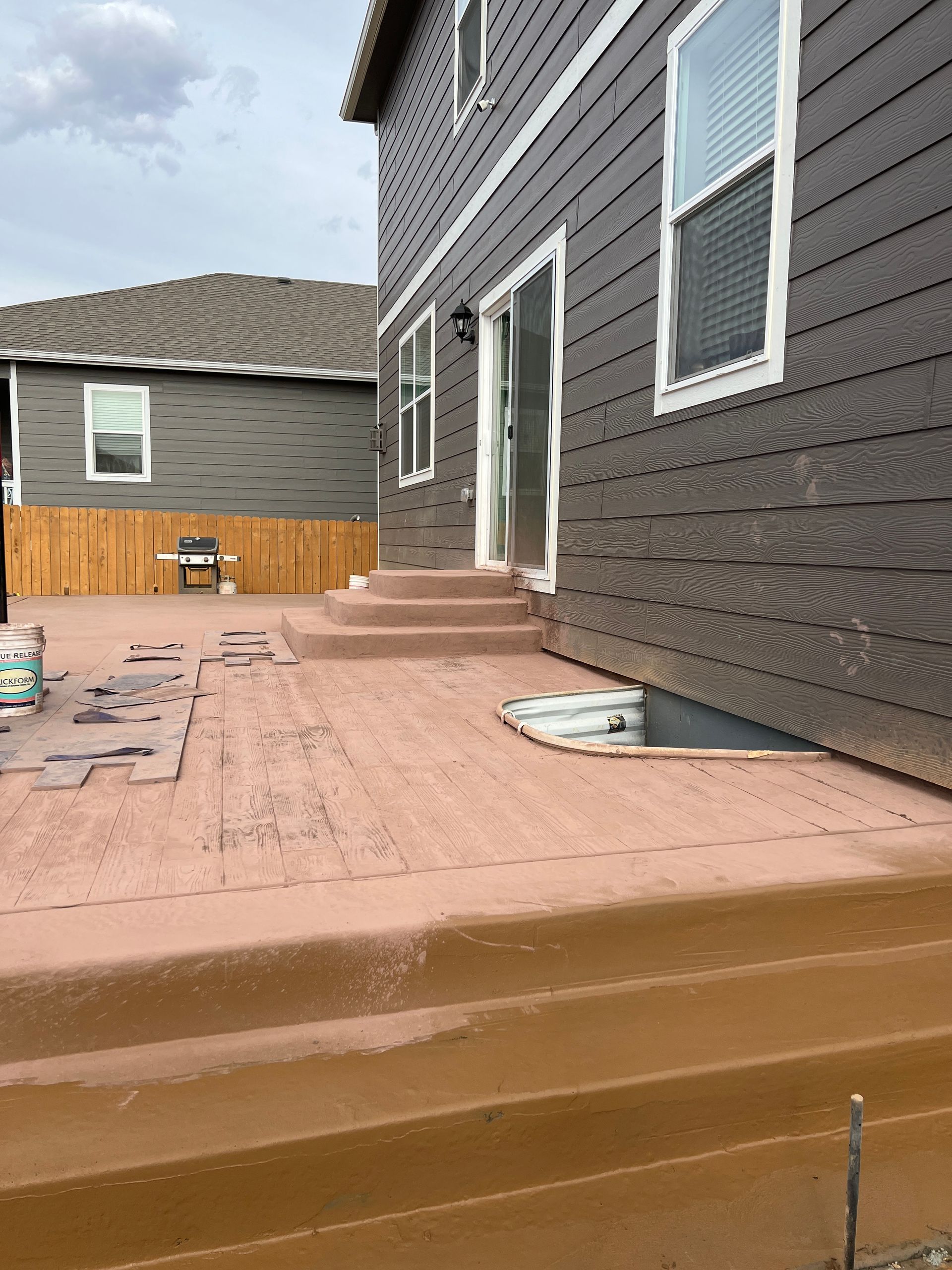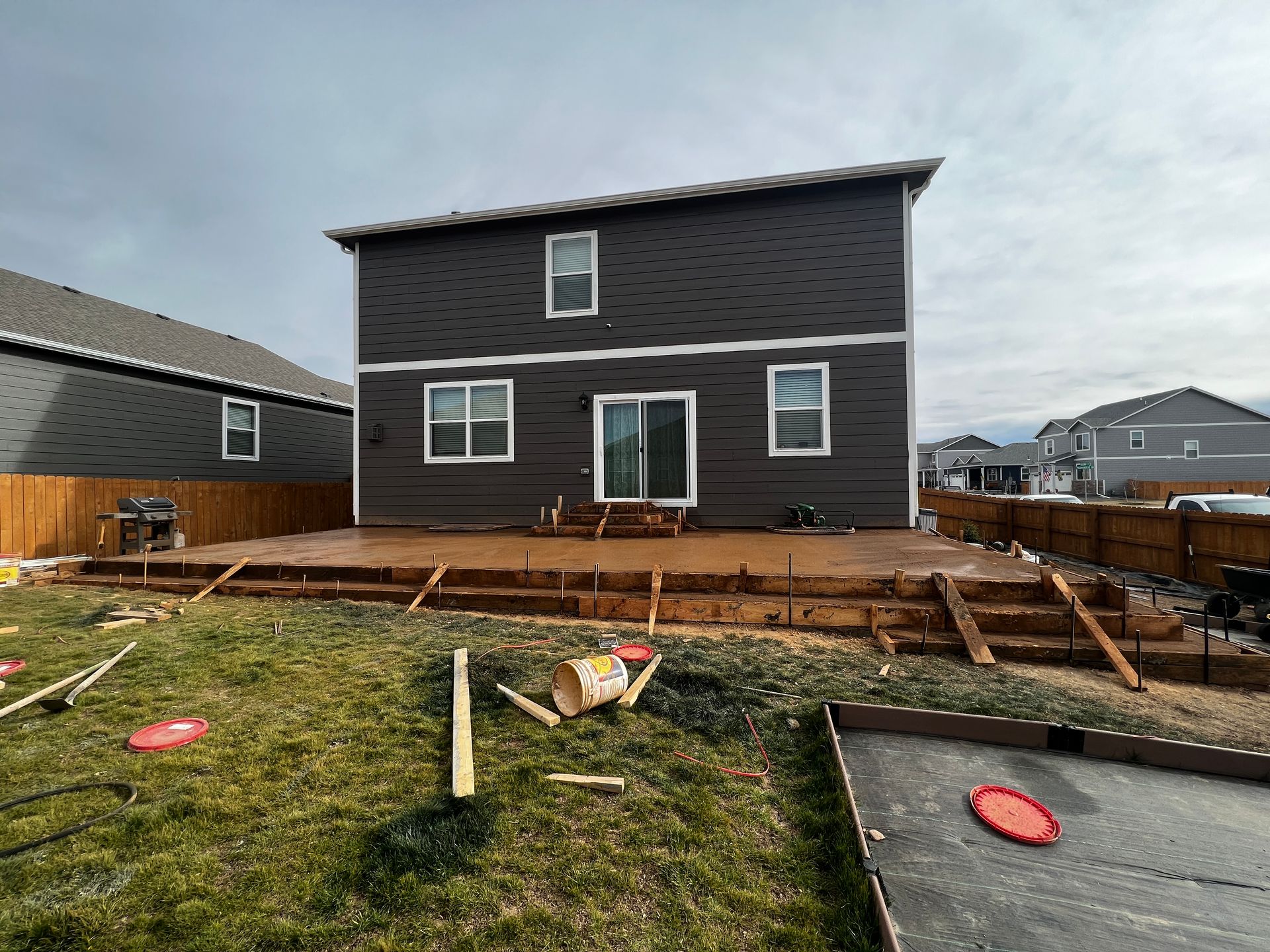 Install of new stamped concrete patio and steps. Using darker tone for wood plank stamp. Adjustment of sprinklers to account for new patio. Mead, CO 2021
