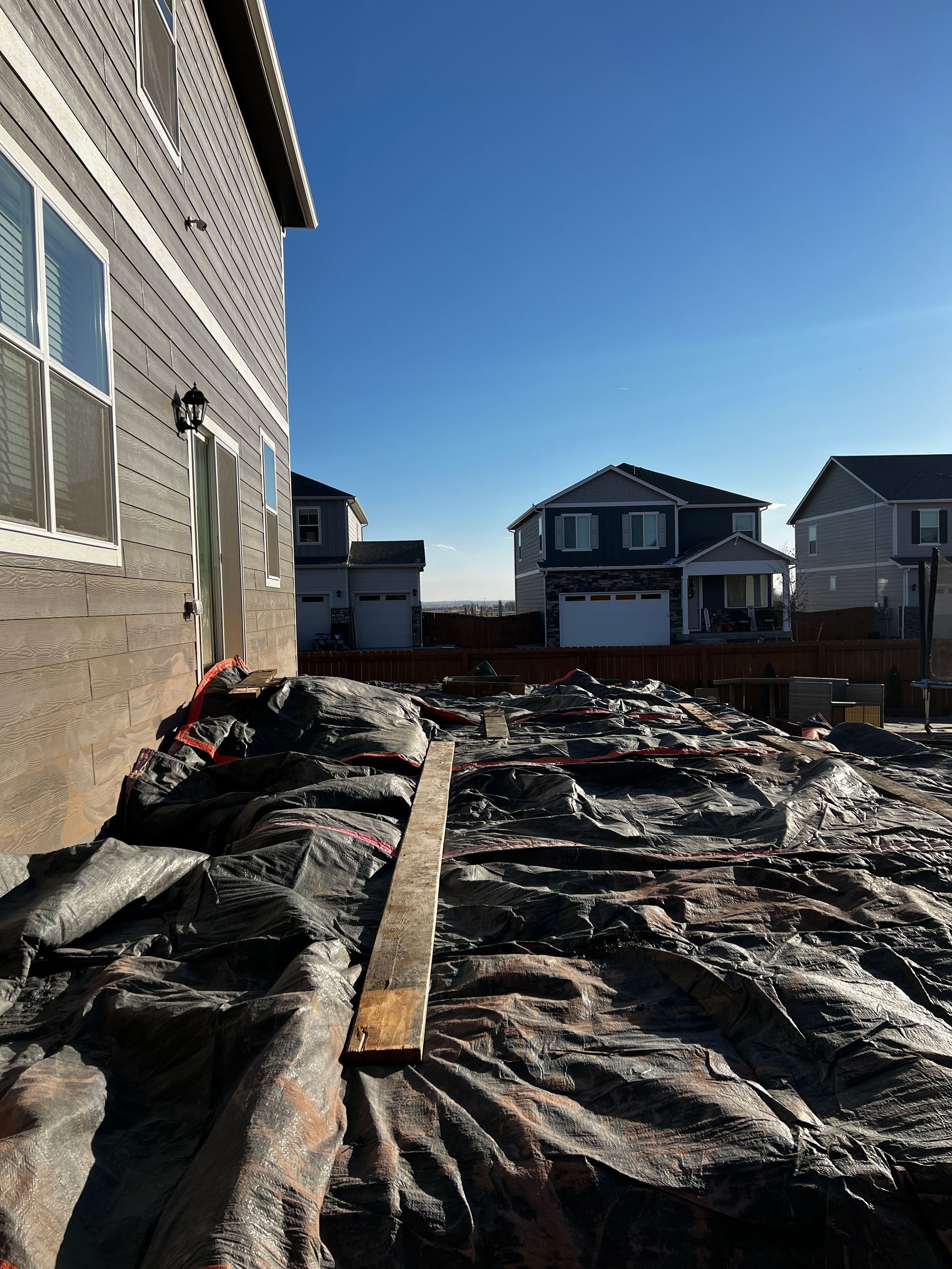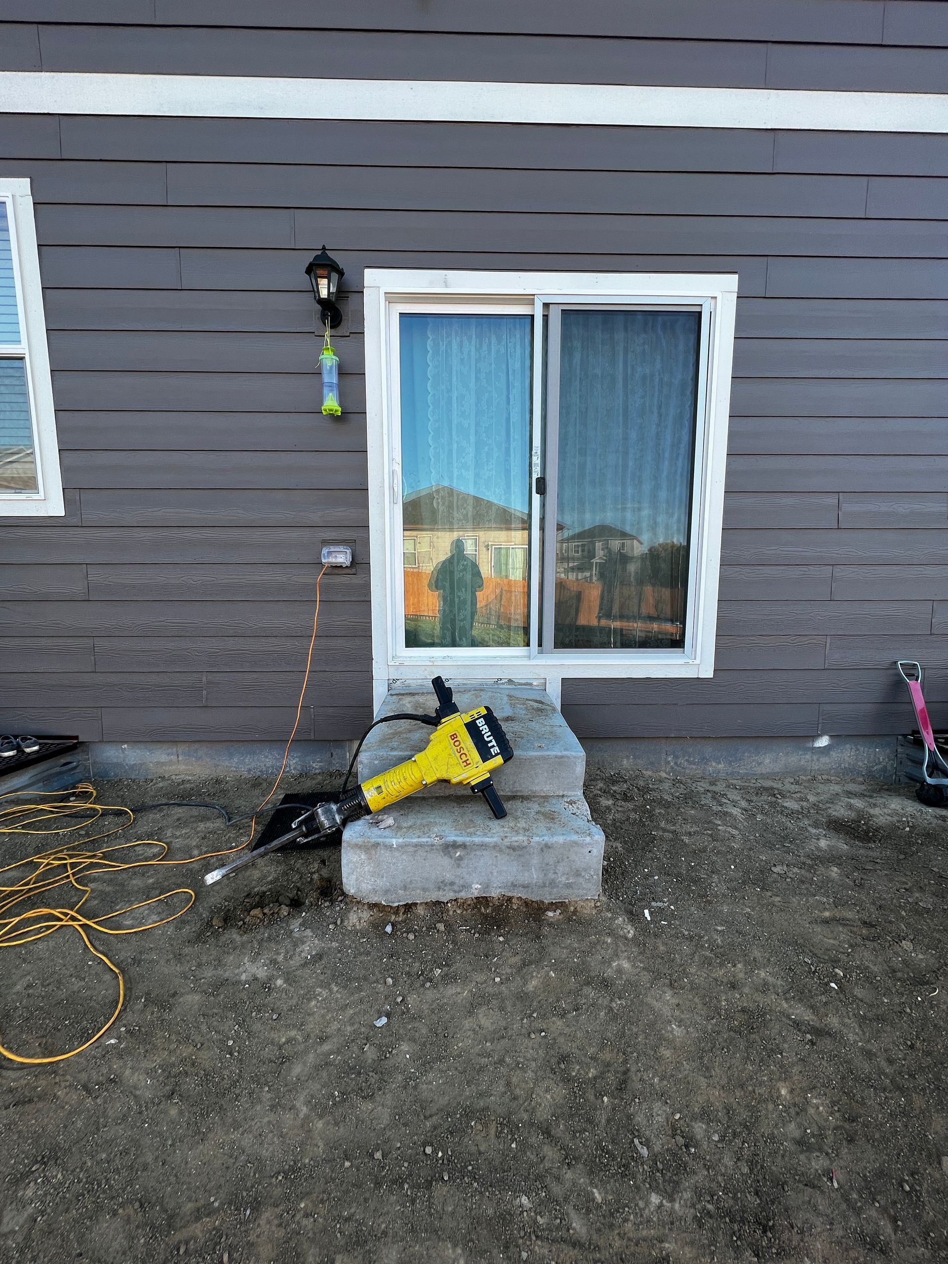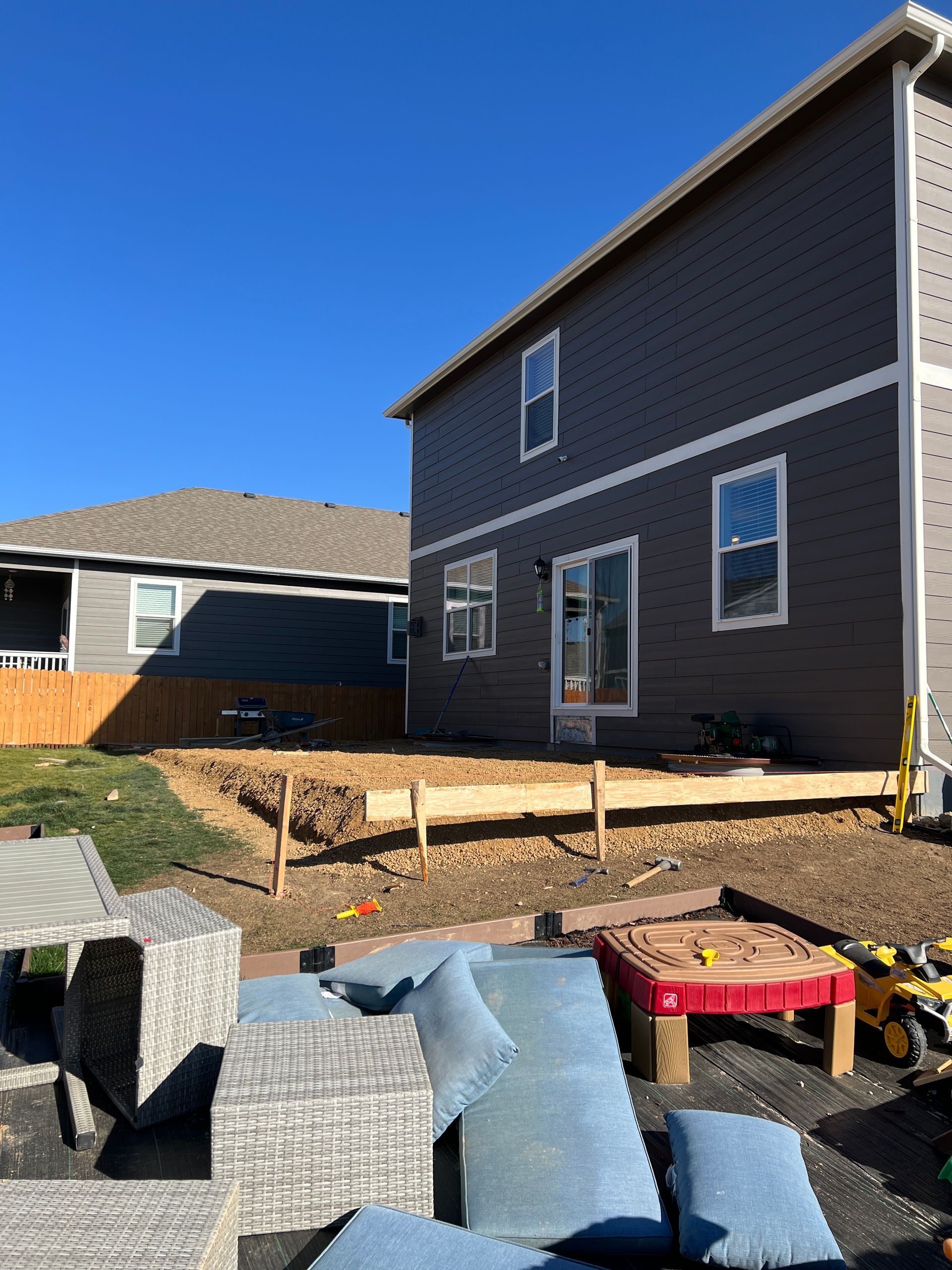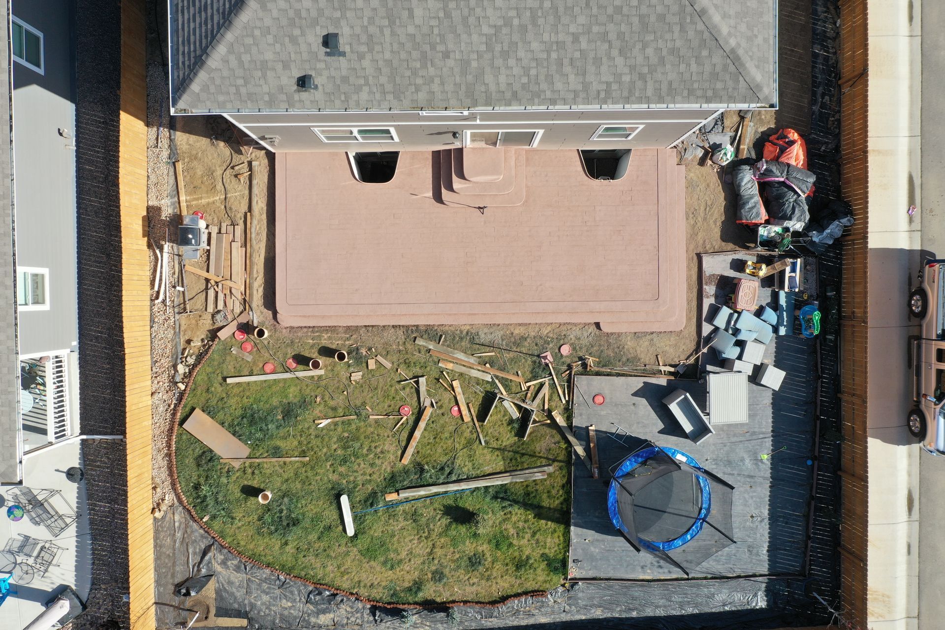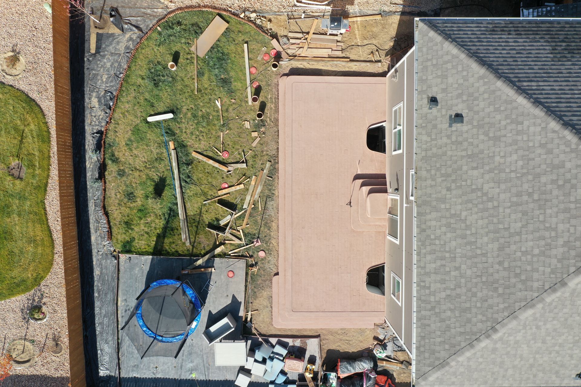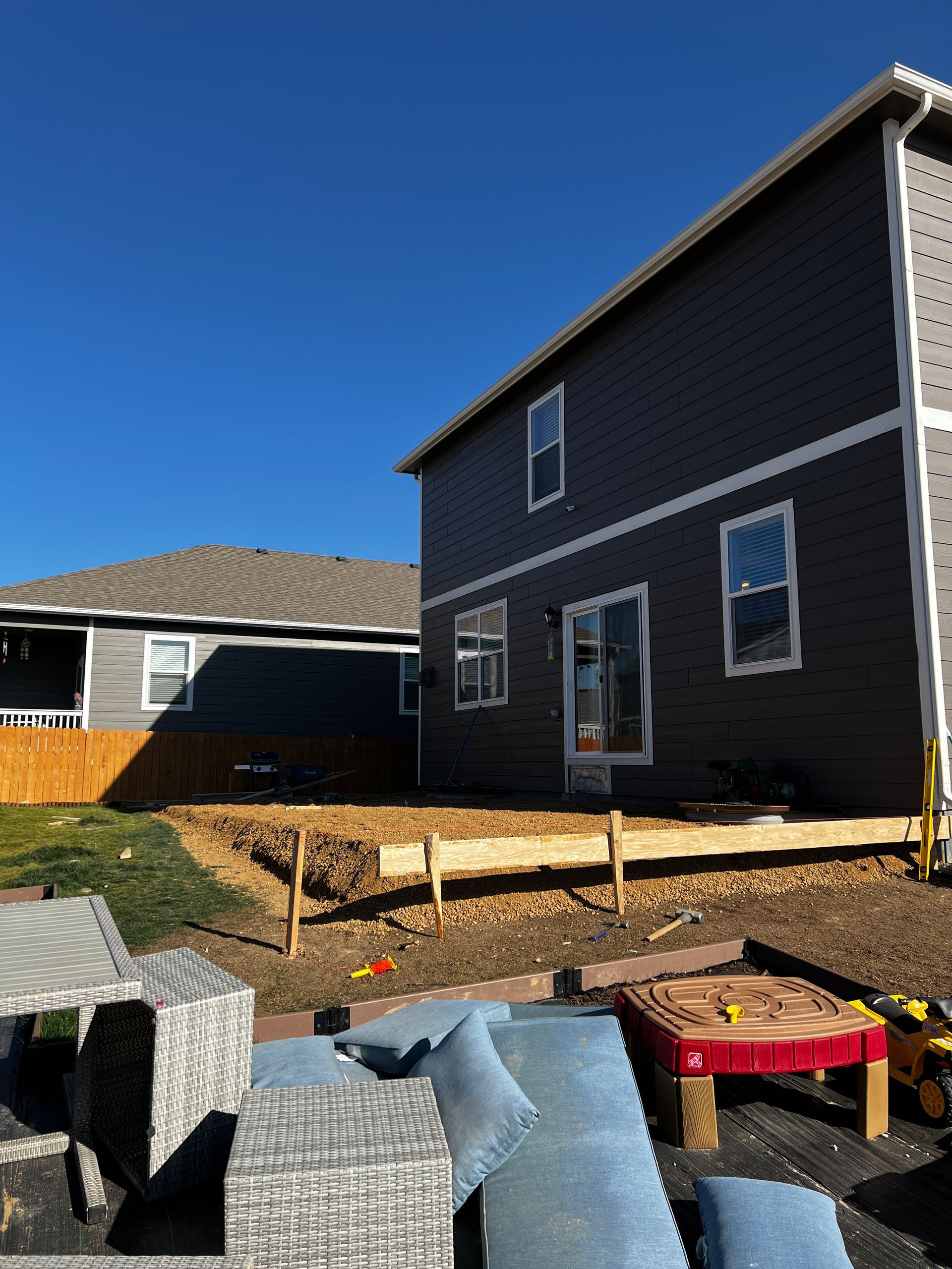 Install of new stamped concrete patio and steps. Using darker tone for wood plank stamp. Adjustment of sprinklers to account for new patio. Mead, CO 2021