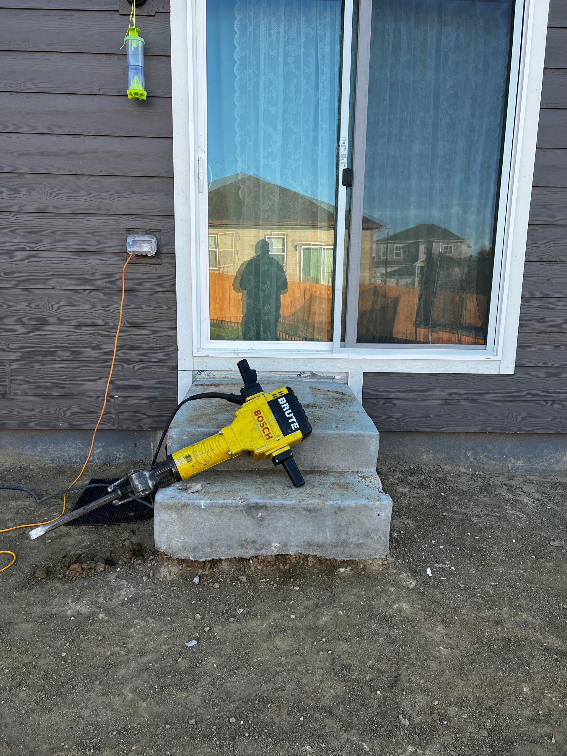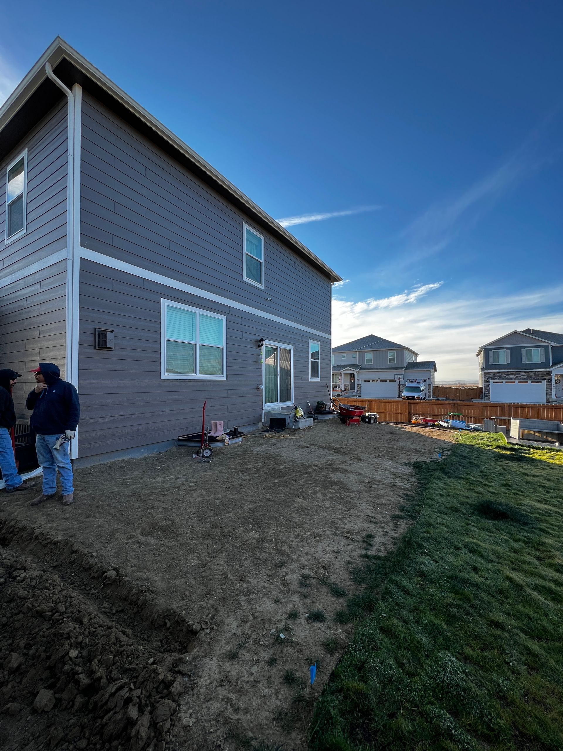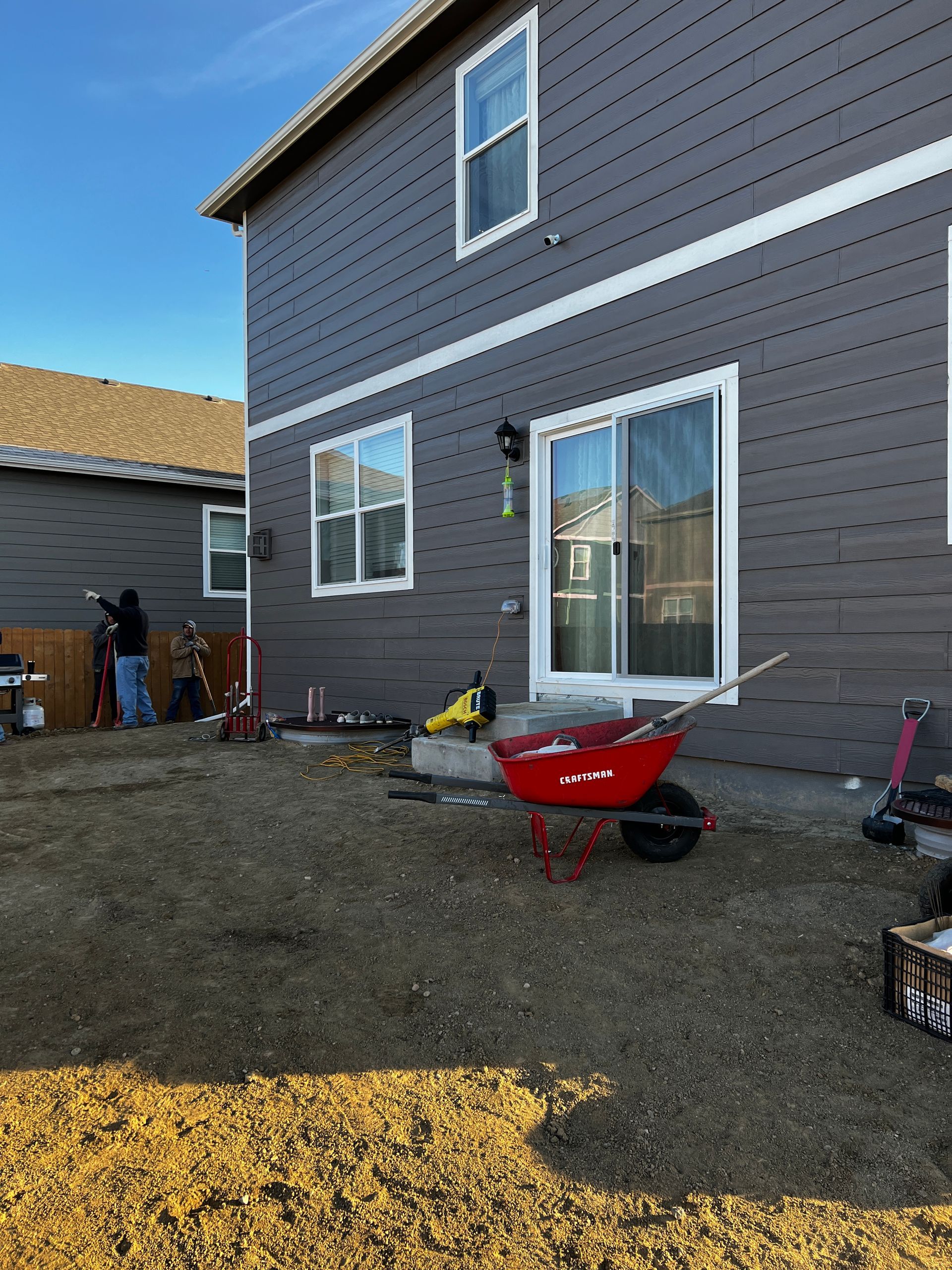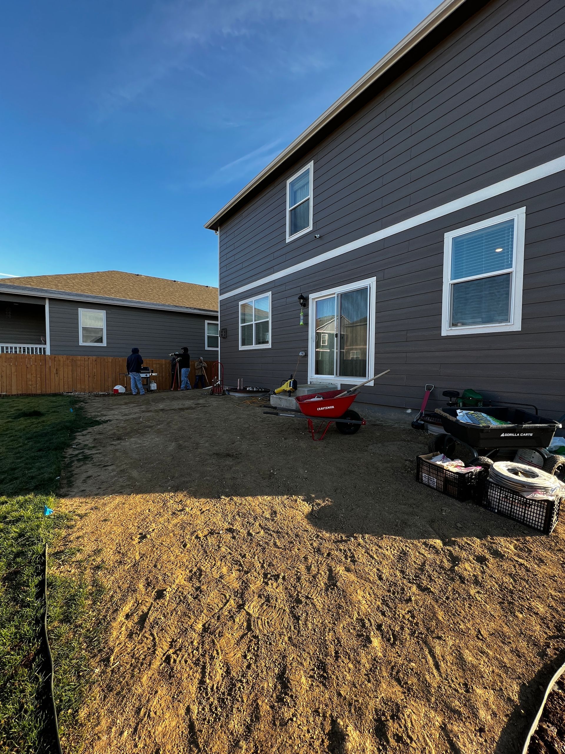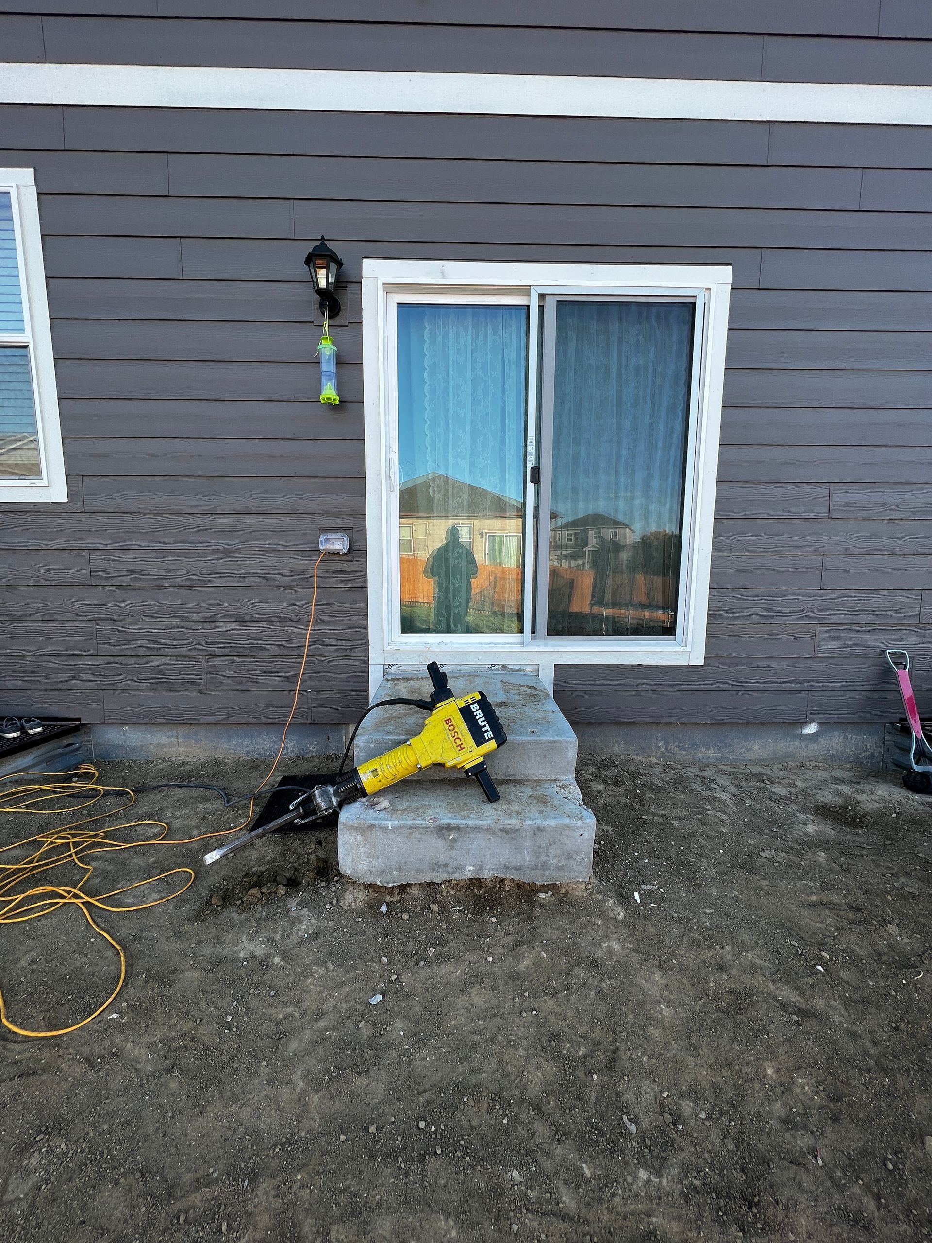 Install of new stamped concrete patio and steps. Using darker tone for wood plank stamp. Adjustment of sprinklers to account for new patio. Mead, CO 2021