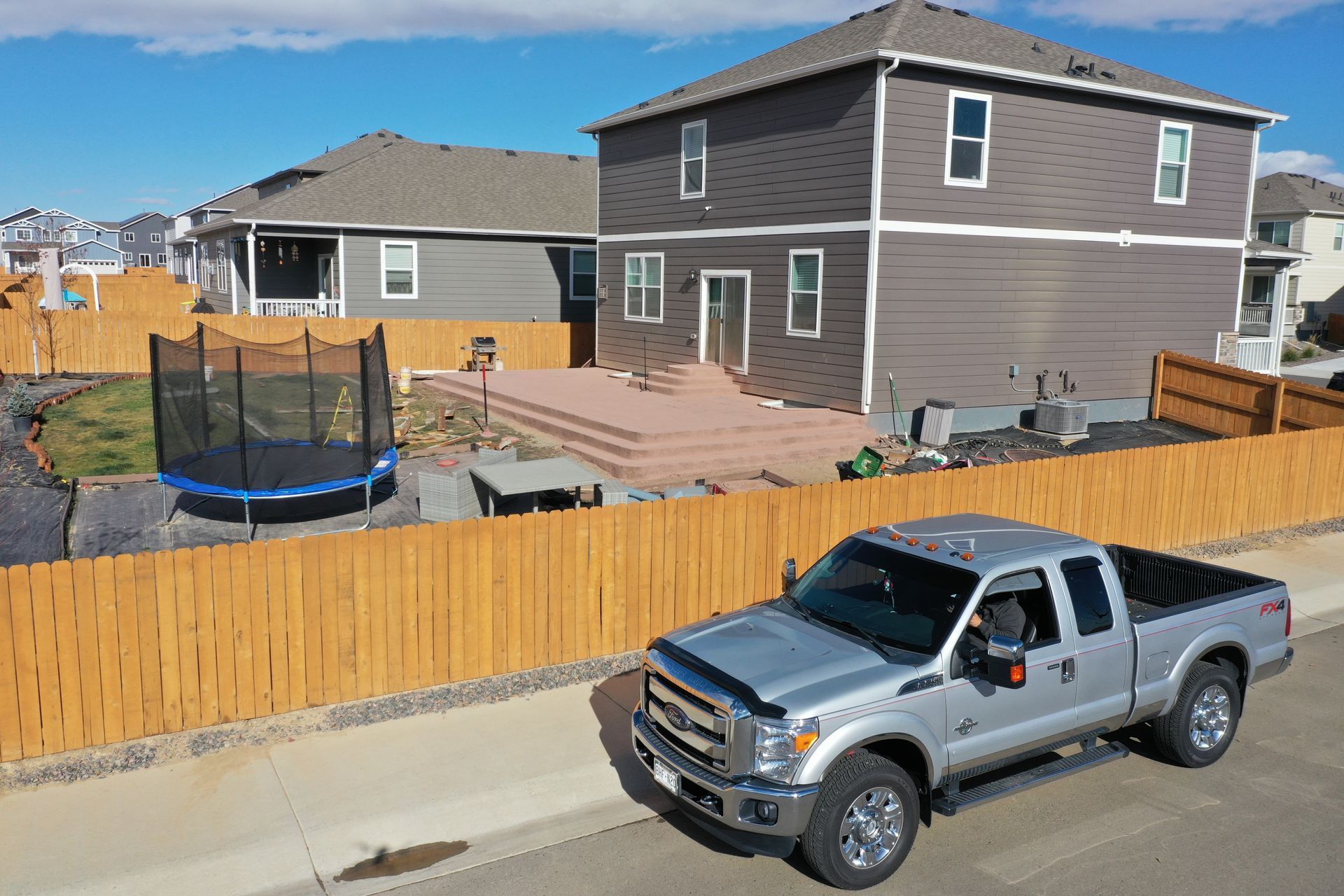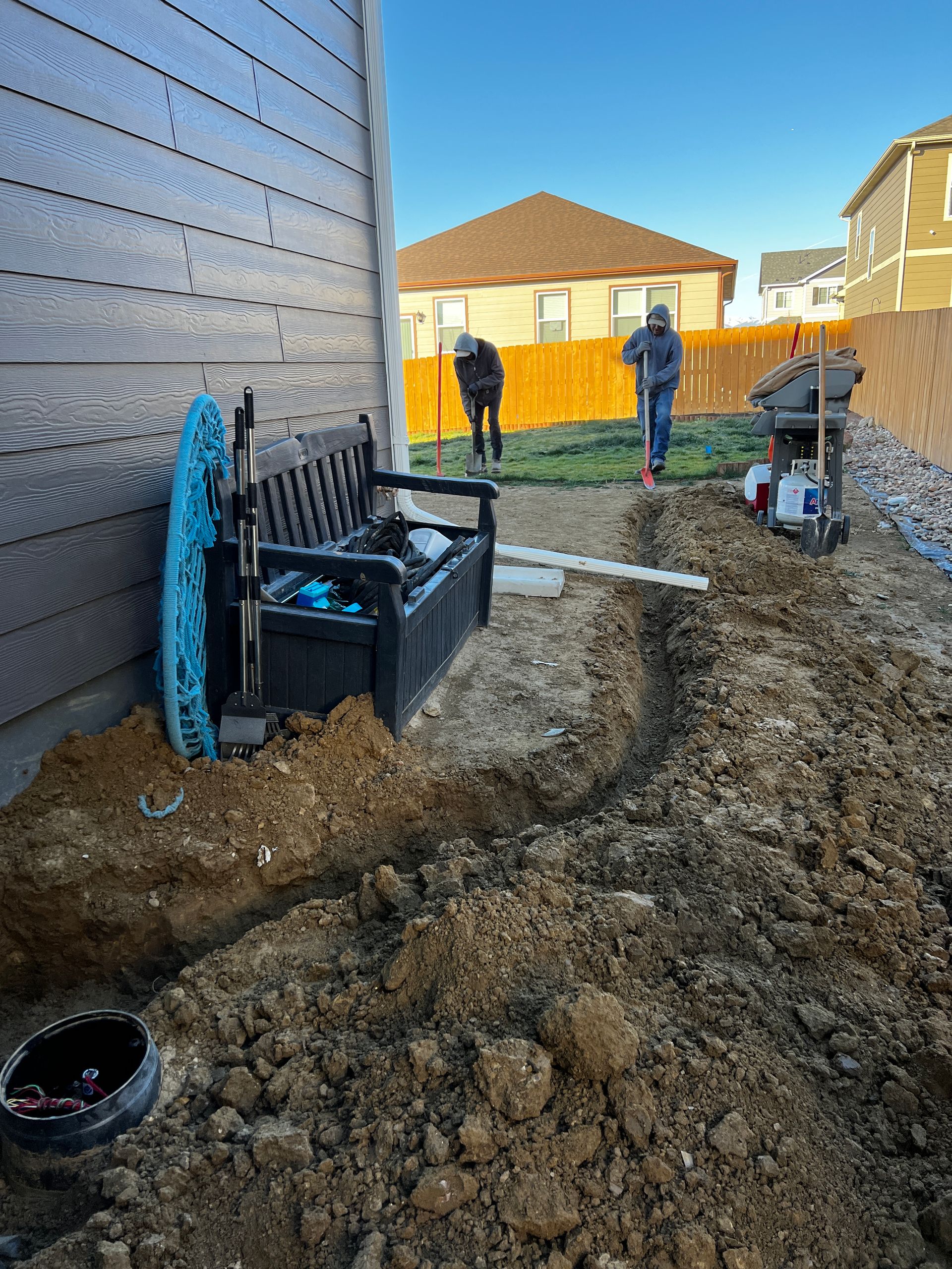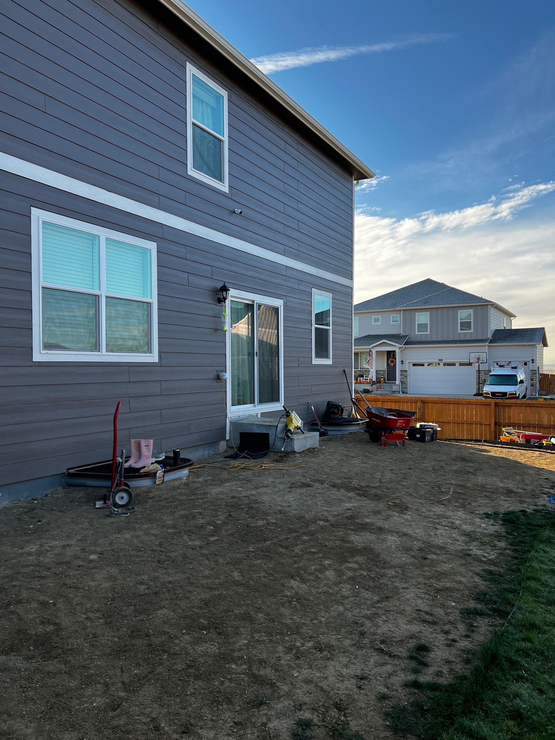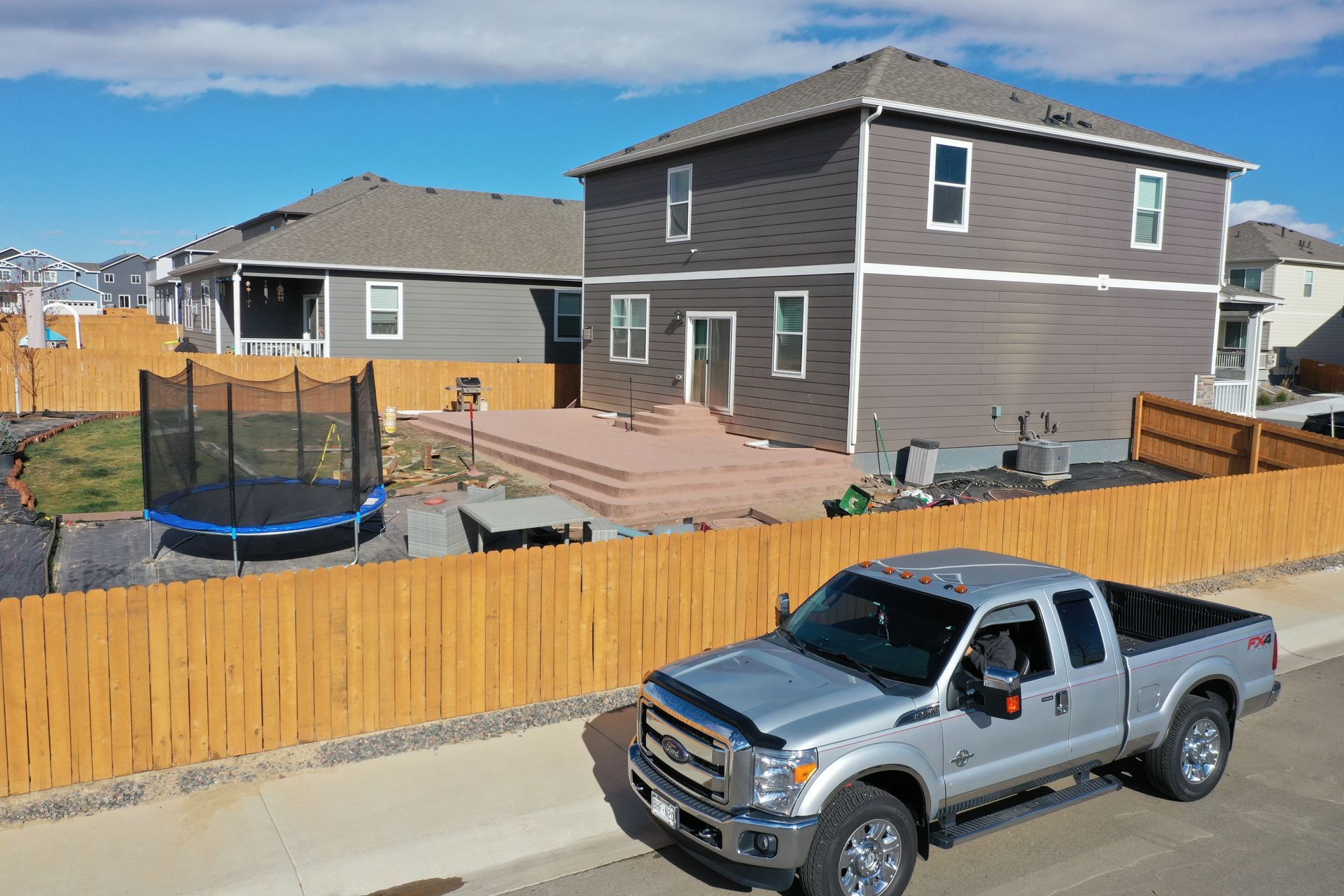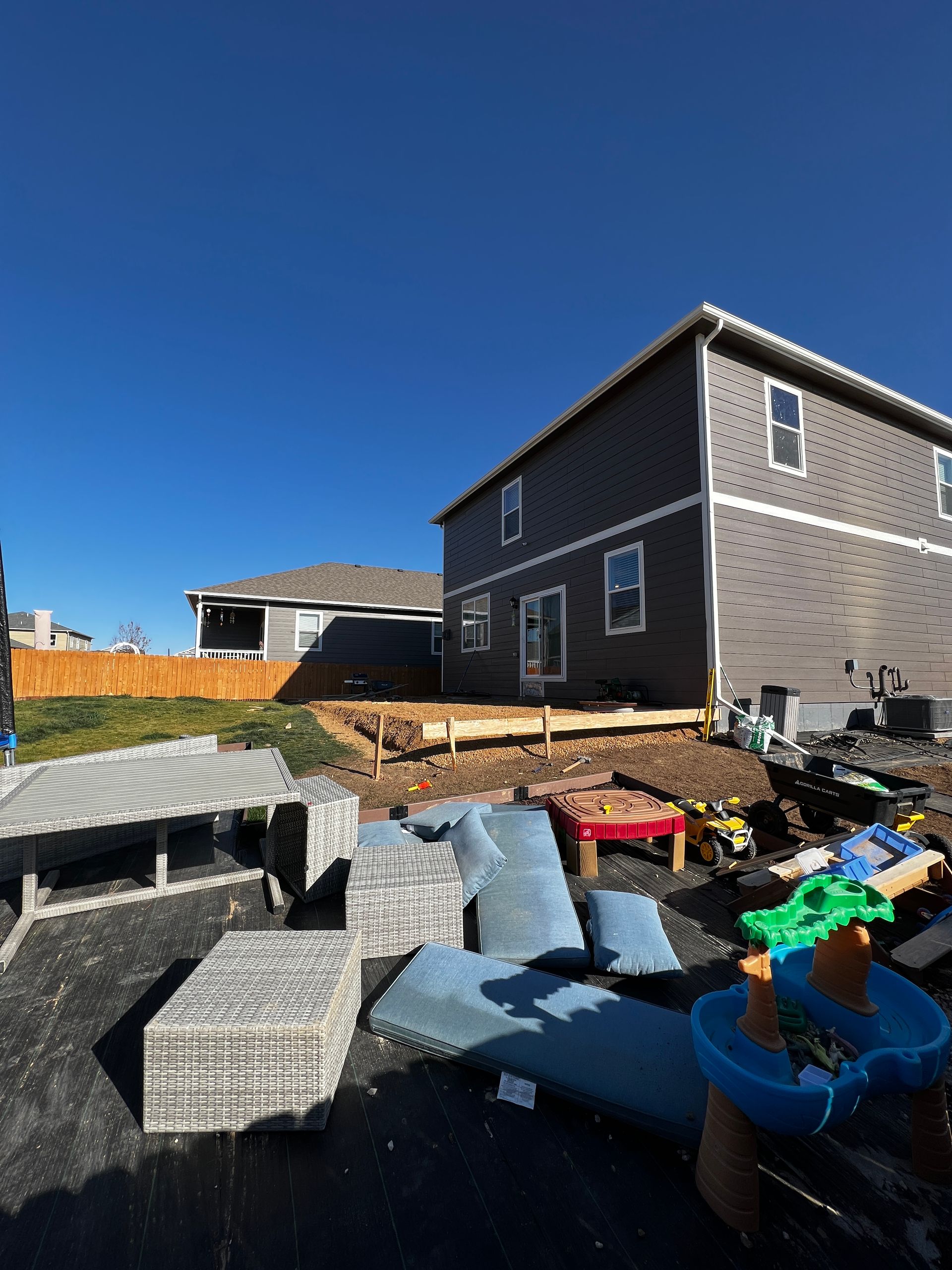 Install of new stamped concrete patio and steps. Using darker tone for wood plank stamp. Adjustment of sprinklers to account for new patio. Mead, CO 2021