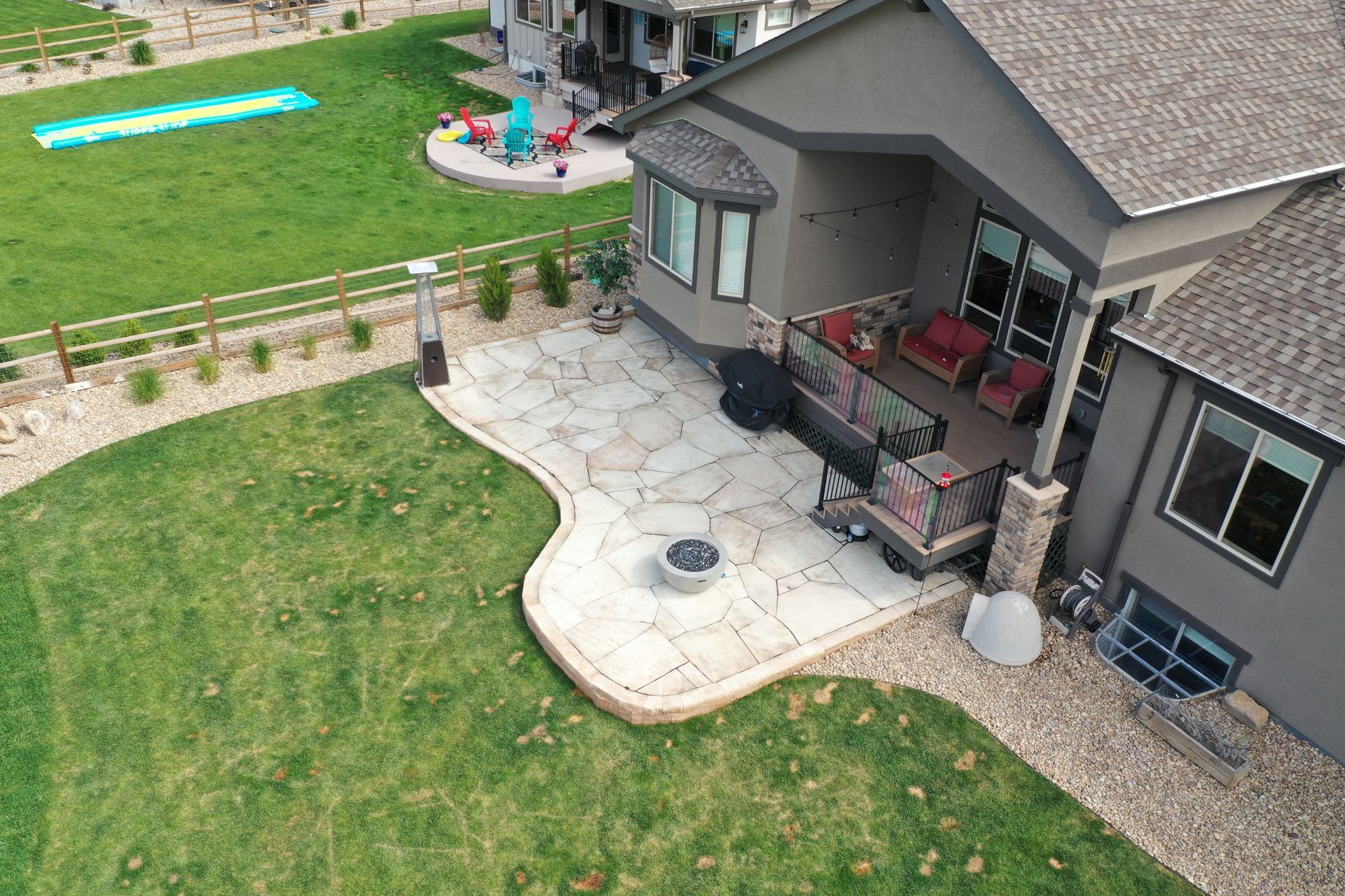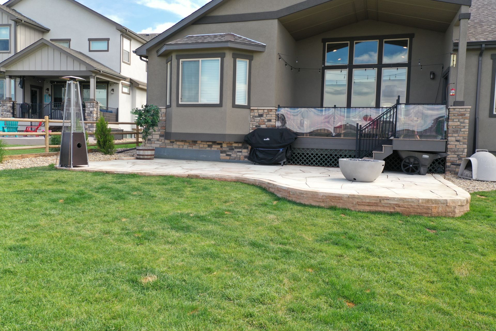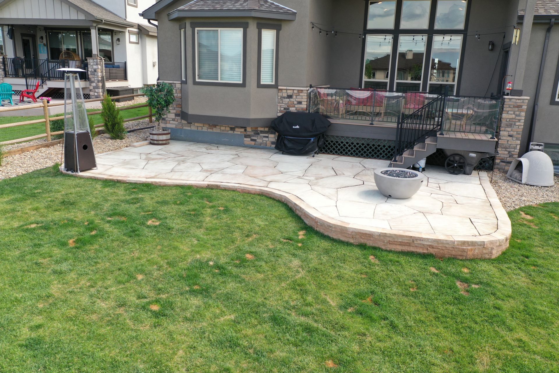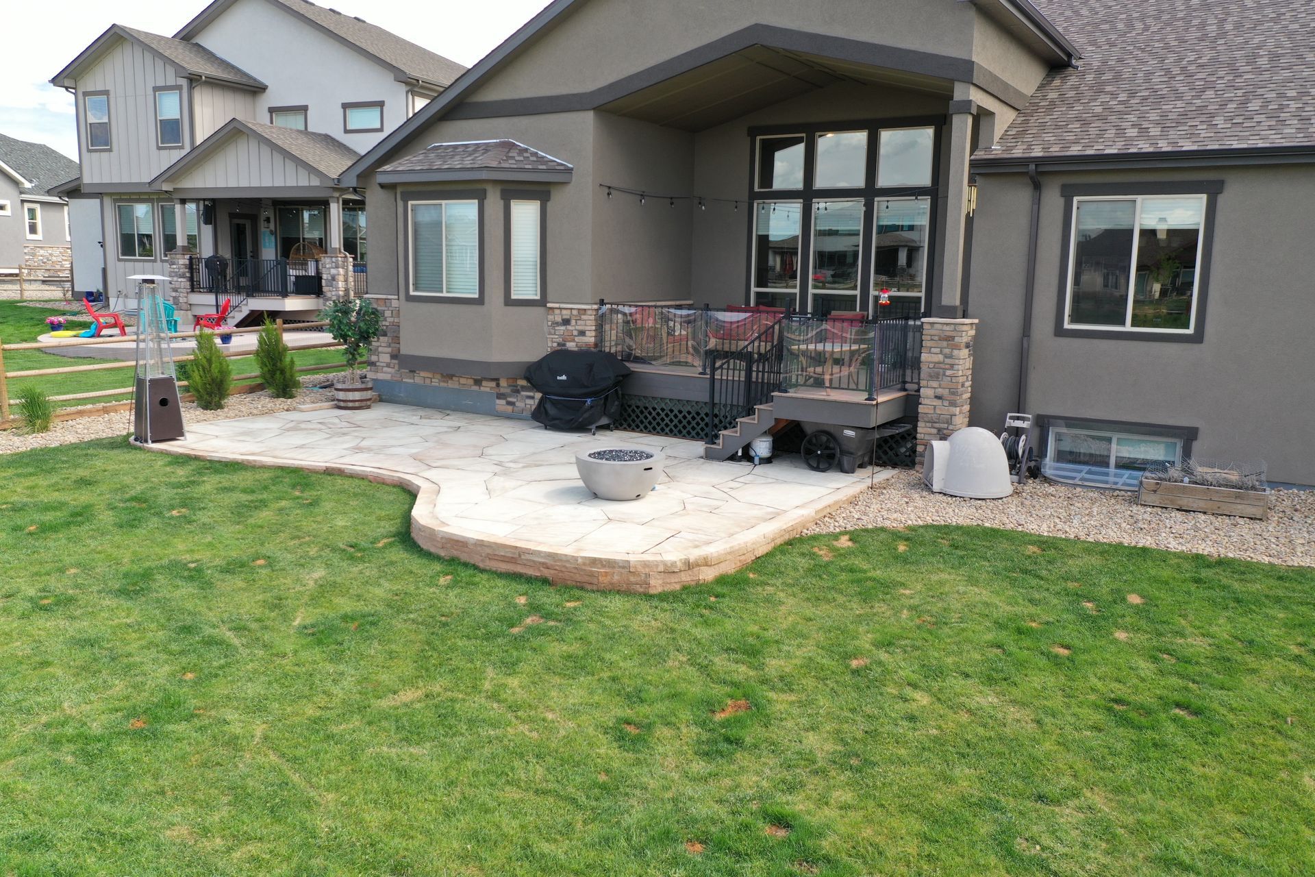 Arizona buff flagstone patio with Arizona buff strip stone dry stacked to create new gathering area at this beautiful home. Windsor, CO 2019