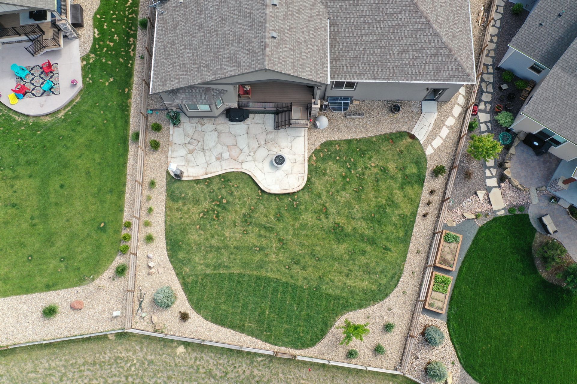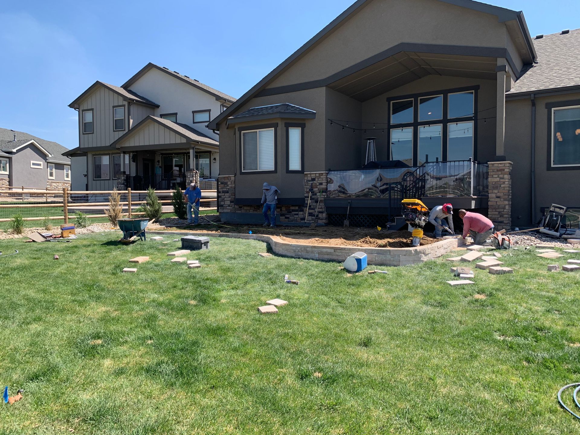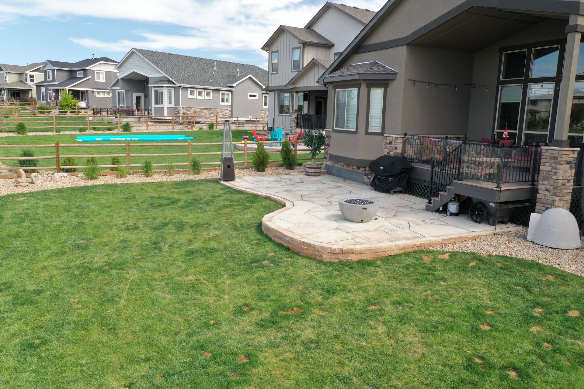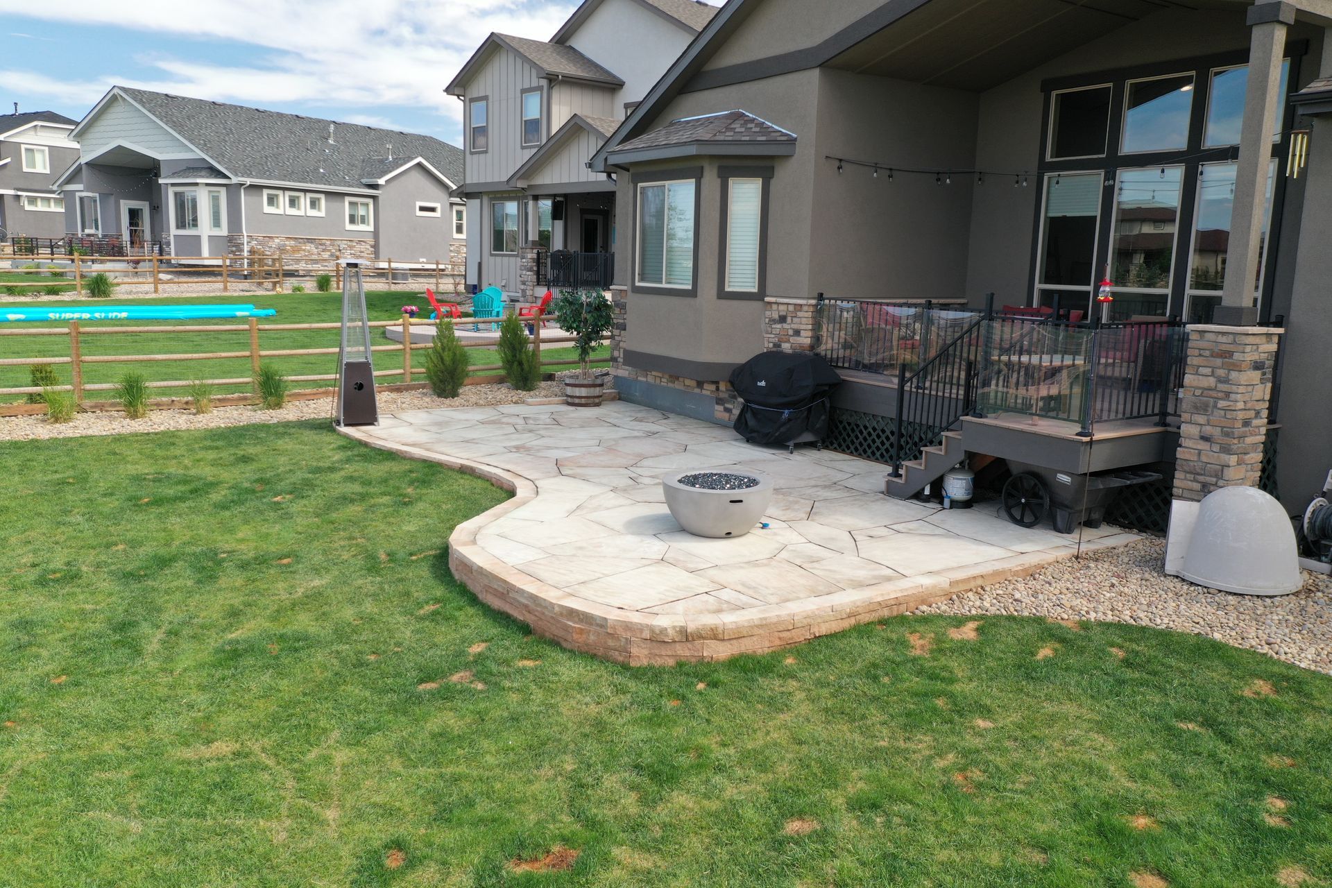 Arizona buff flagstone patio with Arizona buff strip stone dry stacked to create new gathering area at this beautiful home. Windsor, CO 2019