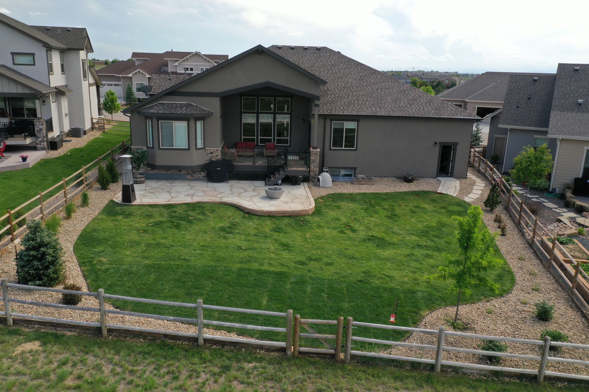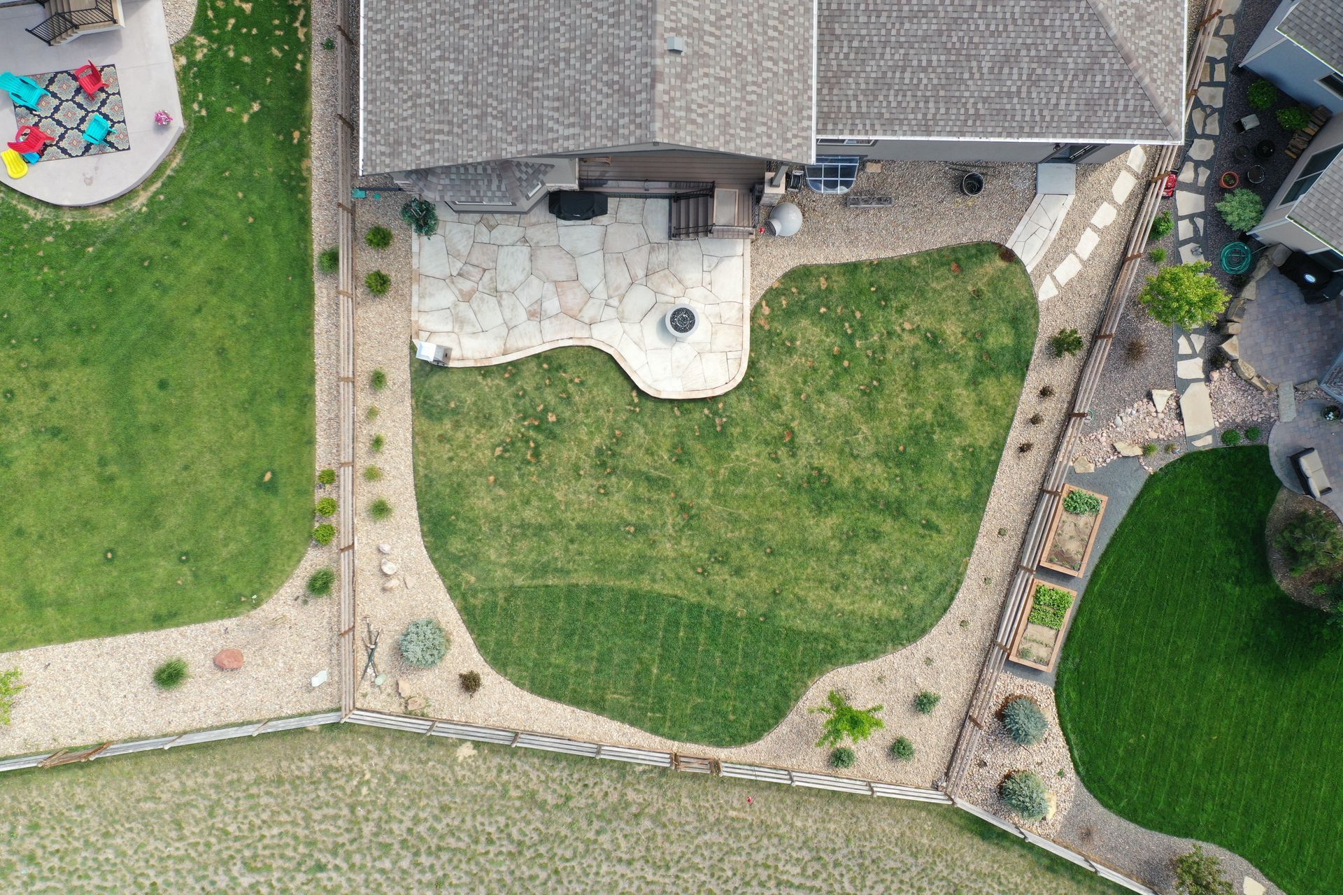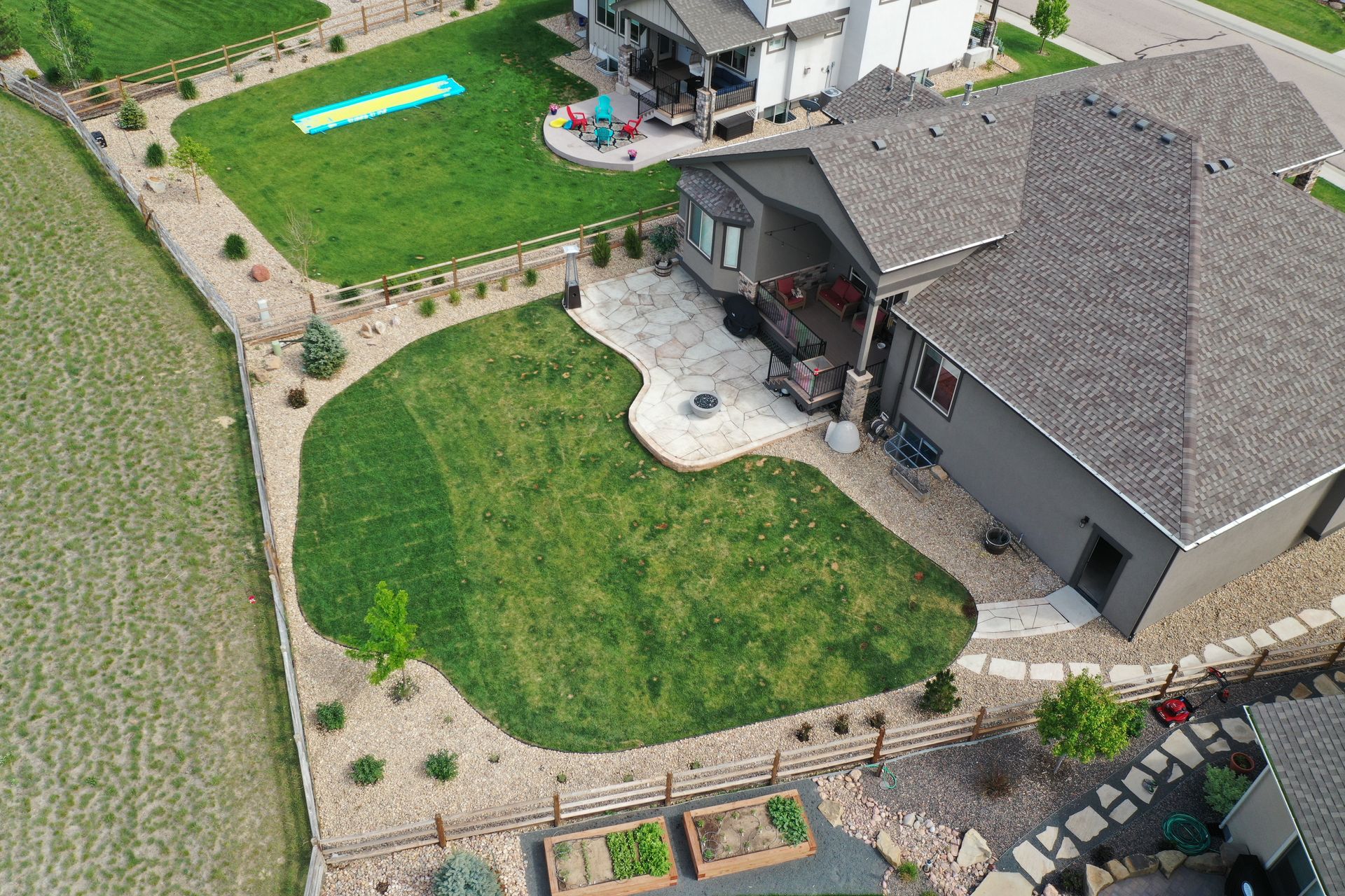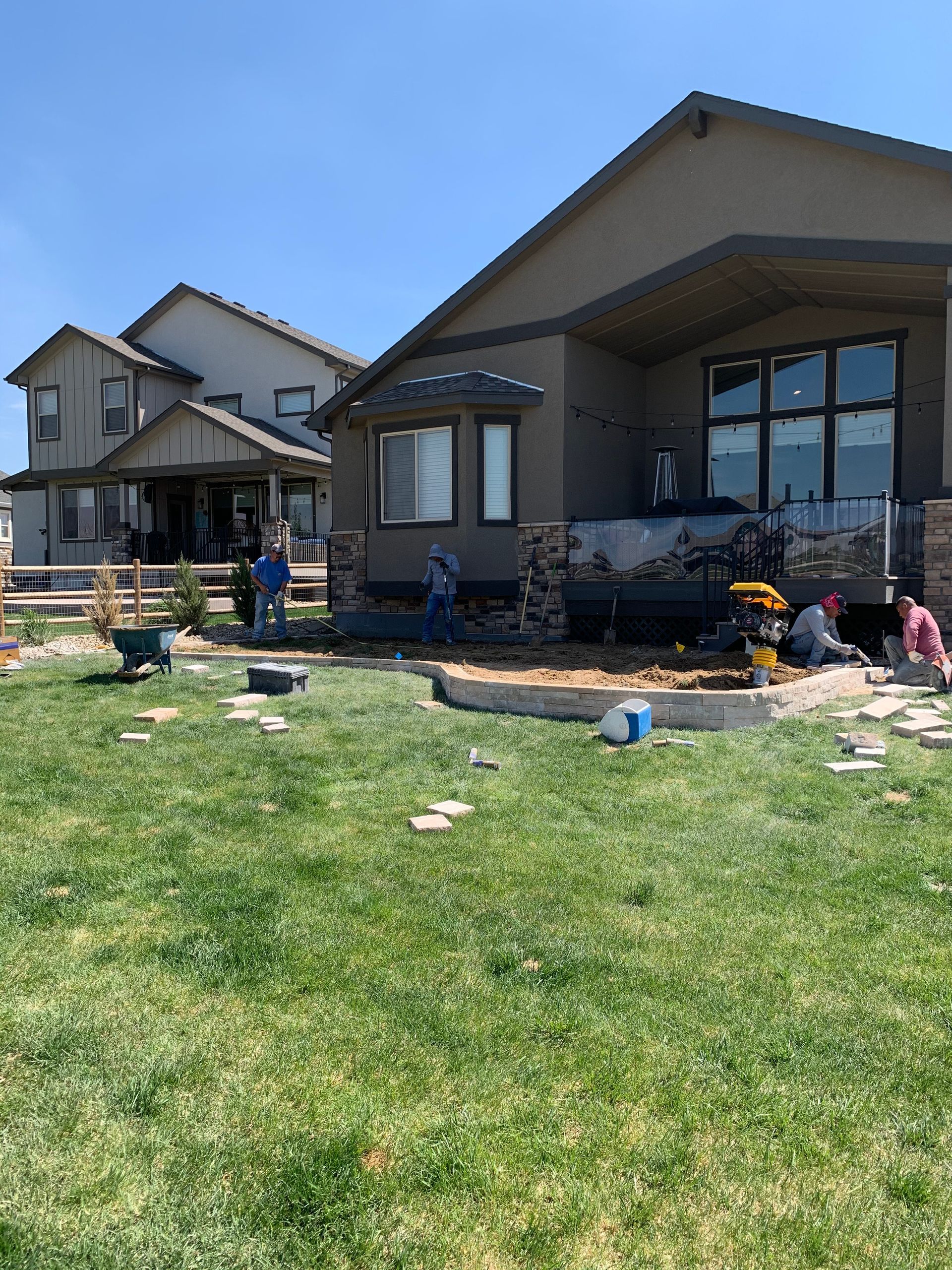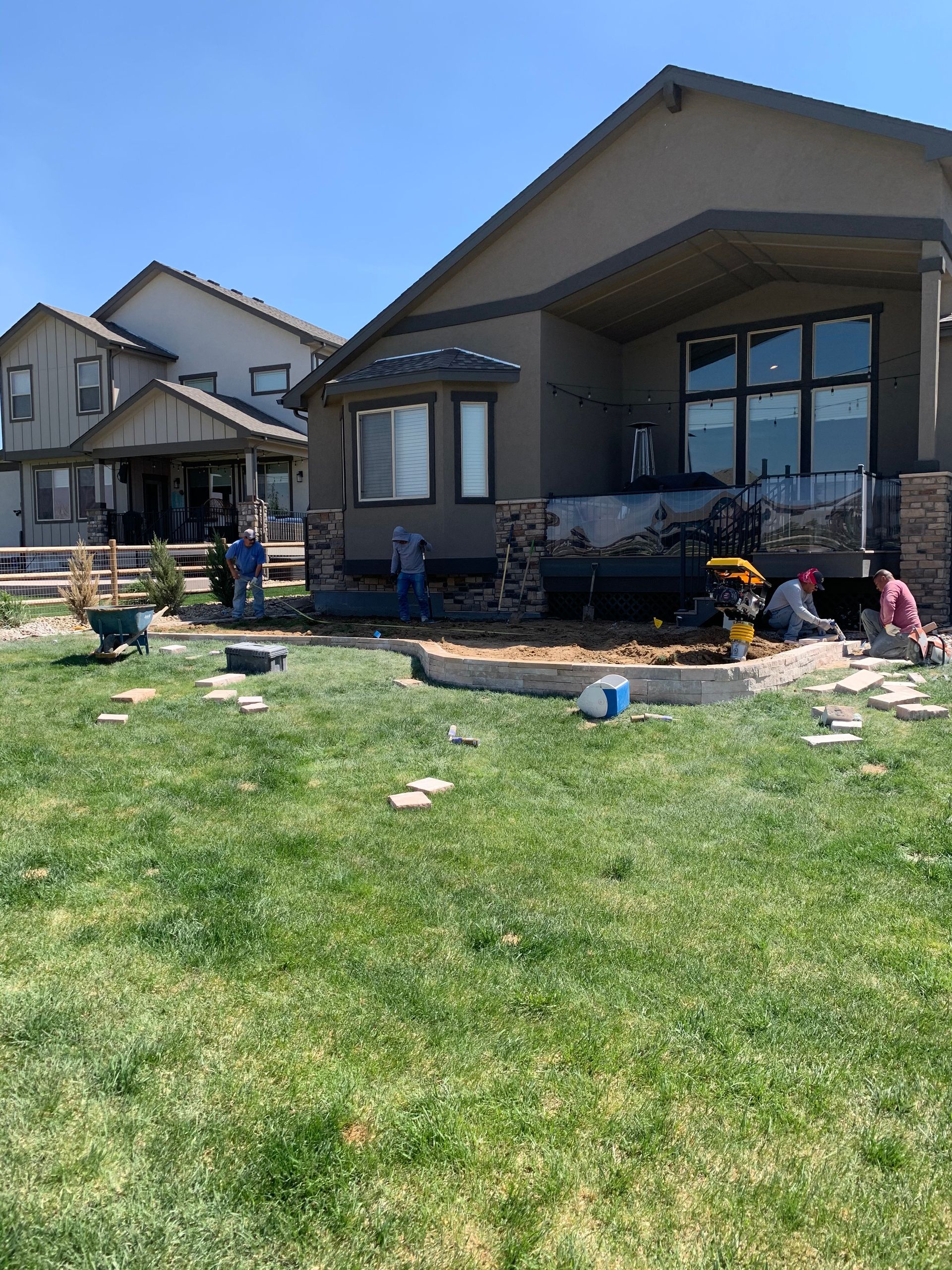 Arizona buff flagstone patio with Arizona buff strip stone dry stacked to create new gathering area at this beautiful home. Windsor, CO 2019