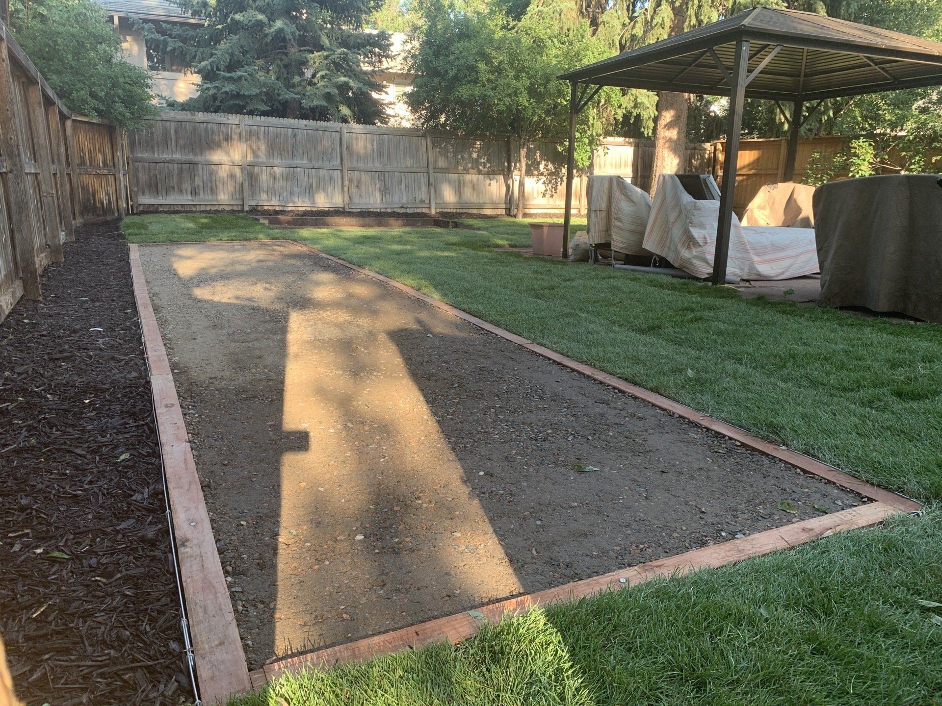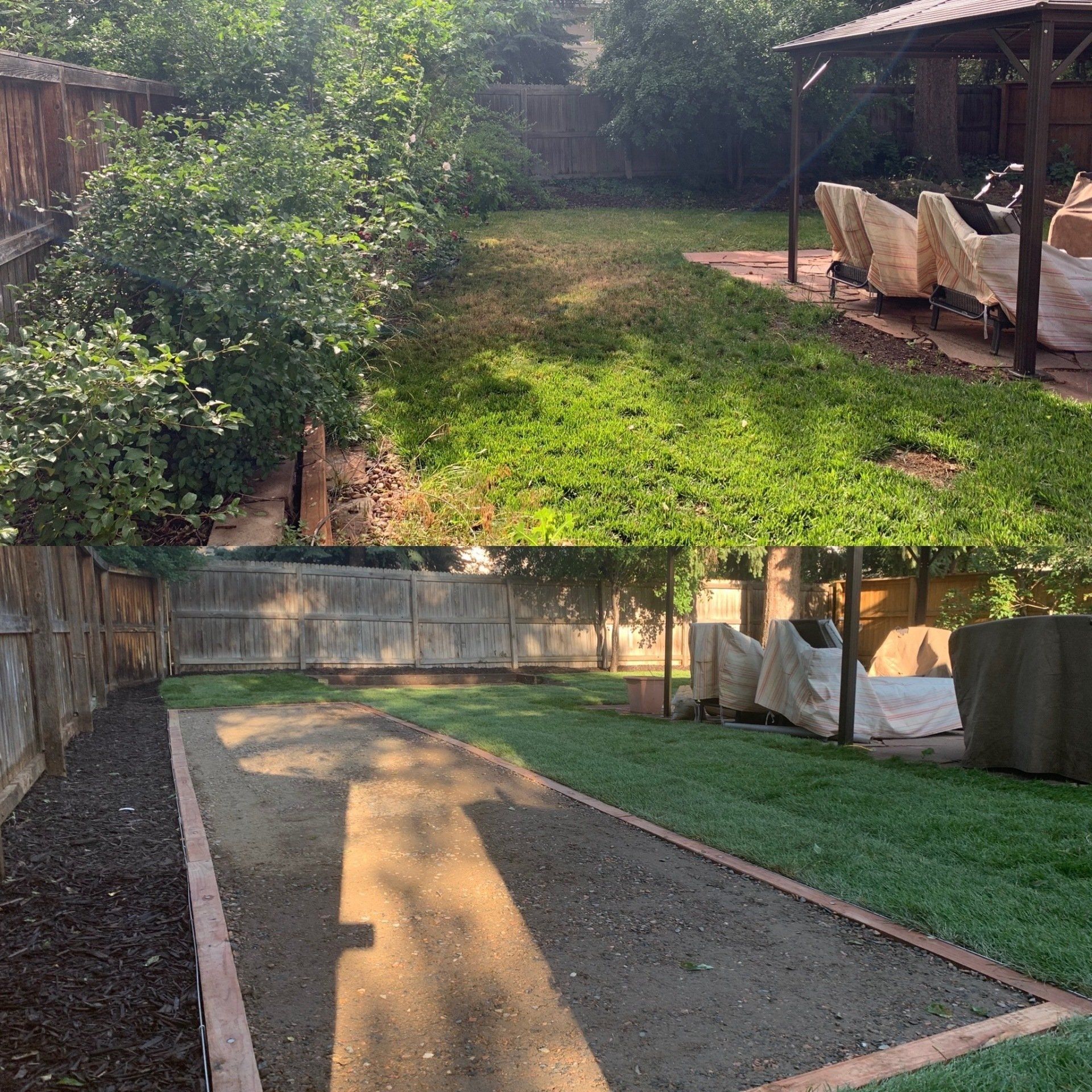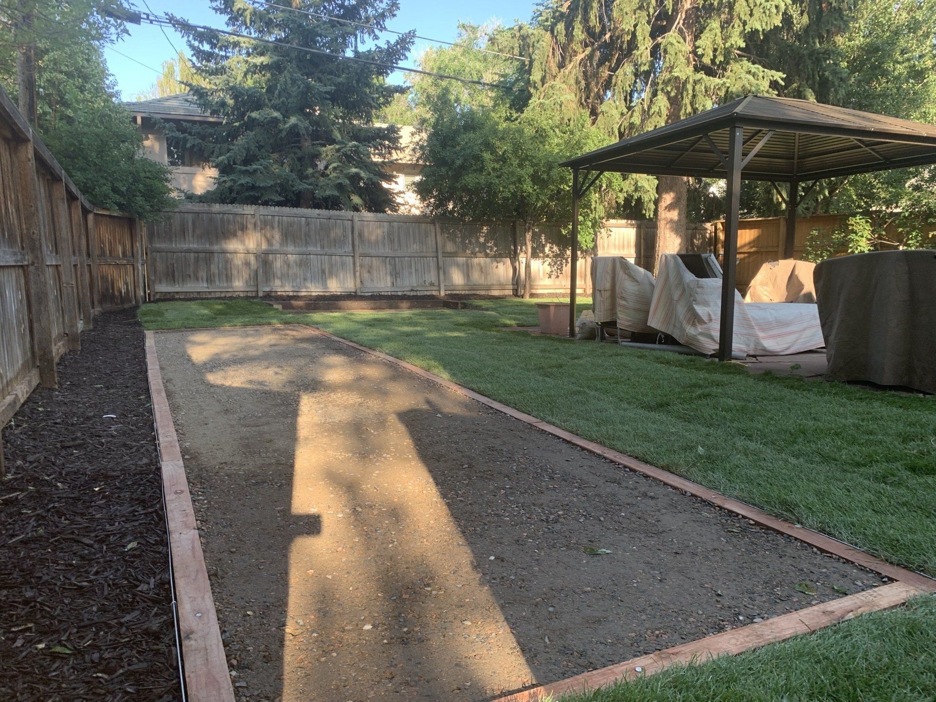 Existing mixture of grass and weeds removed to allow for new high quality grass to be added. Beautiful changes that make it a joy to sit around nature and play some bocce ball.