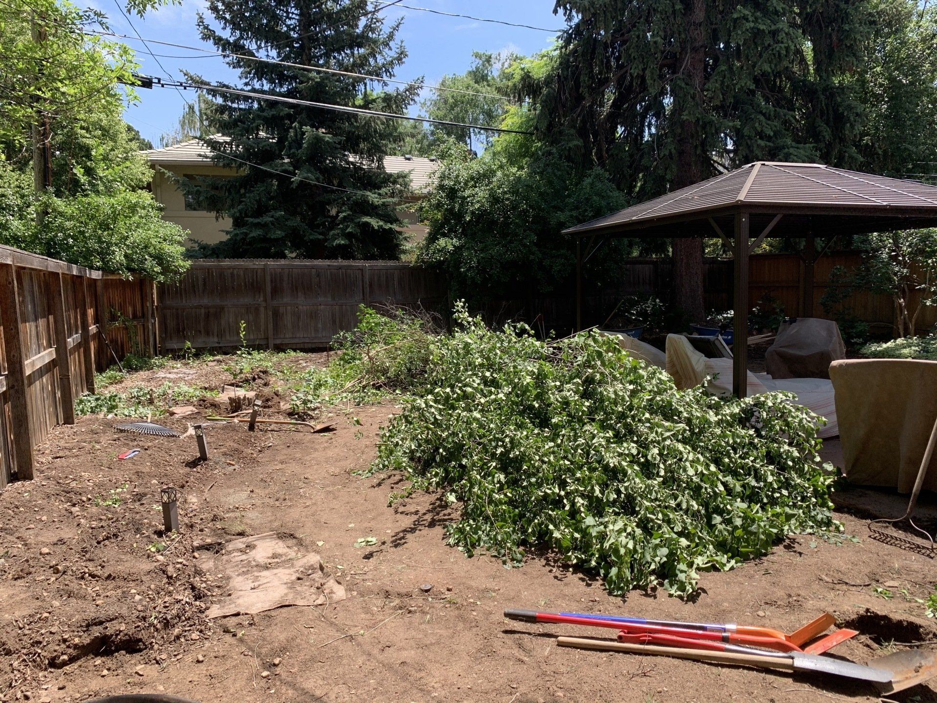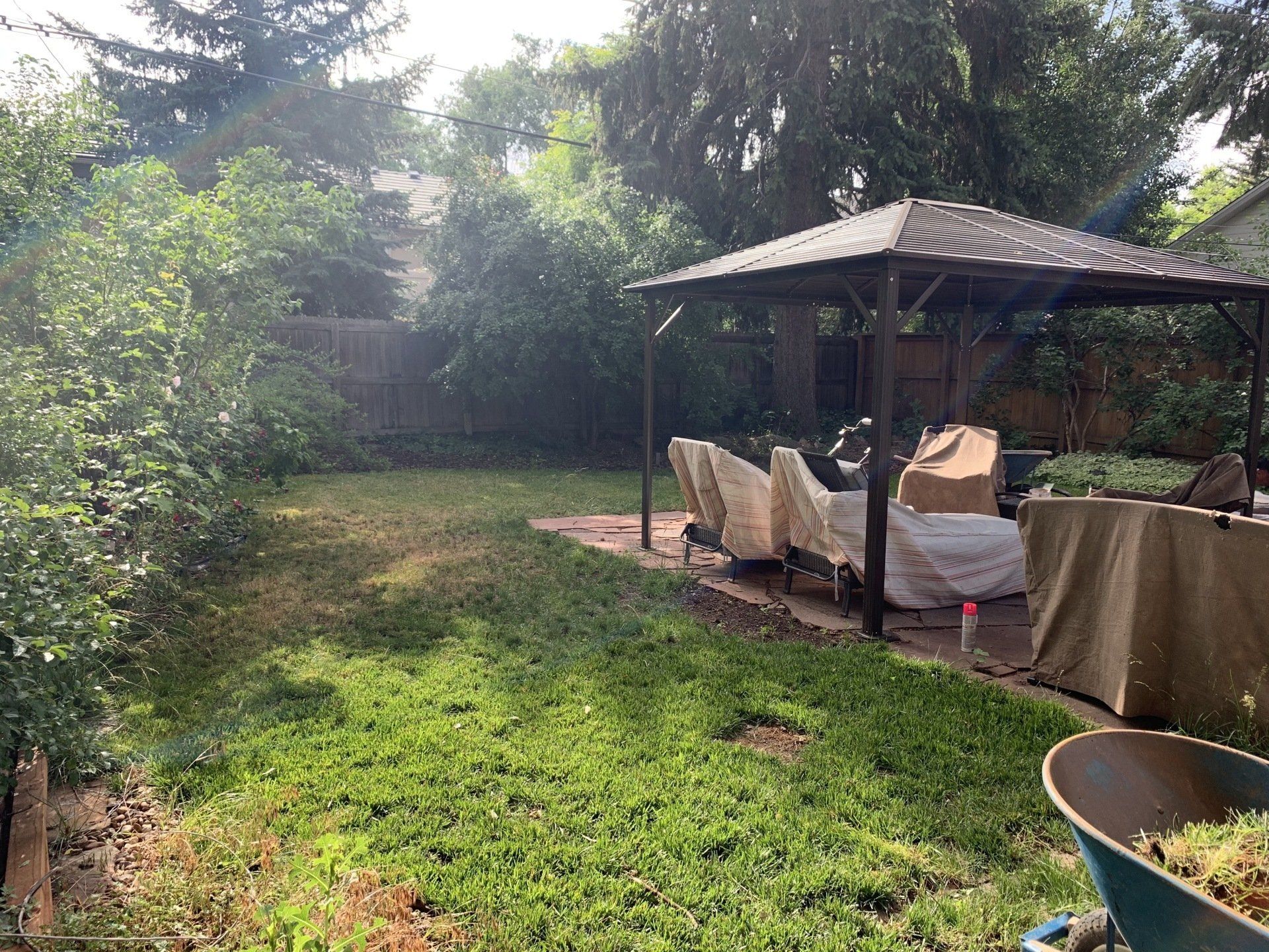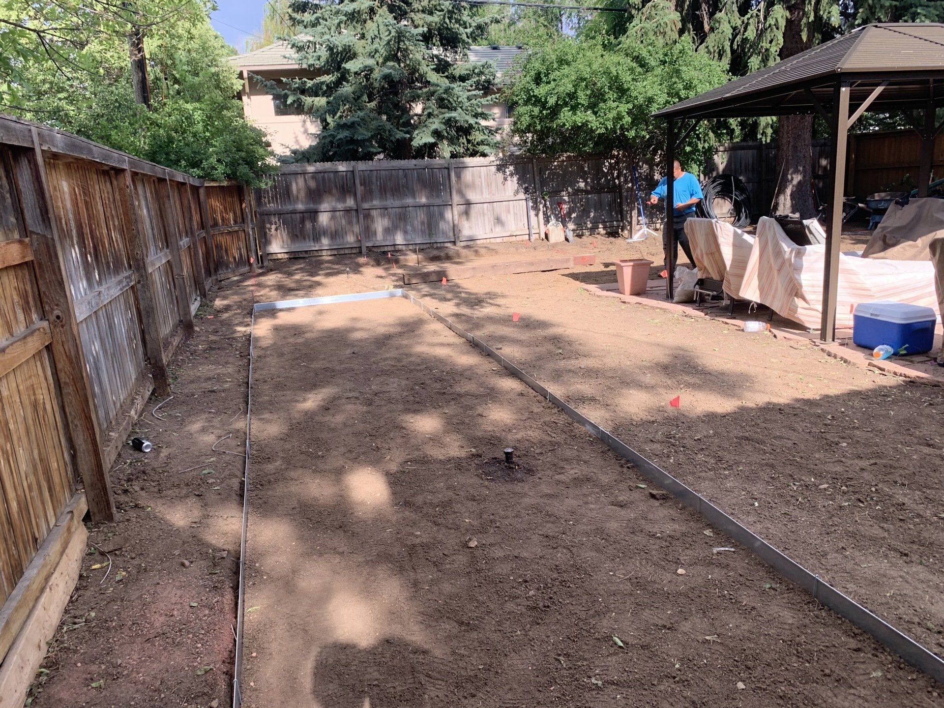 Existing mixture of grass and weeds removed to allow for new high quality grass to be added. Beautiful changes that make it a joy to sit around nature and play some bocce ball.