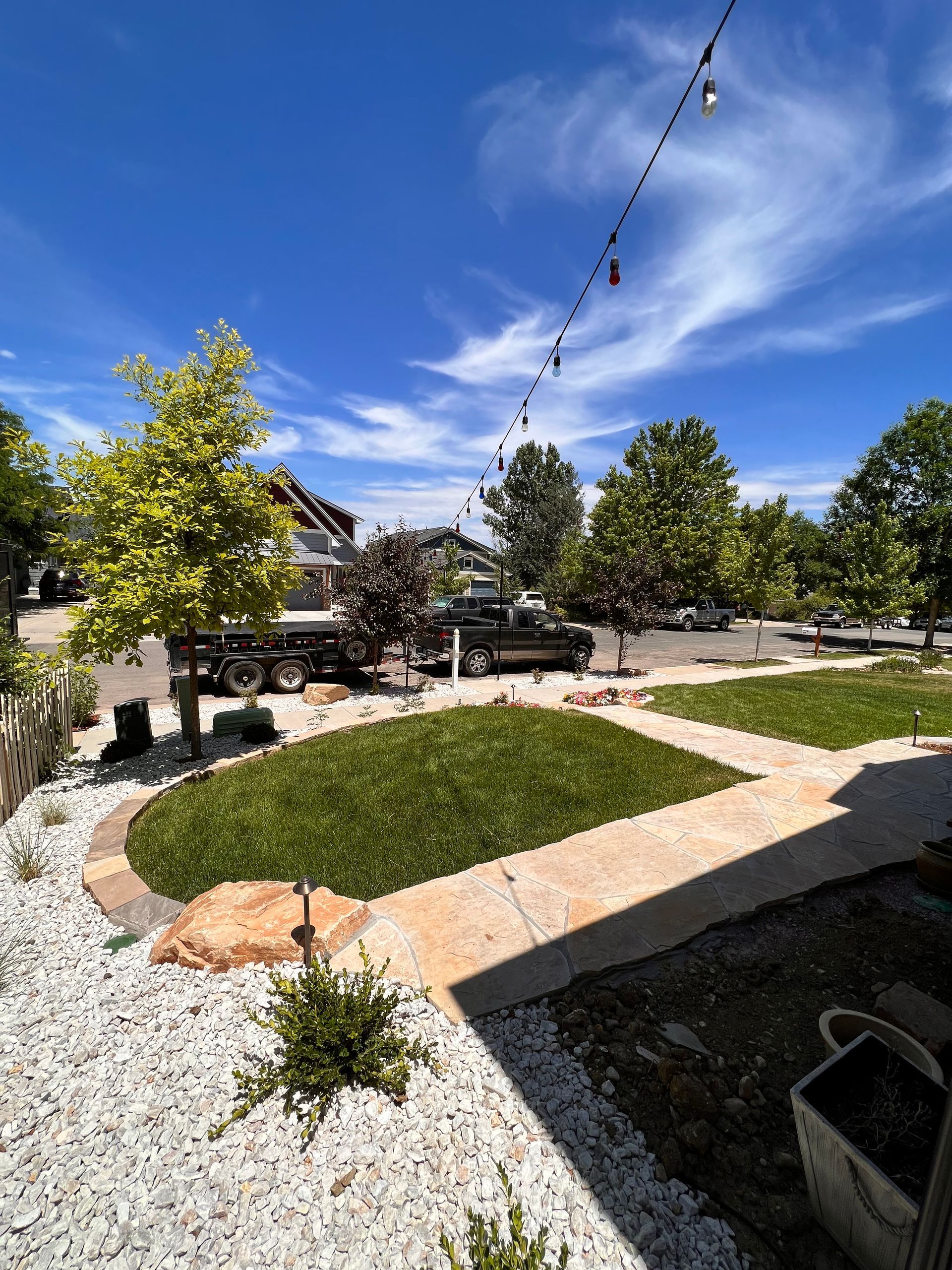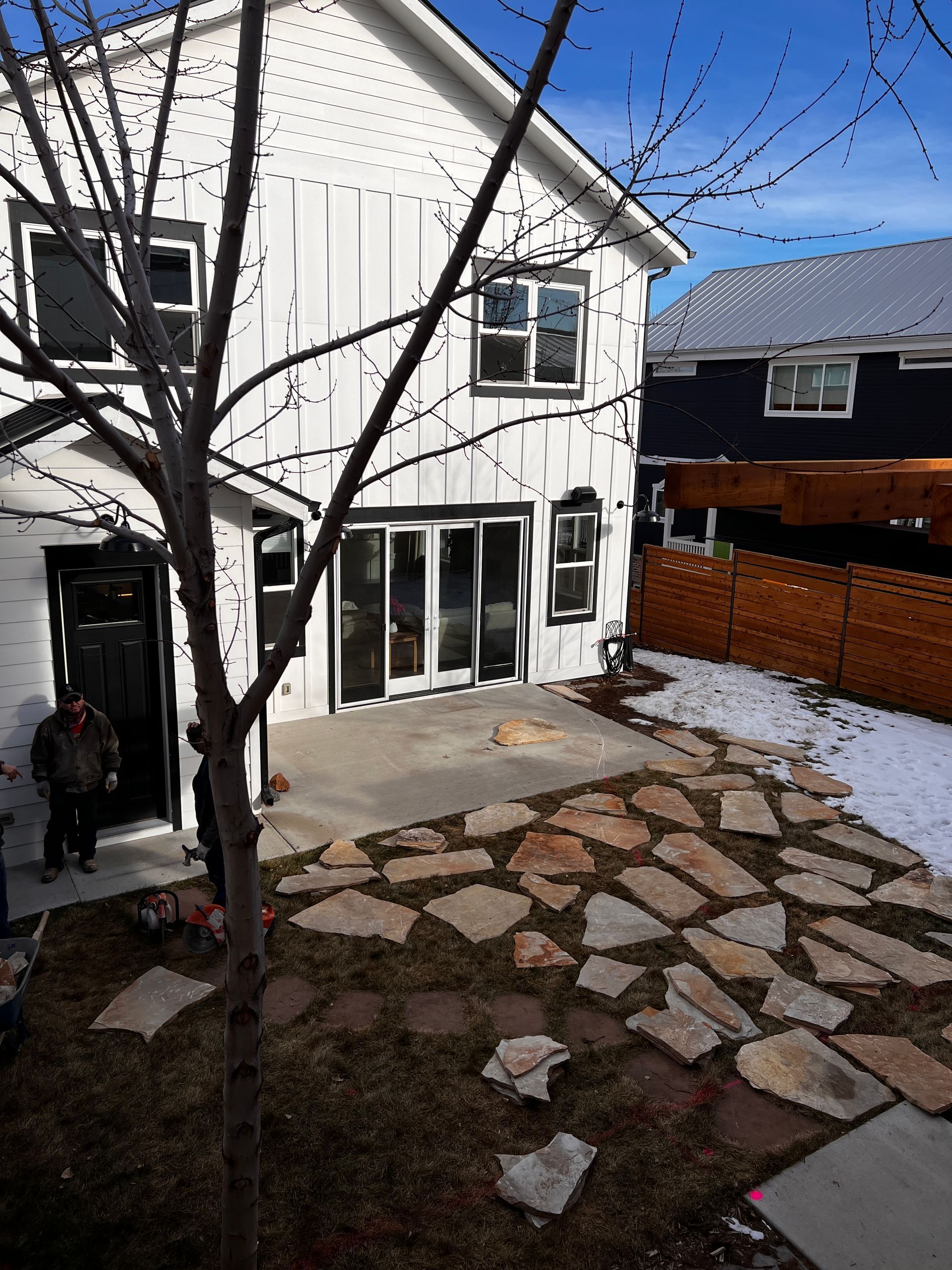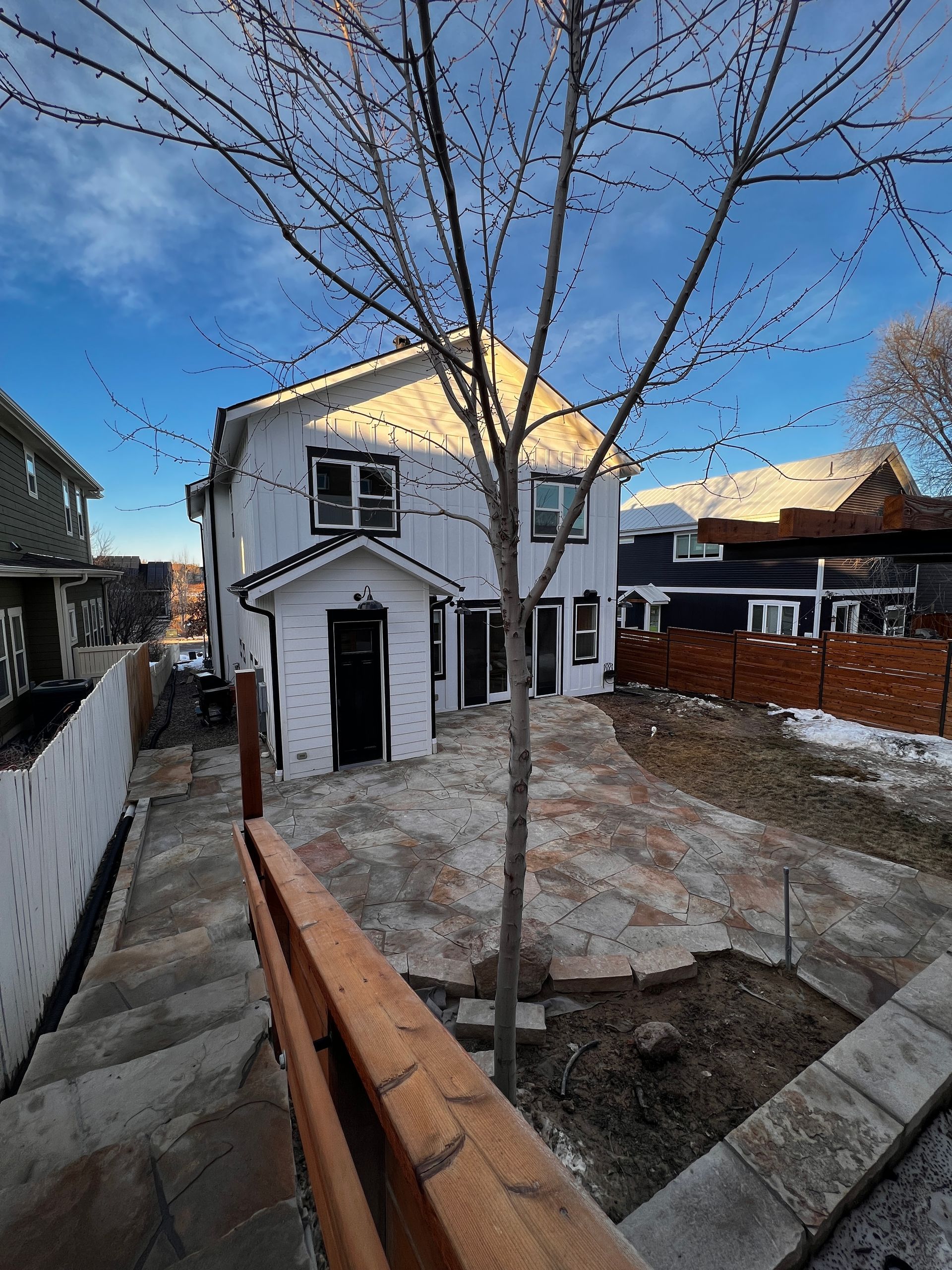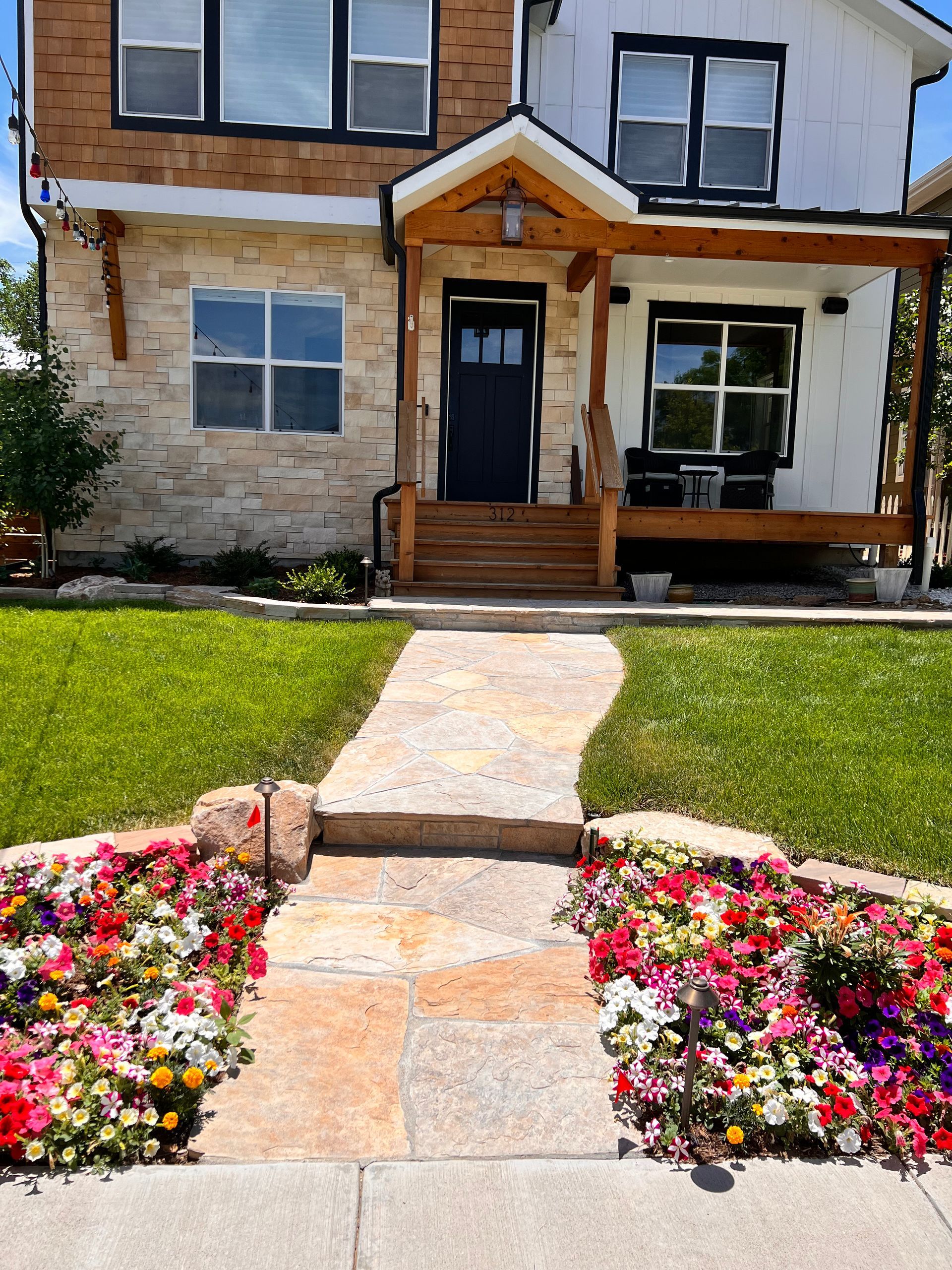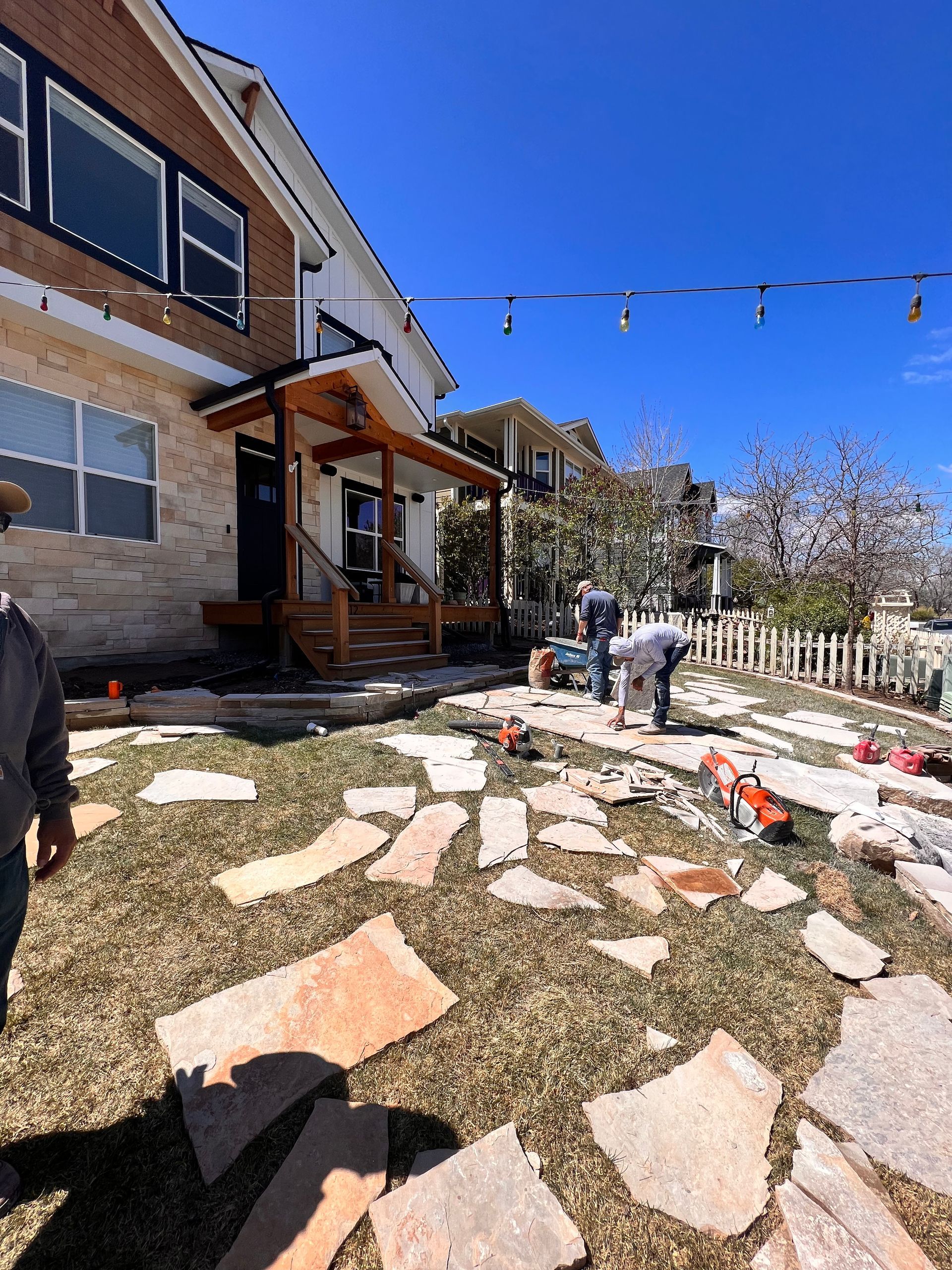 Full remodel of front and back yard building on home design. New Colorado buff flagstone and stripstone, plants, trees, sprinklers, and grass. Lafayette, CO 2019-2022