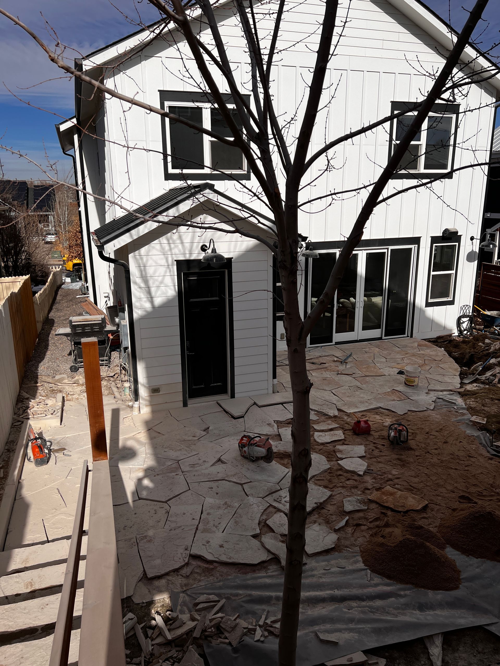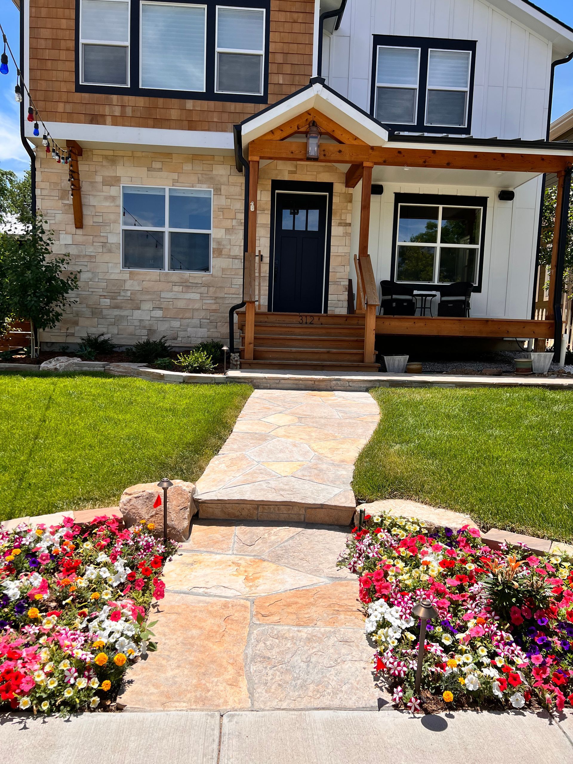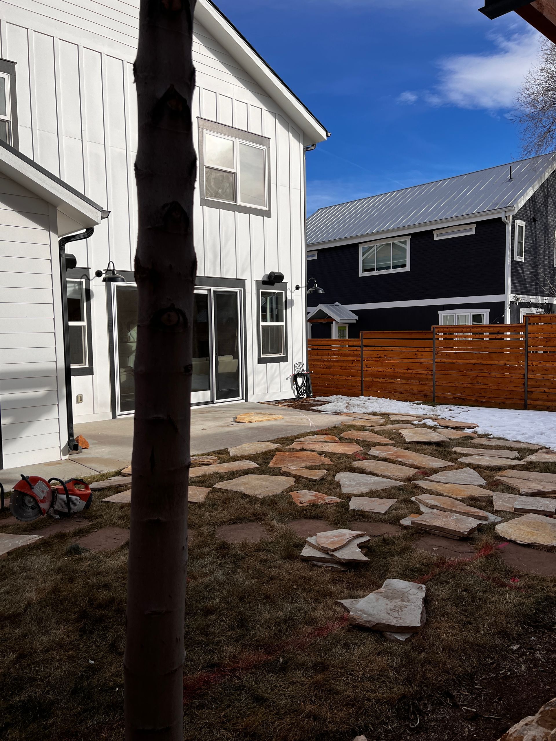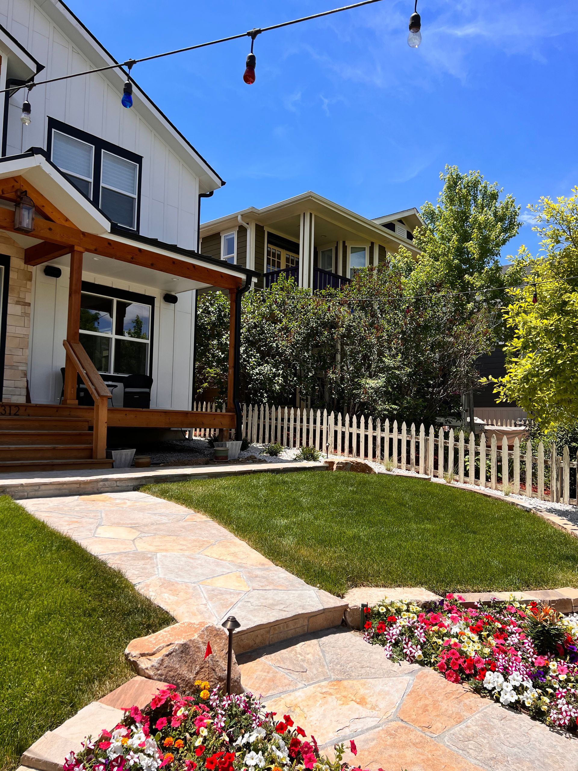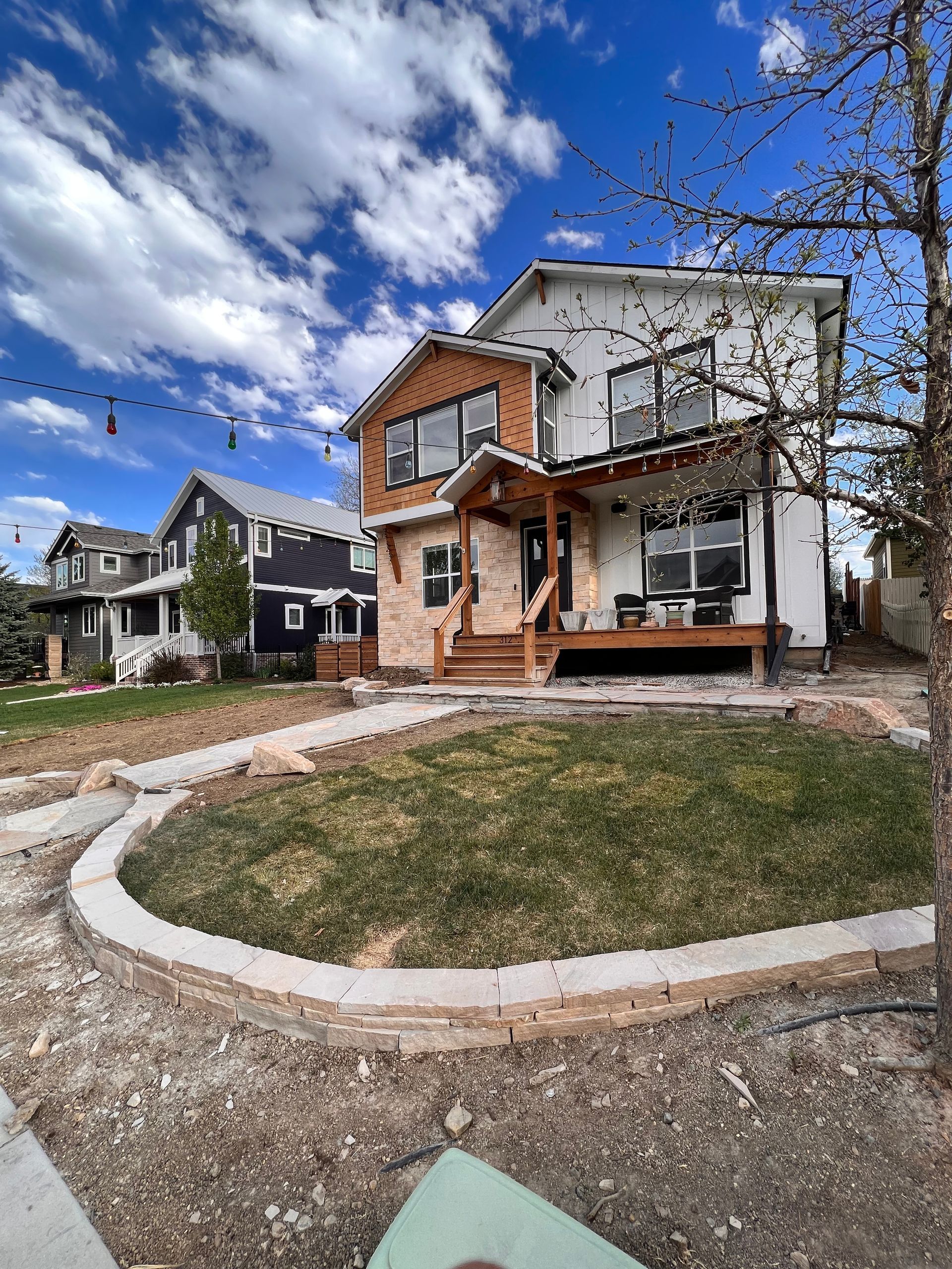 Full remodel of front and back yard building on home design. New Colorado buff flagstone and stripstone, plants, trees, sprinklers, and grass. Lafayette, CO 2019-2022