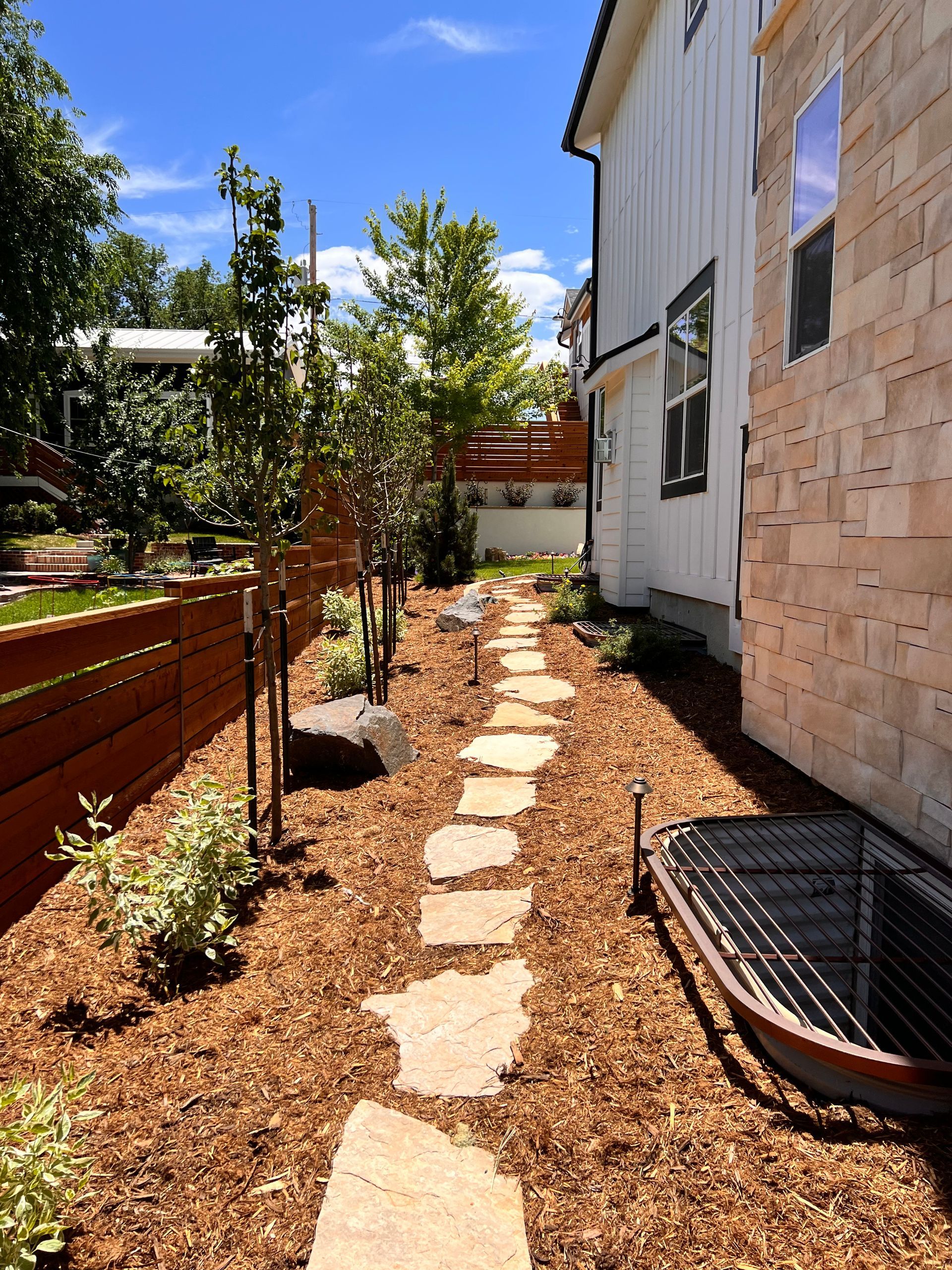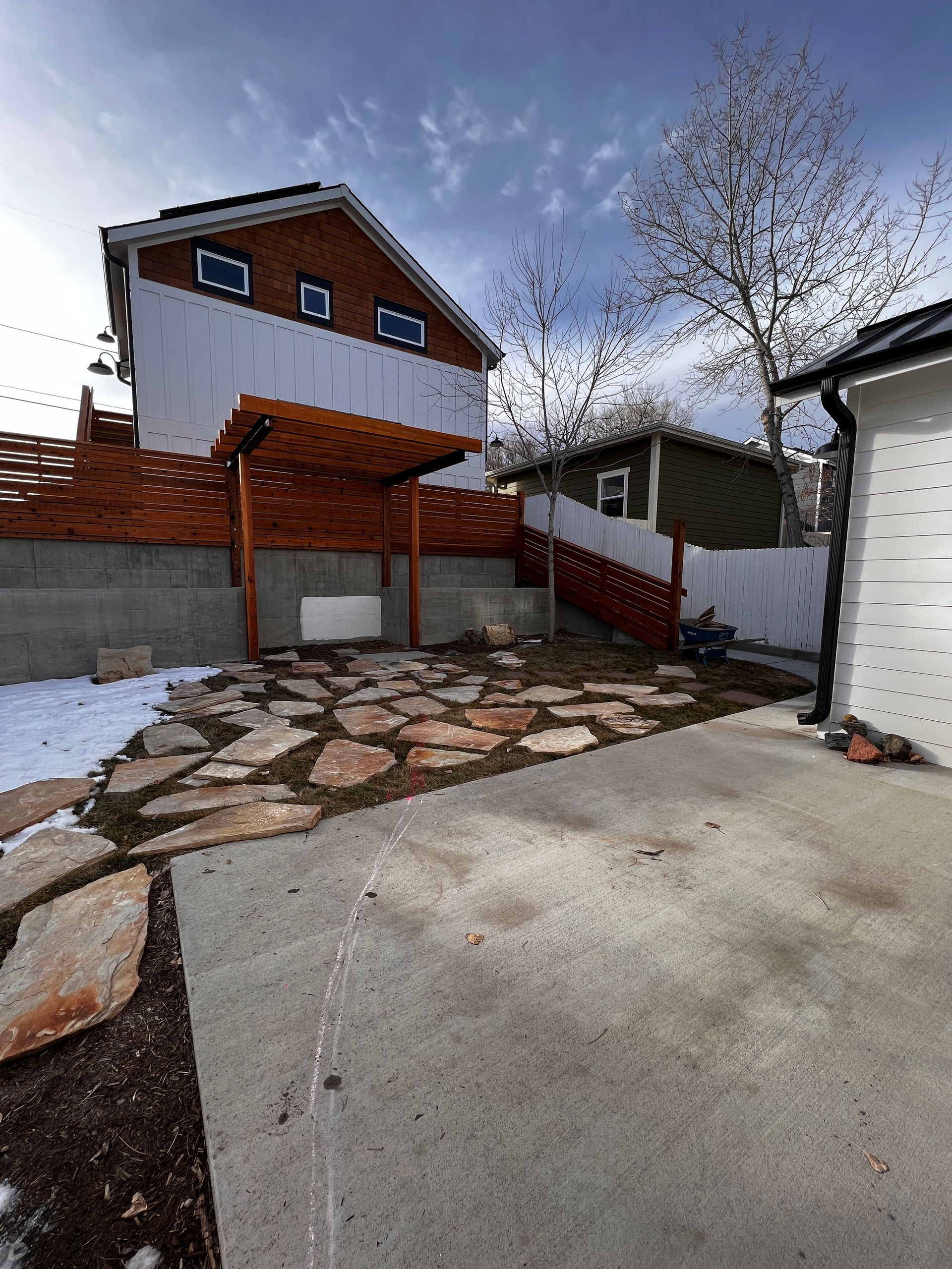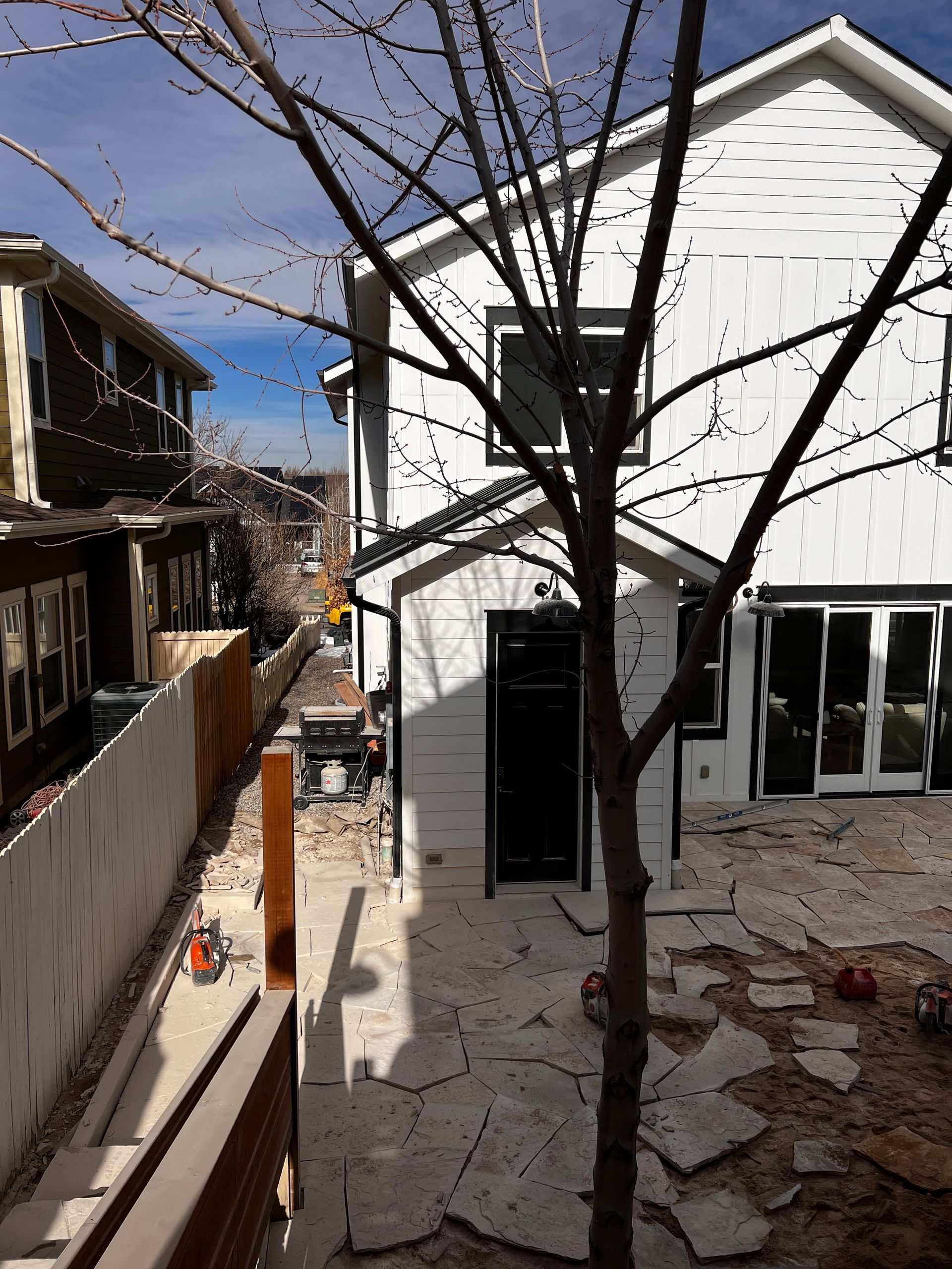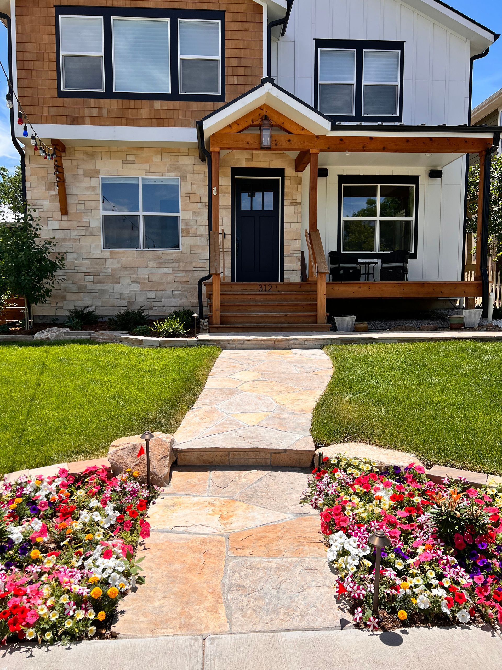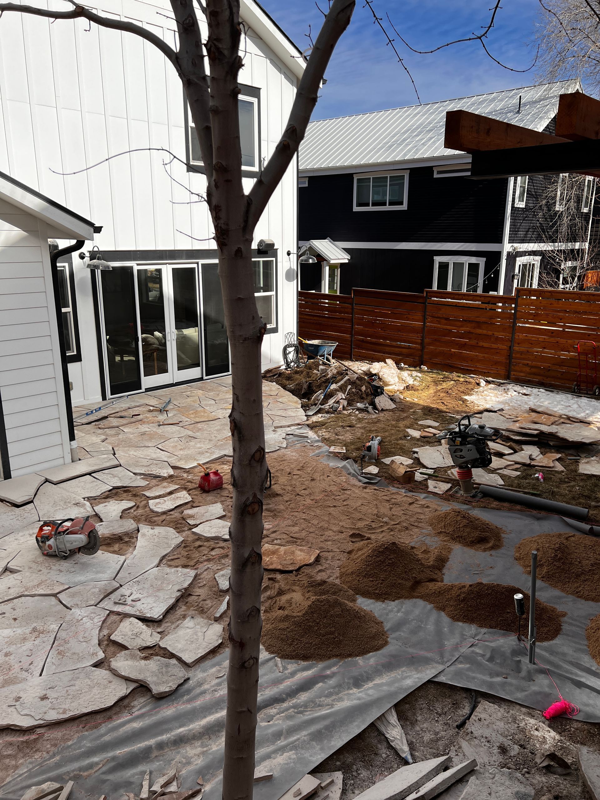 Full remodel of front and back yard building on home design. New Colorado buff flagstone and stripstone, plants, trees, sprinklers, and grass. Lafayette, CO 2019-2022
