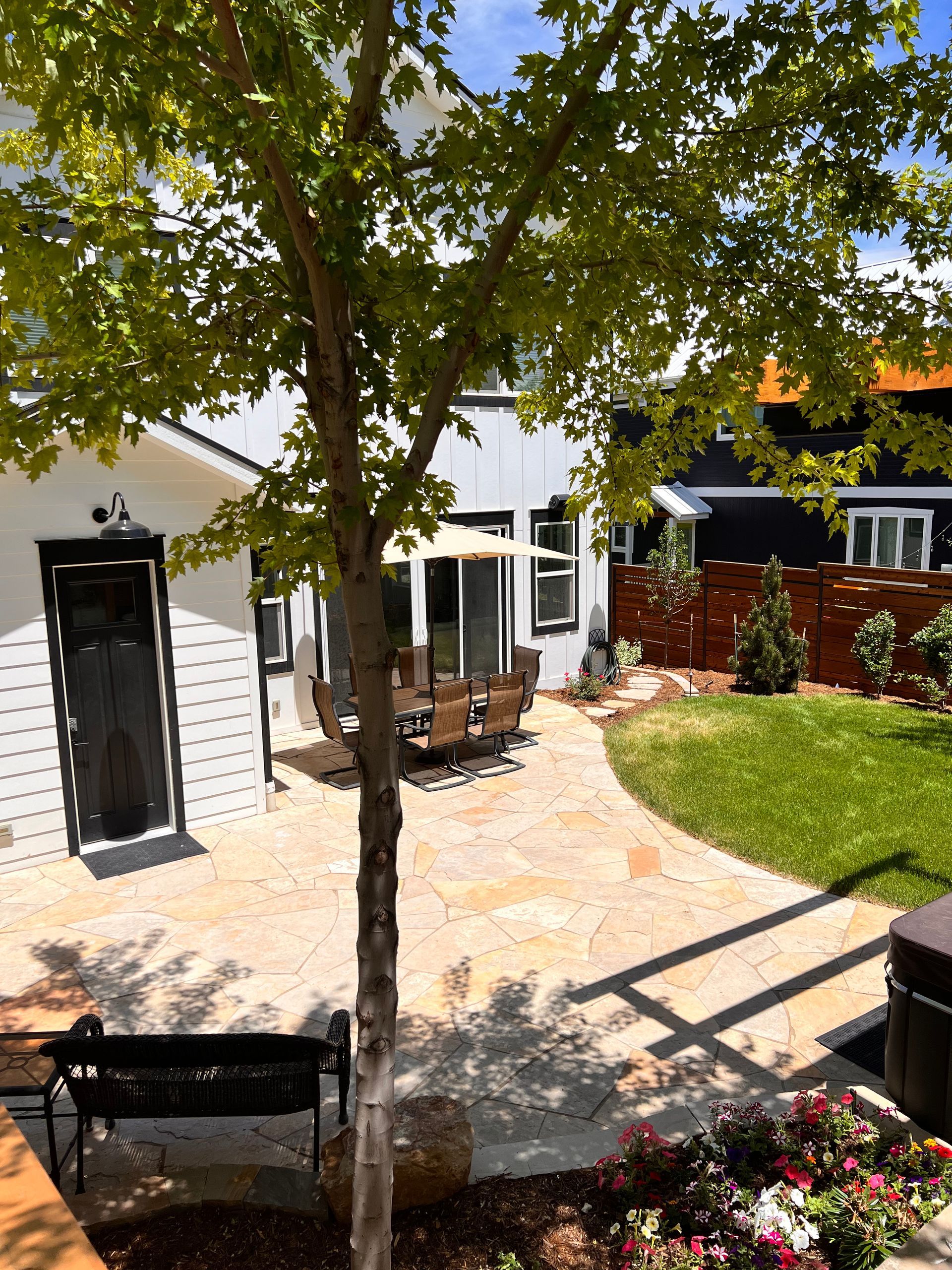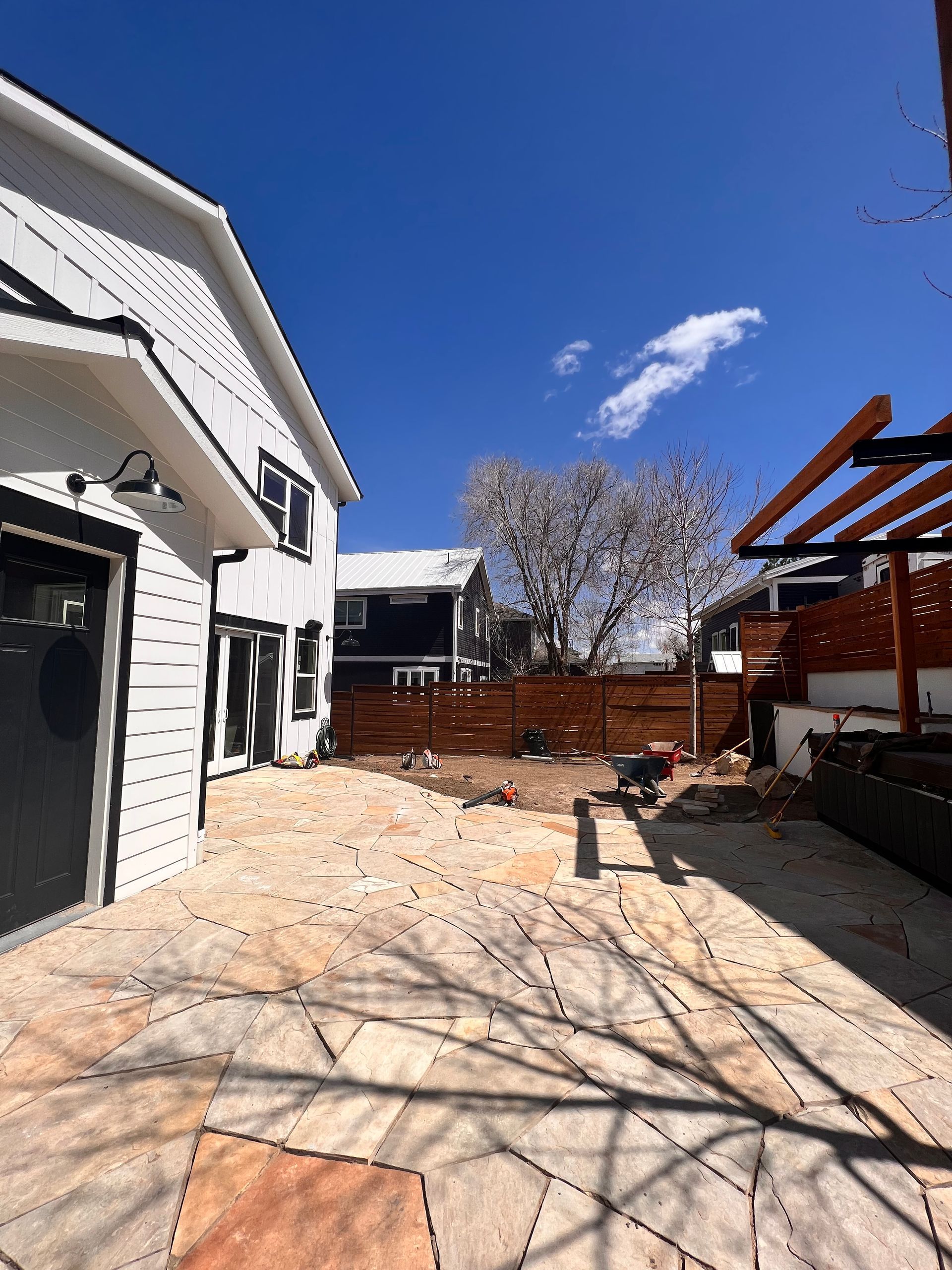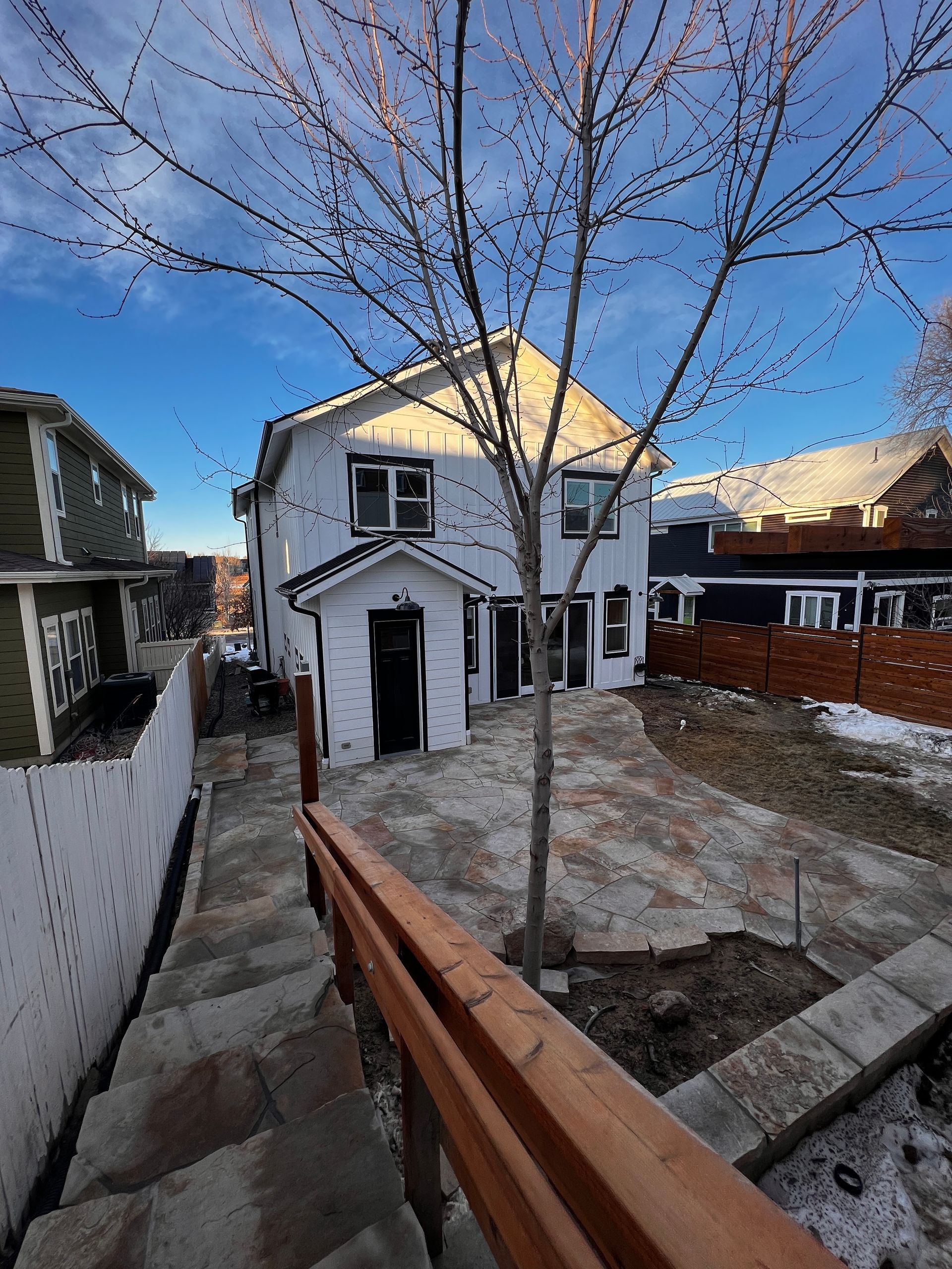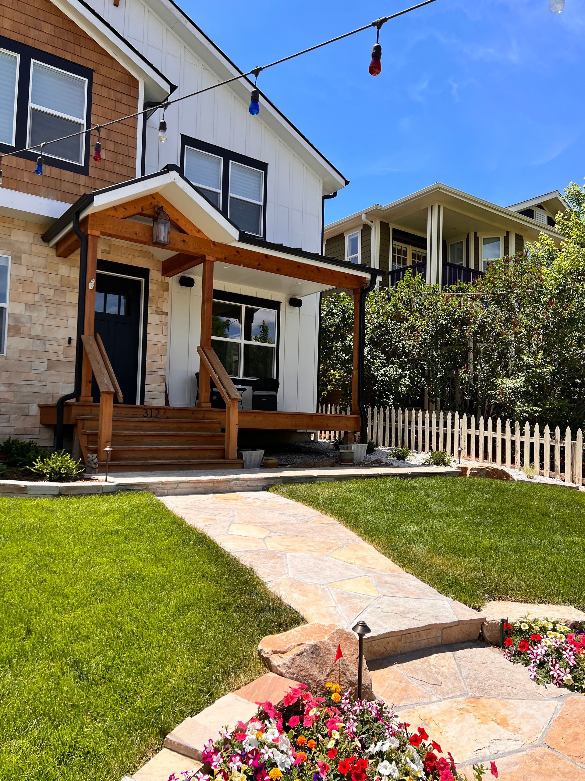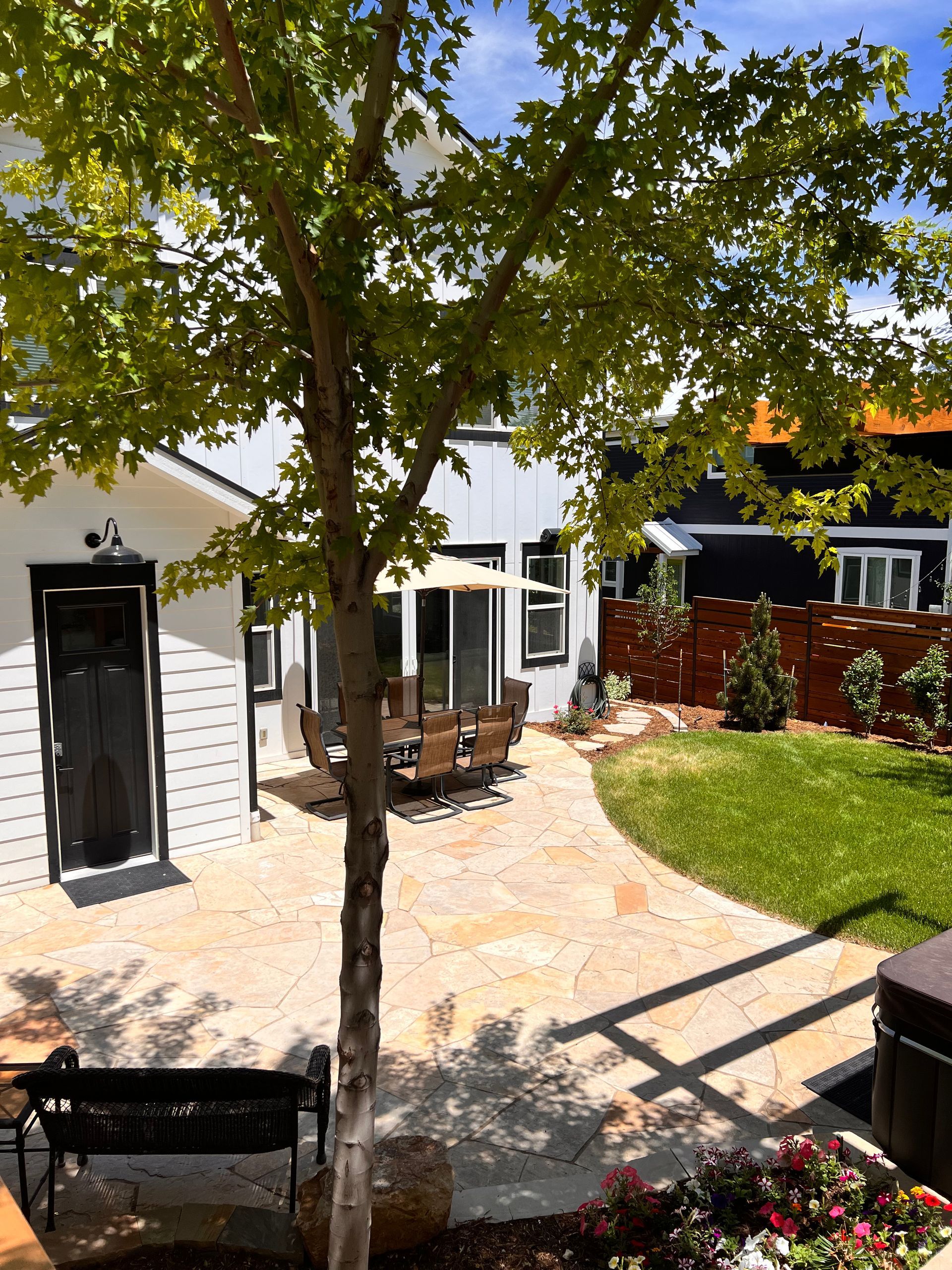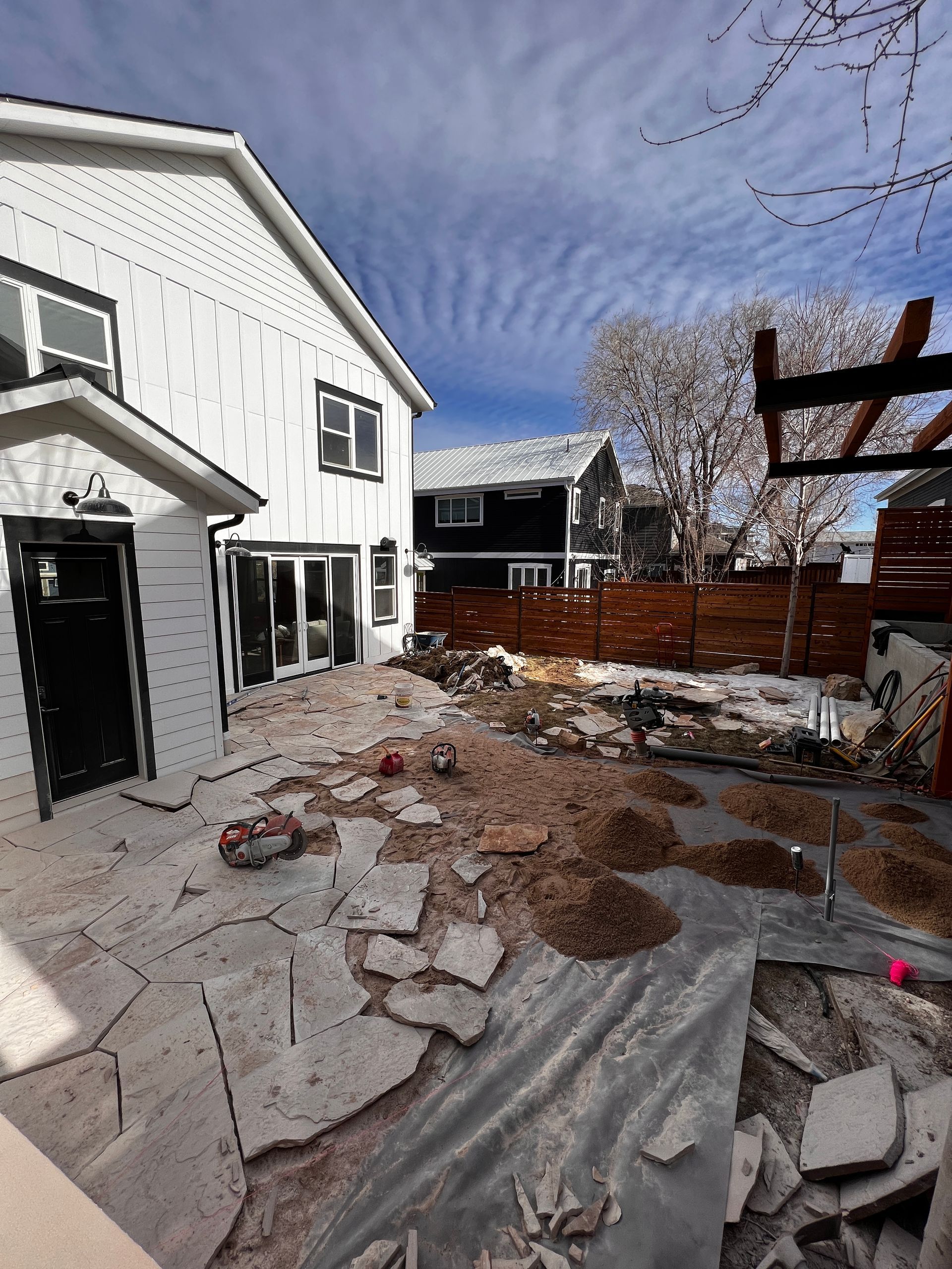 Full remodel of front and back yard building on home design. New Colorado buff flagstone and stripstone, plants, trees, sprinklers, and grass. Lafayette, CO 2019-2022