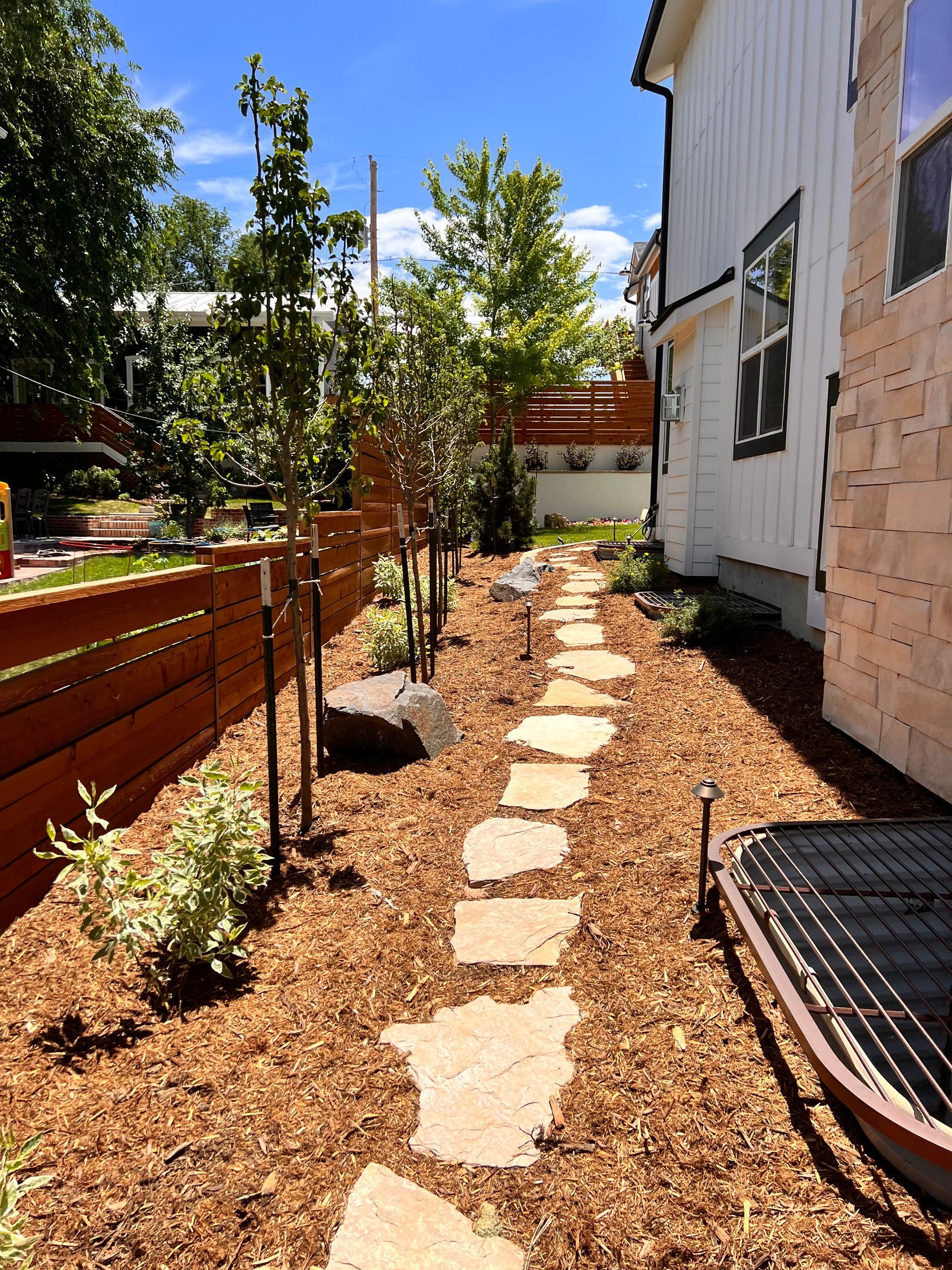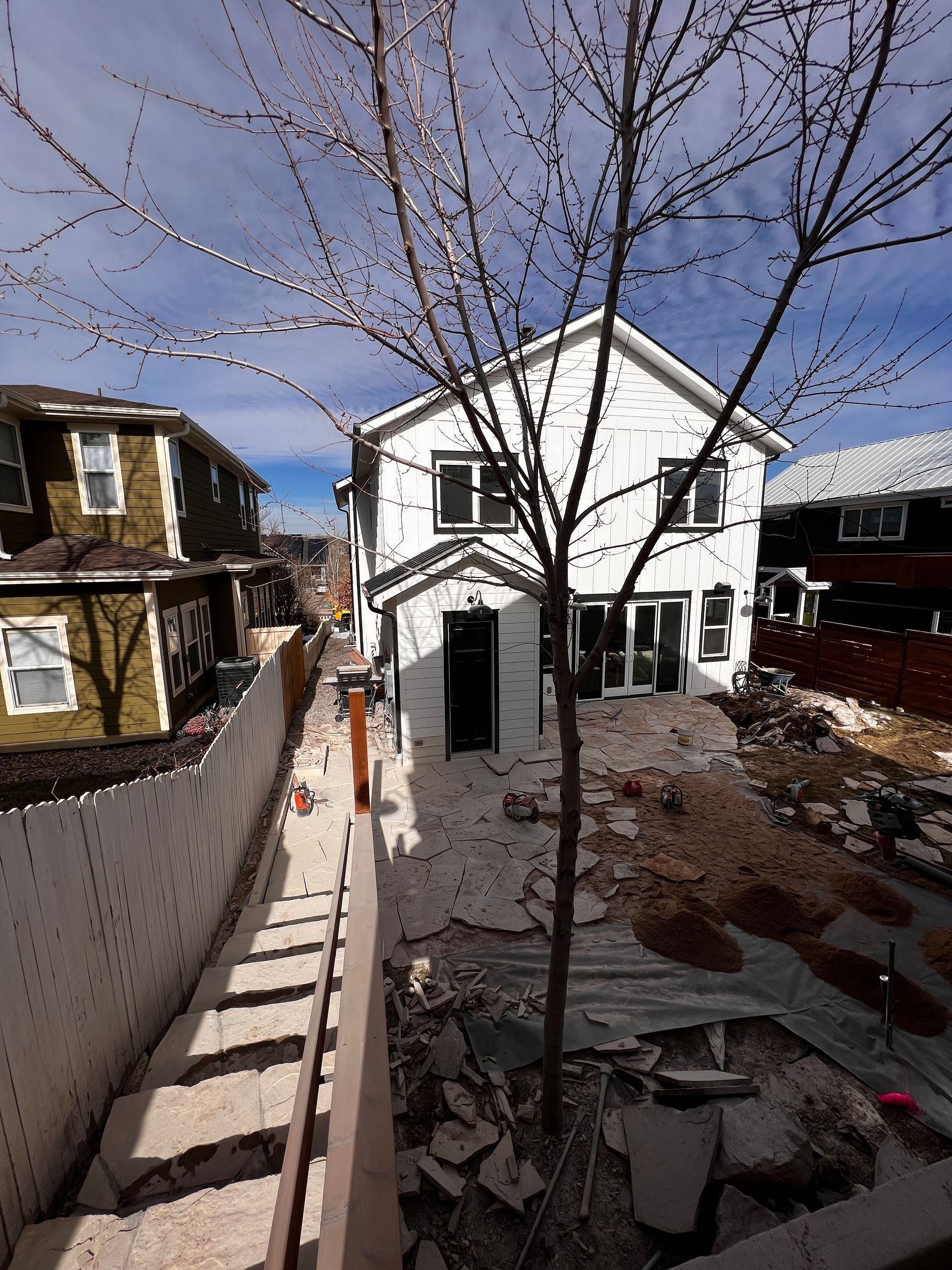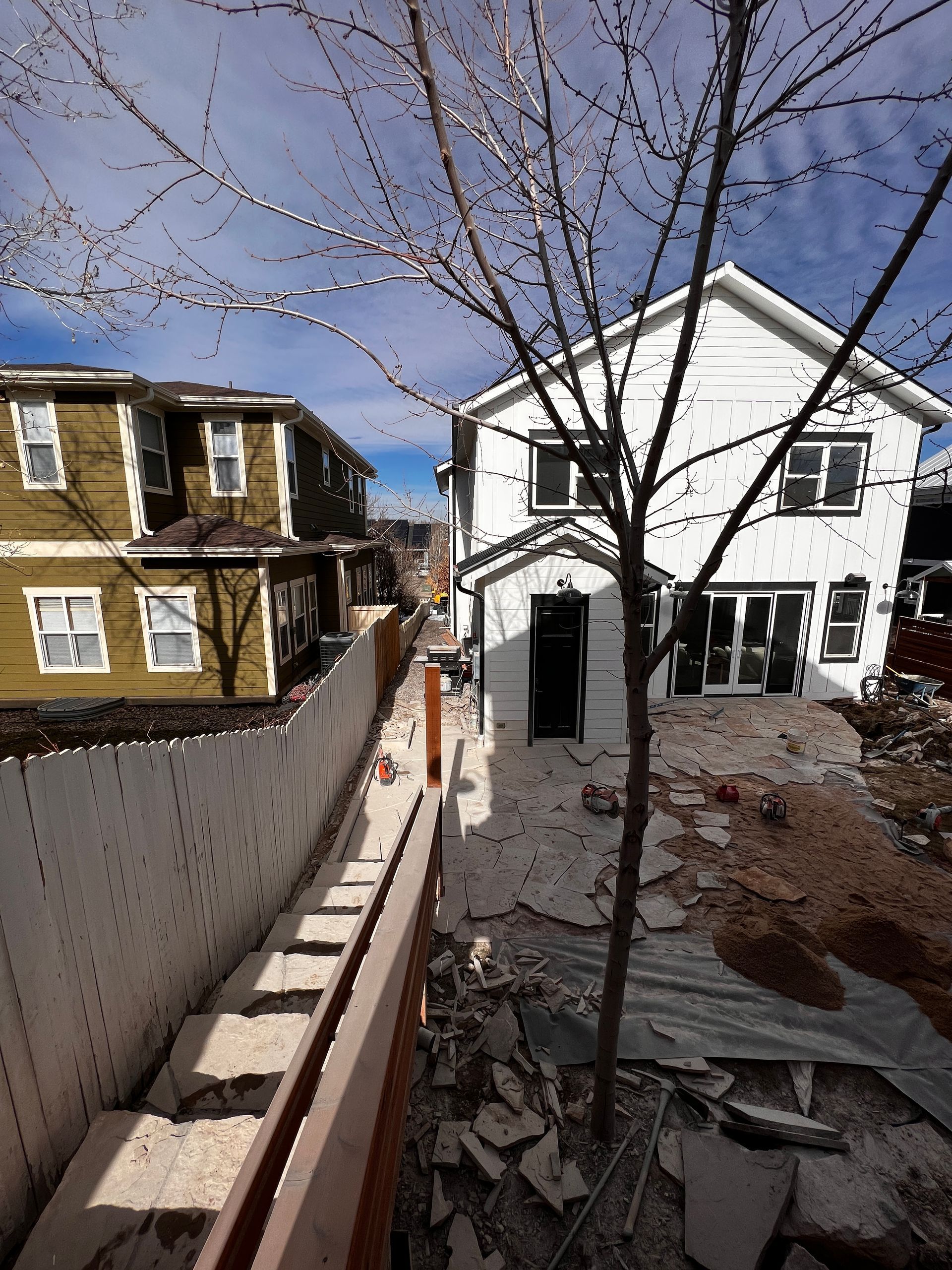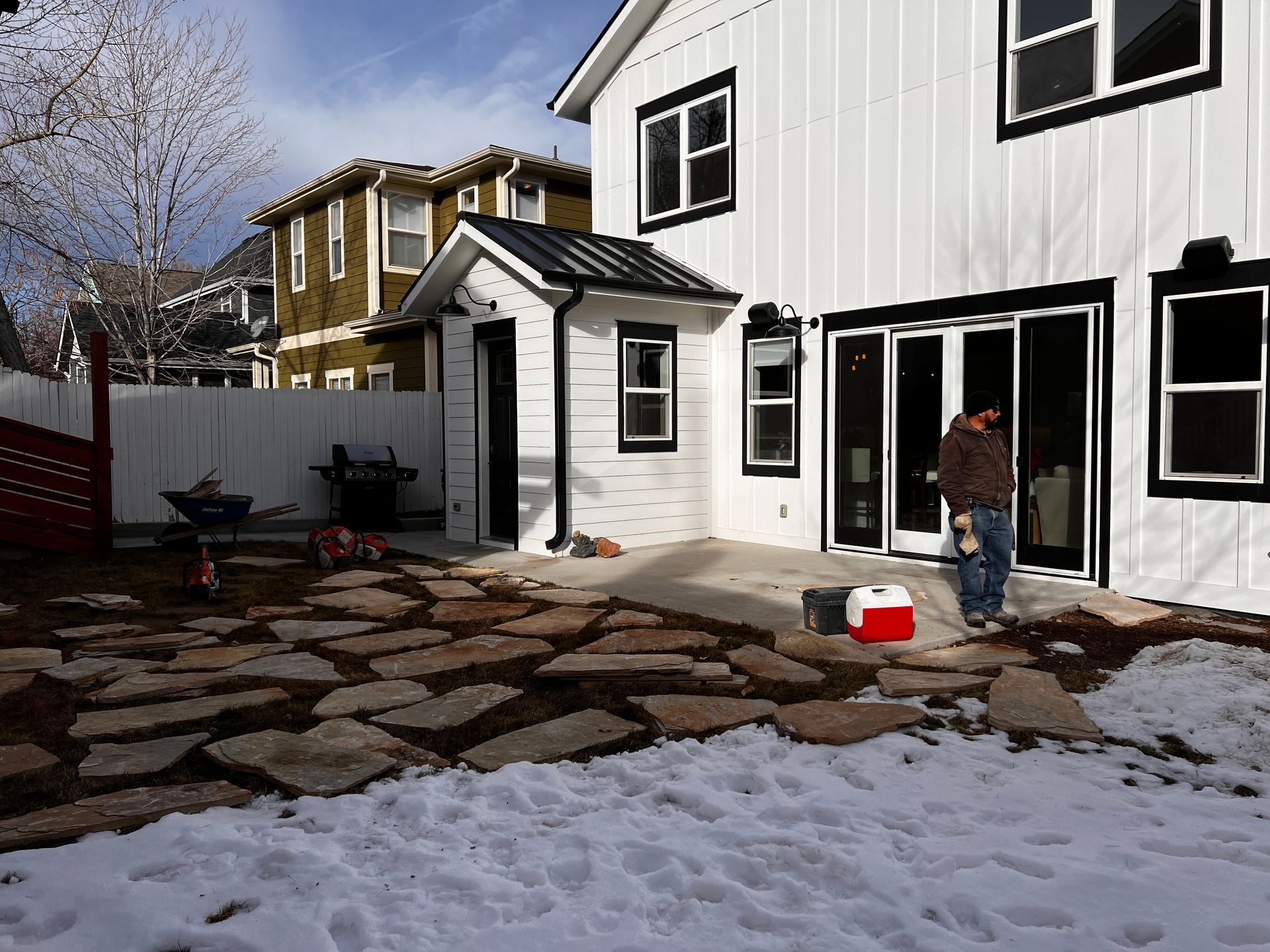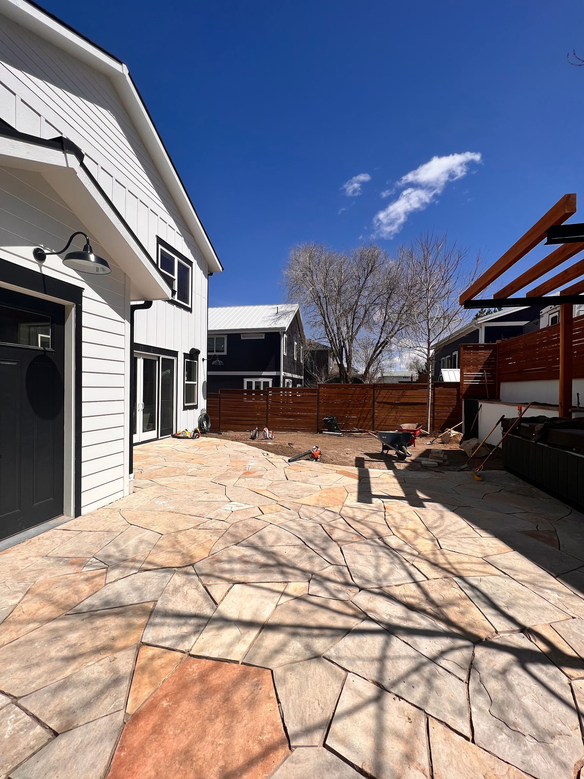 Full remodel of front and back yard building on home design. New Colorado buff flagstone and stripstone, plants, trees, sprinklers, and grass. Lafayette, CO 2019-2022