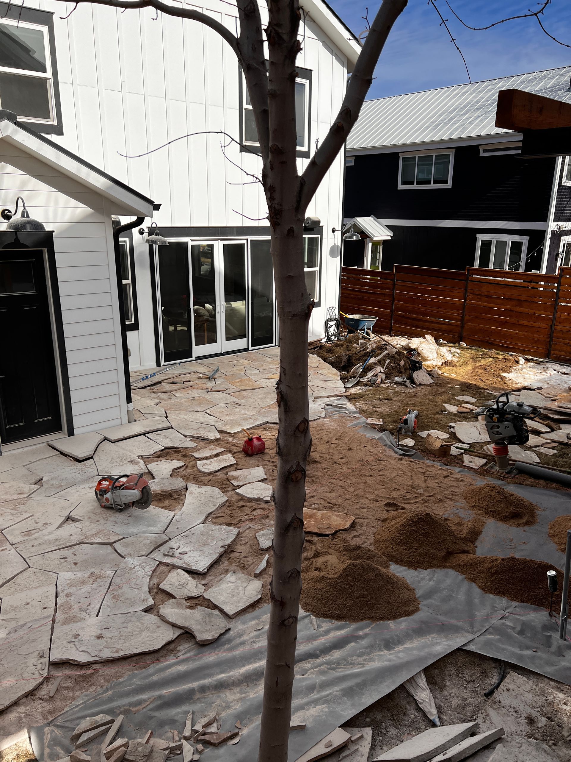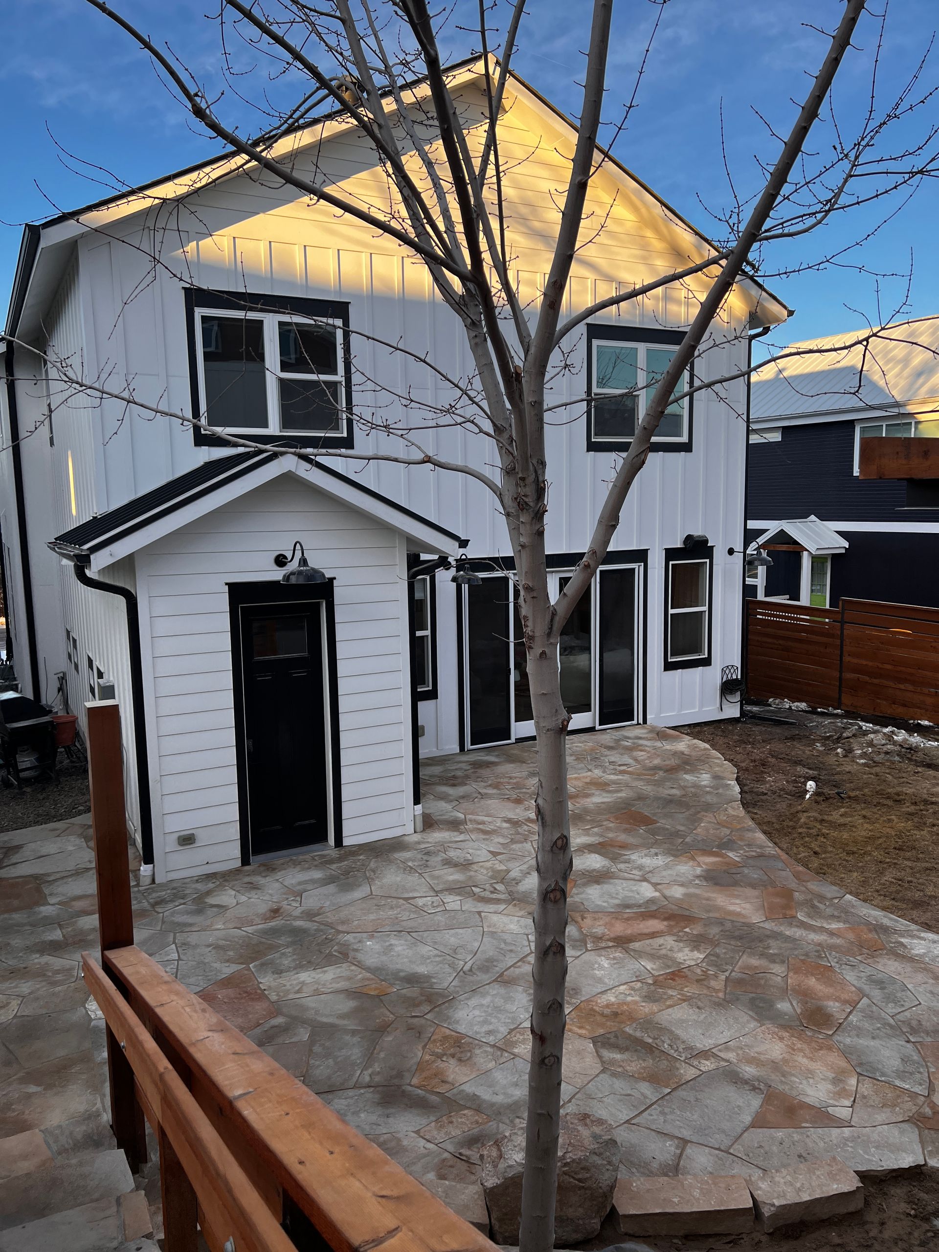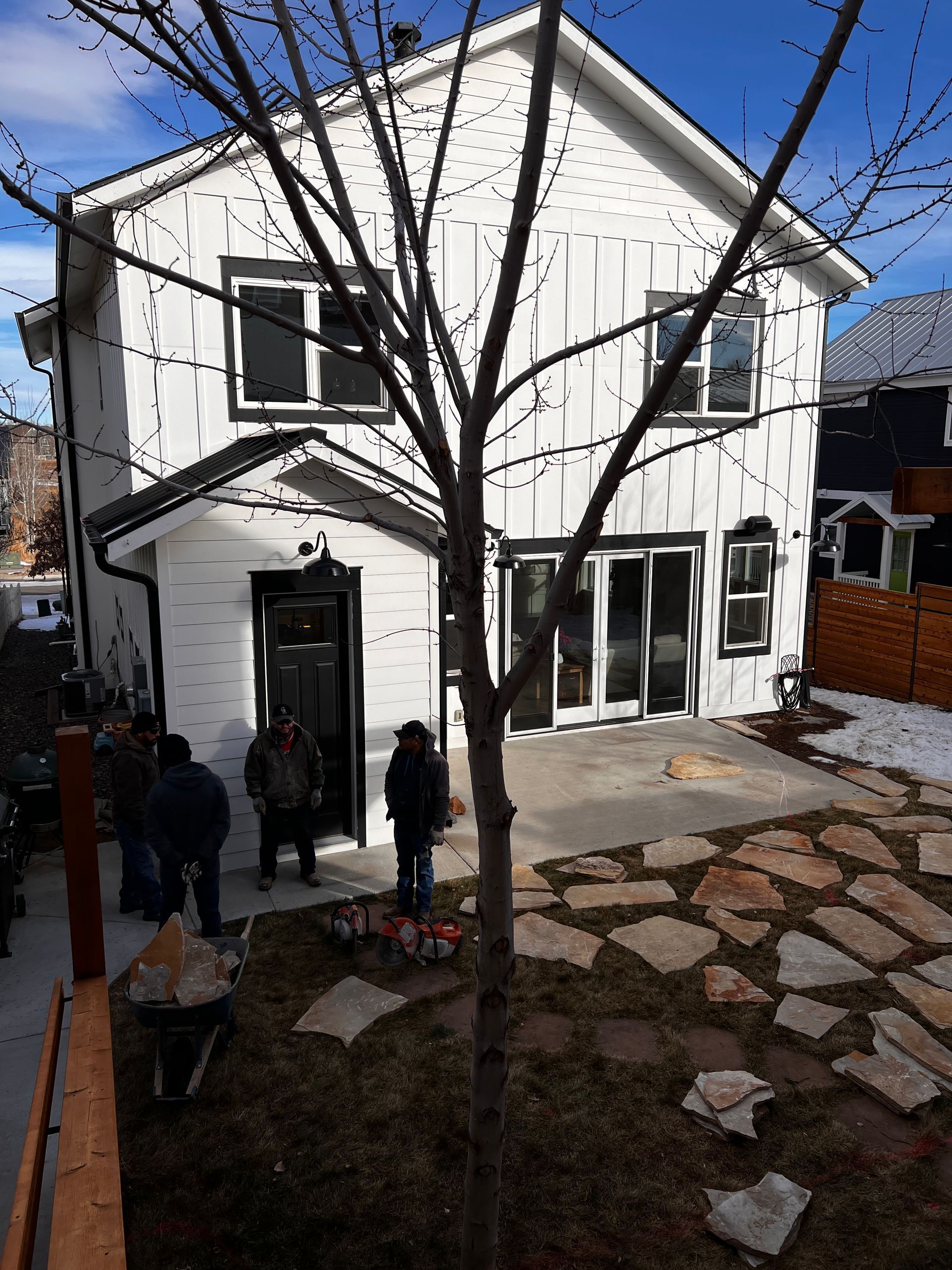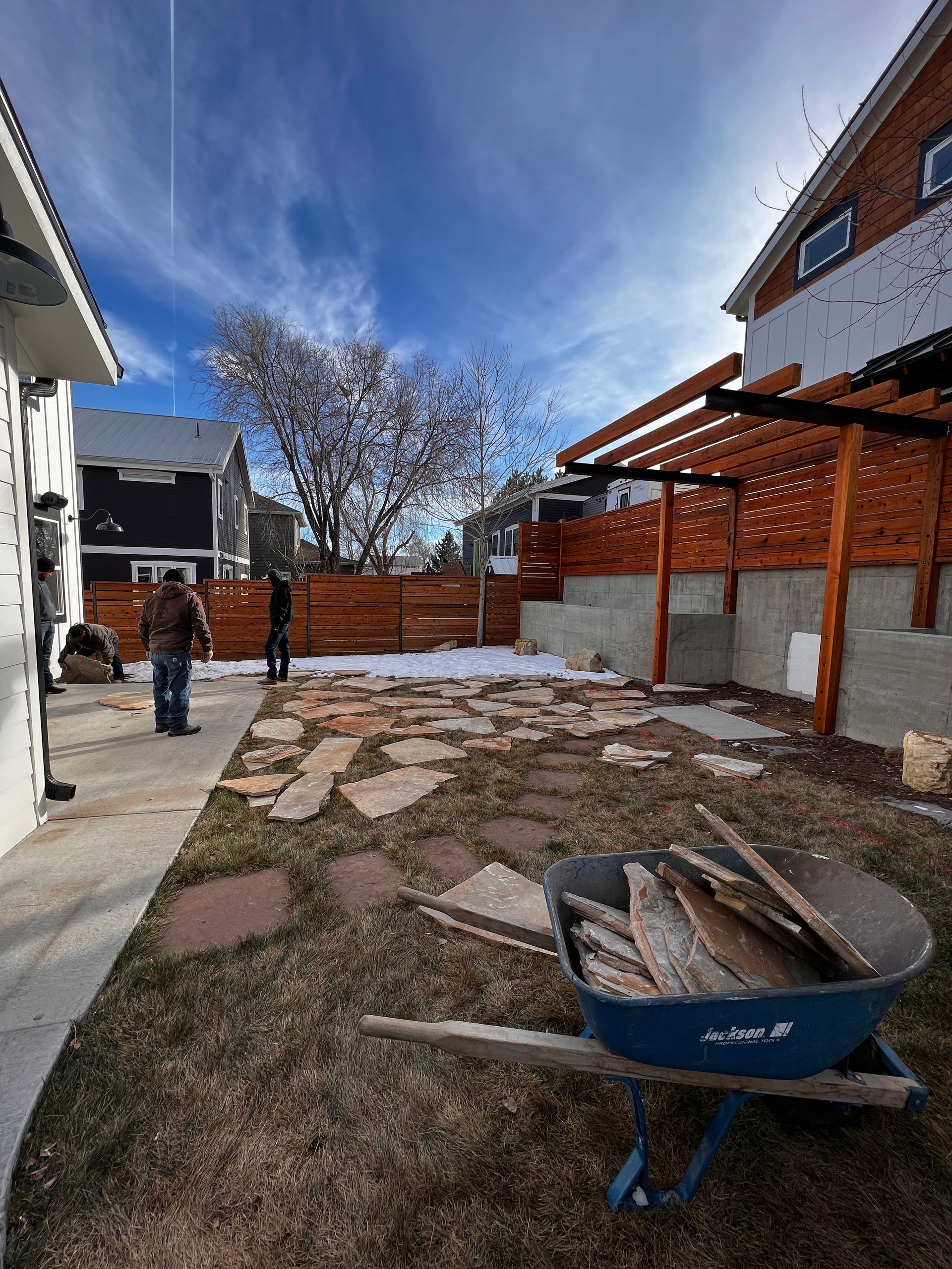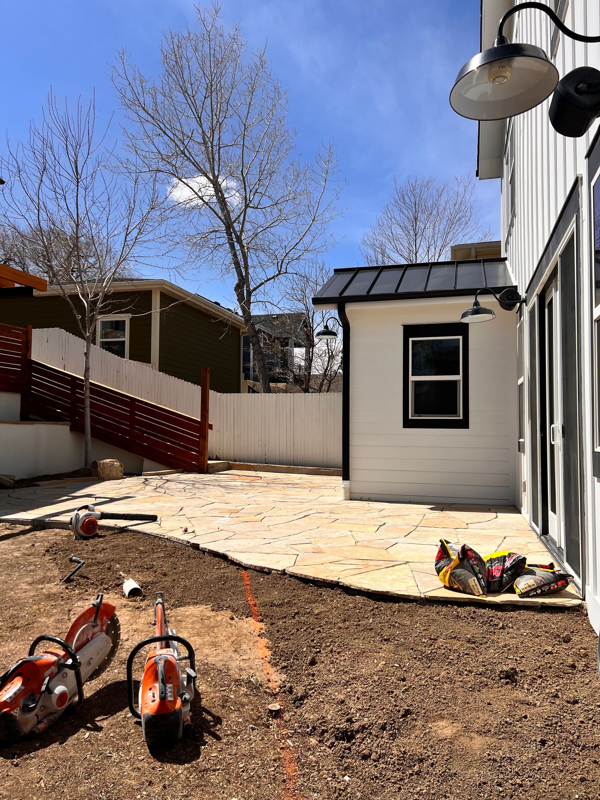 Full remodel of front and back yard building on home design. New Colorado buff flagstone and stripstone, plants, trees, sprinklers, and grass. Lafayette, CO 2019-2022