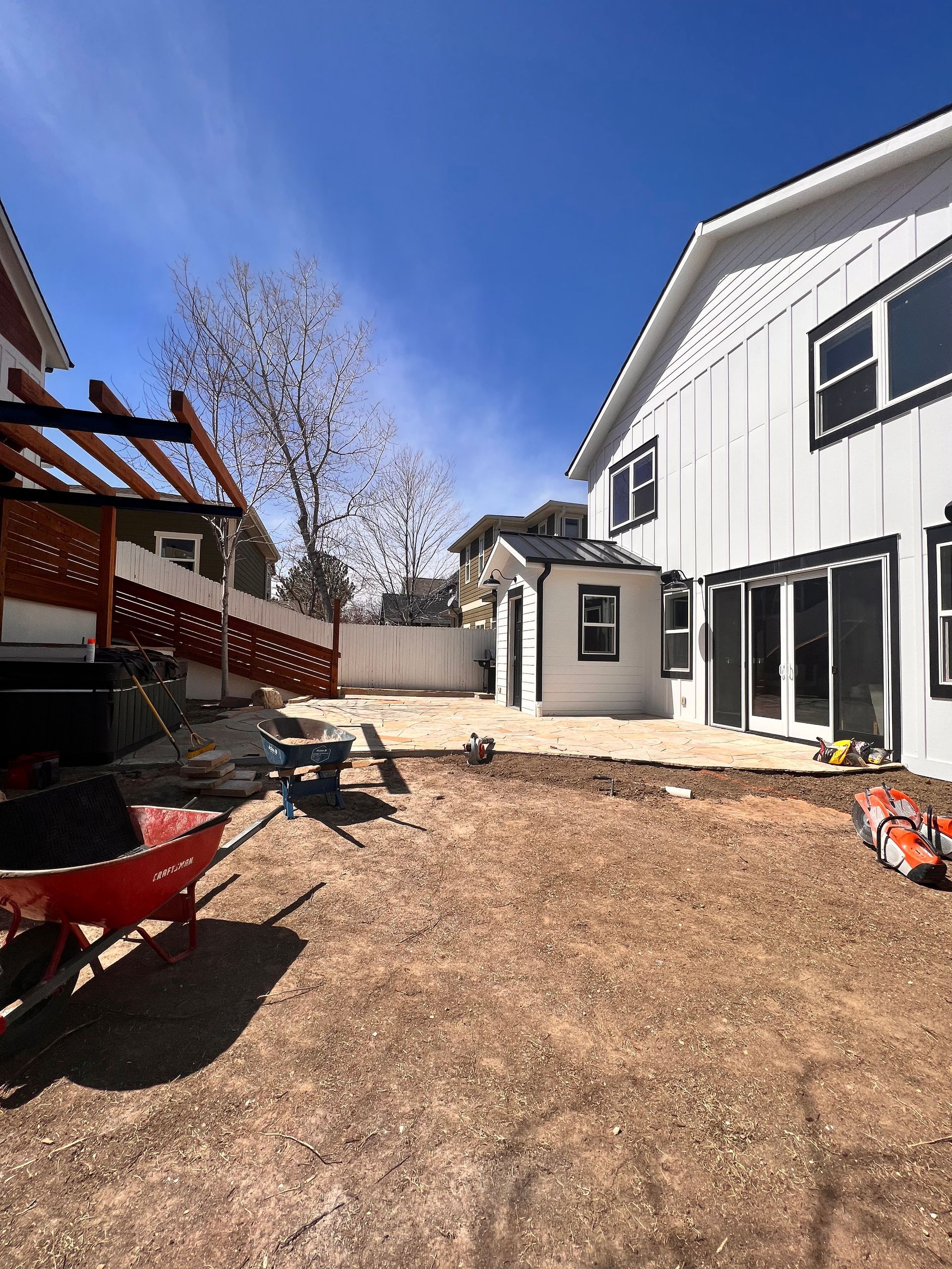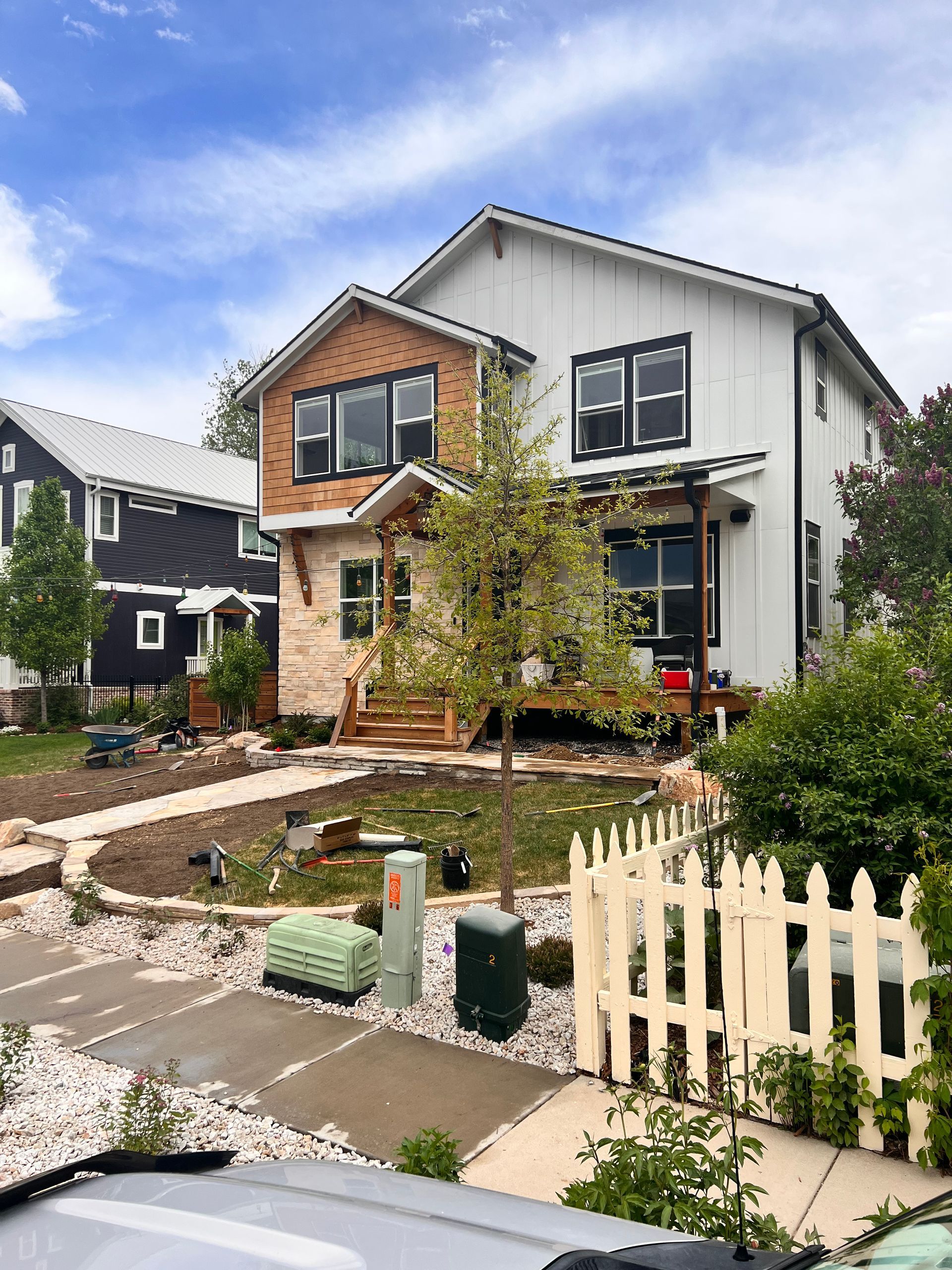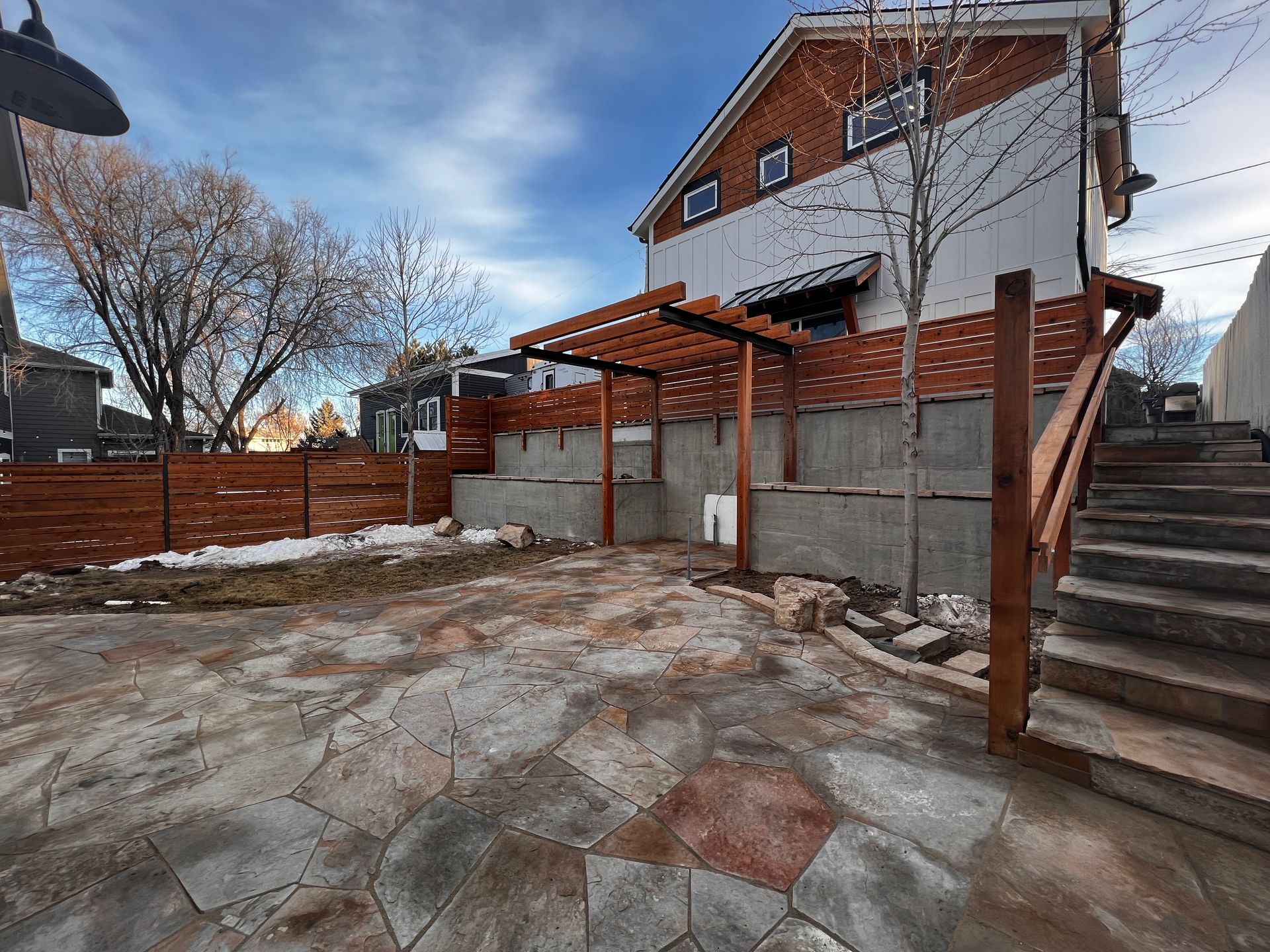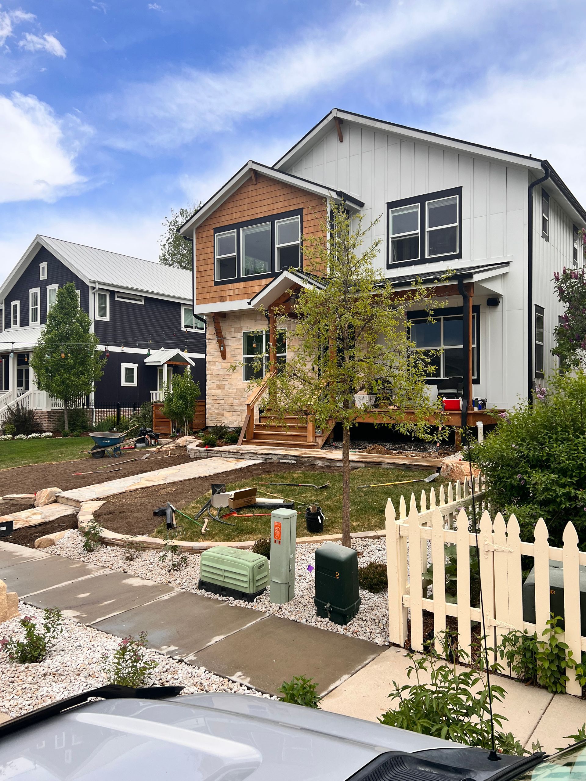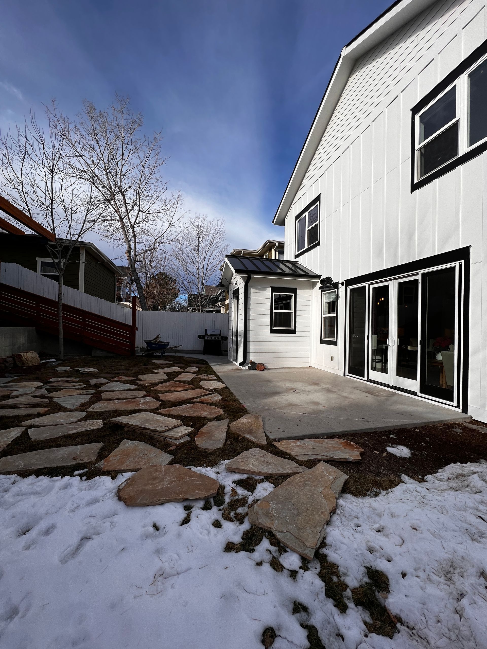 Full remodel of front and back yard building on home design. New Colorado buff flagstone and stripstone, plants, trees, sprinklers, and grass. Lafayette, CO 2019-2022