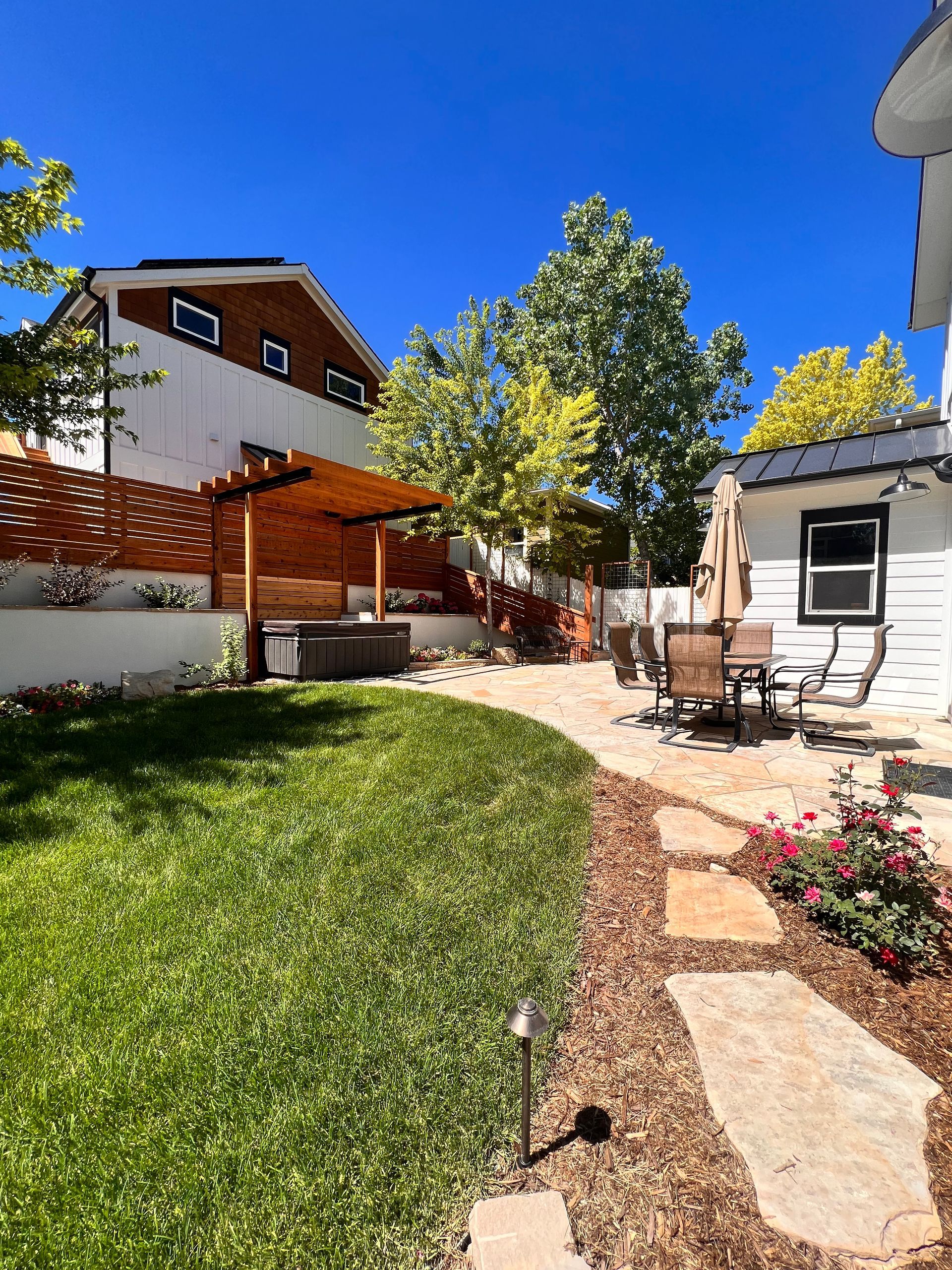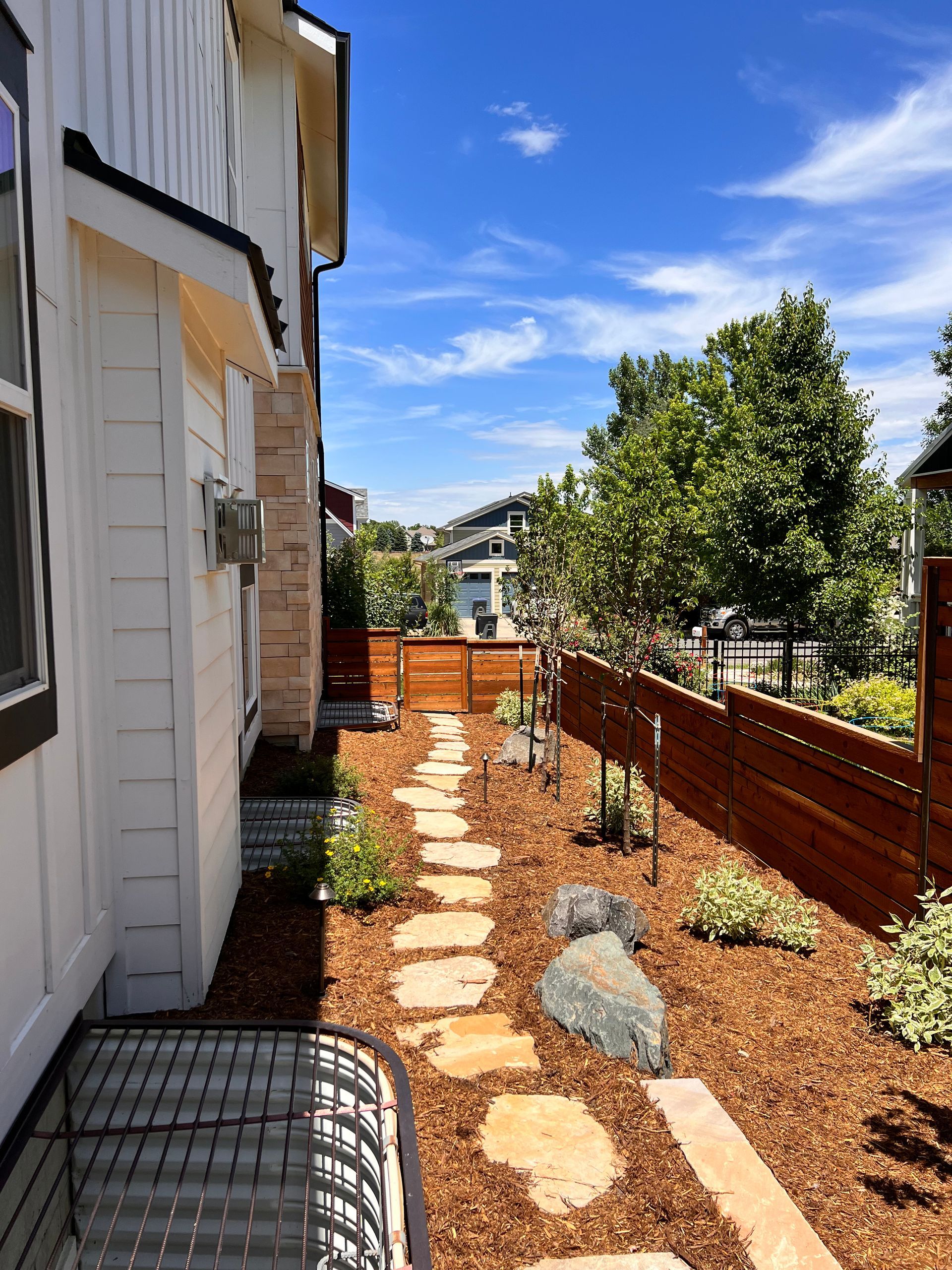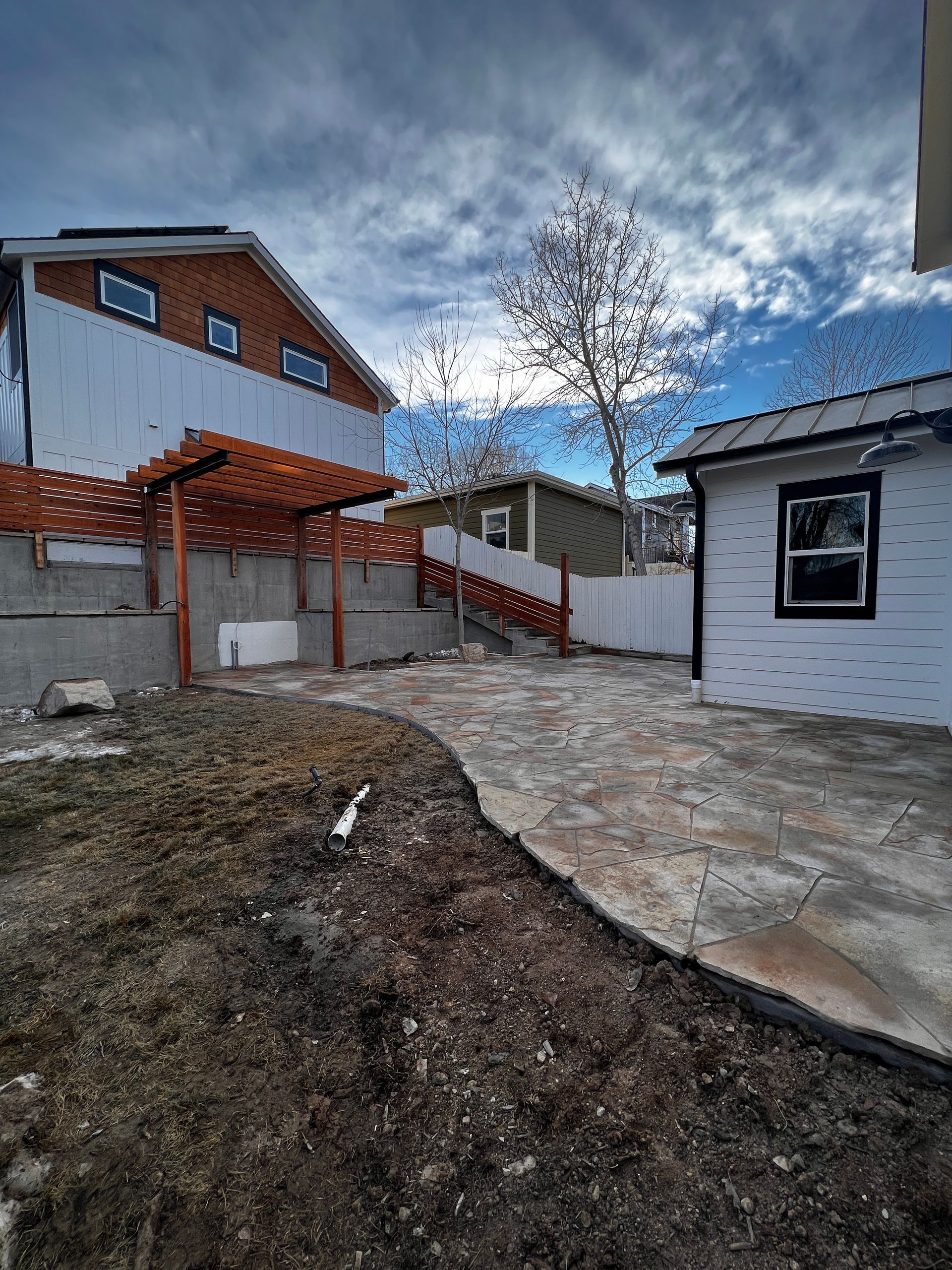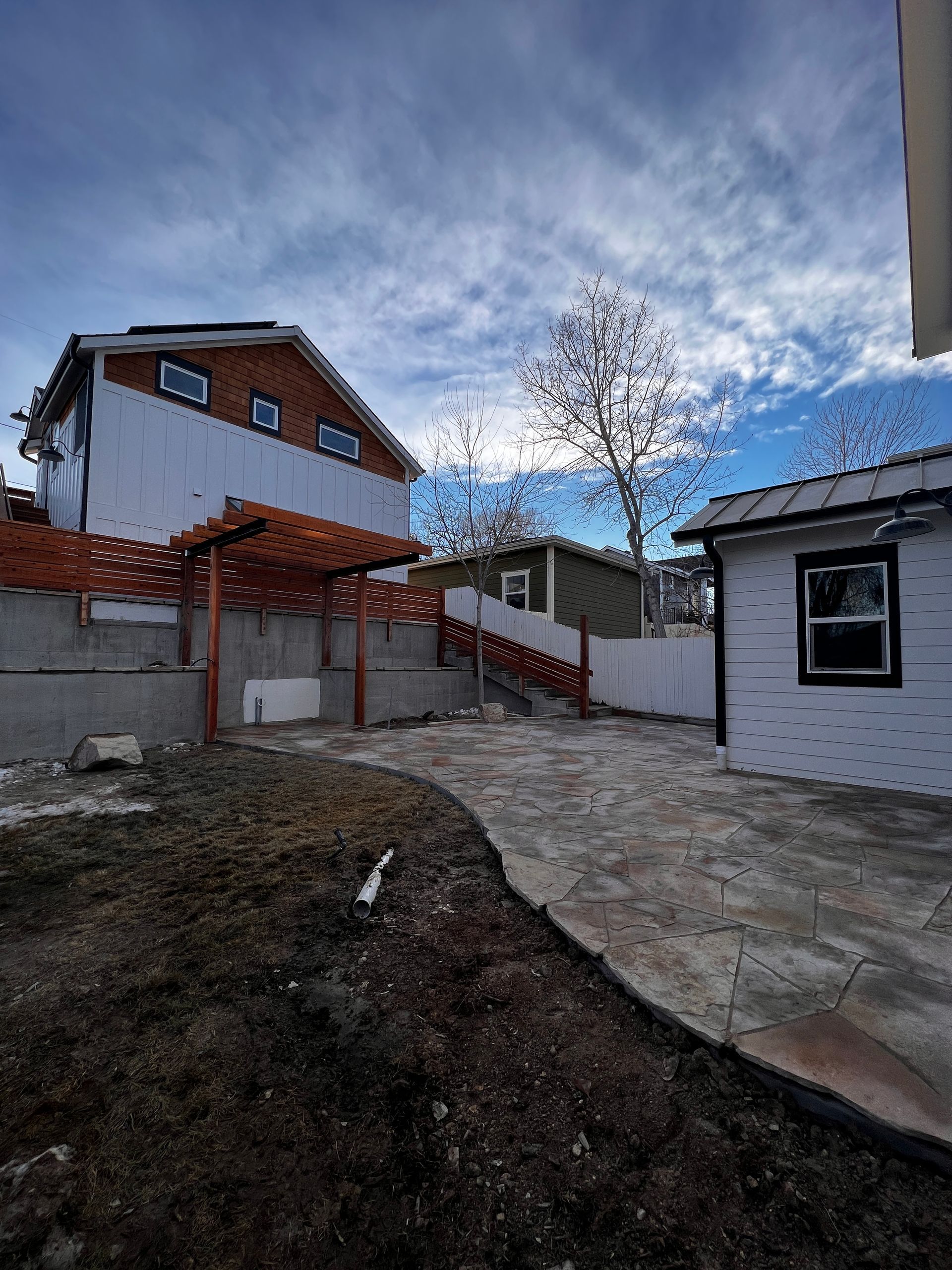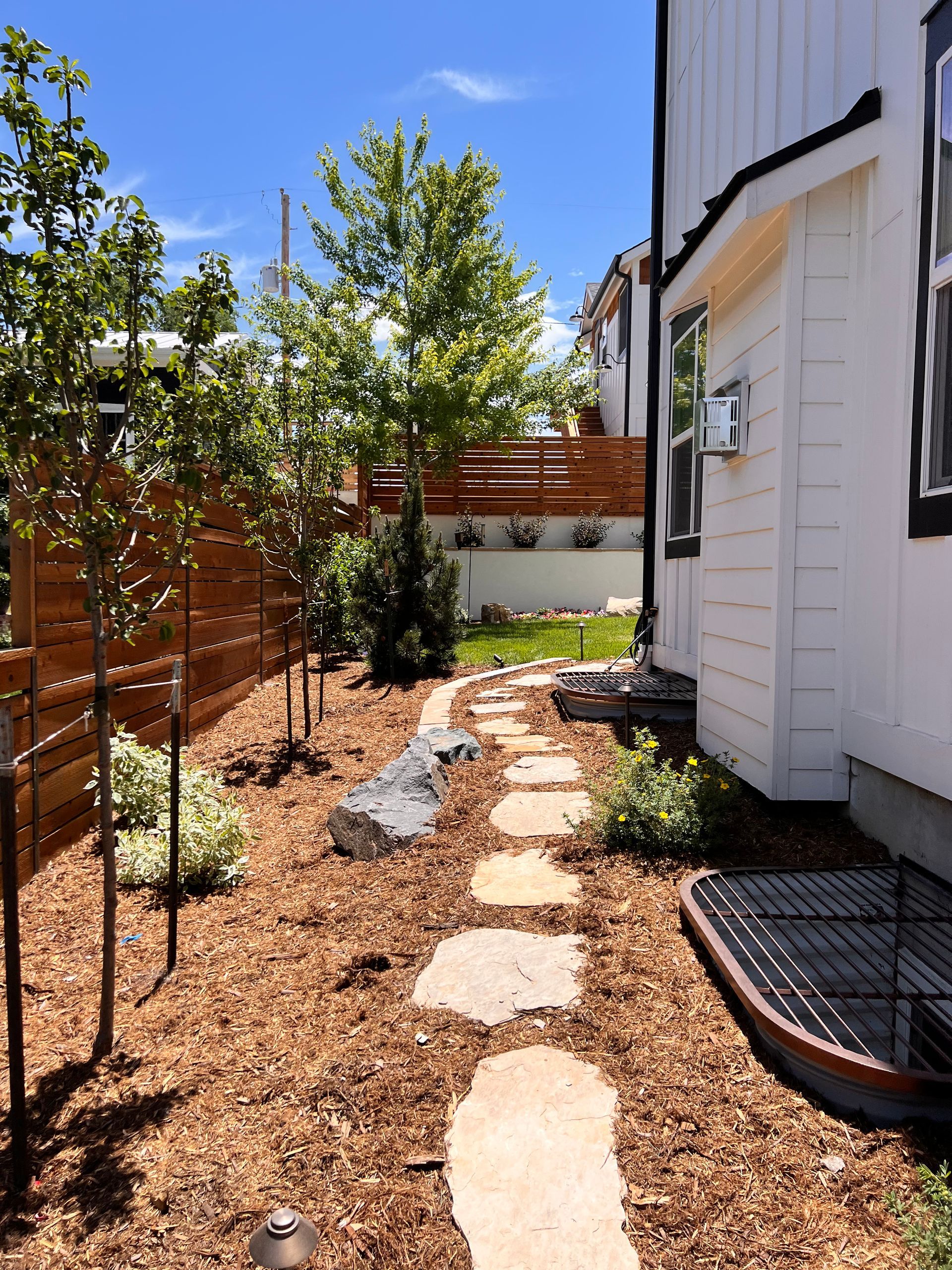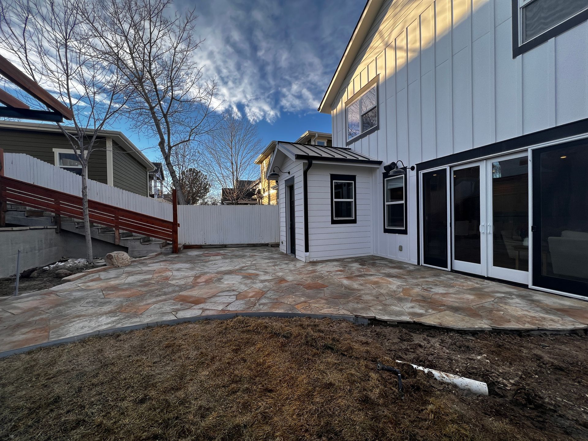 Full remodel of front and back yard building on home design. New Colorado buff flagstone and stripstone, plants, trees, sprinklers, and grass. Lafayette, CO 2019-2022