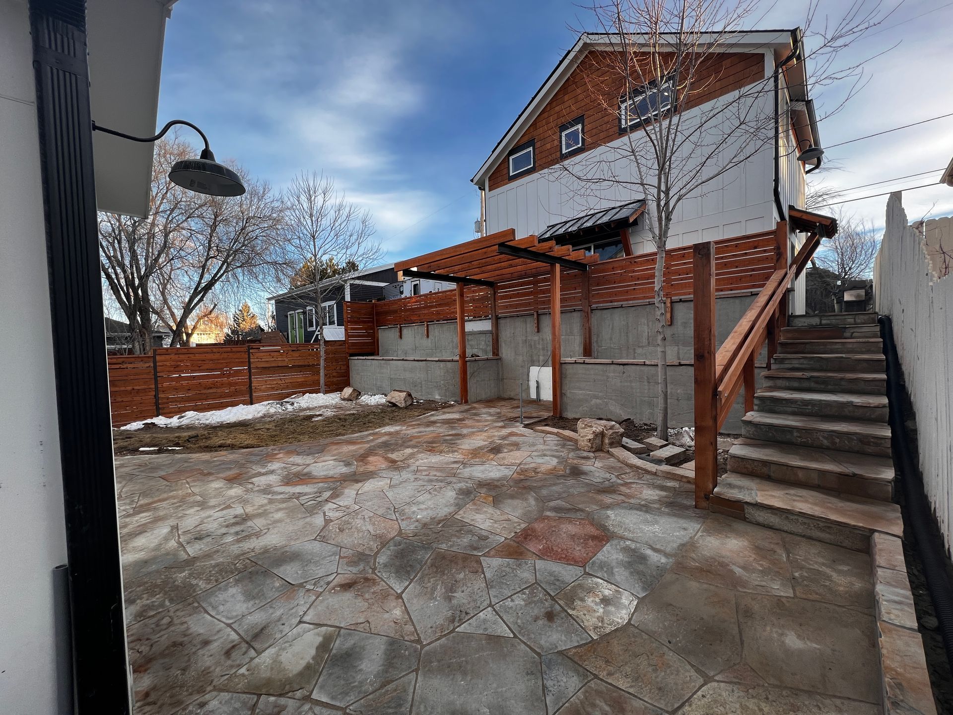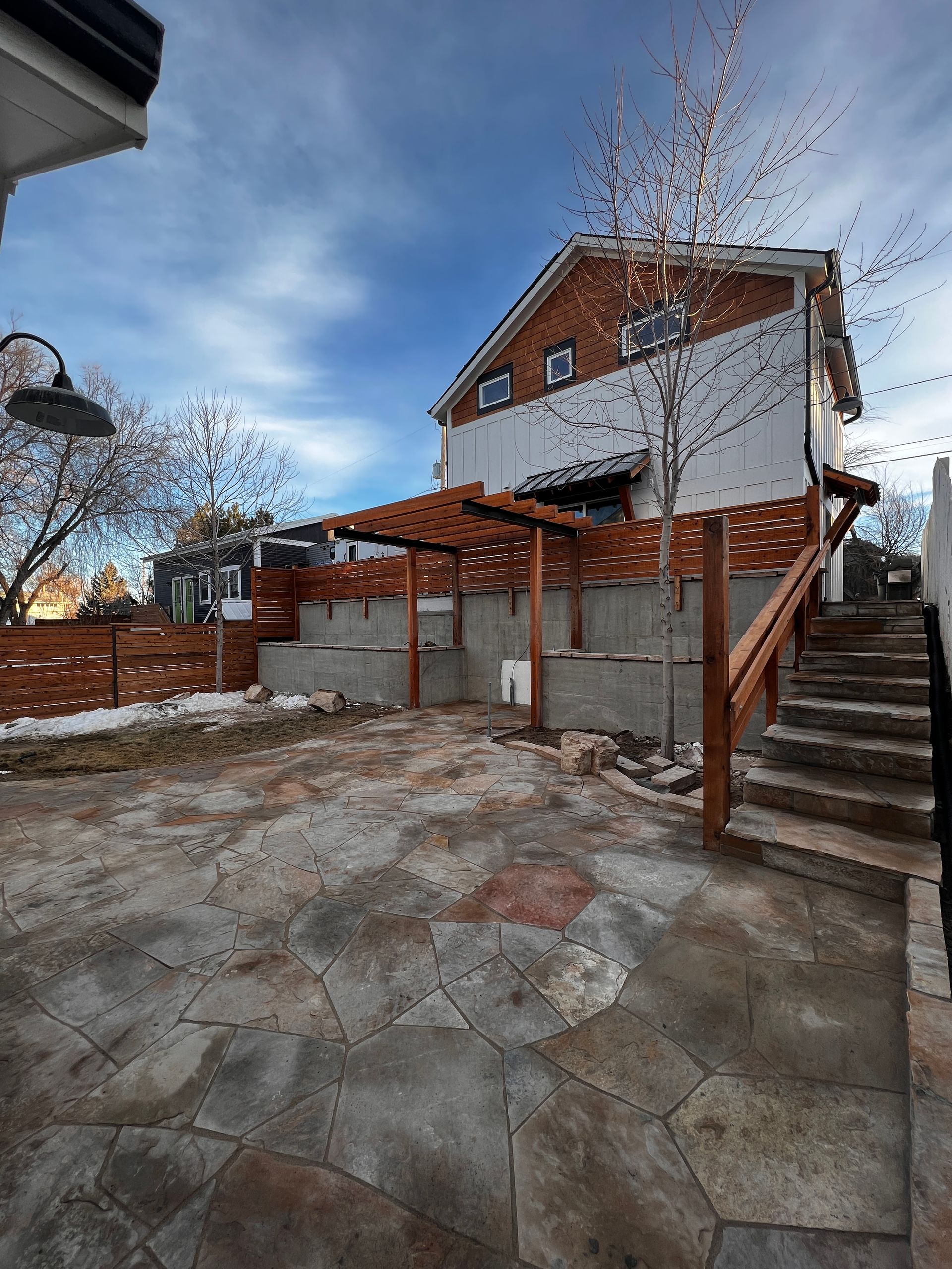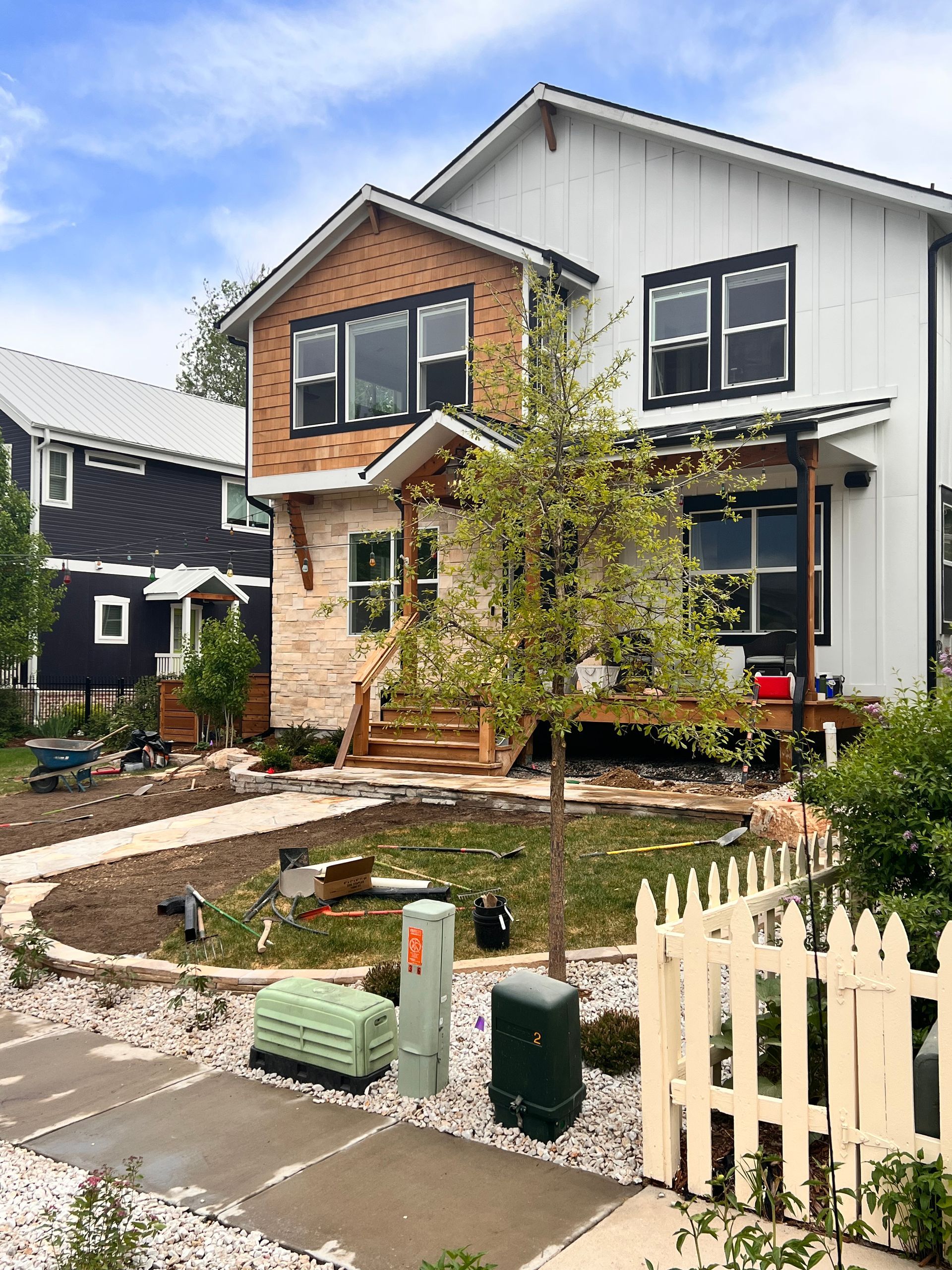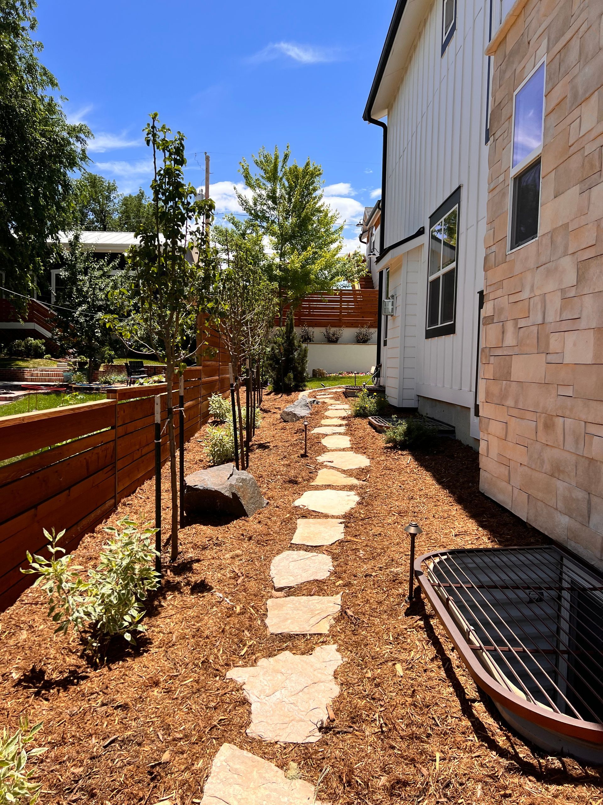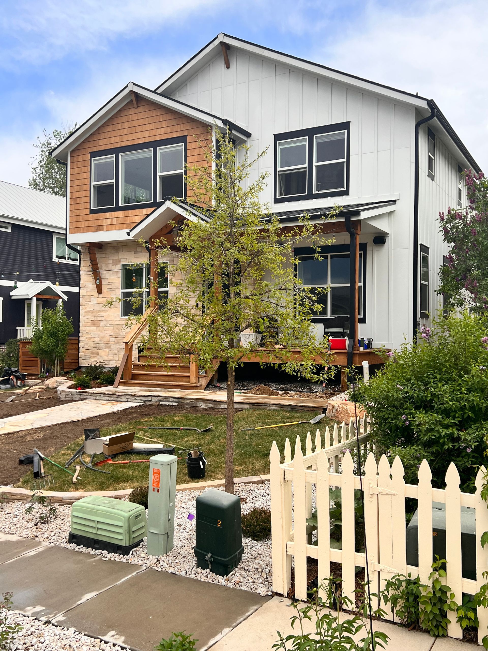 Full remodel of front and back yard building on home design. New Colorado buff flagstone and stripstone, plants, trees, sprinklers, and grass. Lafayette, CO 2019-2022