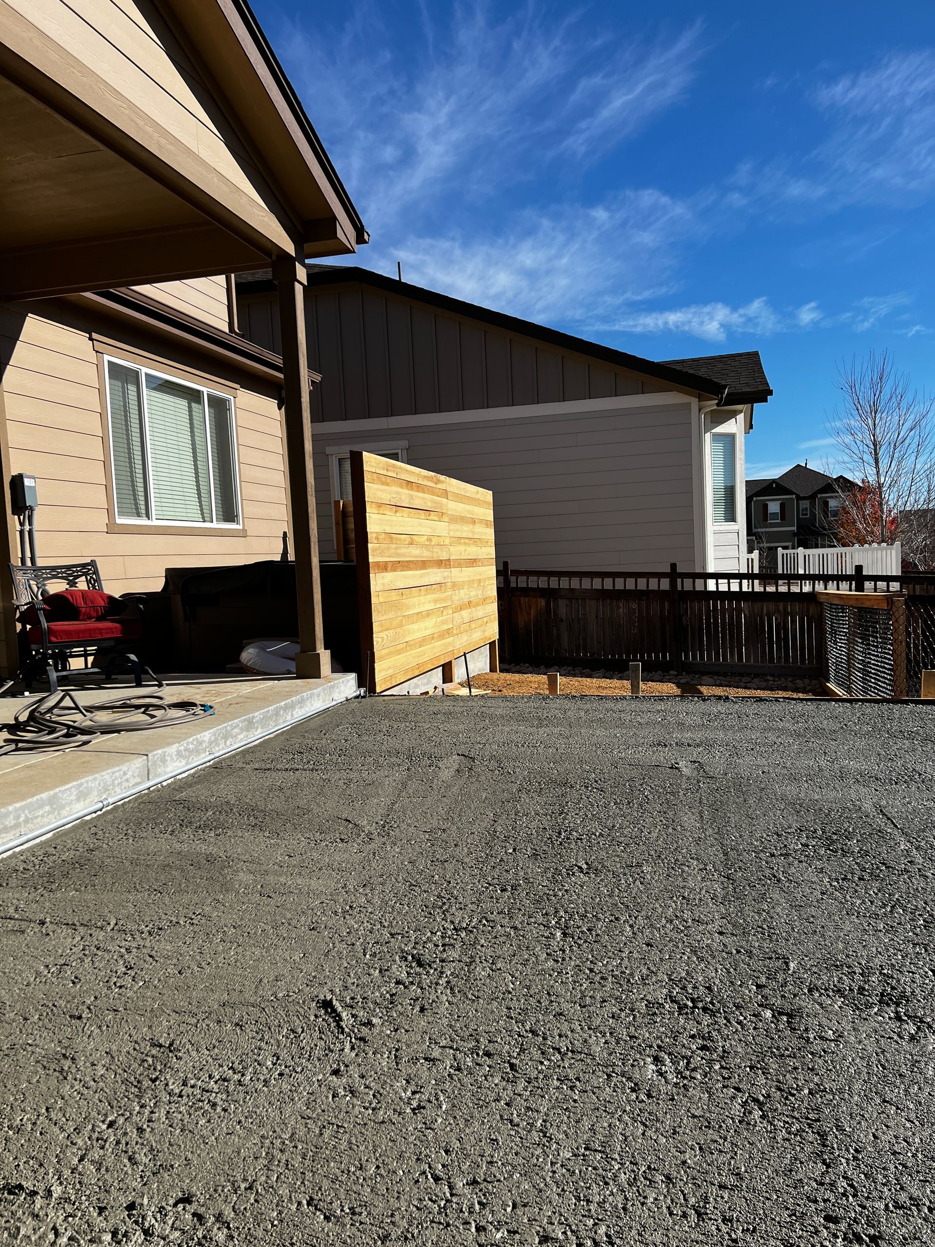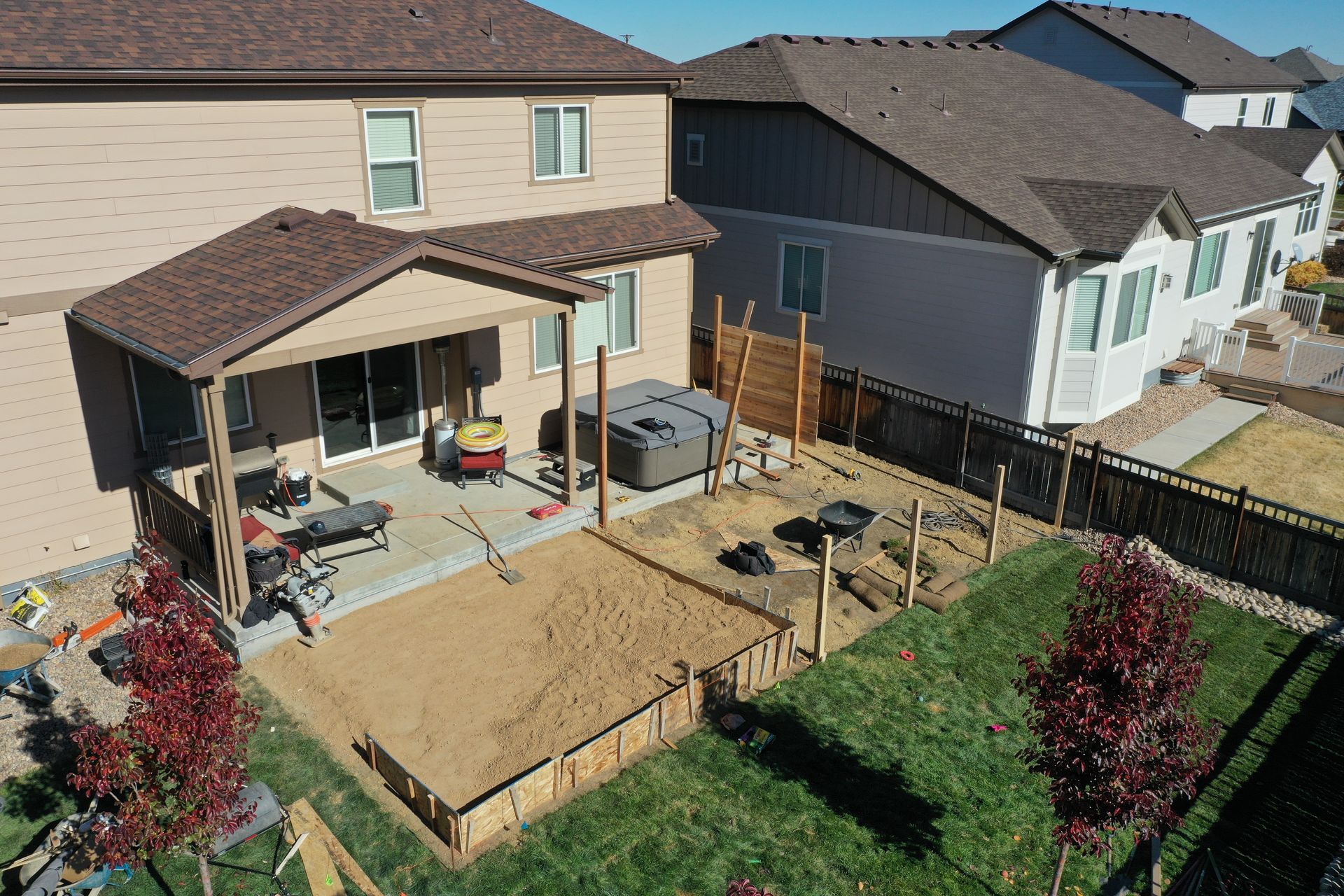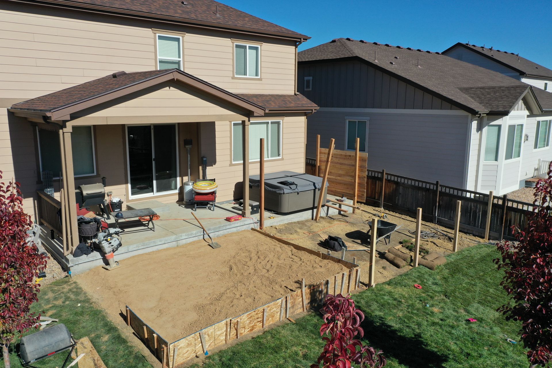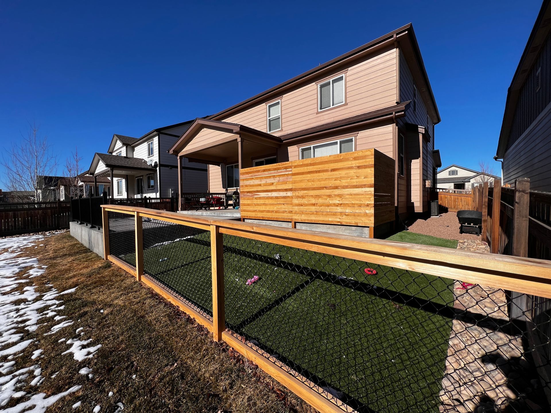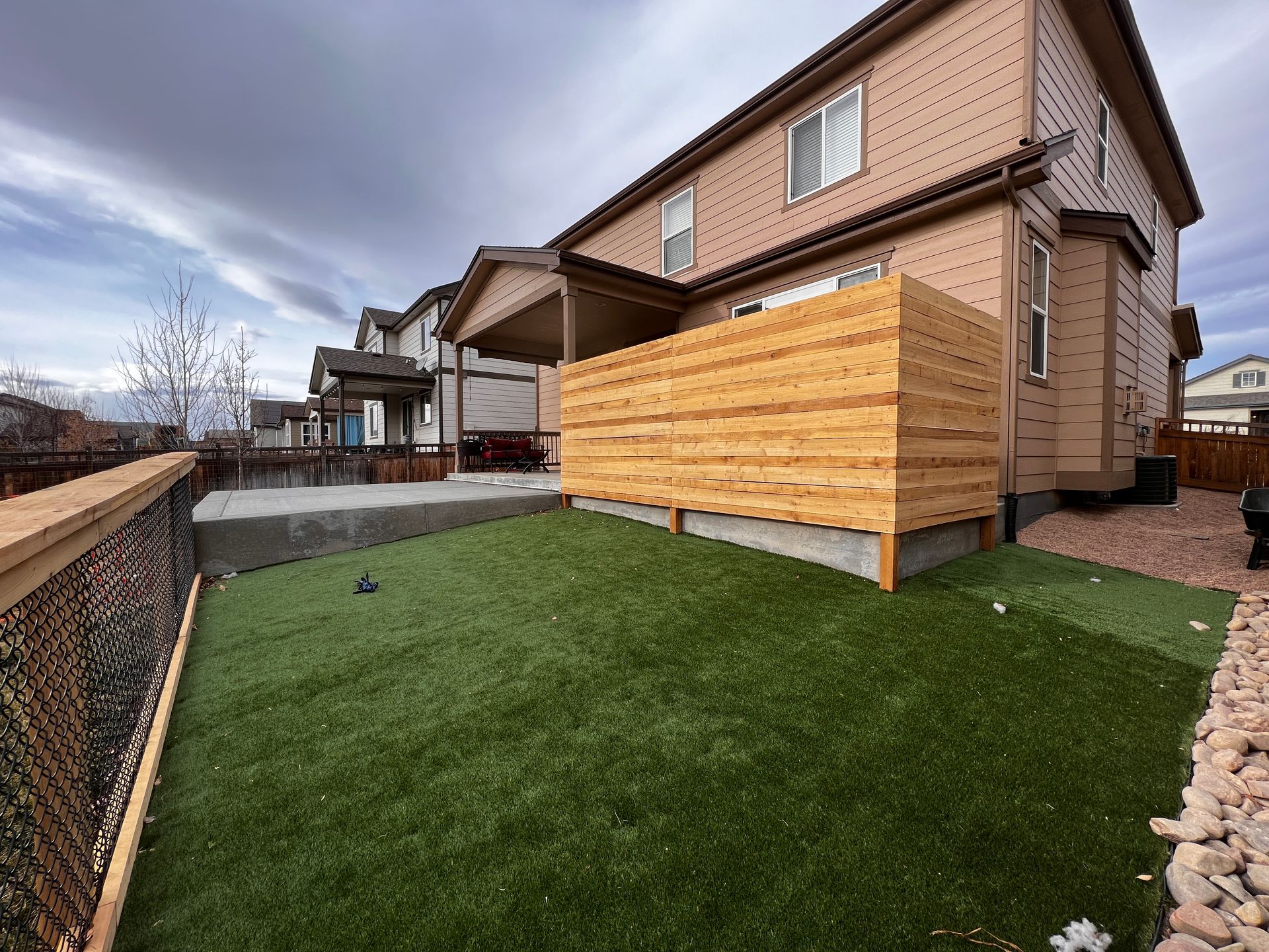 Remodel of back yard. New extension of concrete patio, privacy screen for their hot tub, artificial turf for dog run, new beautiful fence to enclose dog run. Erie, CO 2021